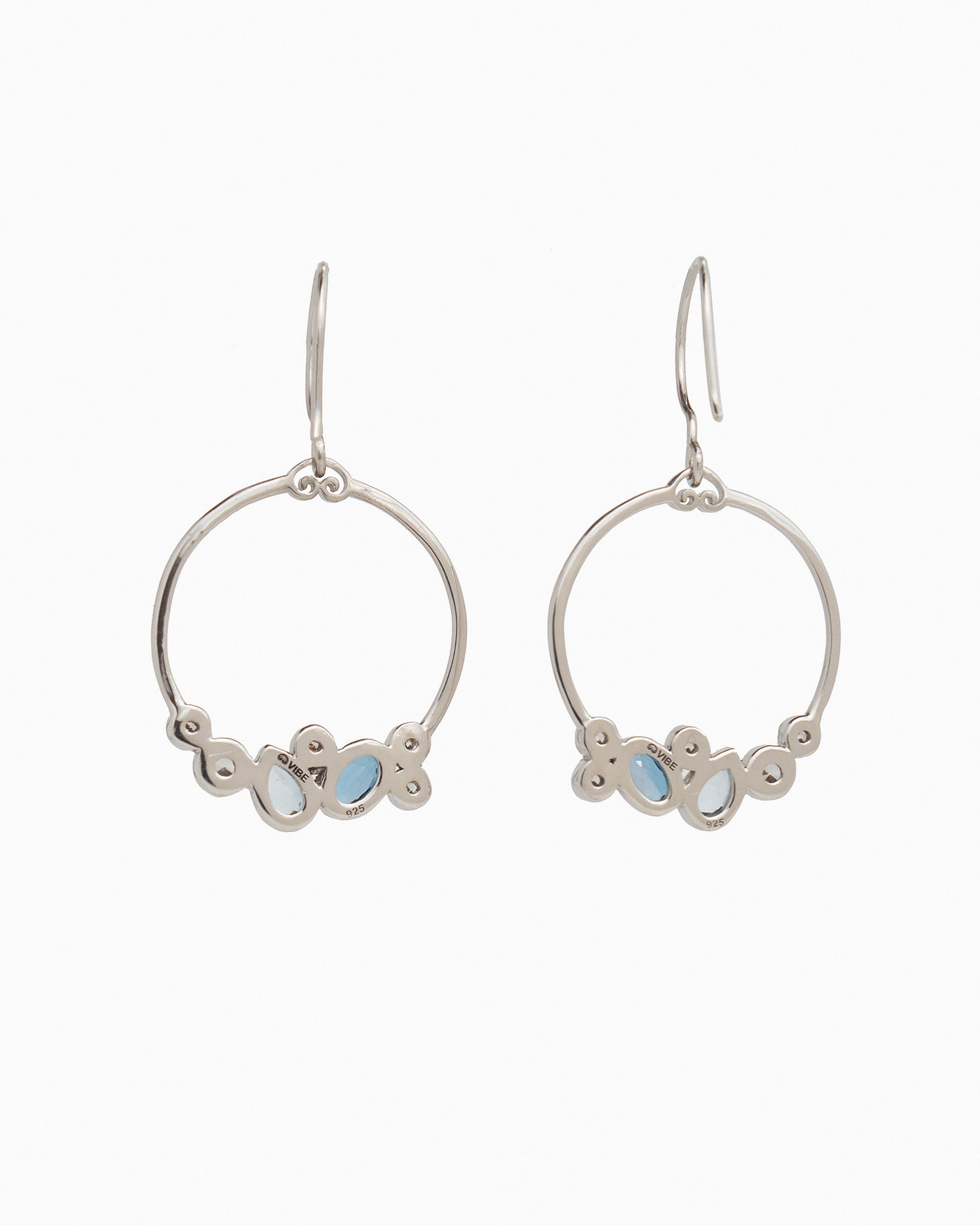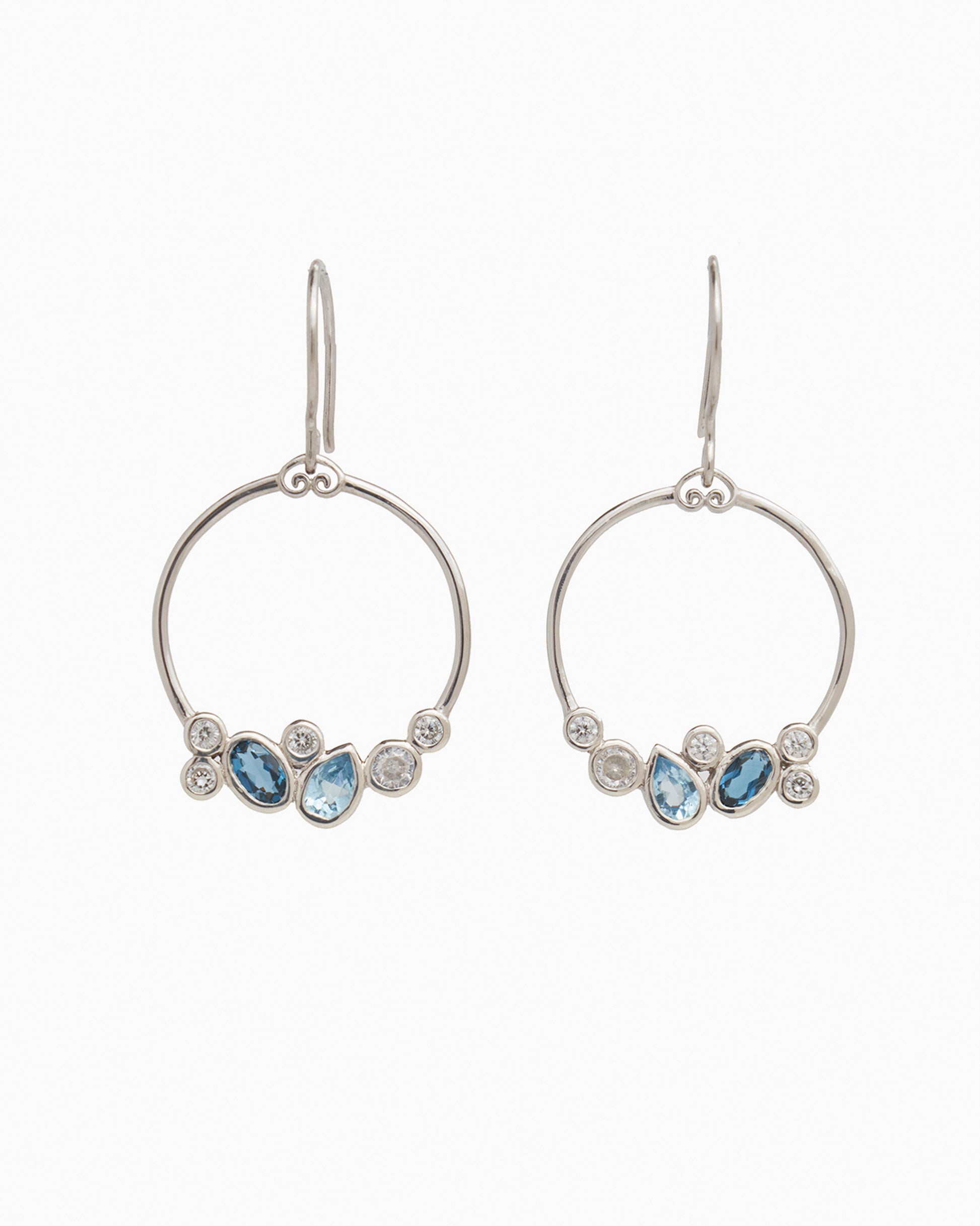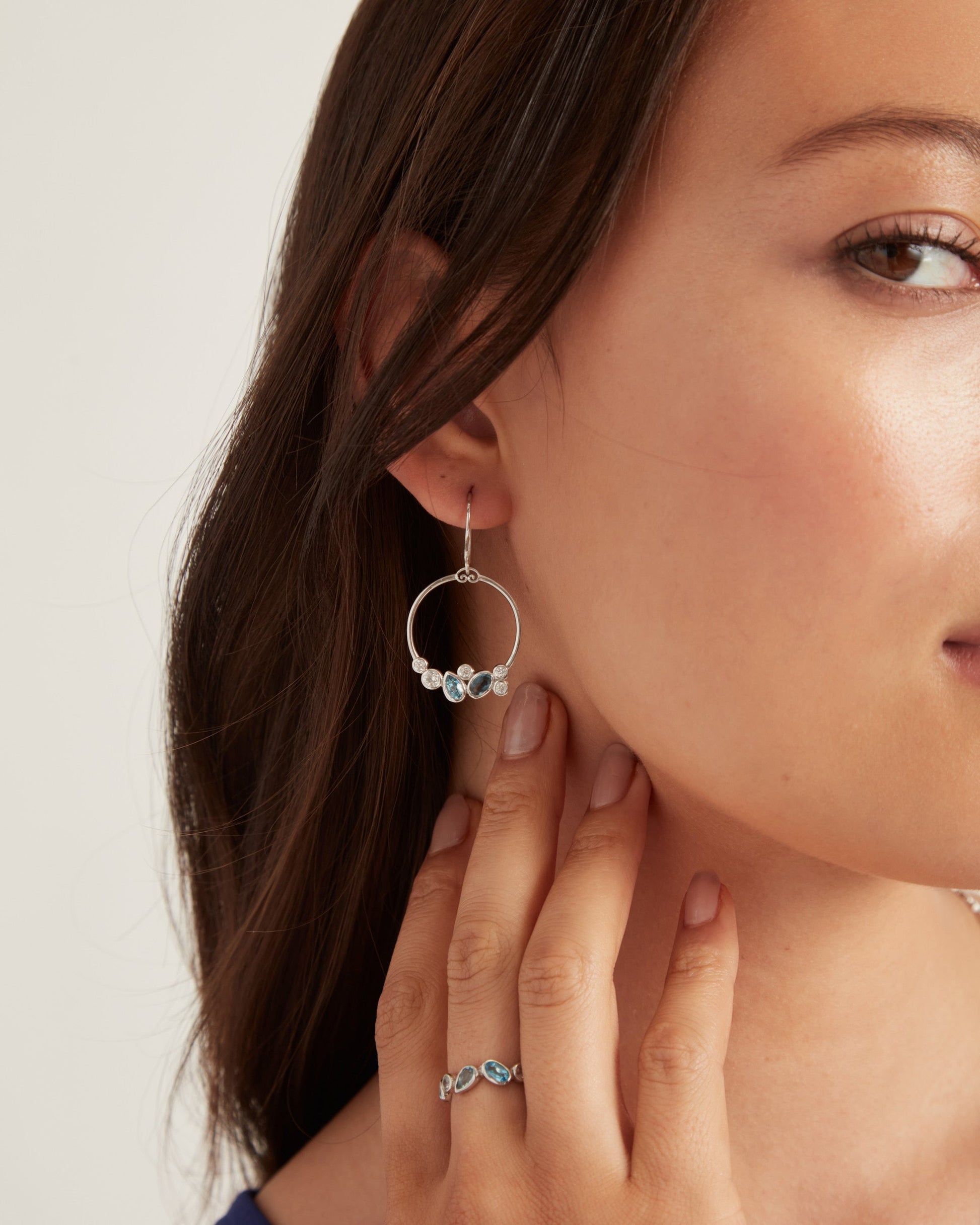 The Ocean Stone Drop Earrings feature a gently hammered sterling silver loop shape adorned with a cluster of ocean-inspired blue and clear stones. This elegant yet whimsical design will complement any jewelry collection.