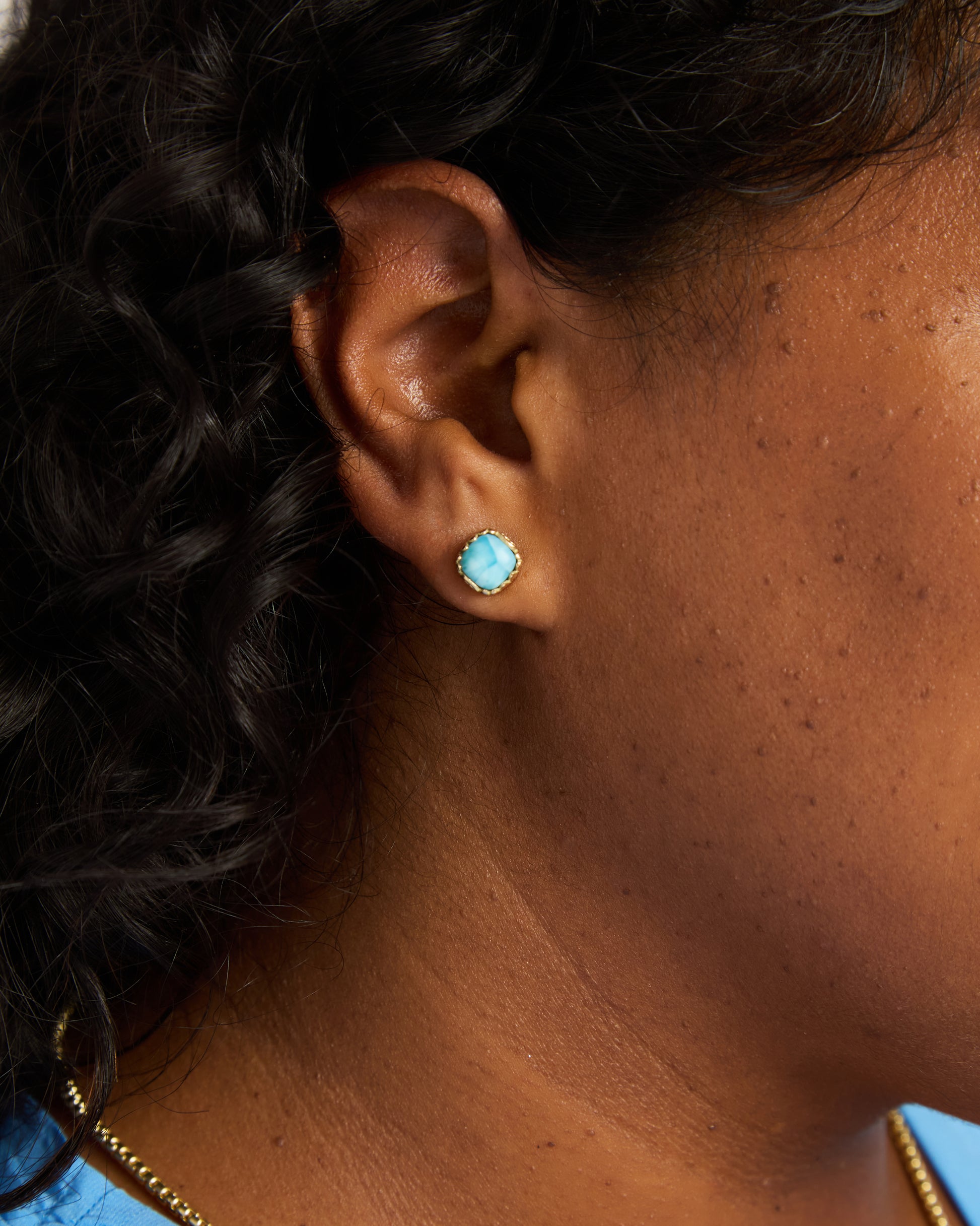The Ocean Stone Studs are handcrafted in 14K solid gold and feature a larimar cabochon in a wave-like setting. With a petroglyph replica on the side of each stud, these earrings are the perfect addition to your everyday jewelry collection that will be a constant reminder of the beautiful island.