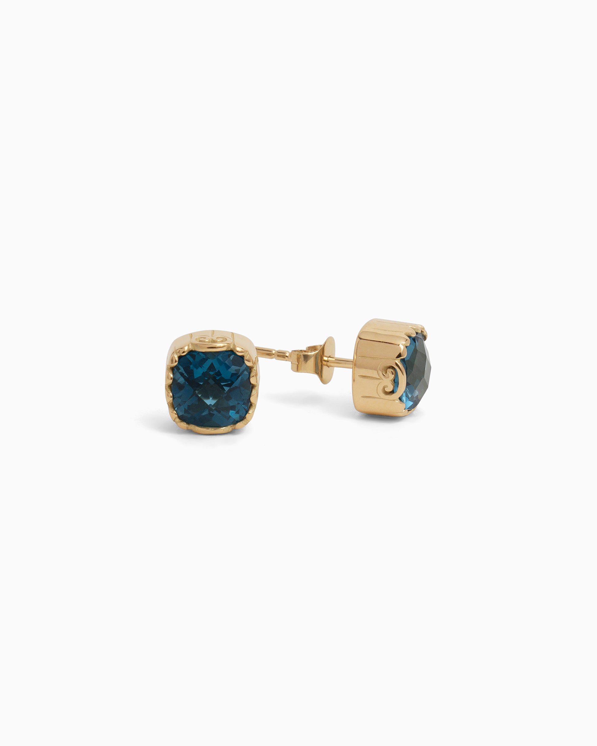The Ocean Stone Studs are handcrafted in 14K solid gold and feature a faceted London blue topaz stone in a wave-like setting. With a petroglyph replica on the side of each stud, these earrings are the perfect addition to your everyday jewelry collection that will be a constant reminder of the beautiful island.