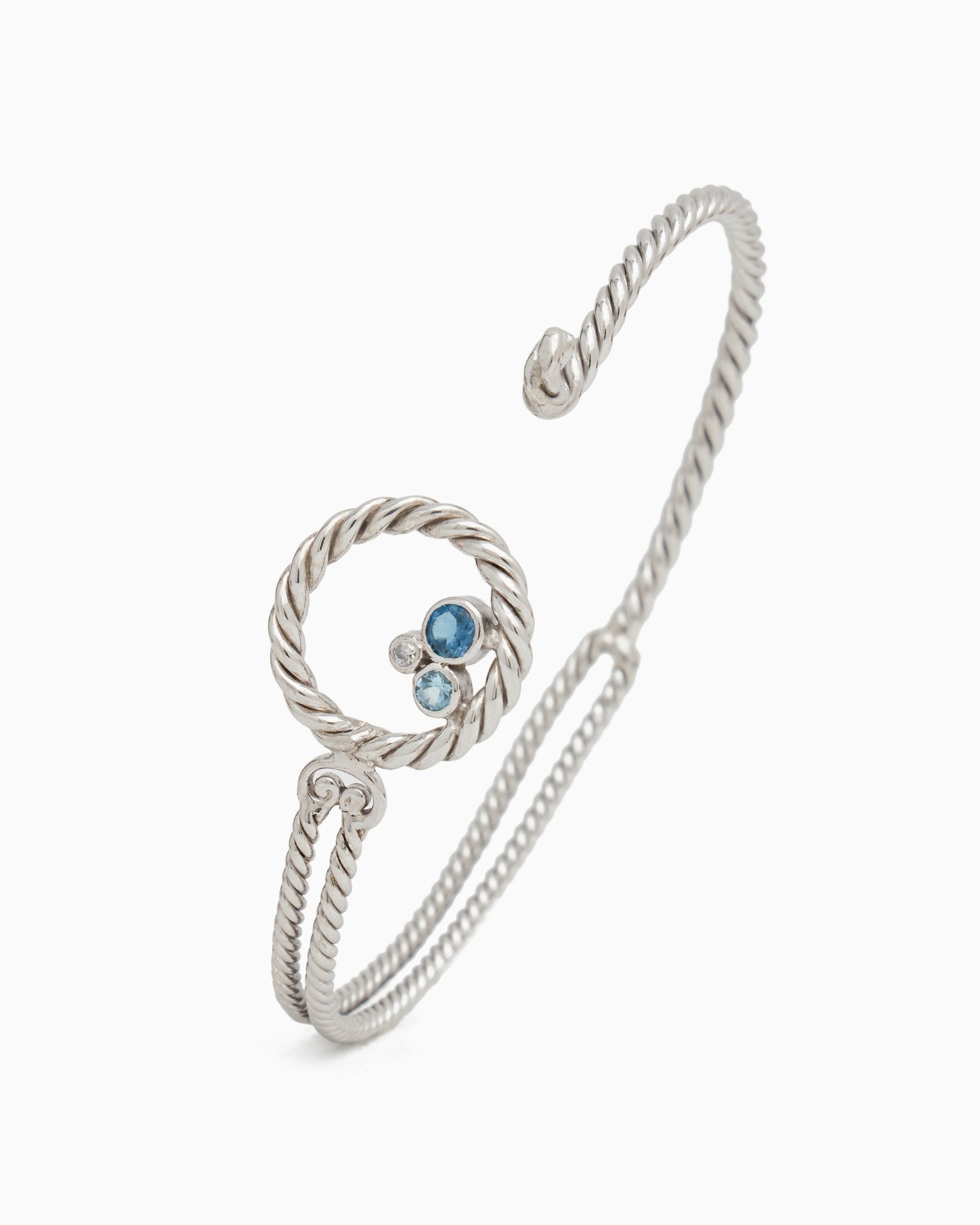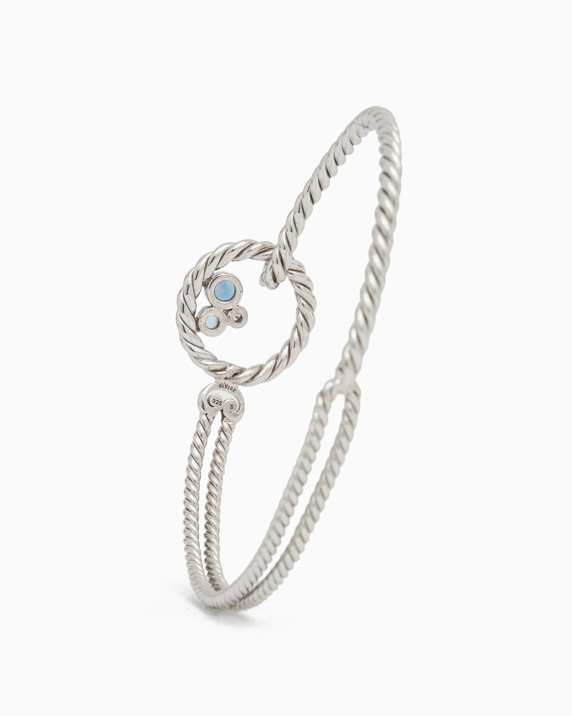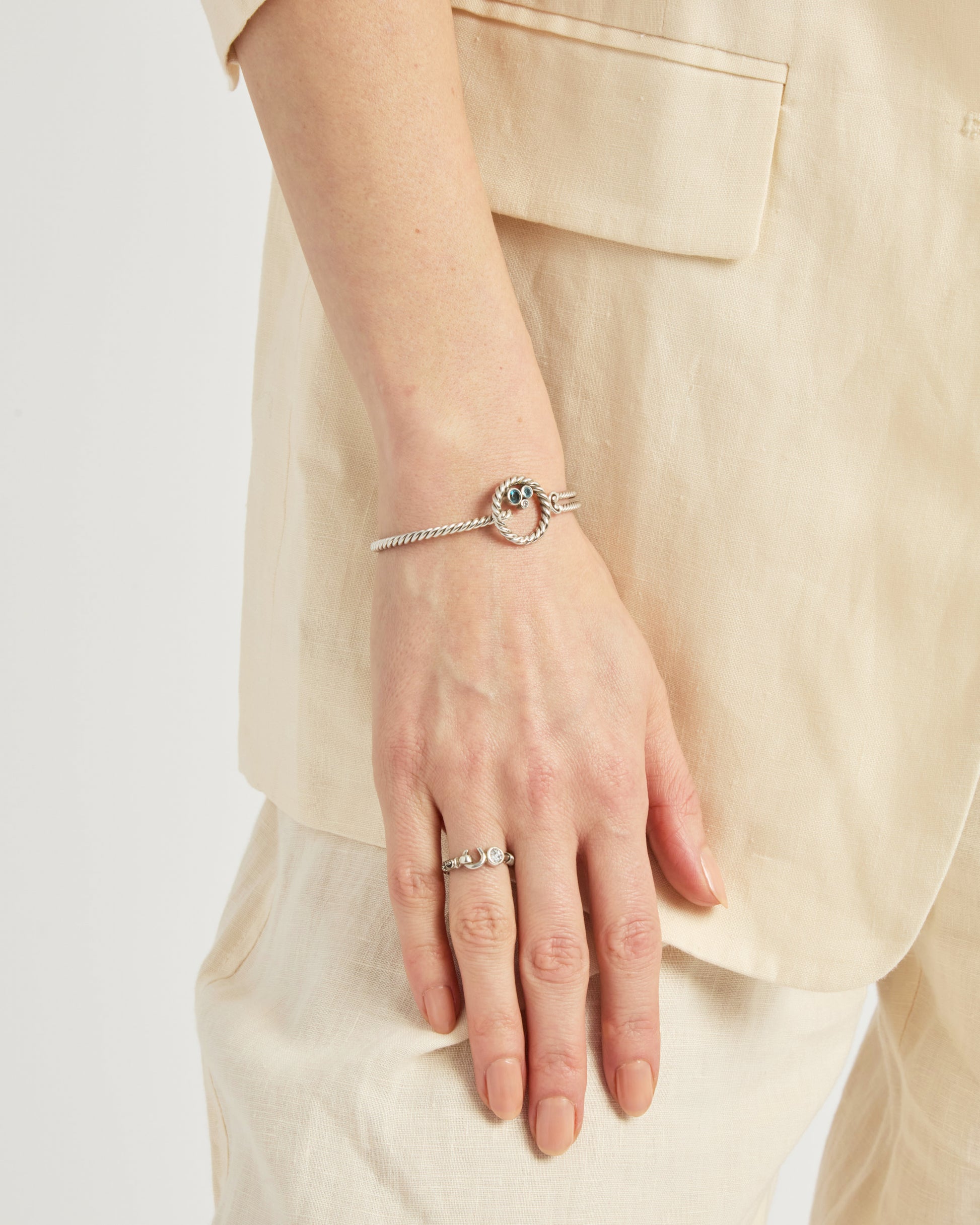 Part of our One Love Collection, the One Love Twisted Hook Bracelet is handcrafted from sterling silver and features an intertwined rope-inspired band with a symbolic circle clasp, petroglyph closure, and three stone accent.