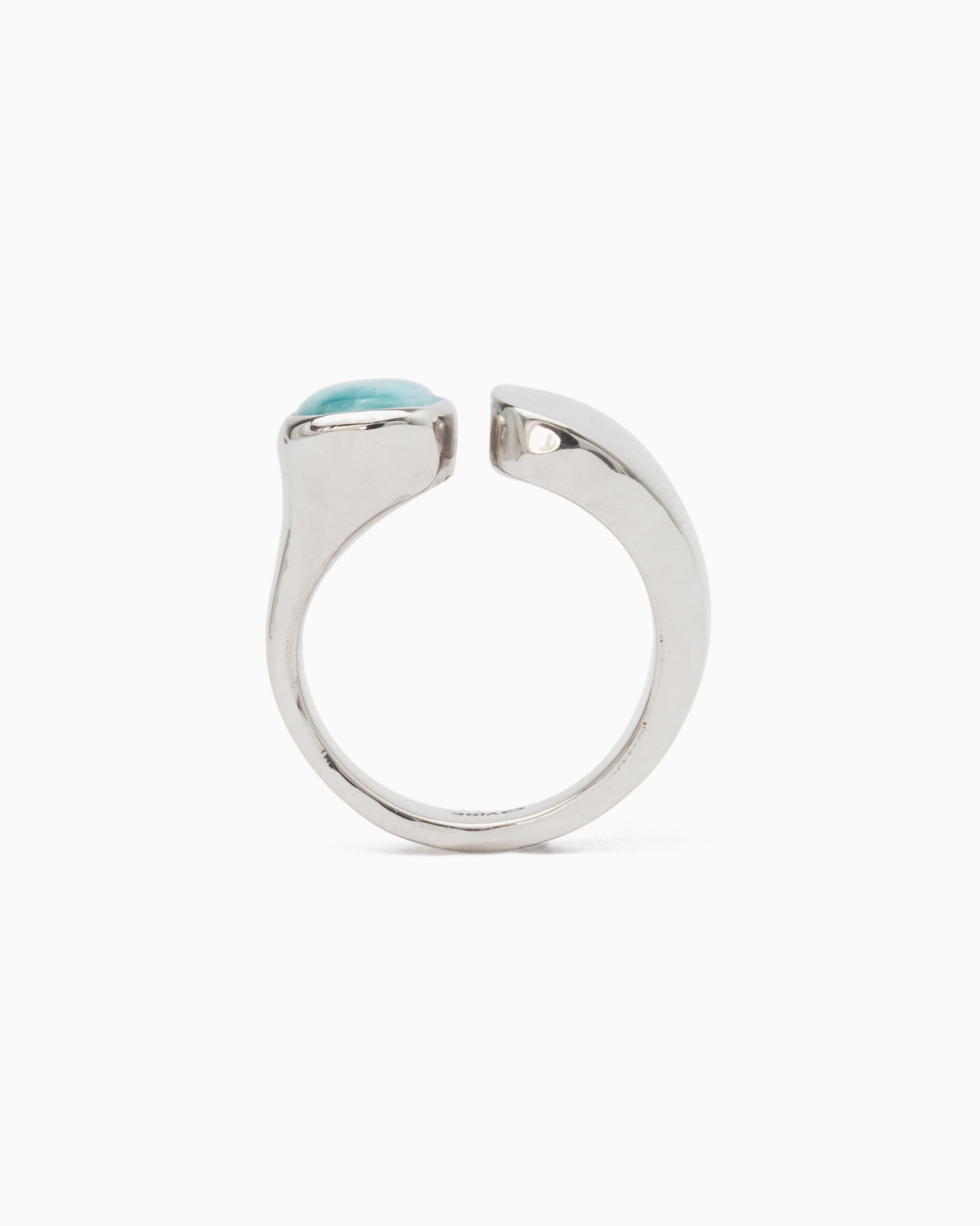 The Open Band Stone Ring is handcrafted with gently hammered sterling silver and features a larimar cabochon. The opening in the center adds a unique touch. Elevate your style effortlessly by adding this versatile ring to your collection, ensuring you always have the perfect finishing touch for any outfit.