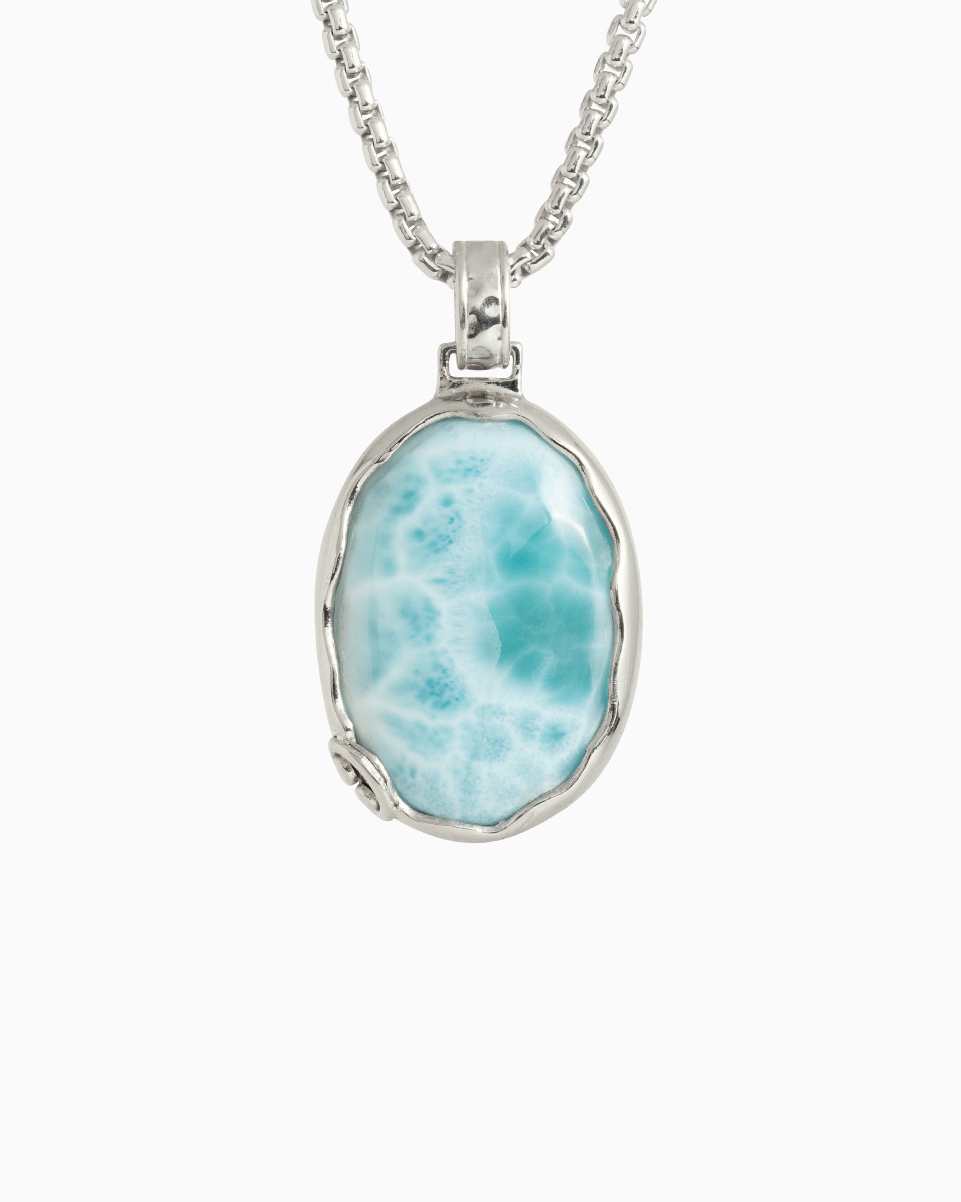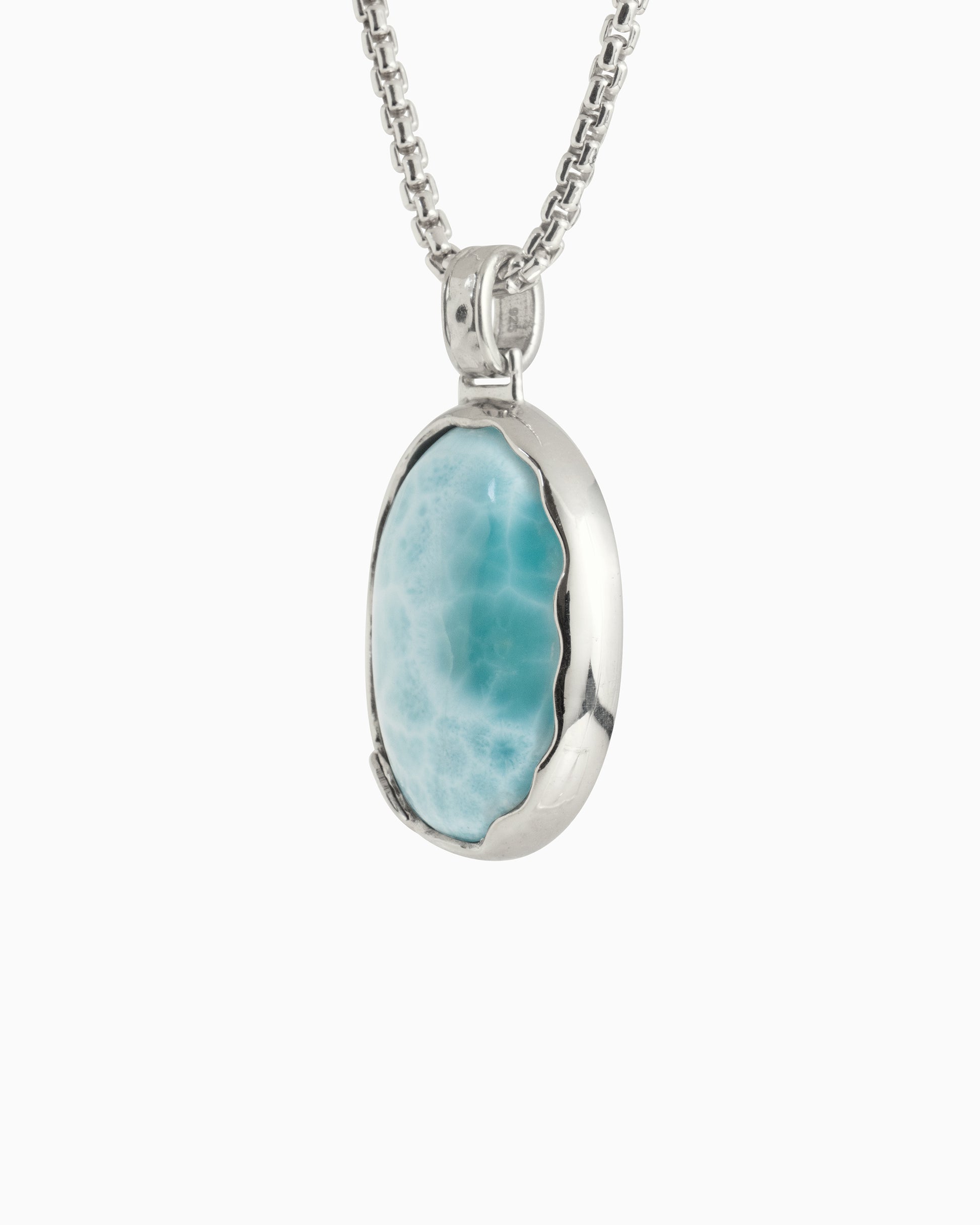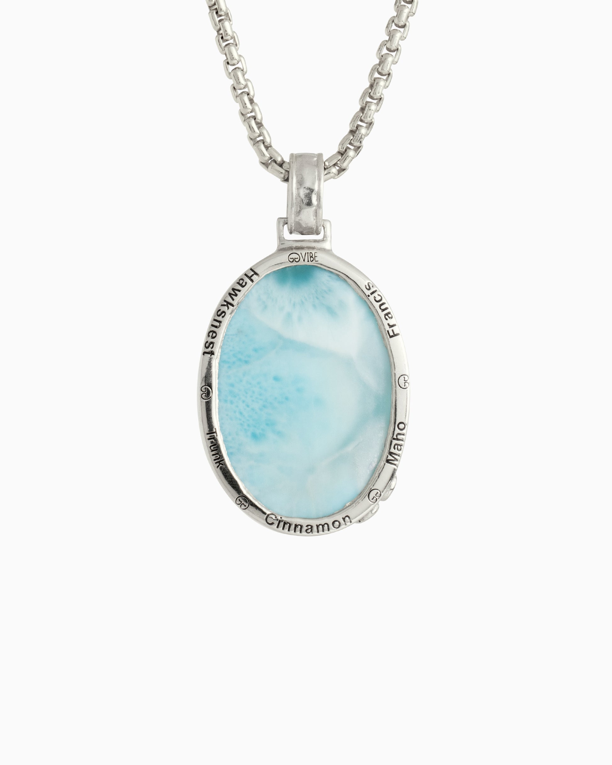 The Oval Larimar Pendant is a bold piece handcrafted in sterling silver. Its unique design features a wave-like pattern along the edge of the Larimar stone, symbolizing the ocean’s movement. A signature detail found in many of our pieces, the open petroglyph at the base of the stone represents the islands rich heritage. The back of the piece features engraved location names that celebrate our island home of St. John, USVI.