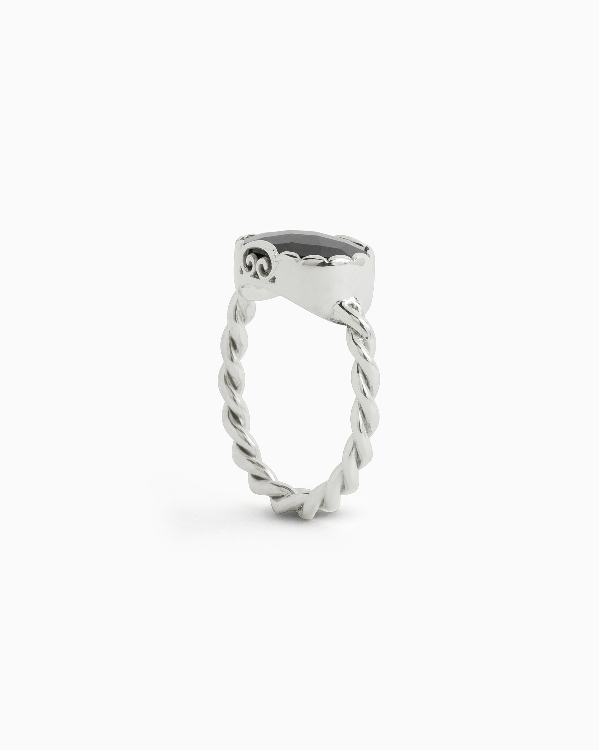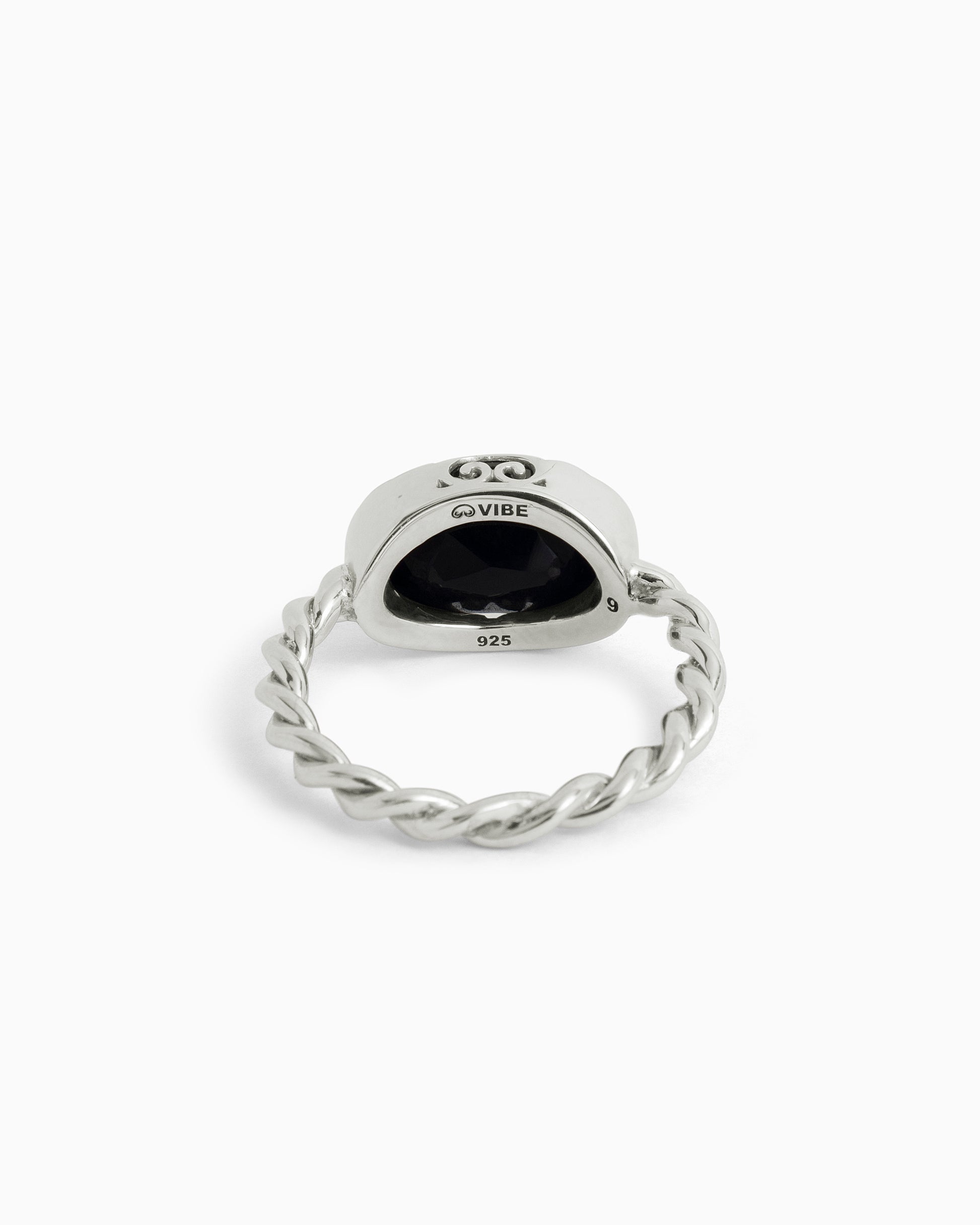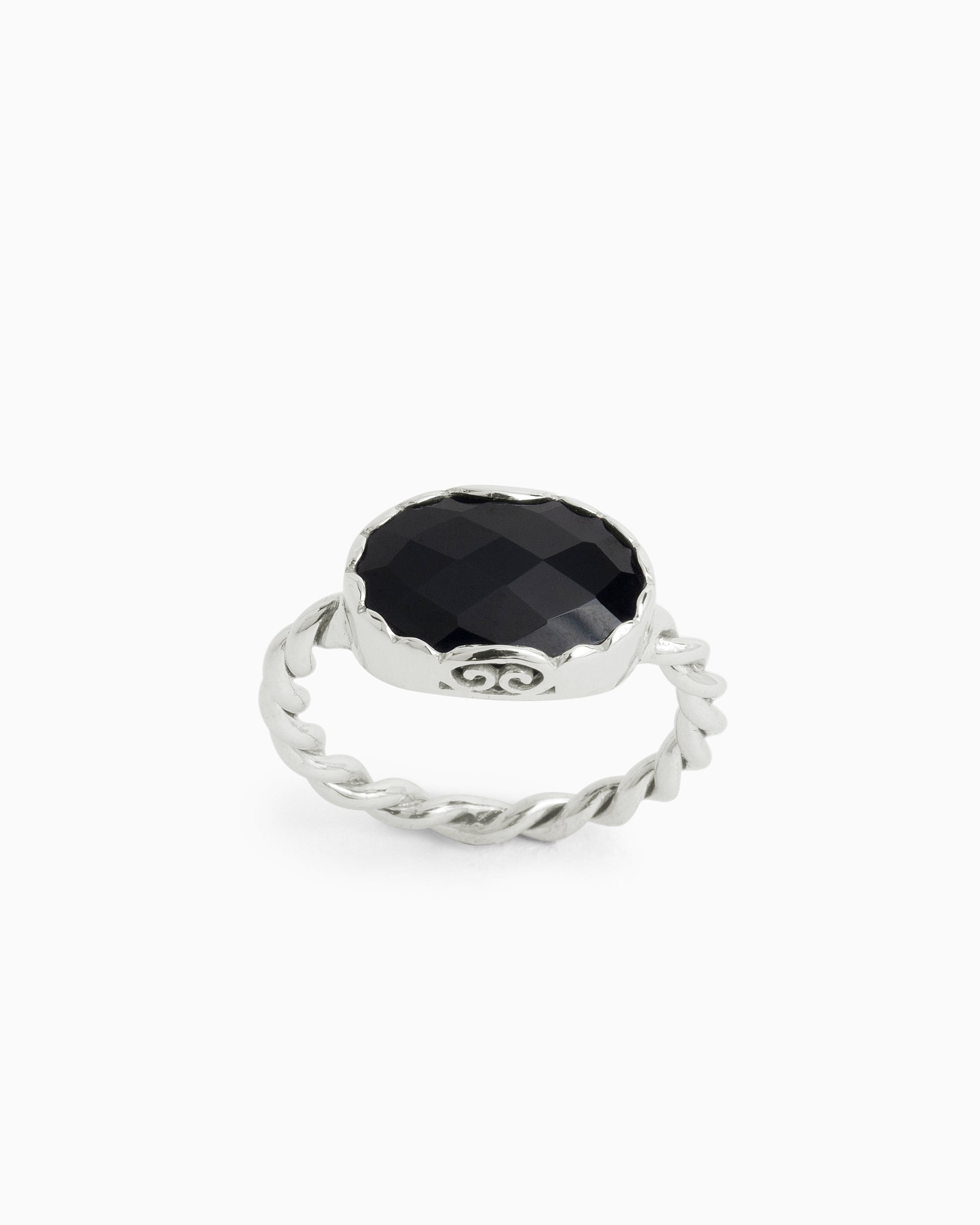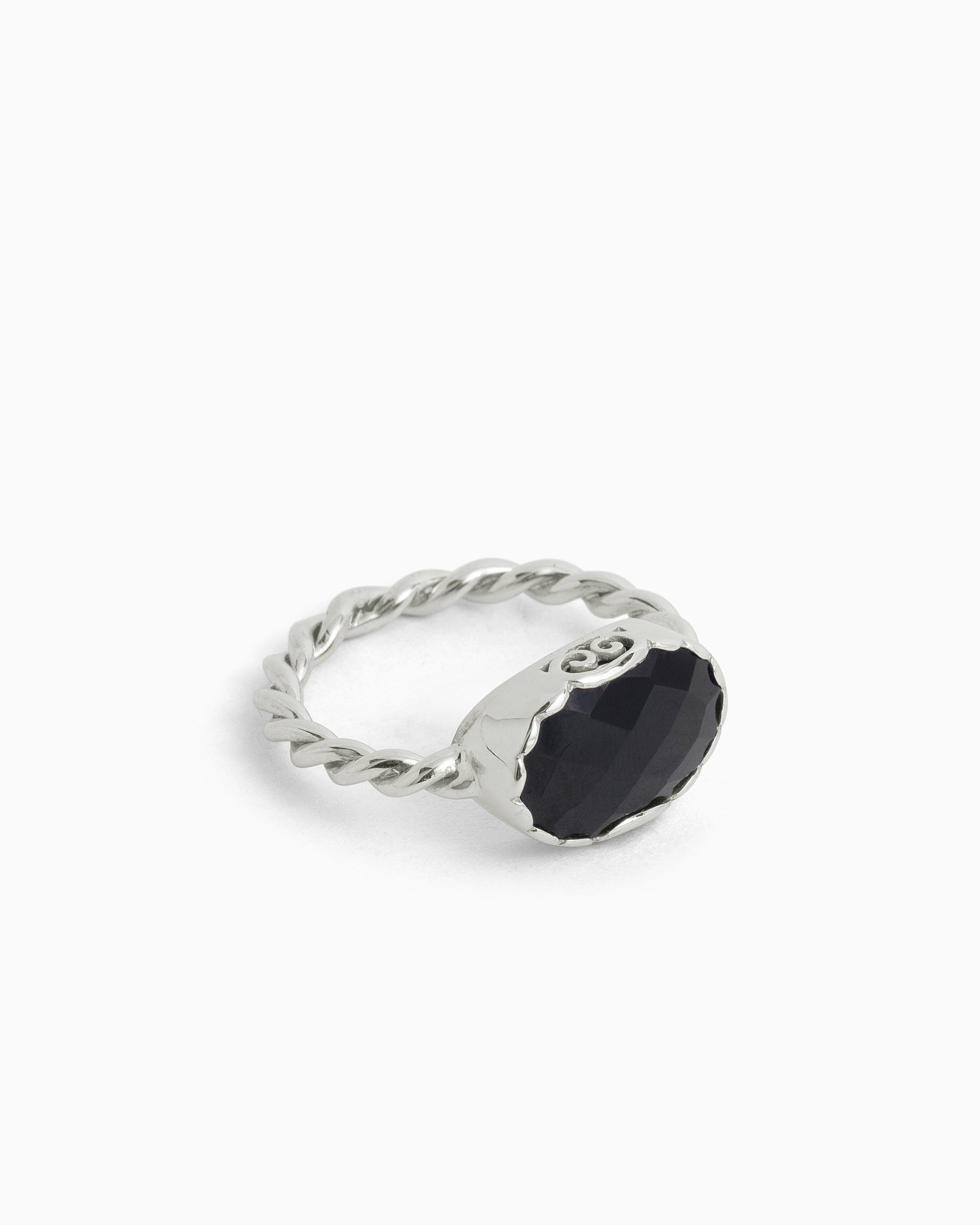 The Oval Stone Twisted Ring is a unique style that will add the perfect touch to your jewelry collection. Featuring an oval faceted black onyx stone set in a wave-like bezel, a twisted band, and a petroglyph adorned on the side. Wear this ring alone or stack with others for a statement look.