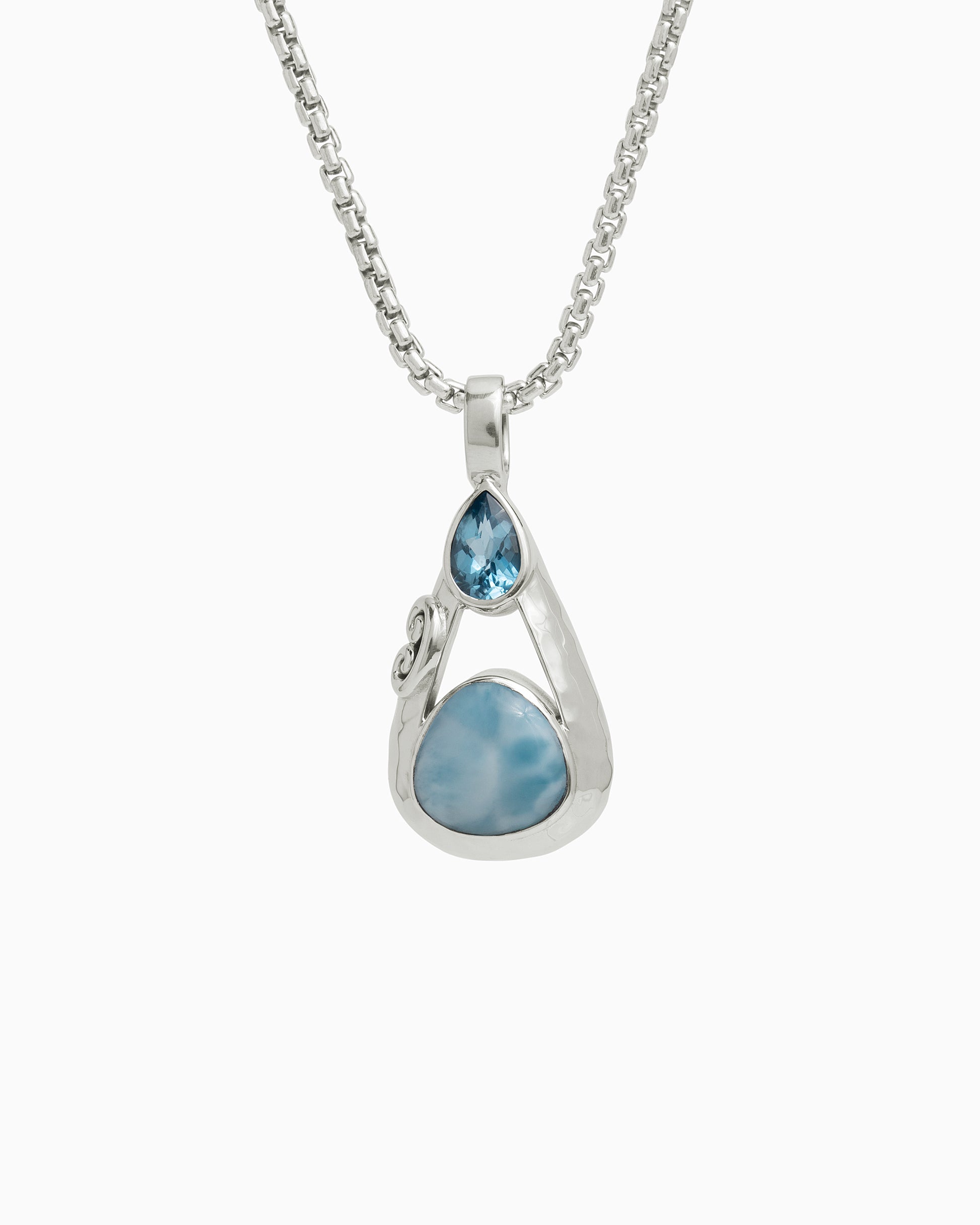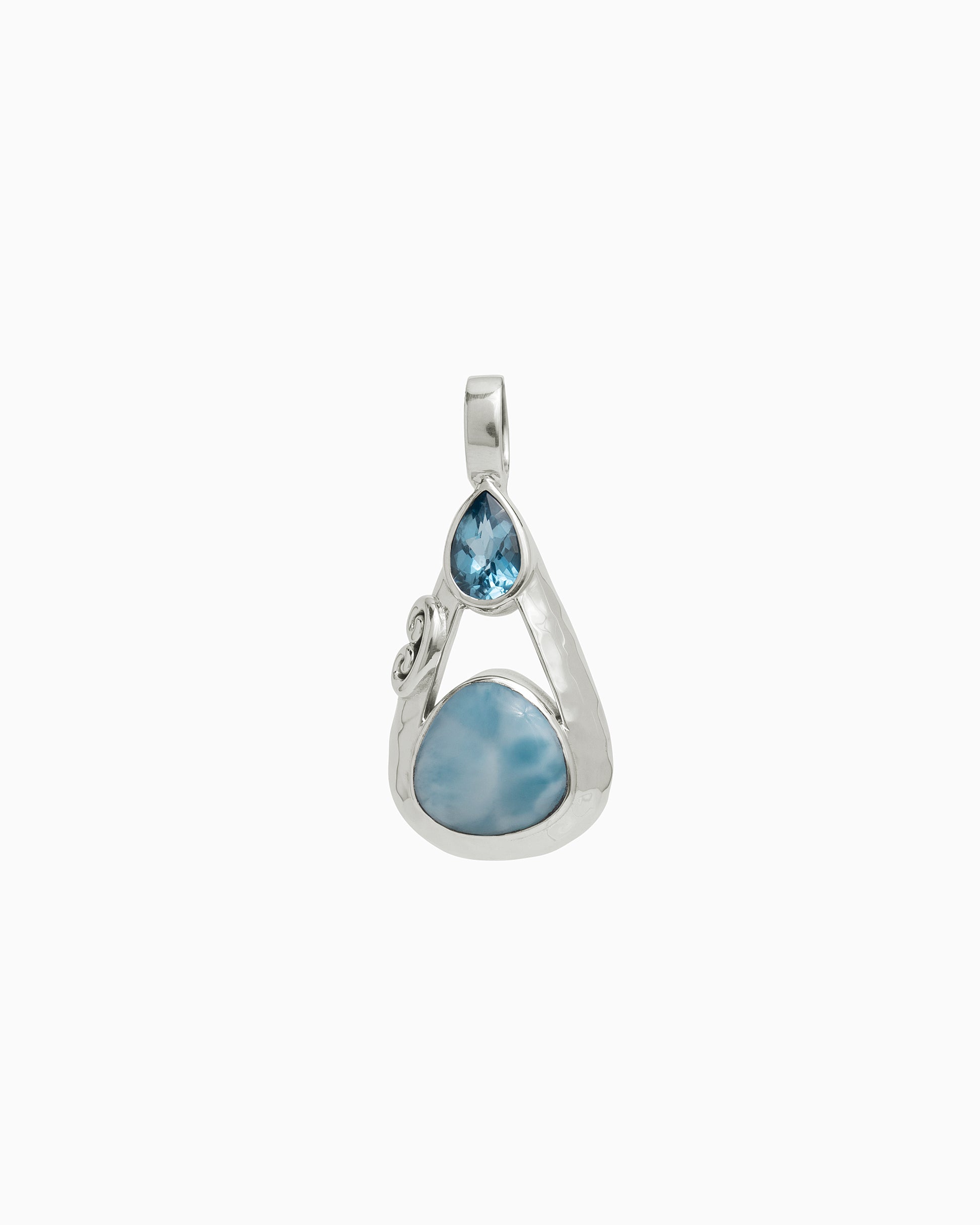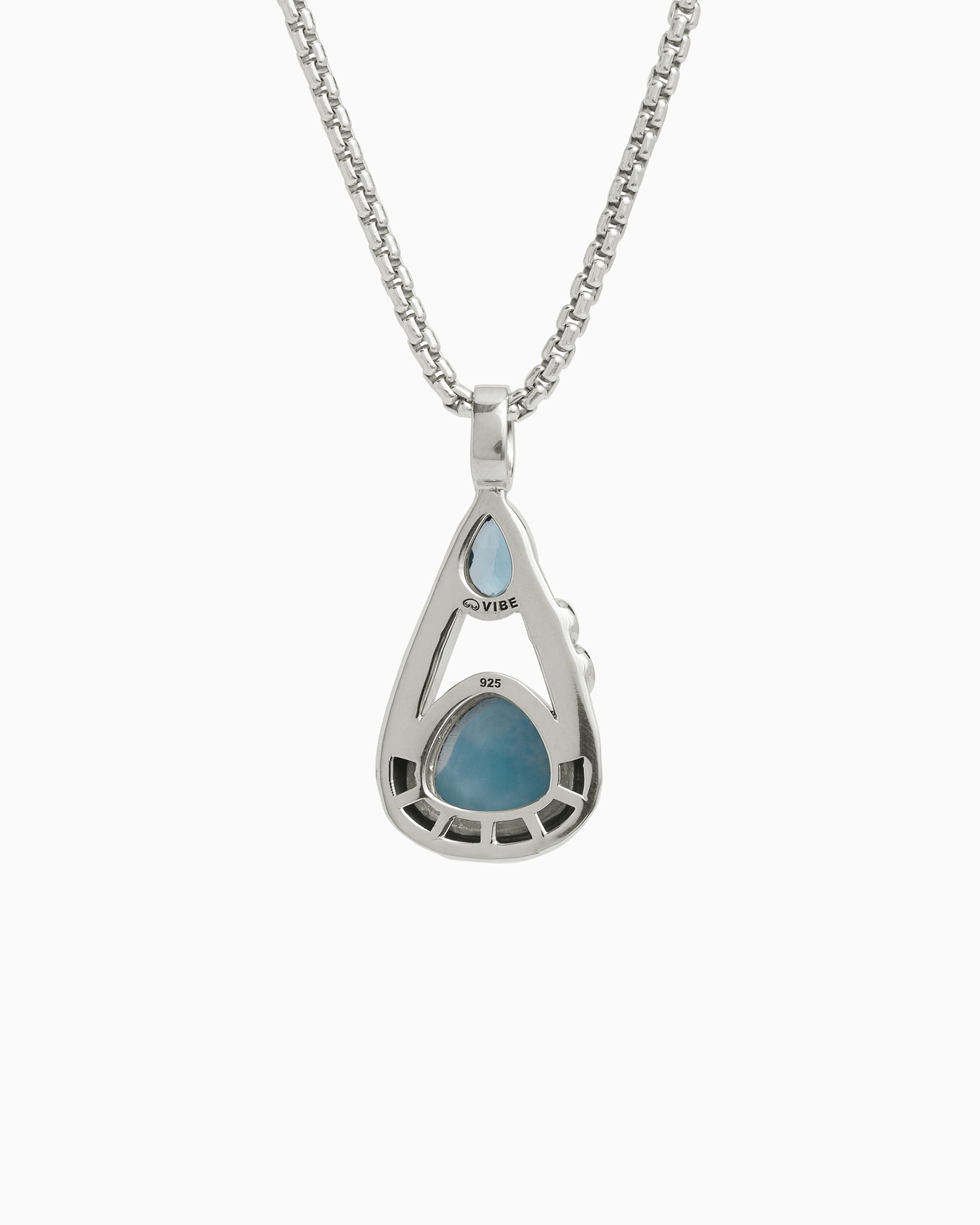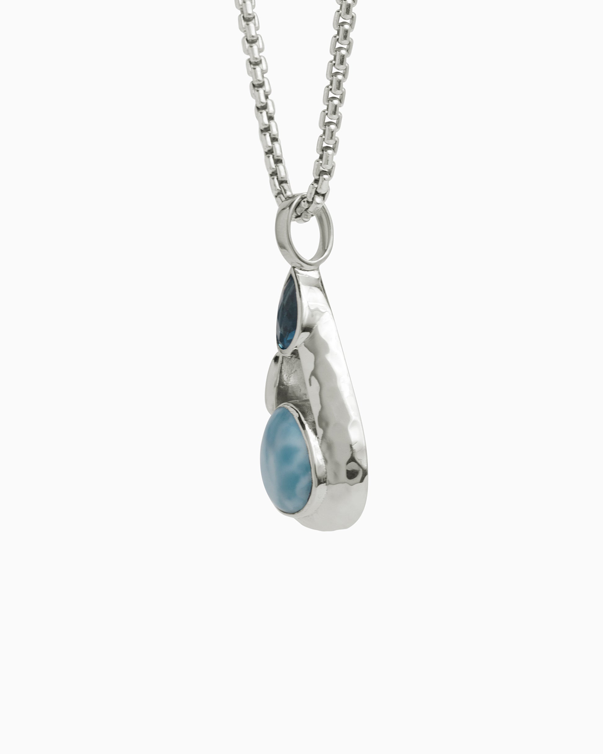 The Double Stone Teardrop Pendant is a unique design handcrafted in gently hammered sterling silver with Vibe's signature petroglyph replica. Featuring a faceted Hampton blue topaz stone at the top of the teardrop and a larimar cabochon at the base, this pendant is the perfect piece to add to your jewelry collection. Pair with your favorite chain, sold separately.
