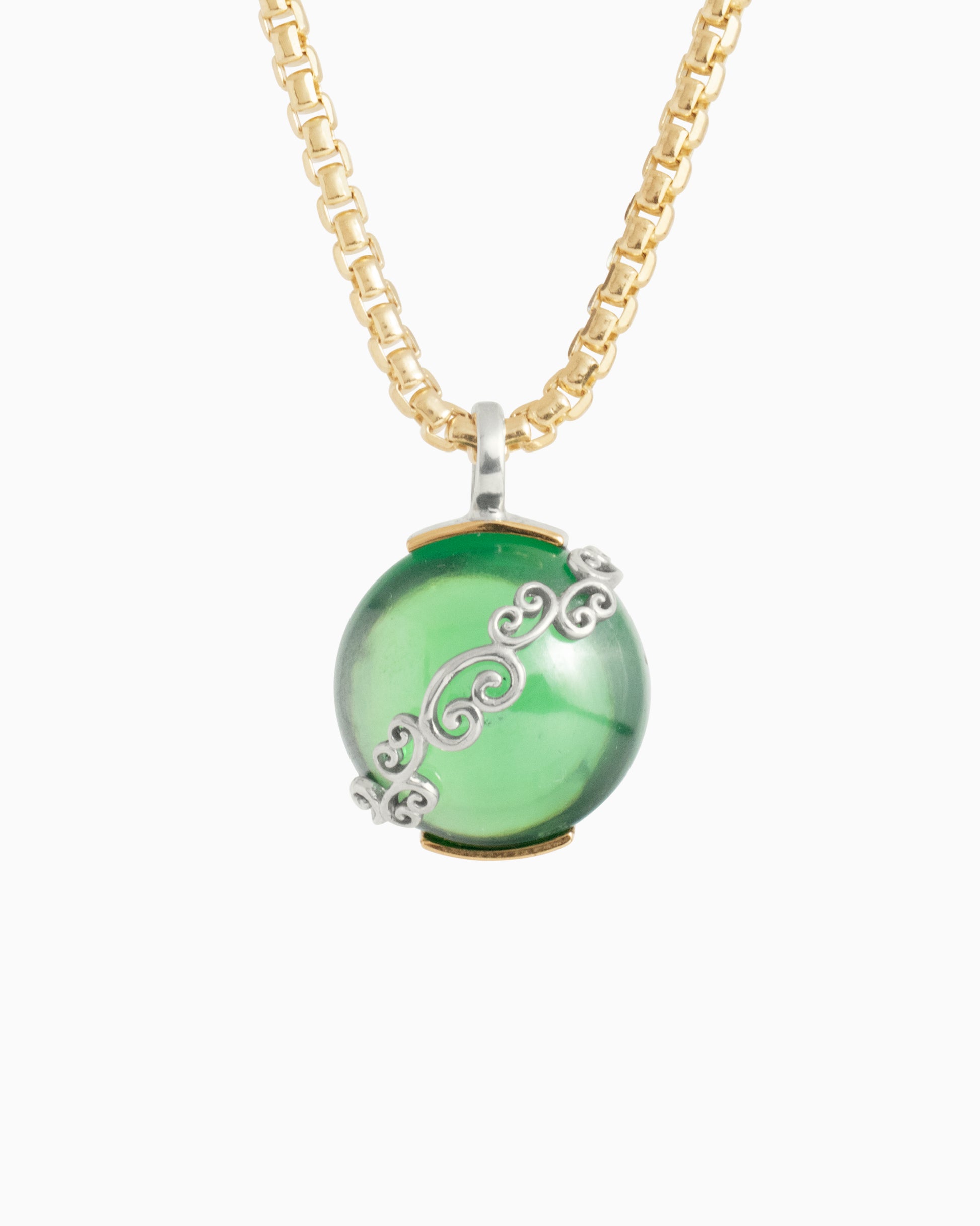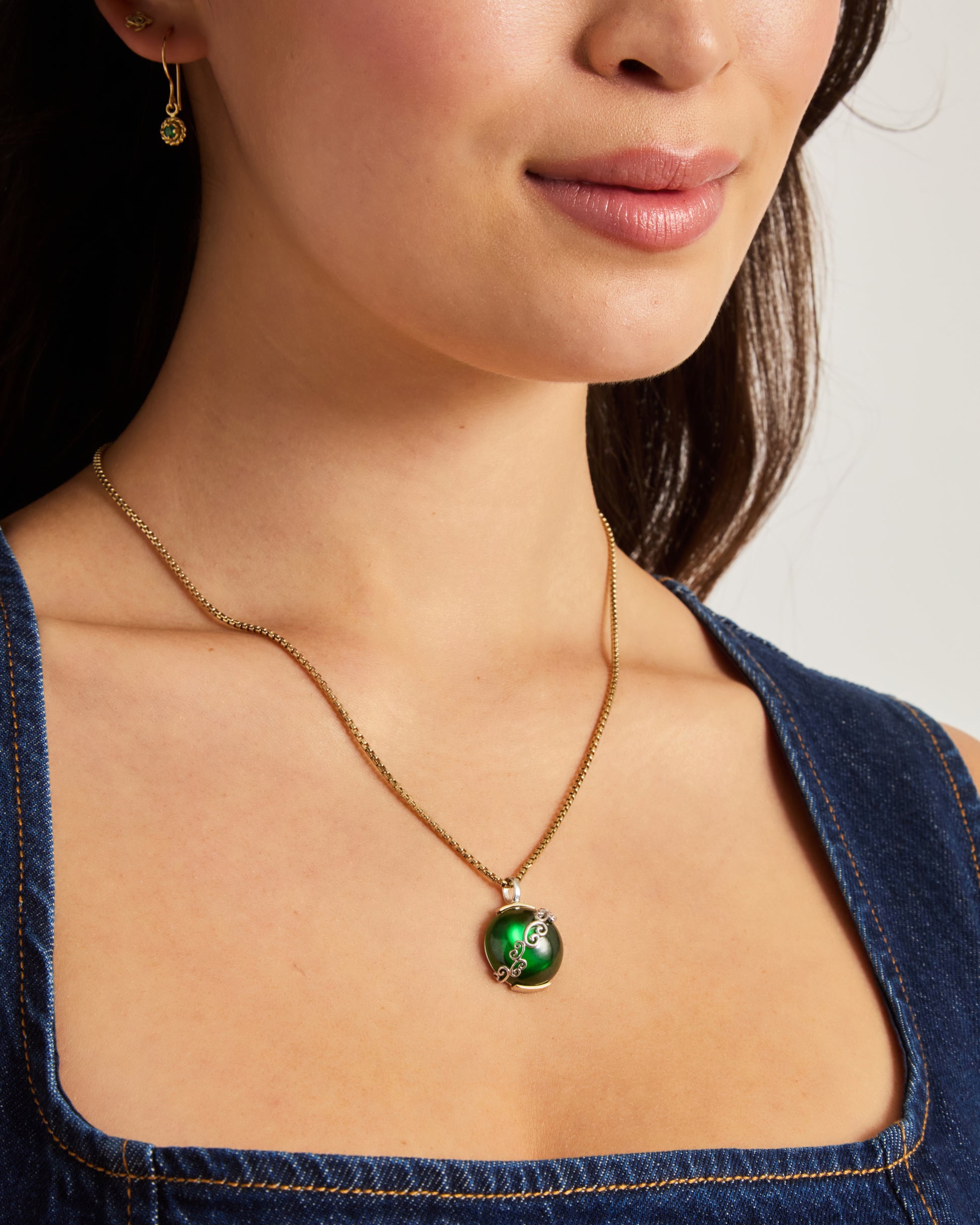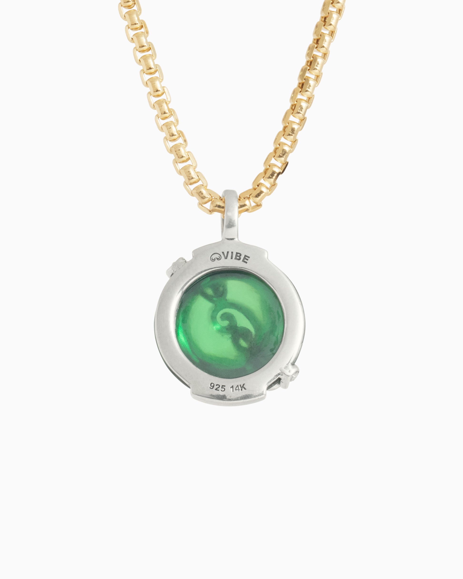 The Eclipse of Petroglyphs Pendant showcases a large green zircon cabochon, encased in sterling silver with solid 14K gold accents. A flowing string of connected petroglyphs wraps diagonally around the domed stone, adding a unique depth to this striking design. Pair with your favorite Vibe chain, sold separately.