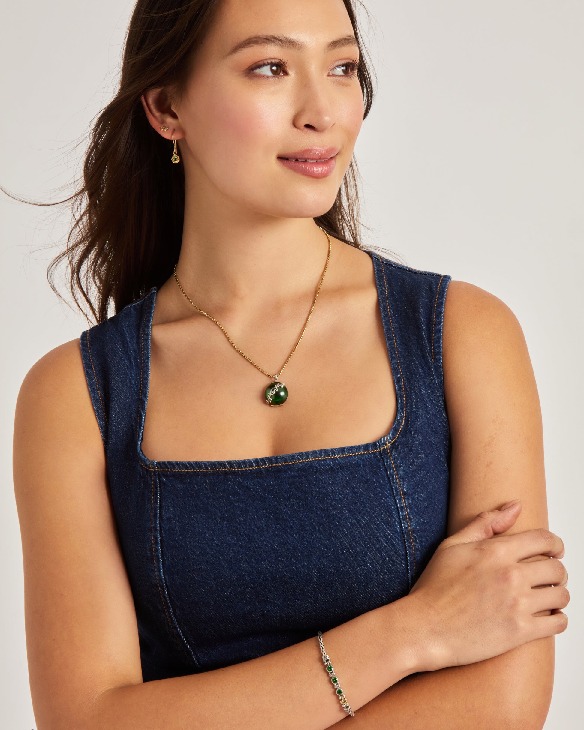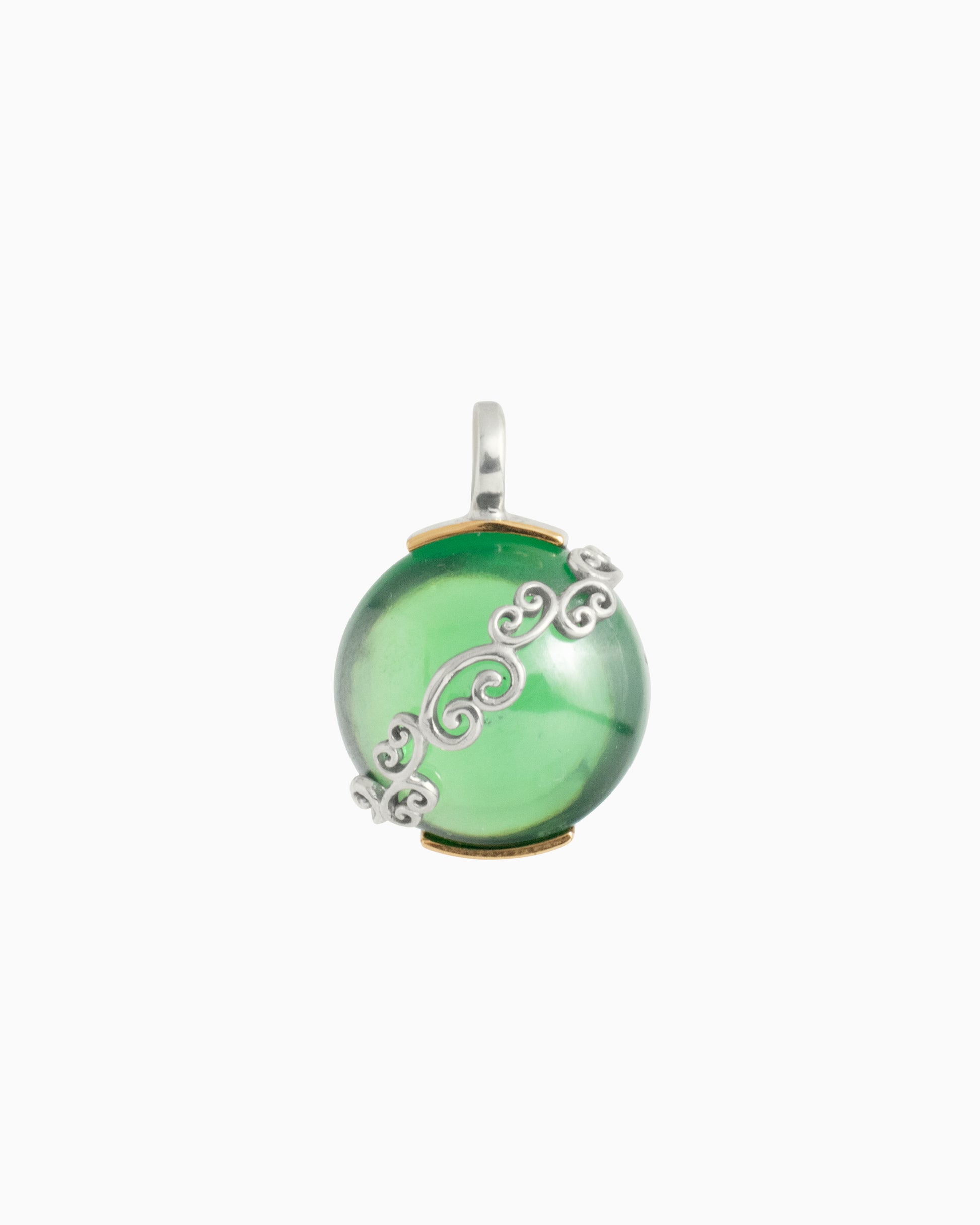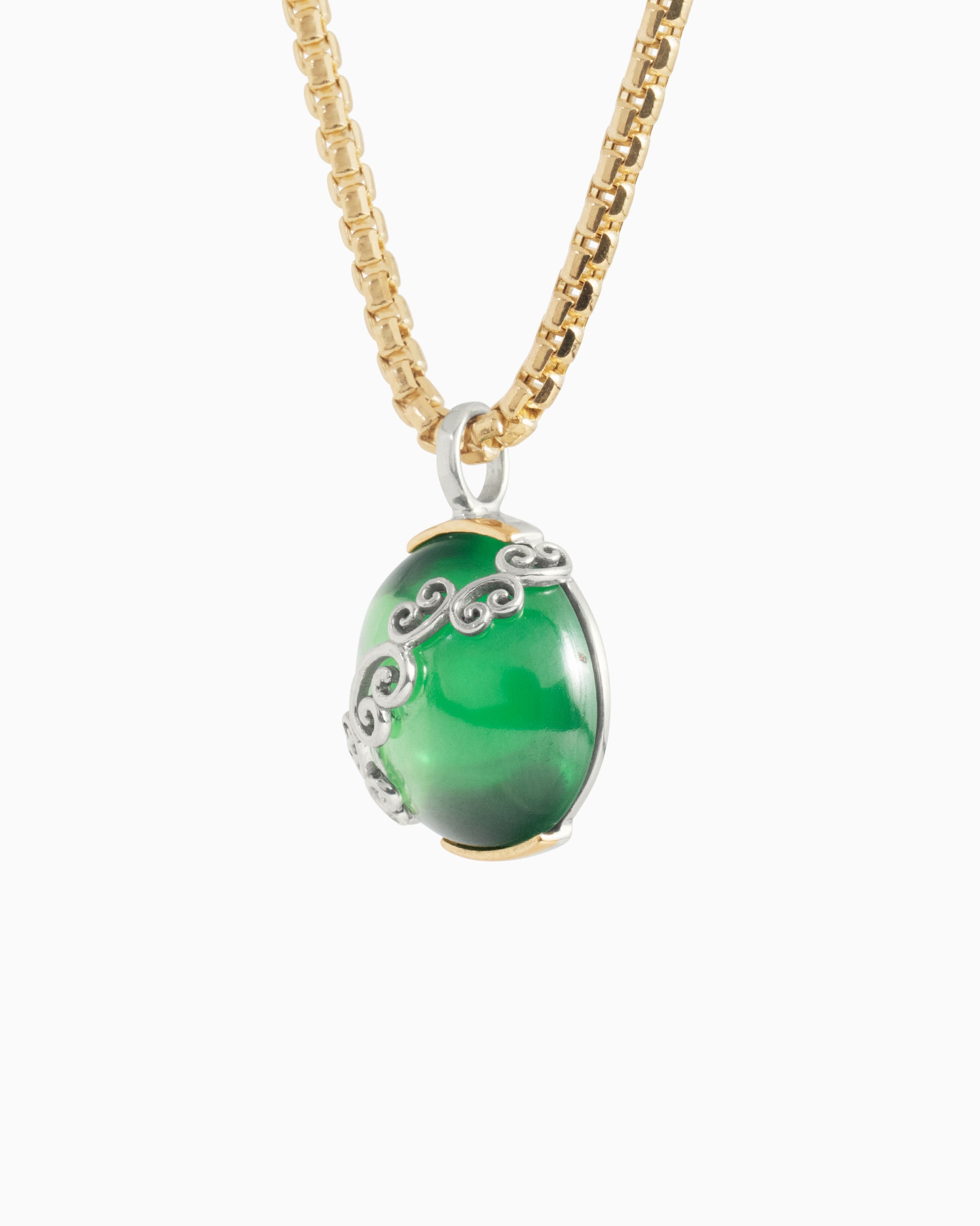 The Eclipse of Petroglyphs Pendant showcases a large green zircon cabochon, encased in sterling silver with solid 14K gold accents. A flowing string of connected petroglyphs wraps diagonally around the domed stone, adding a unique depth to this striking design. Pair with your favorite Vibe chain, sold separately.