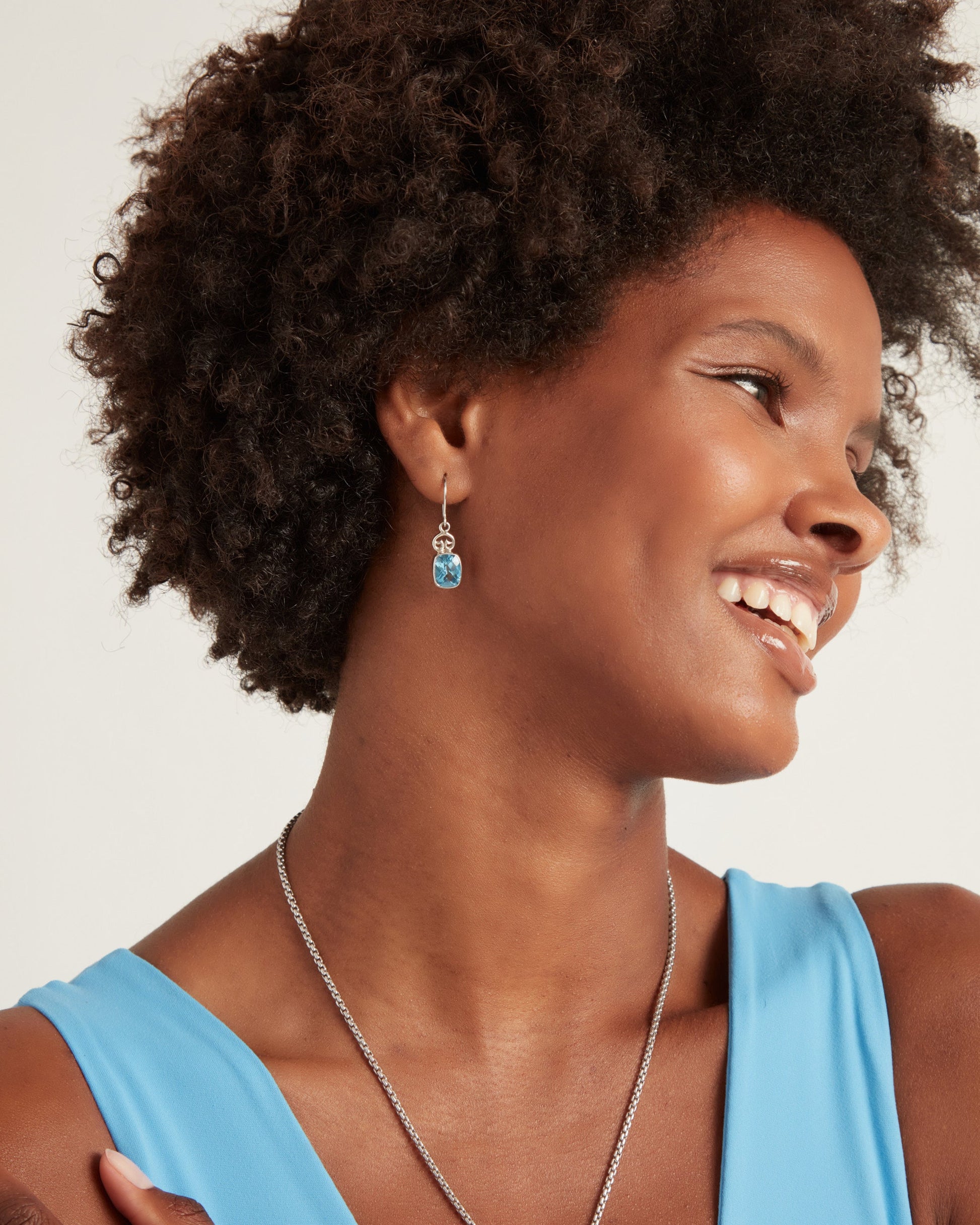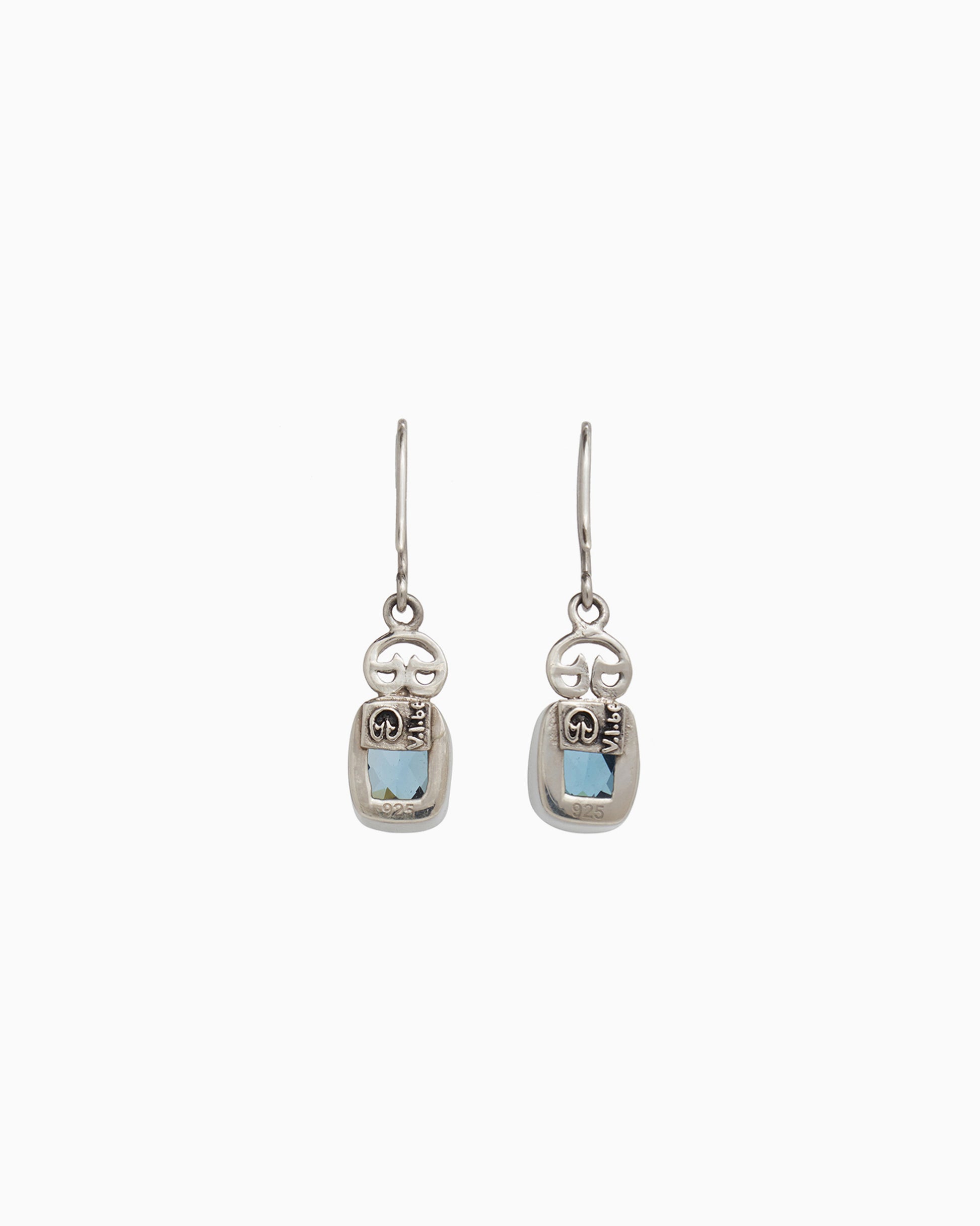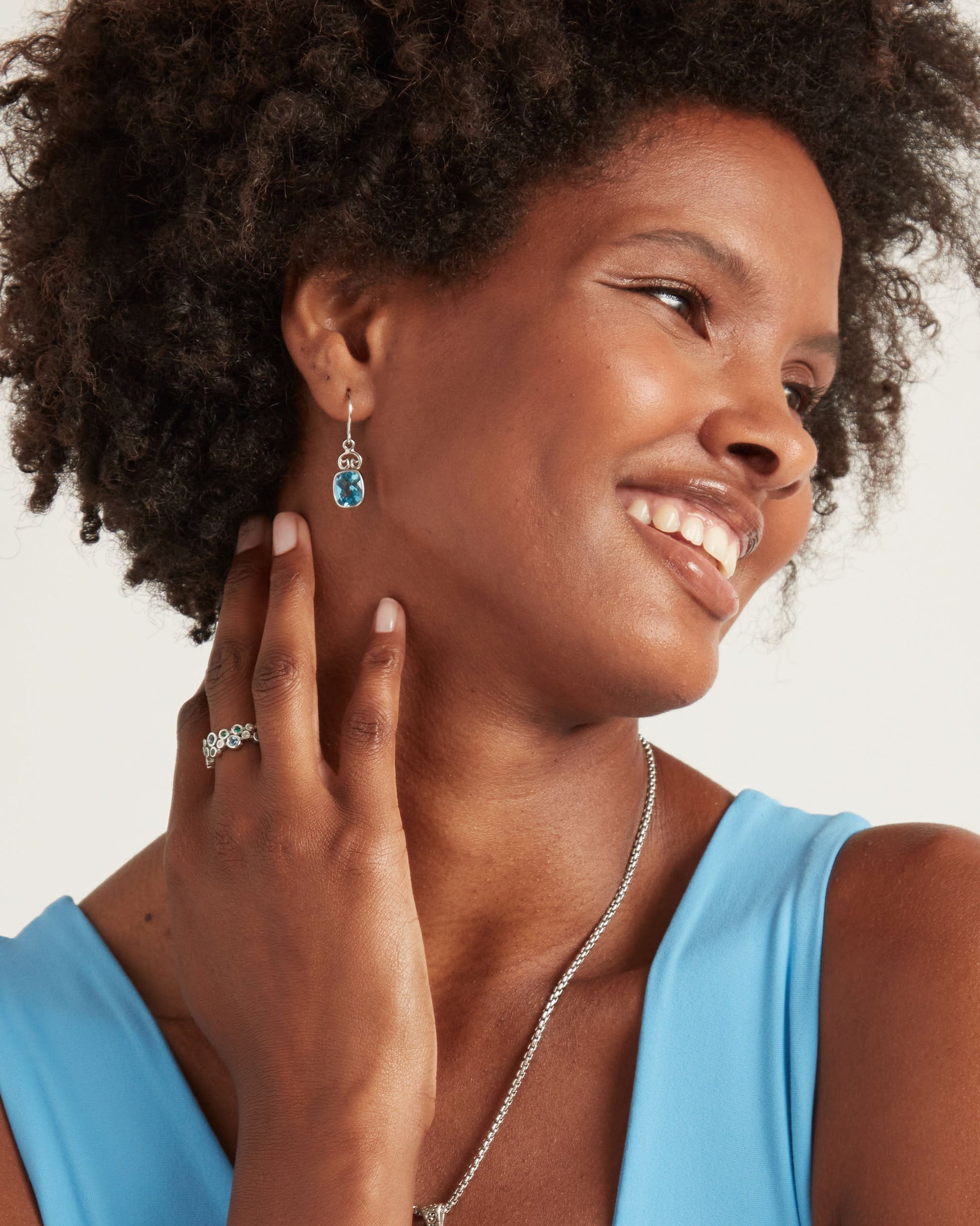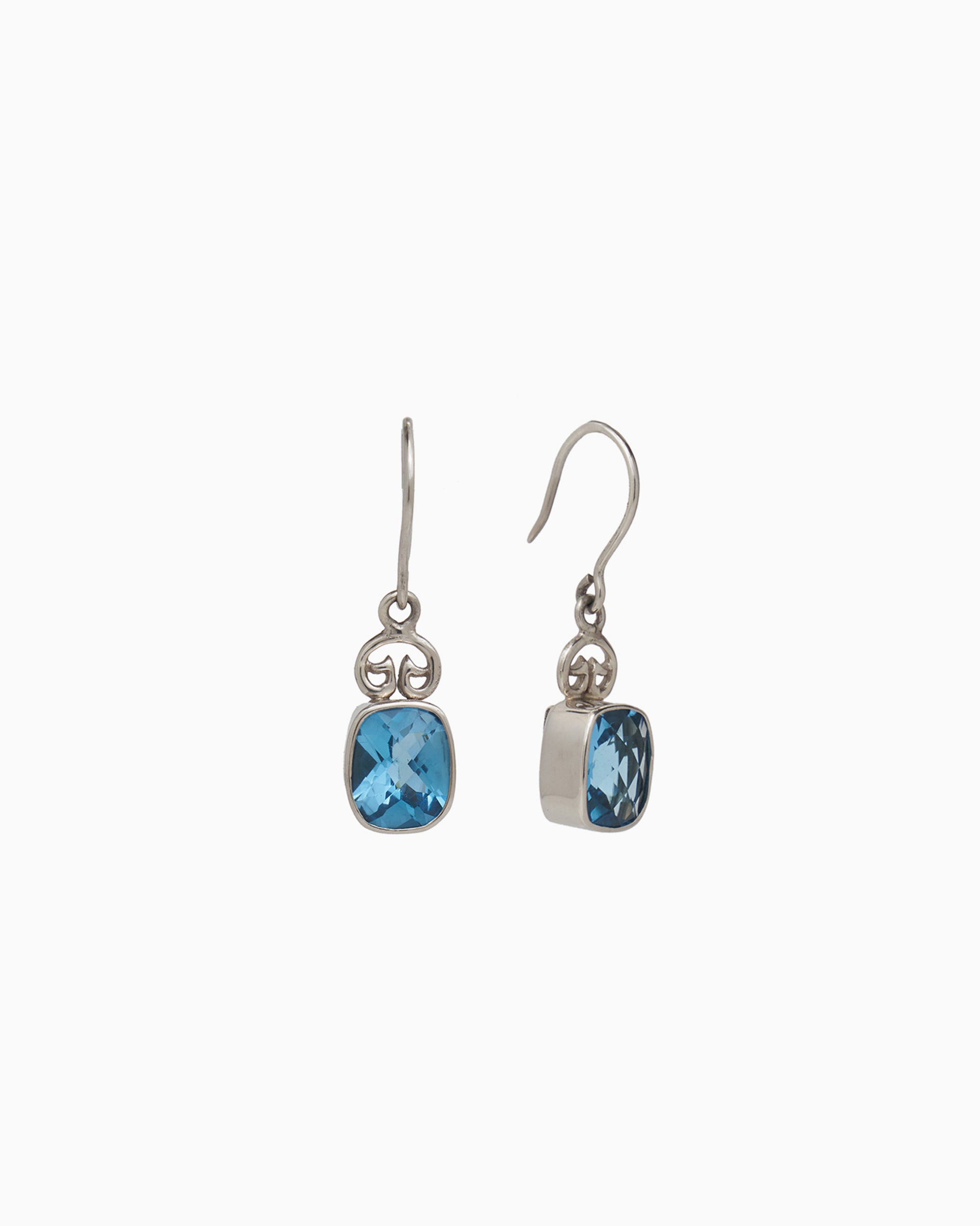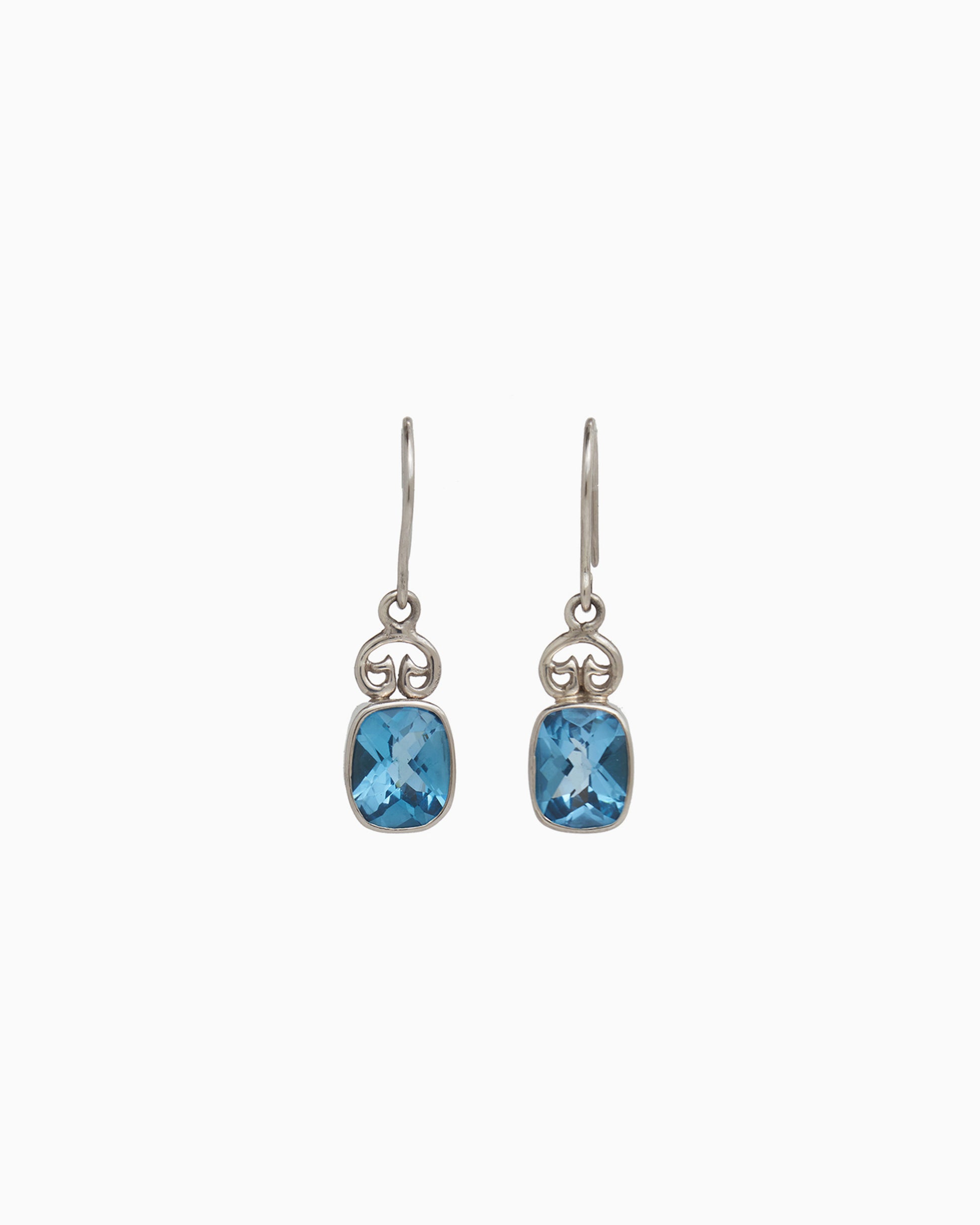 The Petroglyph and Elongated Stone Drop Earrings are handcrafted in sterling silver and hang gracefully from the earlobe. They showcase a rectangular faceted Hampton blue topaz stone, topped with a replica of the iconic St. John petroglyph.