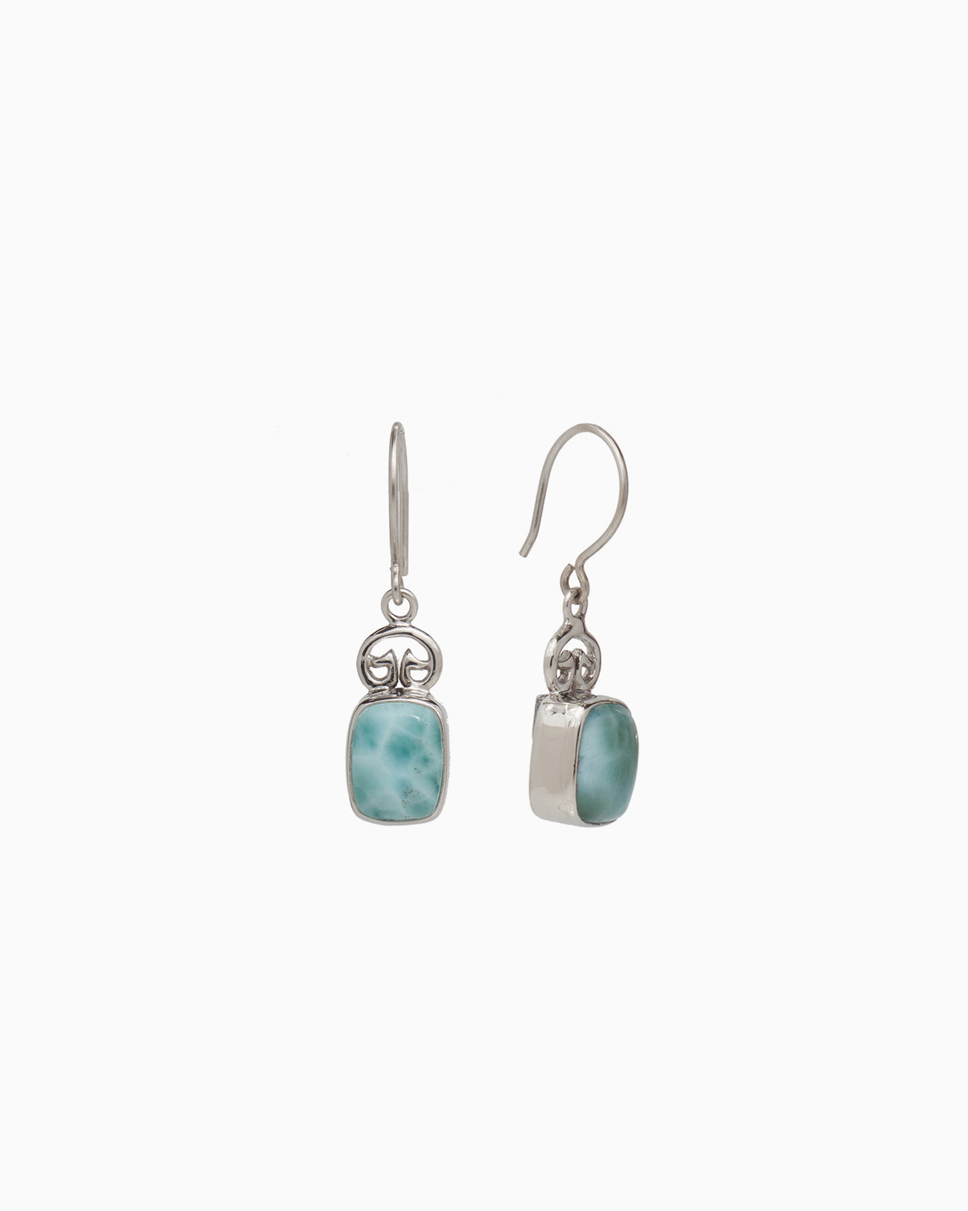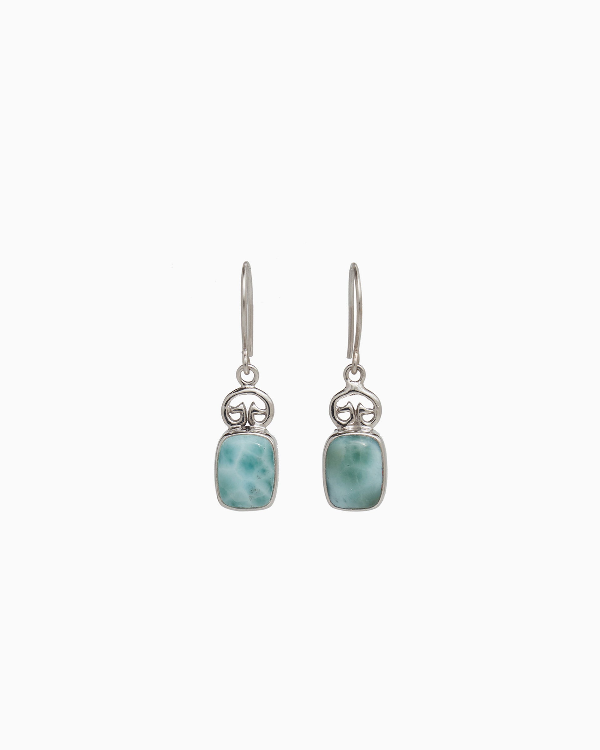 The Petroglyph and Elongated Stone Drop Earrings are handcrafted in sterling silver and hang gracefully from the earlobe. They showcase a rectangular larimar cabochon, topped with a replica of the iconic St. John petroglyph.