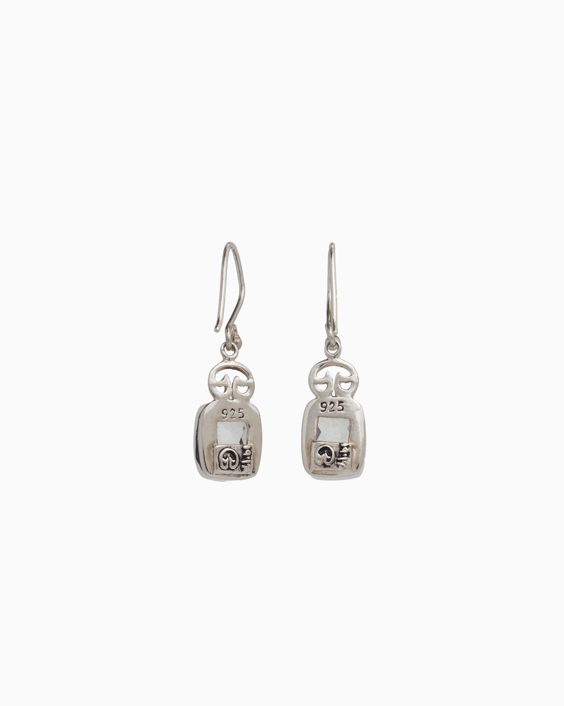 The Petroglyph and Elongated Stone Drop Earrings are handcrafted in sterling silver and hang gracefully from the earlobe. They showcase a rectangular faceted white topaz stone, topped with a replica of the iconic St. John petroglyph.