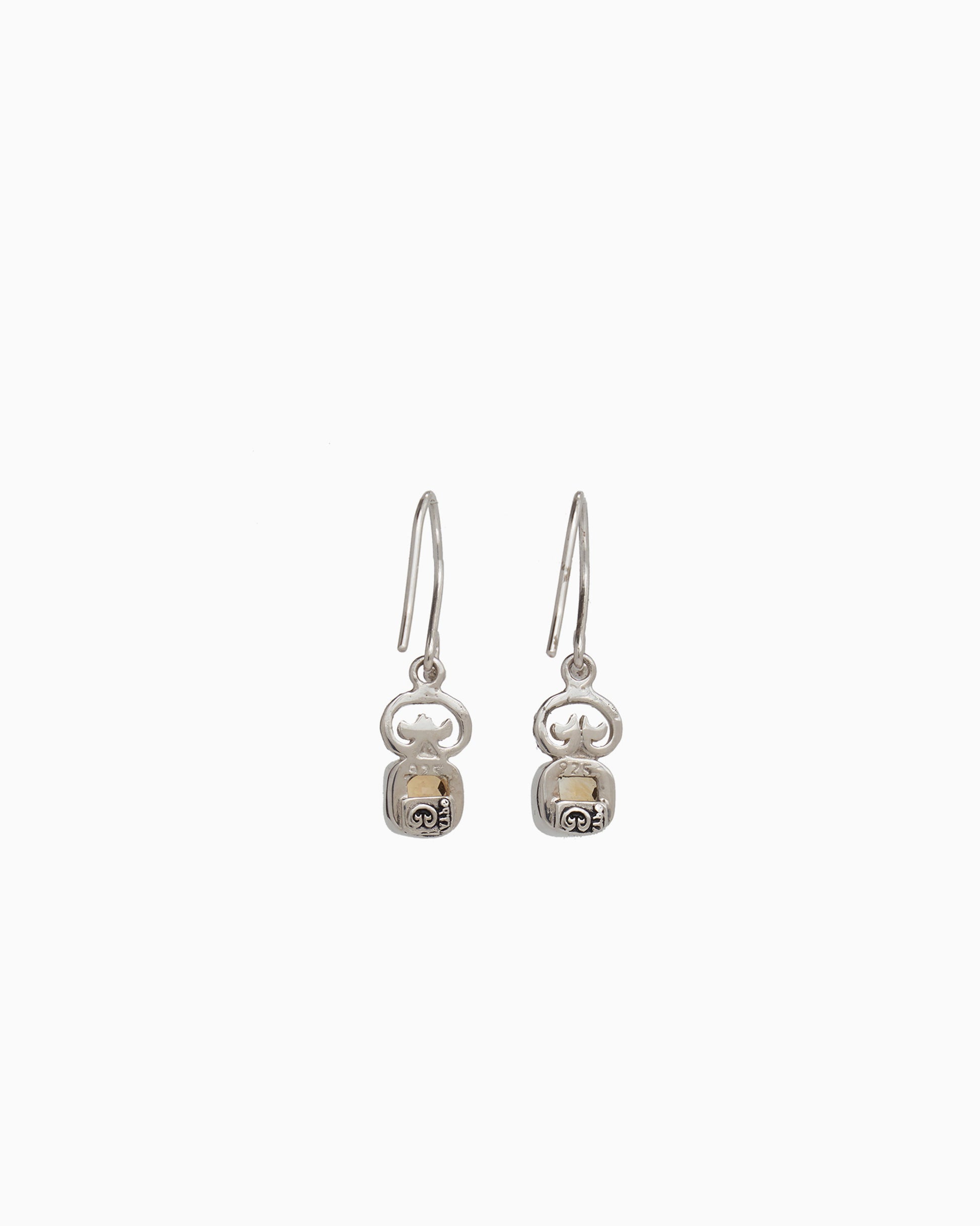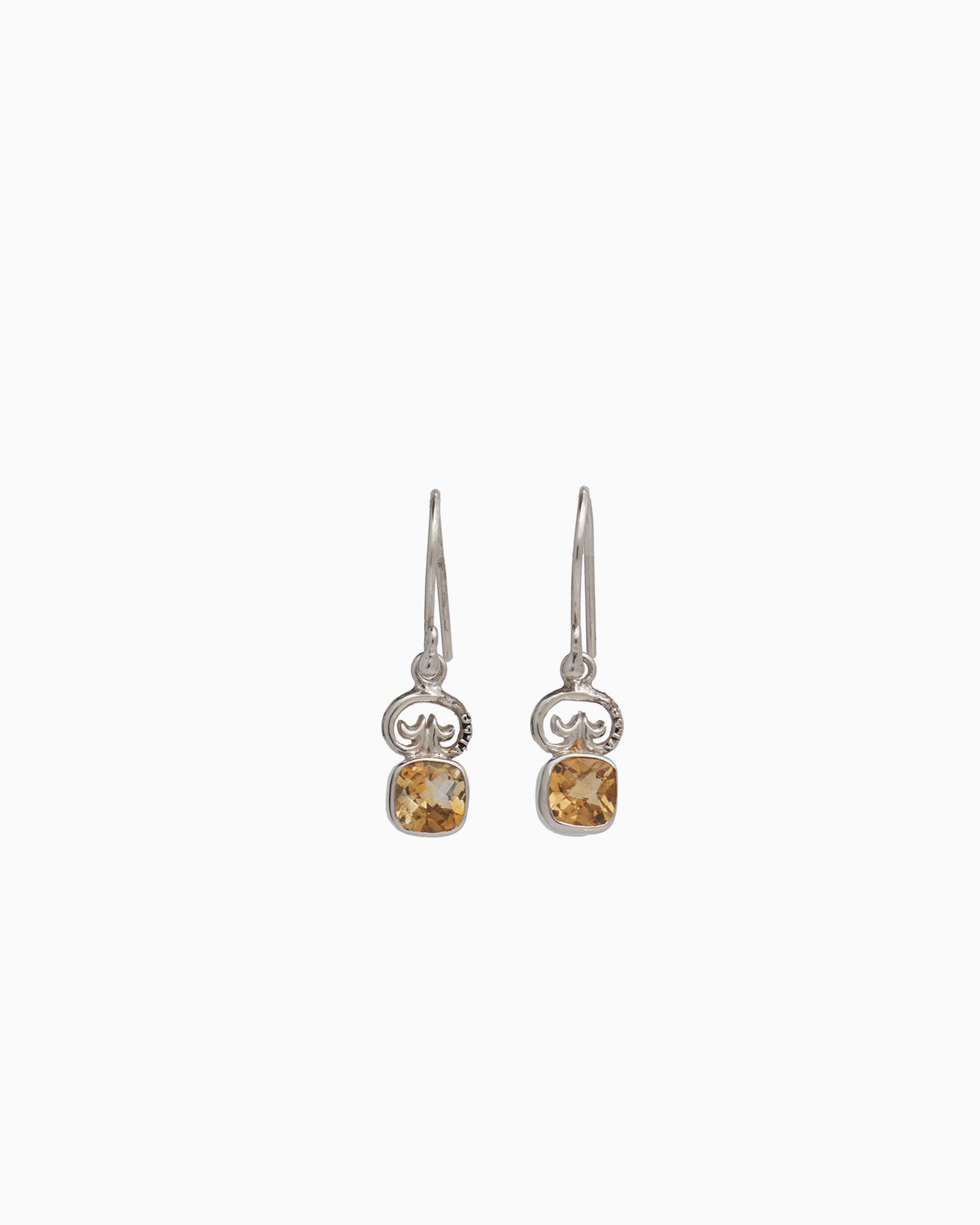 The Petroglyph and Square Stone Drop Earrings are handcrafted in sterling silver and hang gracefully from the earlobe. They showcase a square faceted citrine stone, topped with a replica of the iconic St. John petroglyph.