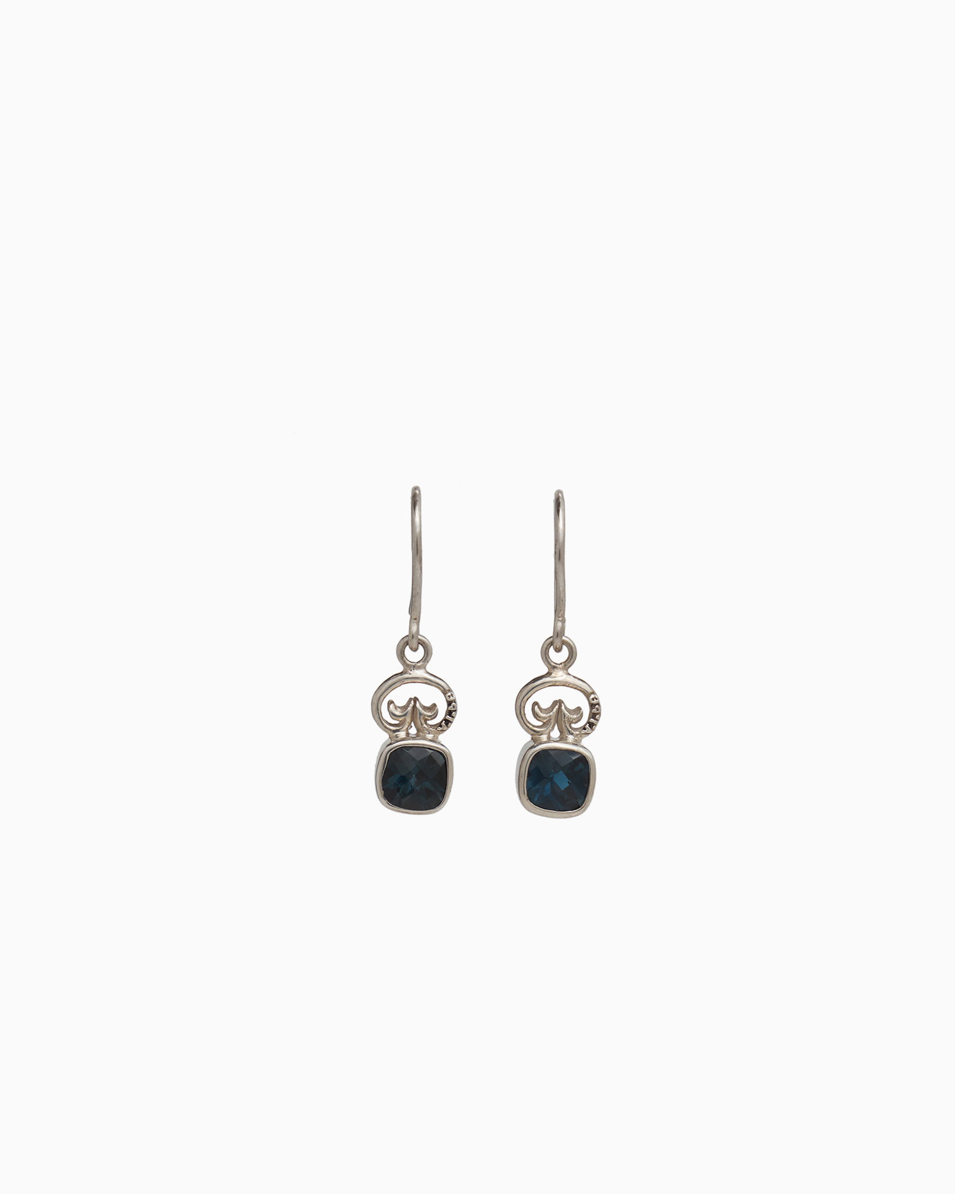 The Petroglyph and Square Stone Drop Earrings are handcrafted in sterling silver and hang gracefully from the earlobe. They showcase a square faceted London Blue Topaz stone, topped with a replica of the iconic St. John petroglyph.