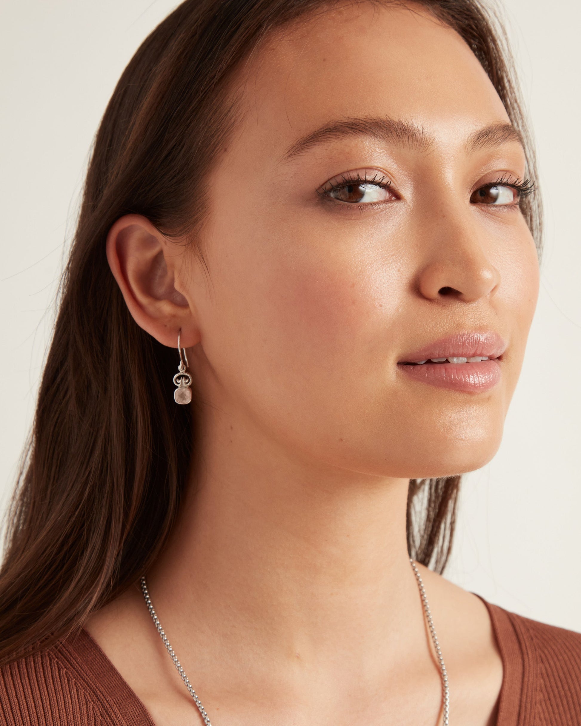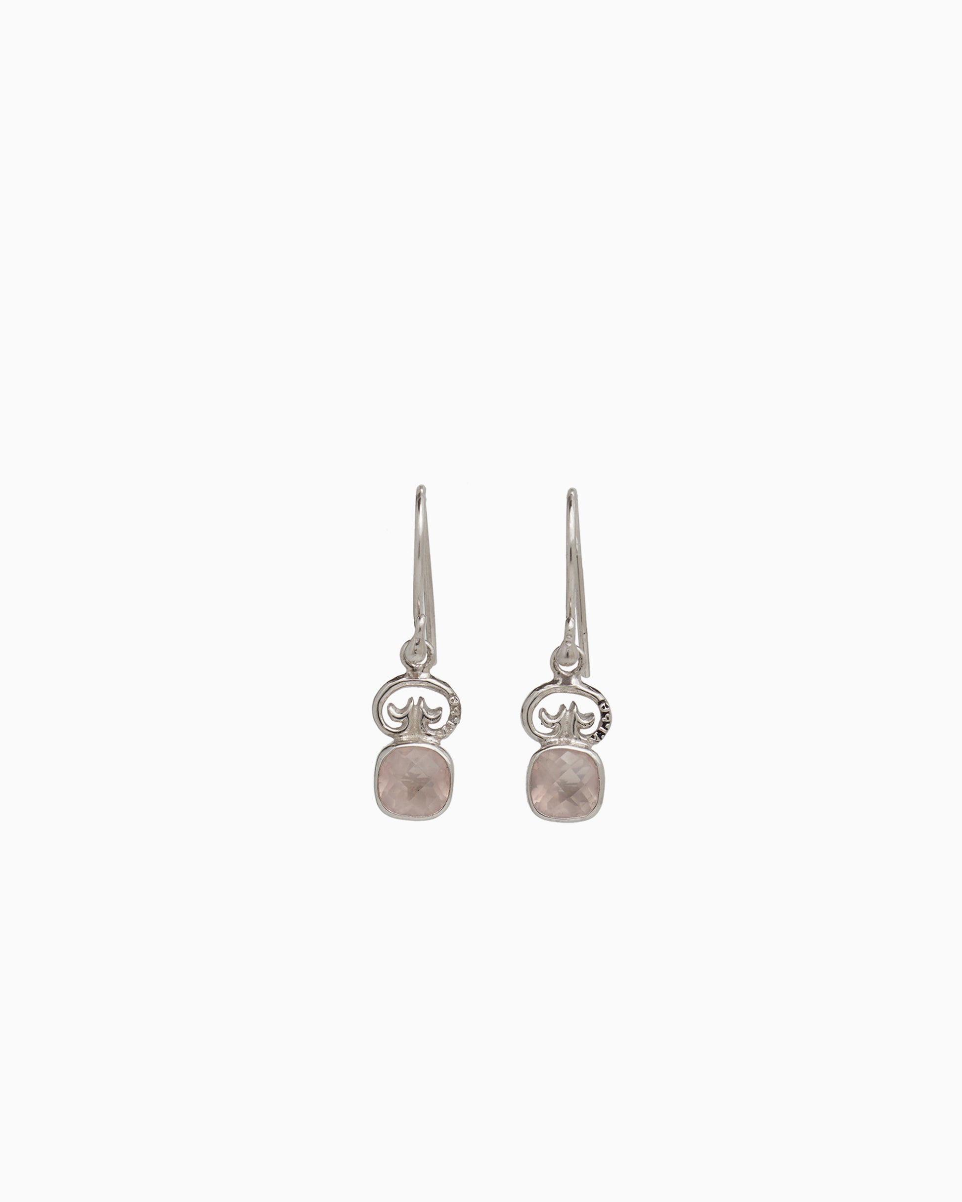 The Petroglyph and Square Stone Drop Earrings are handcrafted in sterling silver and hang gracefully from the earlobe. They showcase a square faceted rose quartz stone, topped with a replica of the iconic St. John petroglyph.