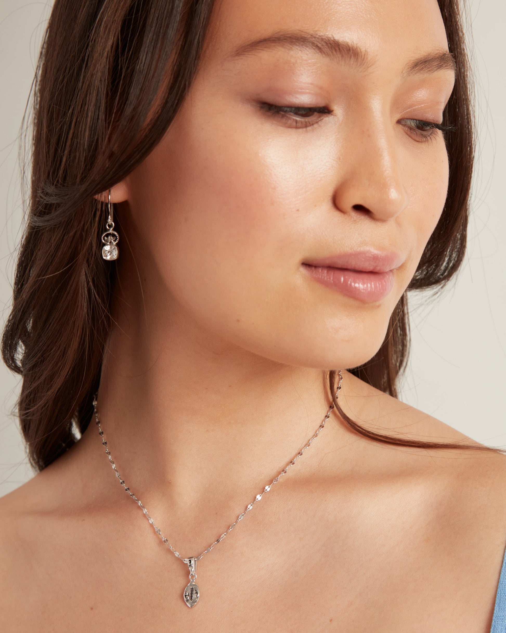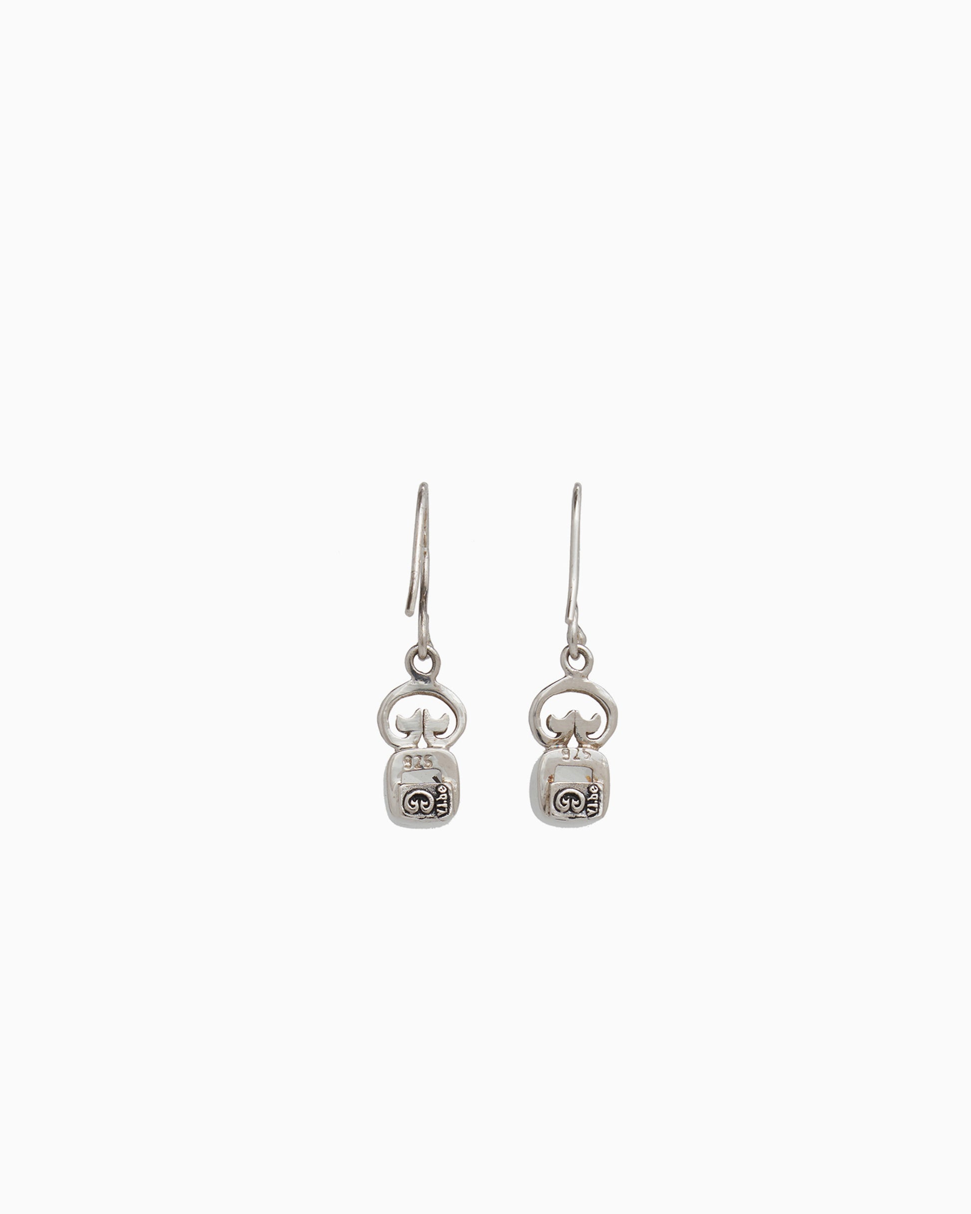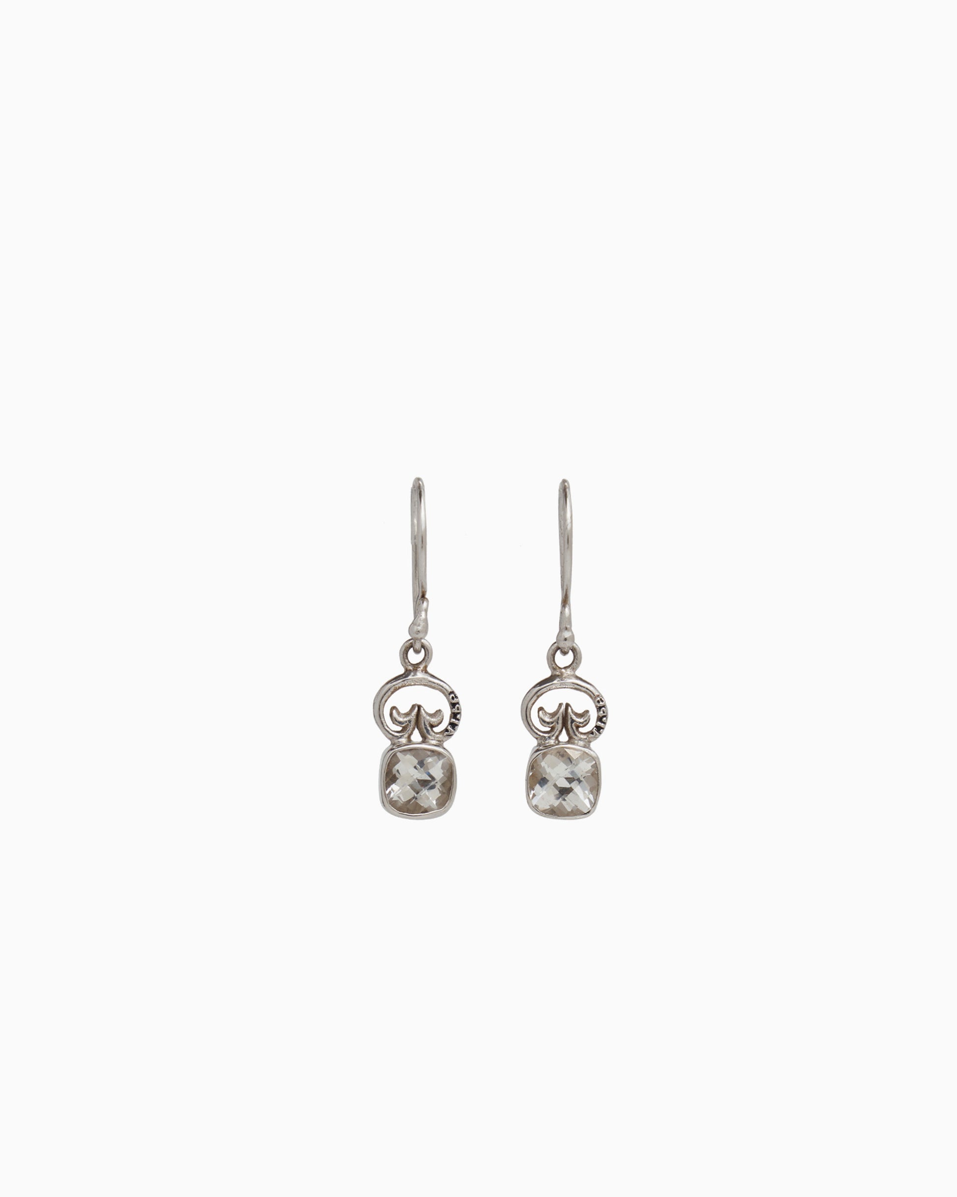 The Petroglyph and Square Stone Drop Earrings are handcrafted in sterling silver and hang gracefully from the earlobe. They showcase a square faceted white topaz stone, topped with a replica of the iconic St. John petroglyph.