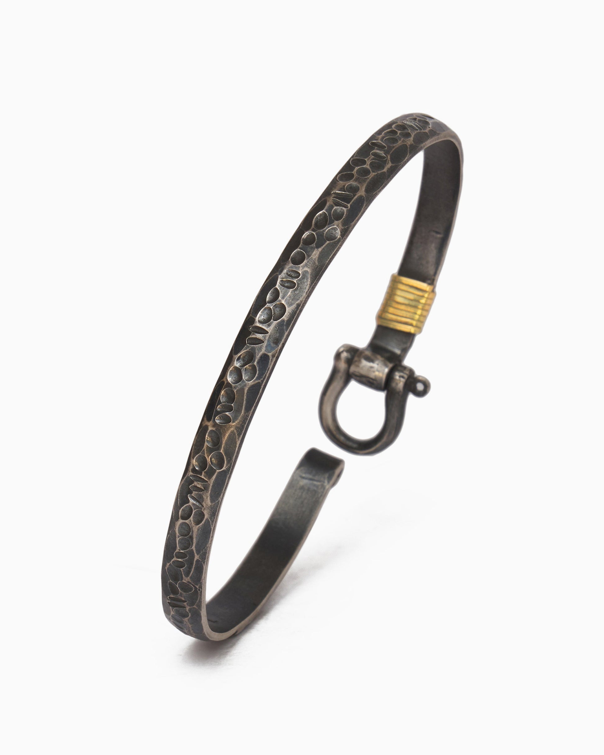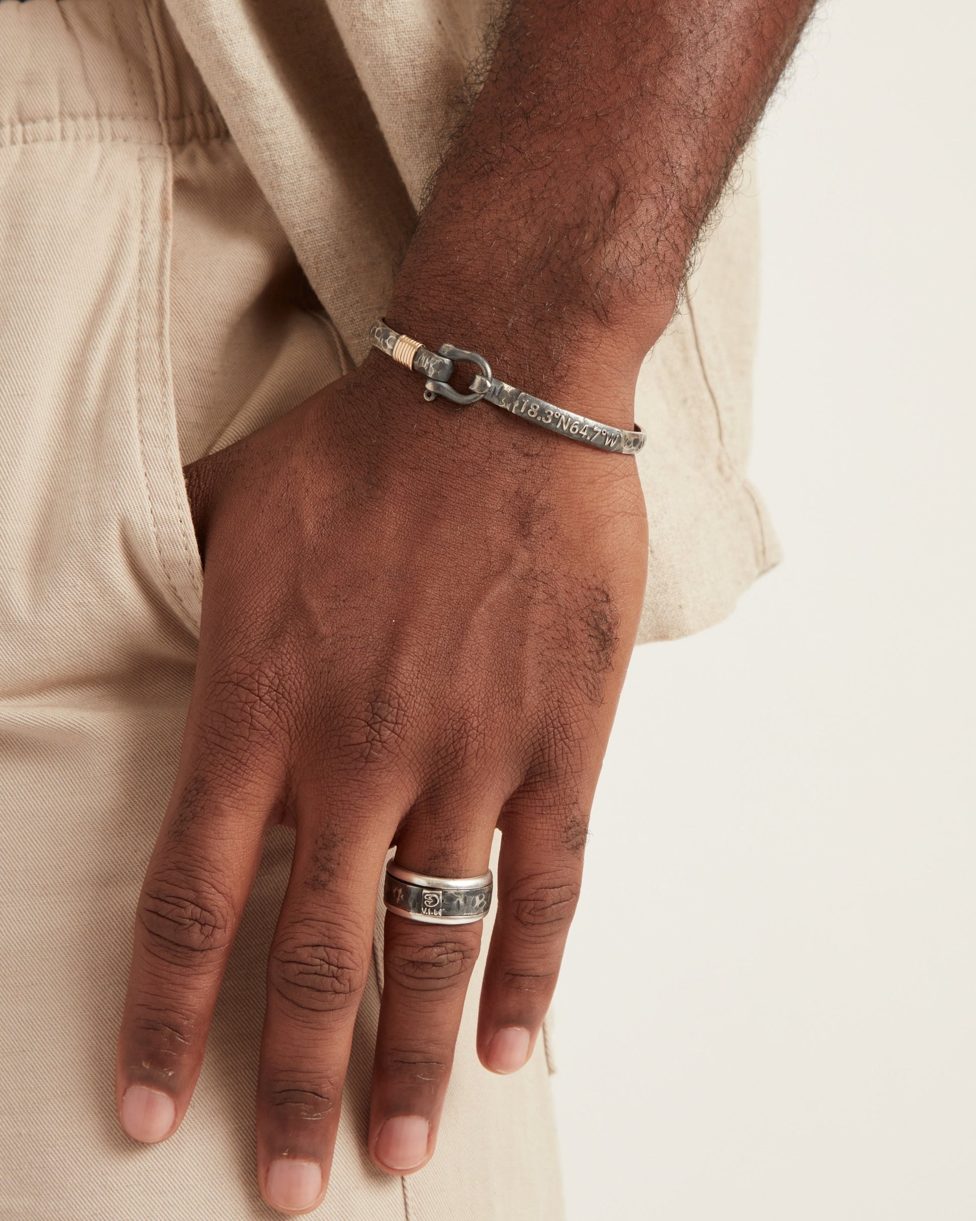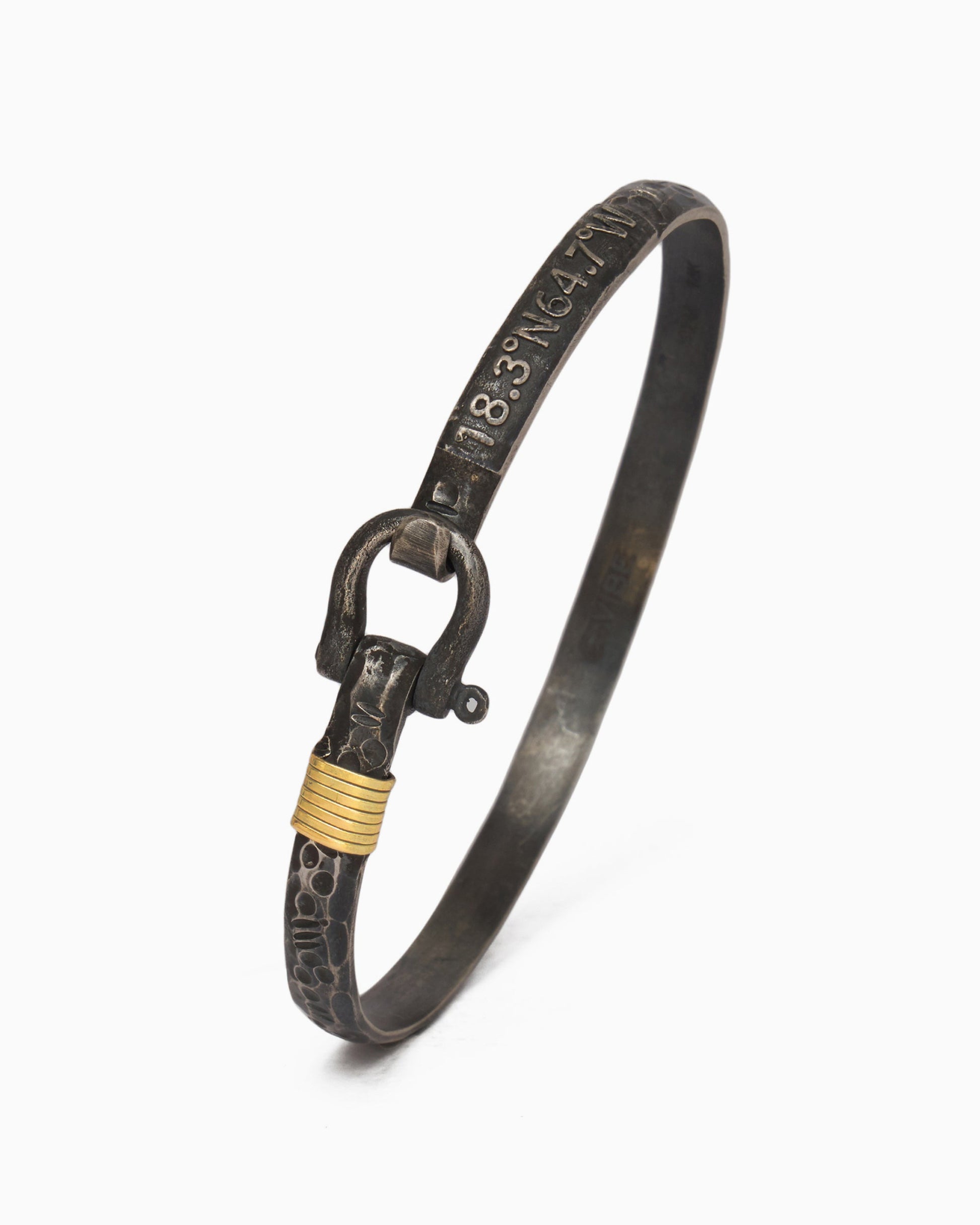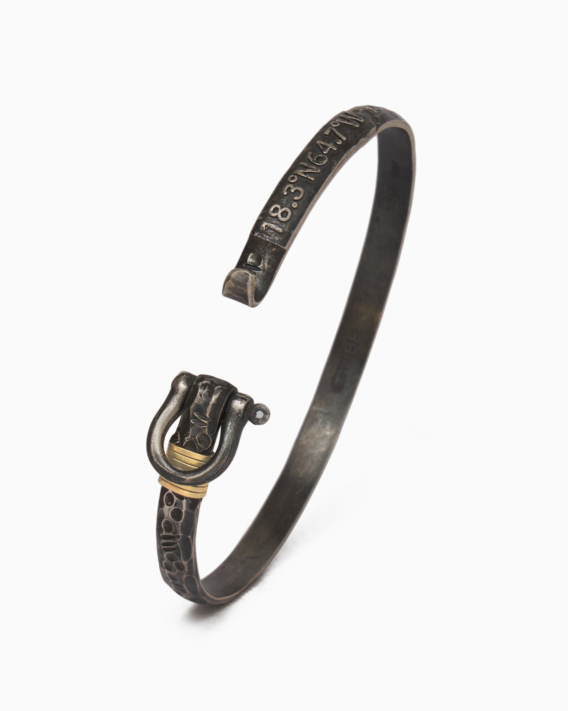 A Vibe signature, the Pirate Texture Buckle Bracelet is fashioned in oxidized sterling silver with a sailor-inspired captain's buckle clasp. Our signature pirate texture gives a rugged, weathered look to the piece. Featuring the St. John coordinates and seven 14K gold good luck wraps, solo or stacked, it is sure to be a favorite statement piece. Found in many of our designs, Vibe’s seven good luck wraps represent love, laughter, happiness, good fortune, health, unity, and peace. Representing strength and unity, the buckle design is a symbol of eternity. Wear this piece on its own or stack it with other bracelets for a layered look. With our oxidized finishes, no two are alike. Each original piece is handcrafted by Vibe artisans and markings and shades will vary.