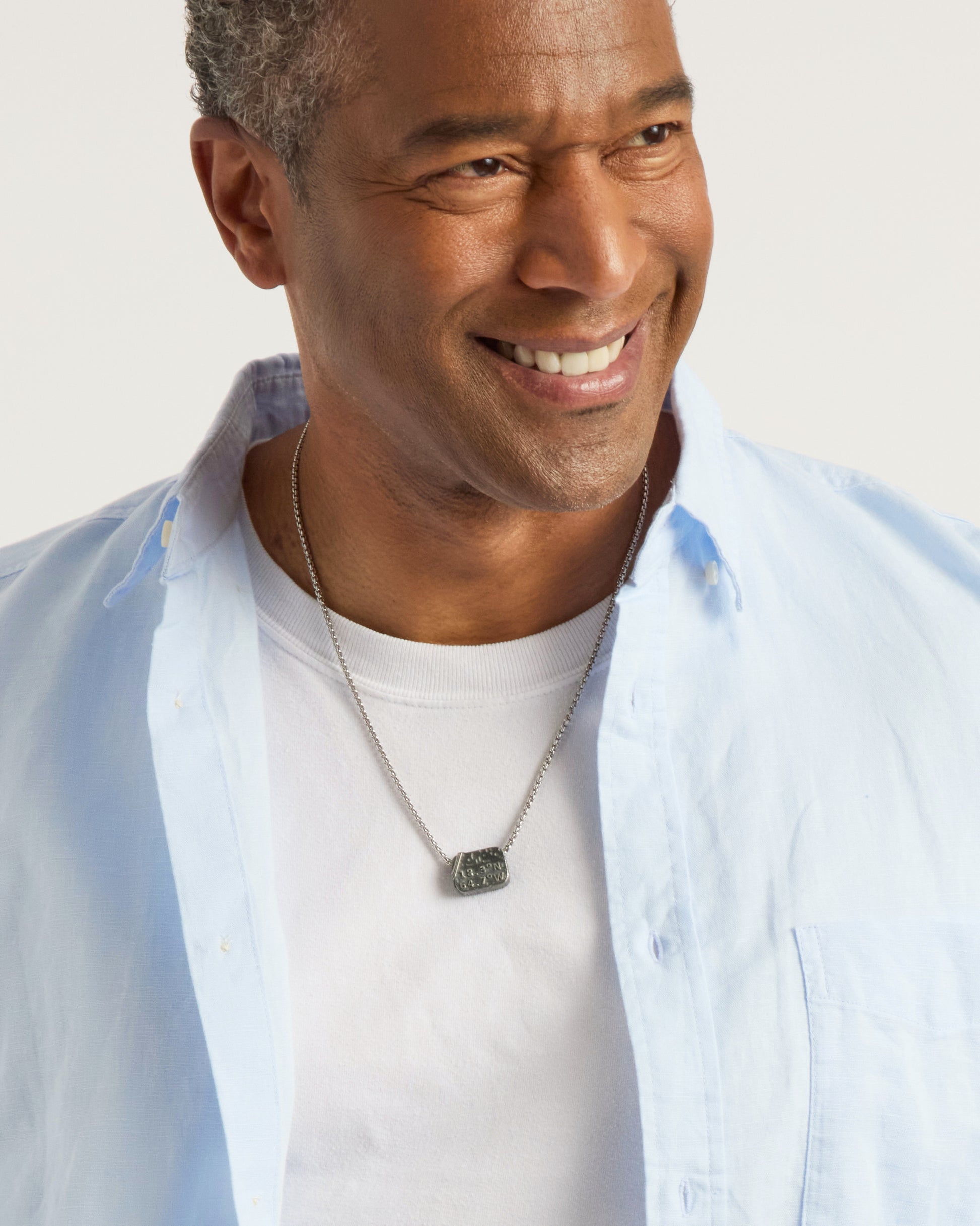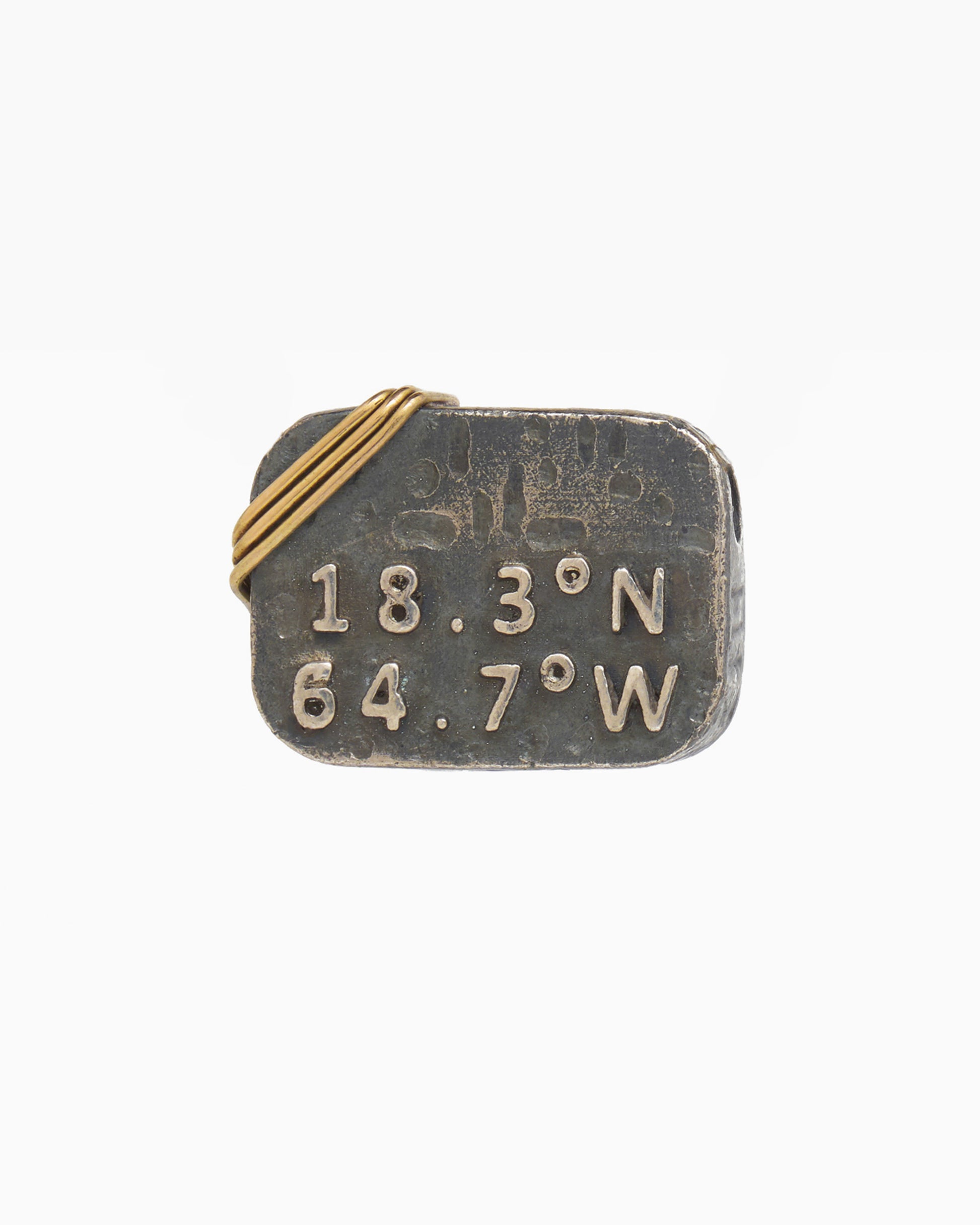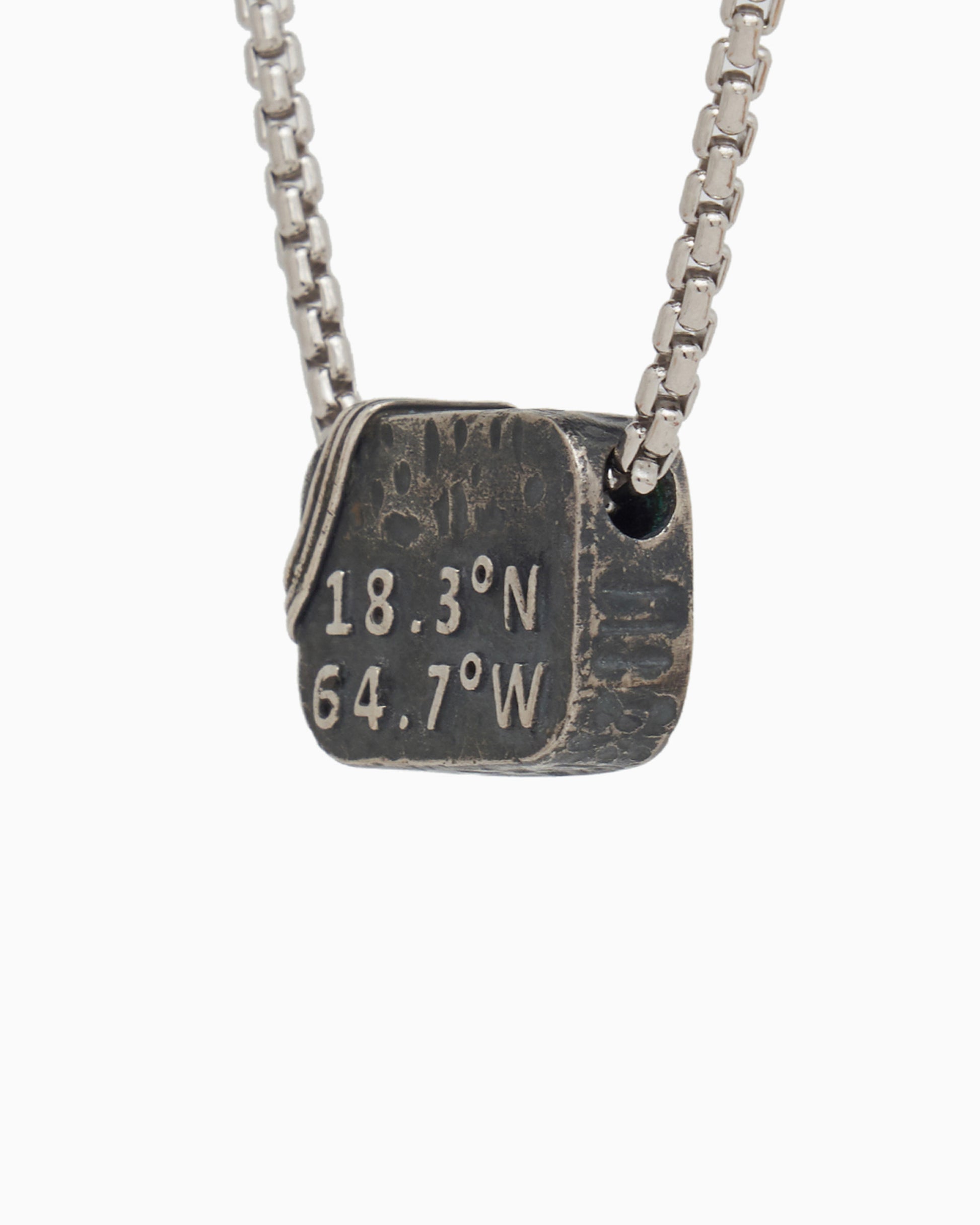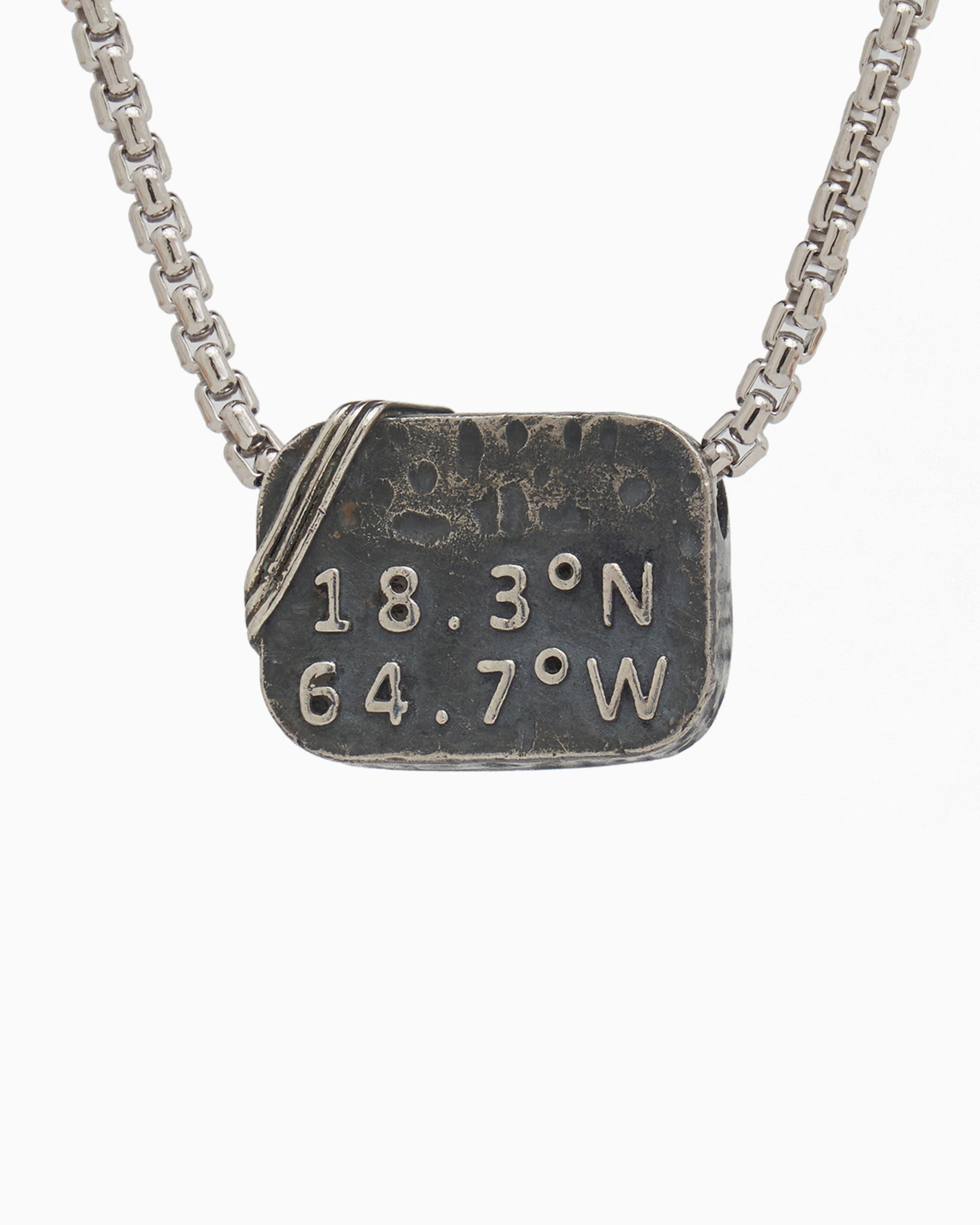 The Pirate Texture Bullion Pendant is handcrafted with oxidized sterling silver, has a unique pirate texture, and features the St. John island coordinates. With our oxidized finishes, no two are alike! Each original piece is handcrafted by Vibe artisans and markings and shades will vary. Pair with your favorite chain, sold separately.