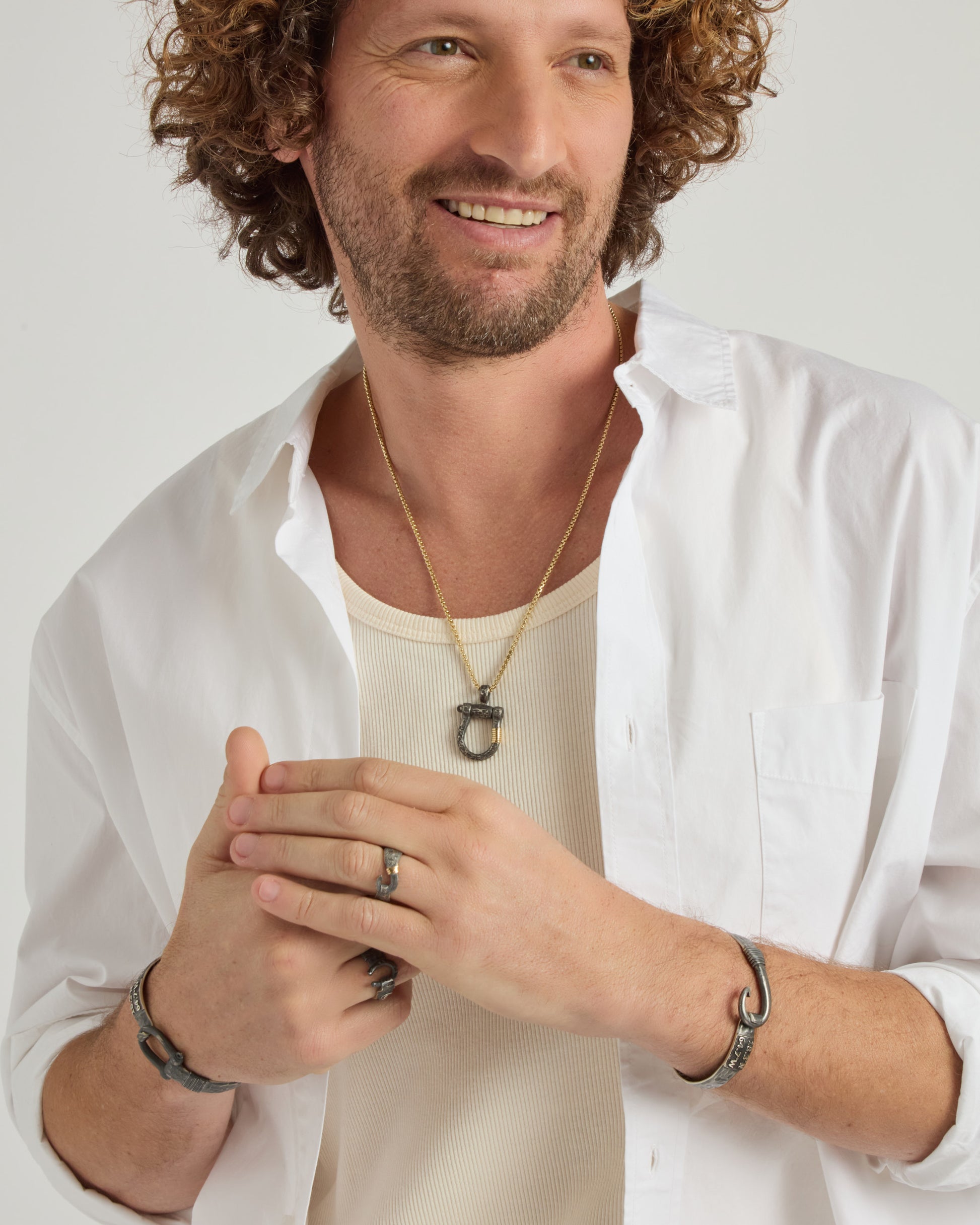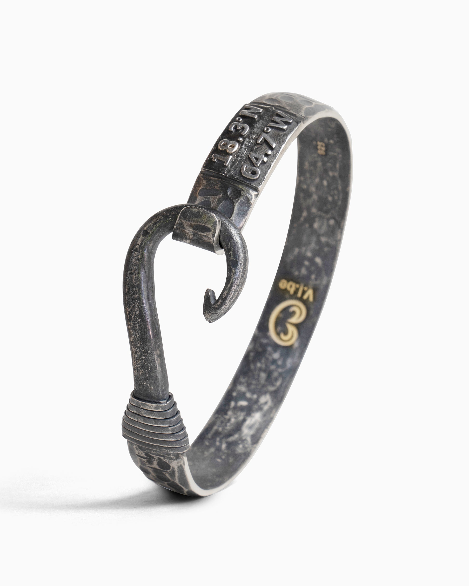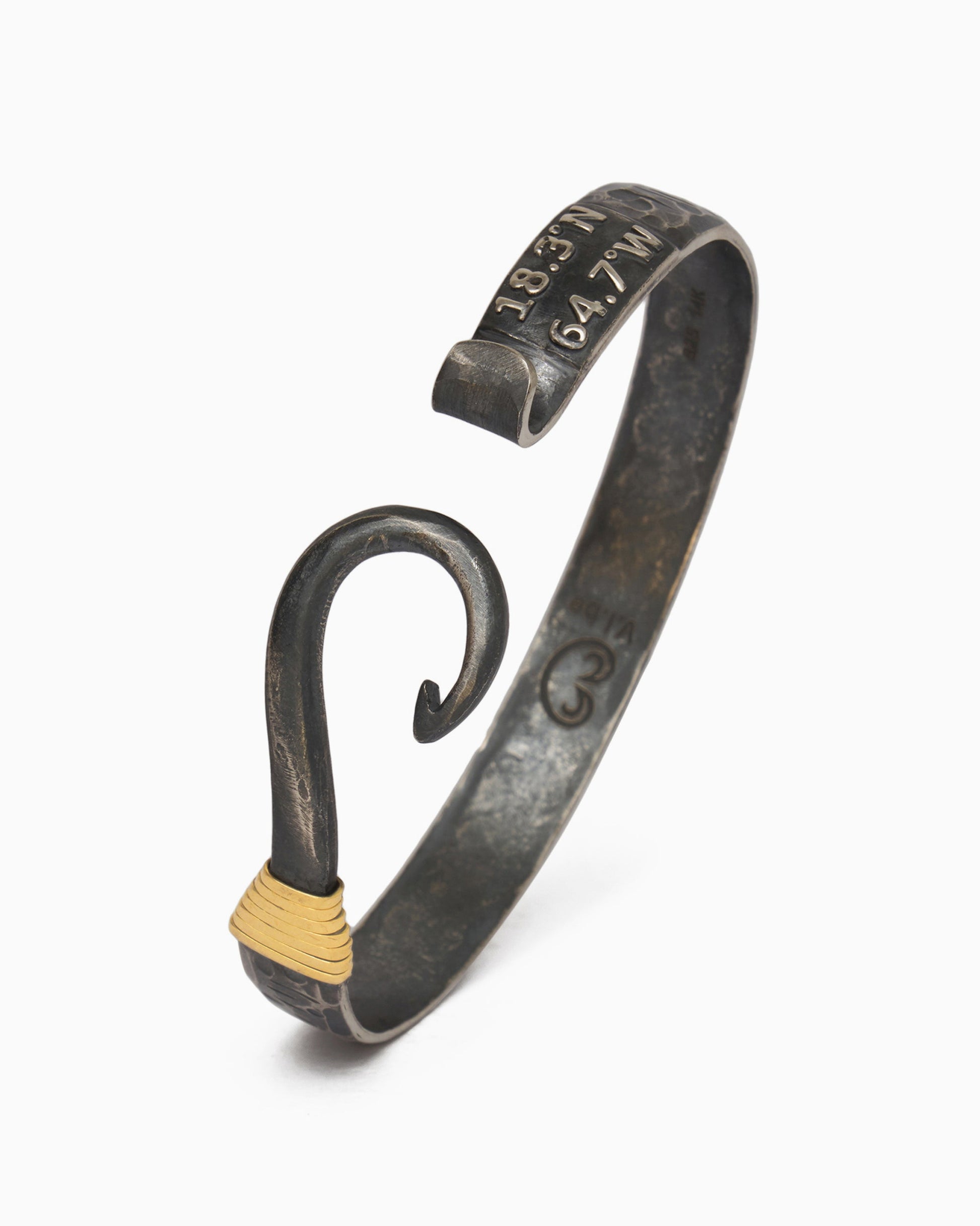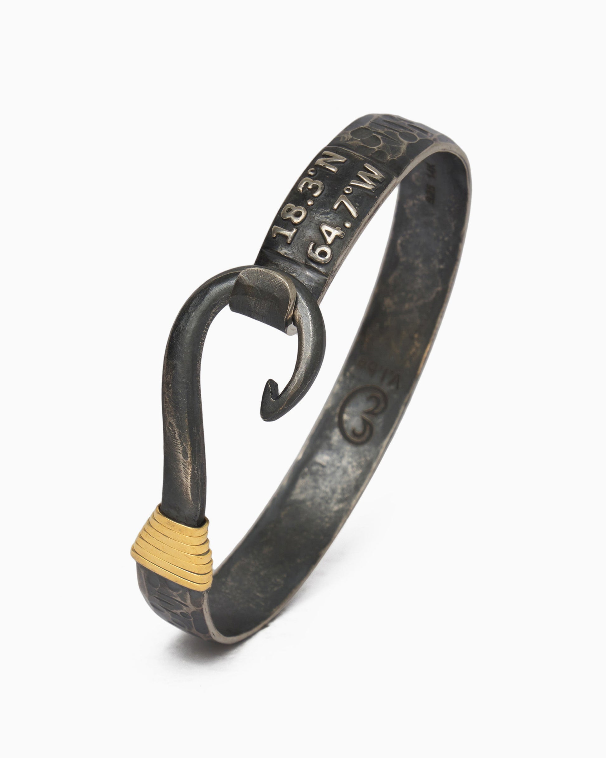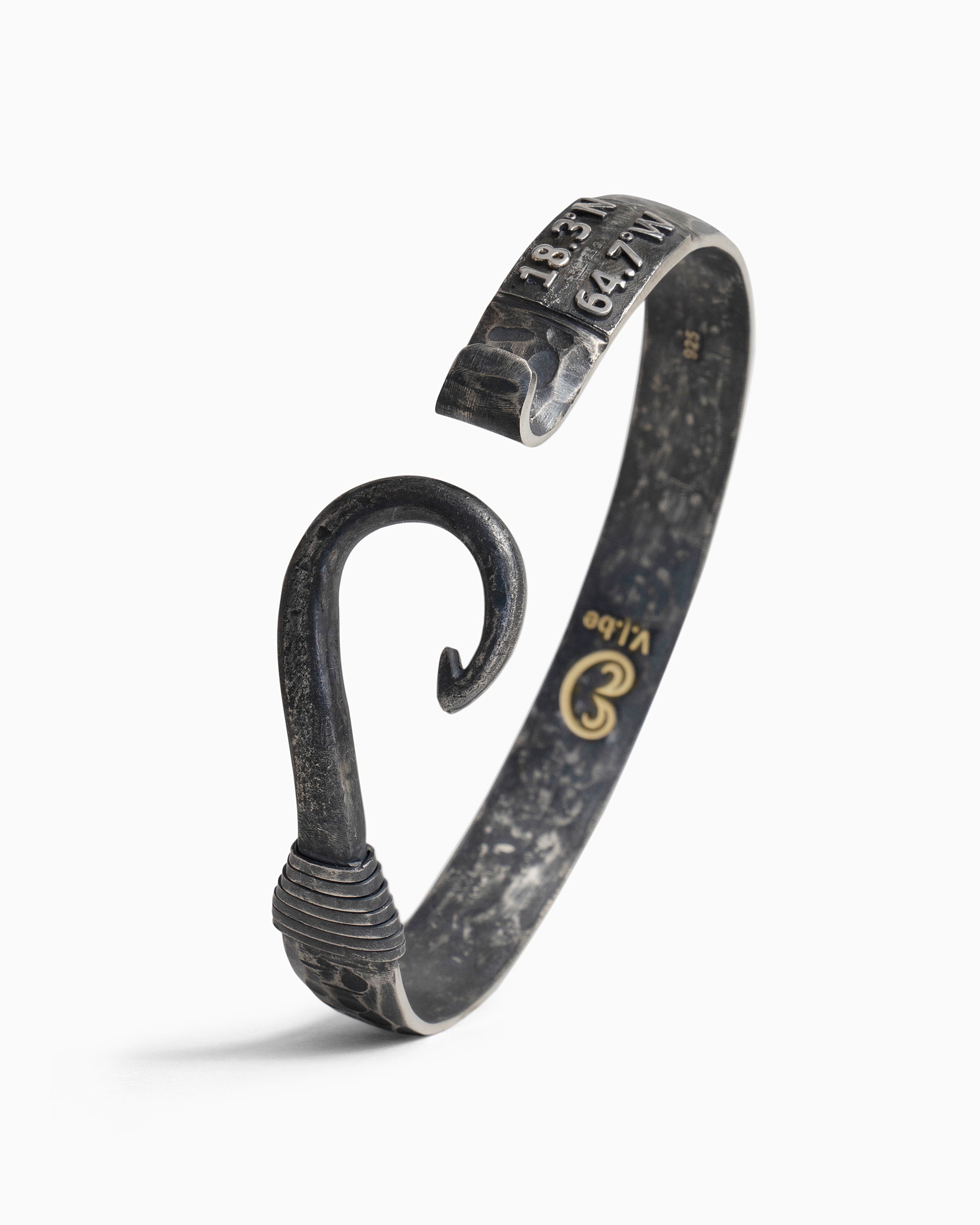 A Vibe signature, the Pirate Texture Fish Hook Bracelet is fashioned in oxidized sterling silver with a fish hook clasp. Our signature pirate texture gives a rugged, weathered look to the piece. Featuring the St. John coordinates and seven 14K gold good luck wraps, solo or stacked, it is sure to be a favorite statement piece. Found in many of our designs, Vibe’s seven good luck wraps represent love, laughter, happiness, good fortune, health, unity, and peace.