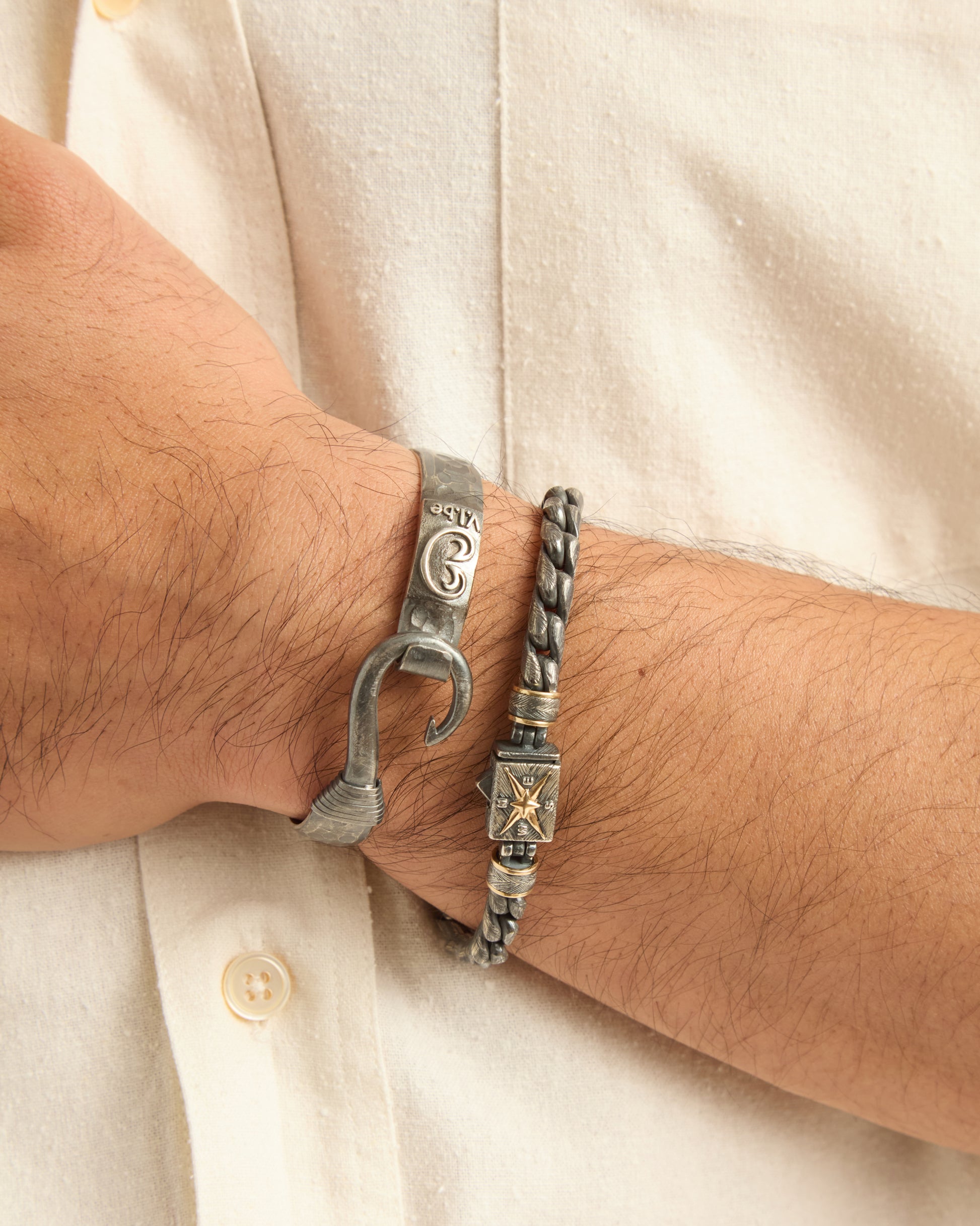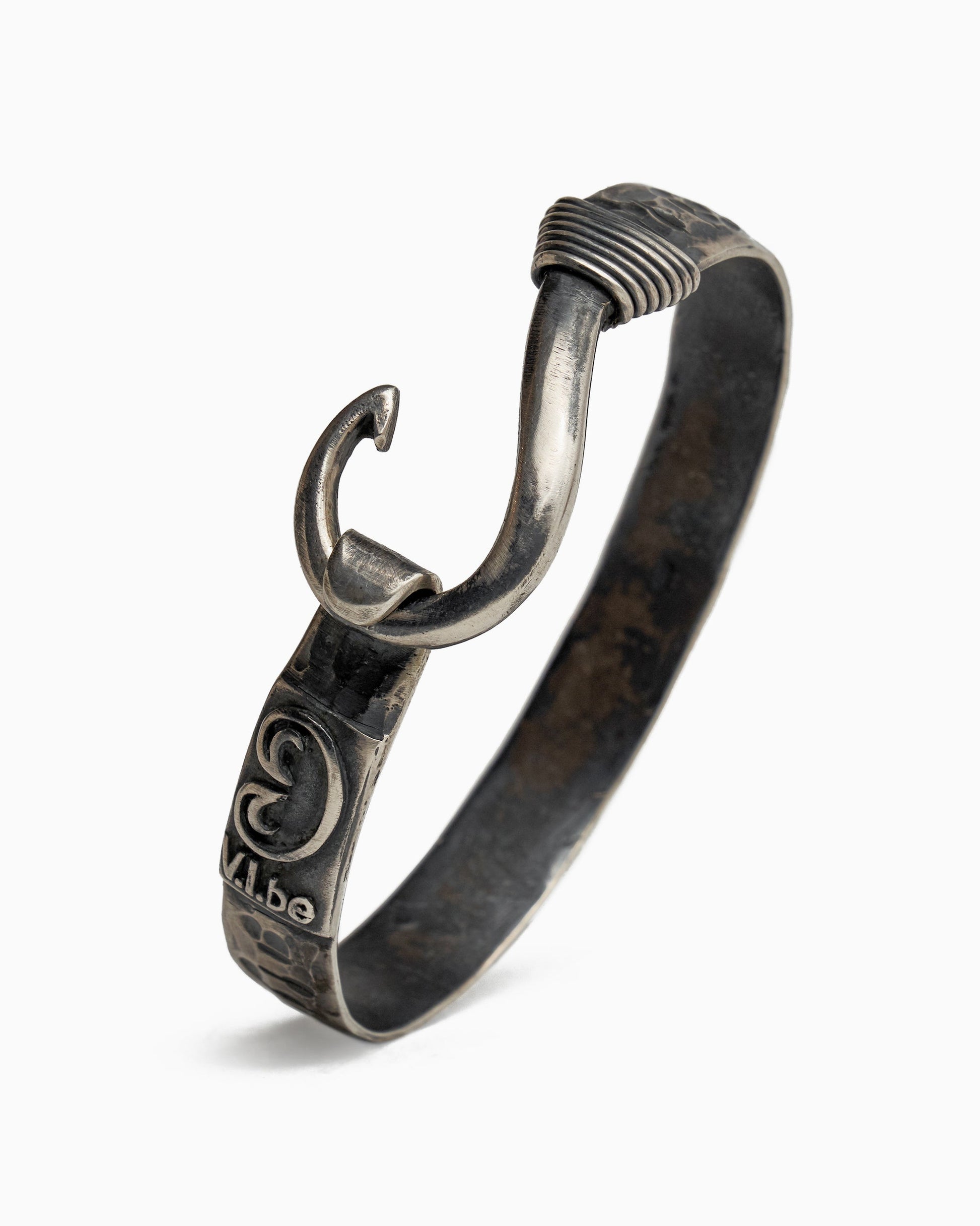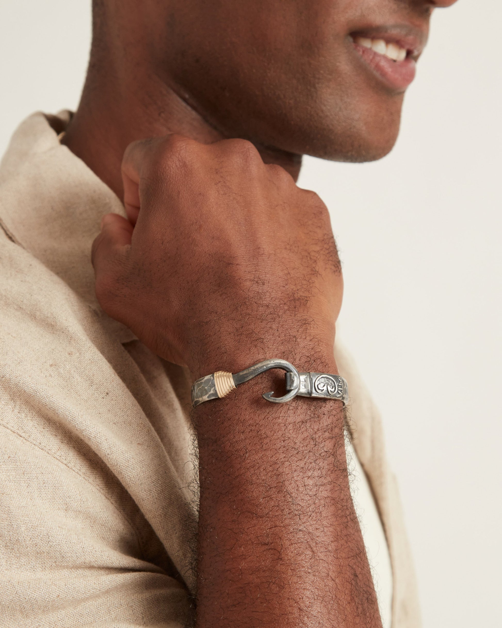 A Vibe signature, the Pirate Texture Fish Hook Bracelet is fashioned in oxidized sterling silver with a fish hook clasp. Our signature pirate texture gives a rugged, weathered look to the piece. Featuring a replica of the St. John petroglyph and seven 14K gold good luck wraps, solo or stacked, it is sure to be a favorite statement piece. Found in many of our designs, Vibe’s seven good luck wraps represent love, laughter, happiness, good fortune, health, unity, and peace. In Caribbean tradition, the fish hook design represents a symbol of love and hope. Fishermen's wives wore hooks facing their hearts, wishing for their husband's safe return from the sea. Wear this piece on its own or stack it with other bracelets for a layered look. With our oxidized finishes, no two are alike. Each original piece is handcrafted by Vibe artisans and markings and shades will vary.