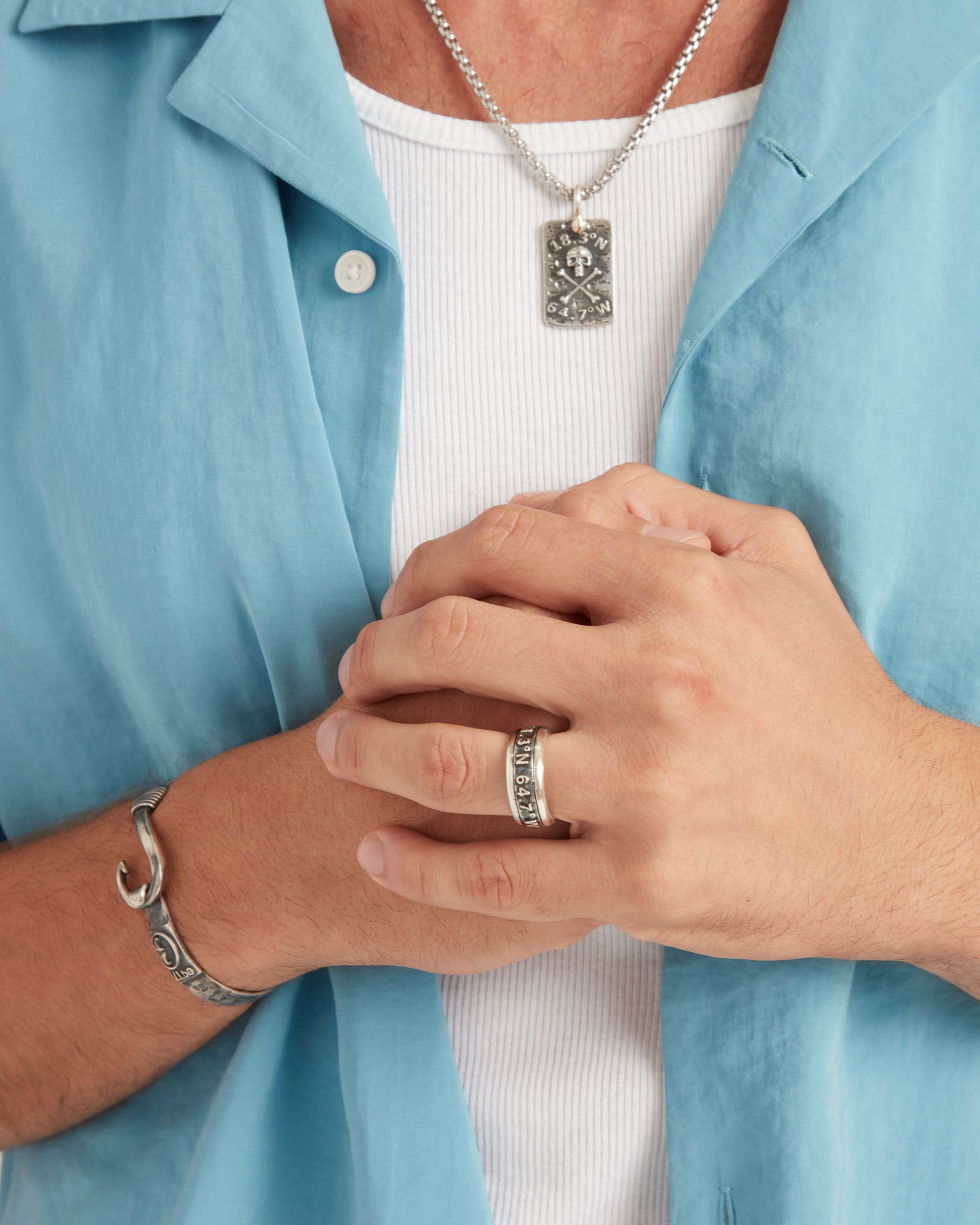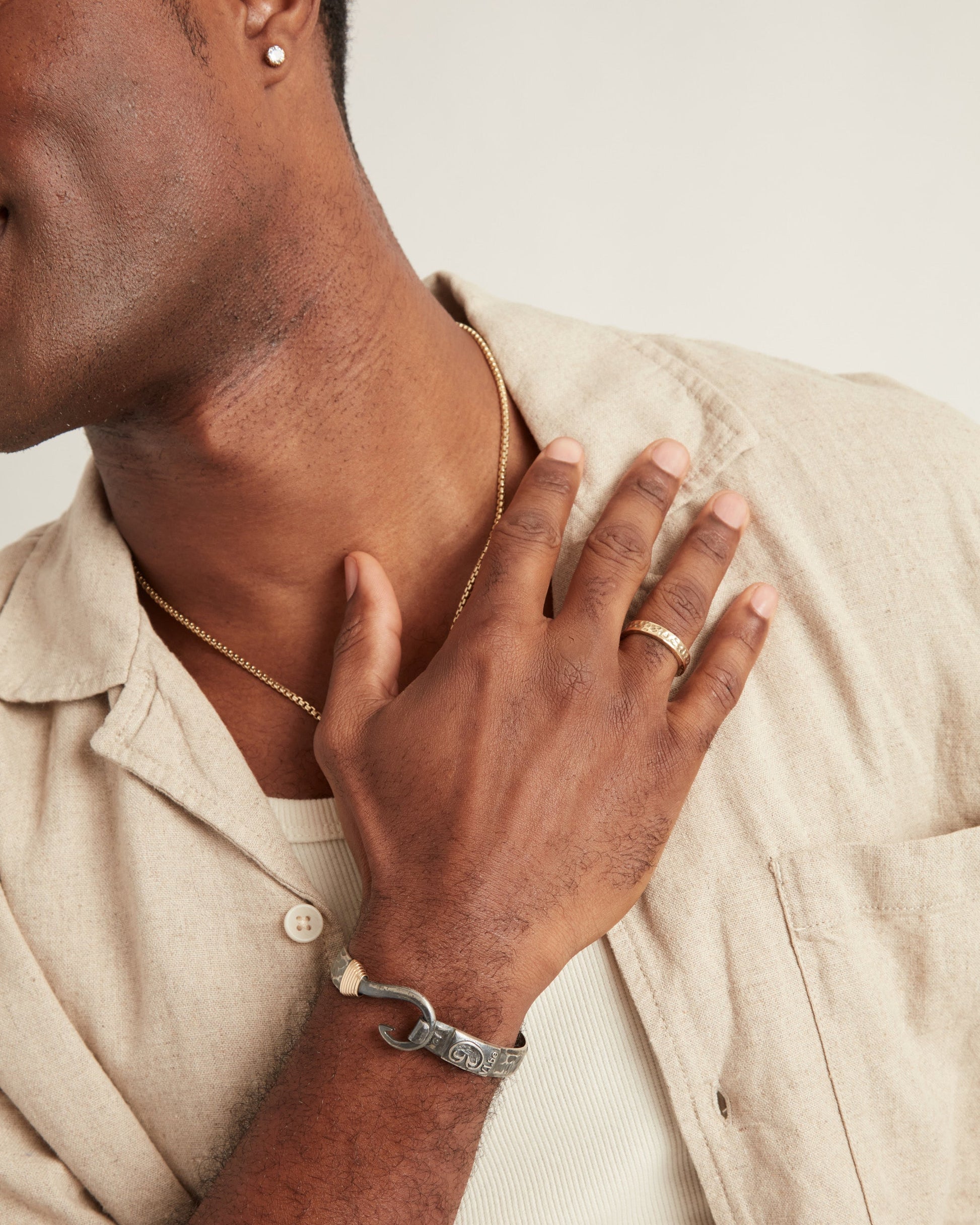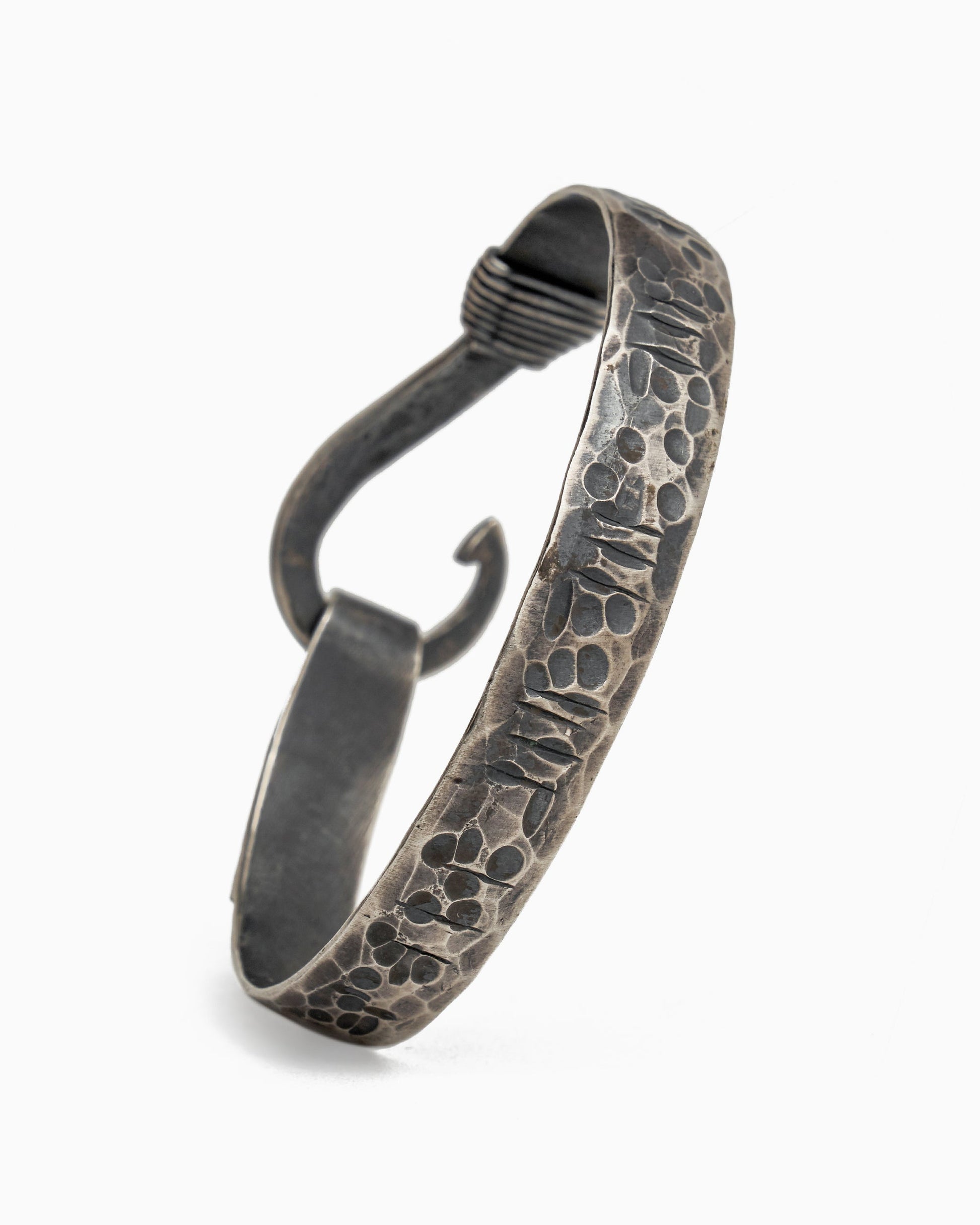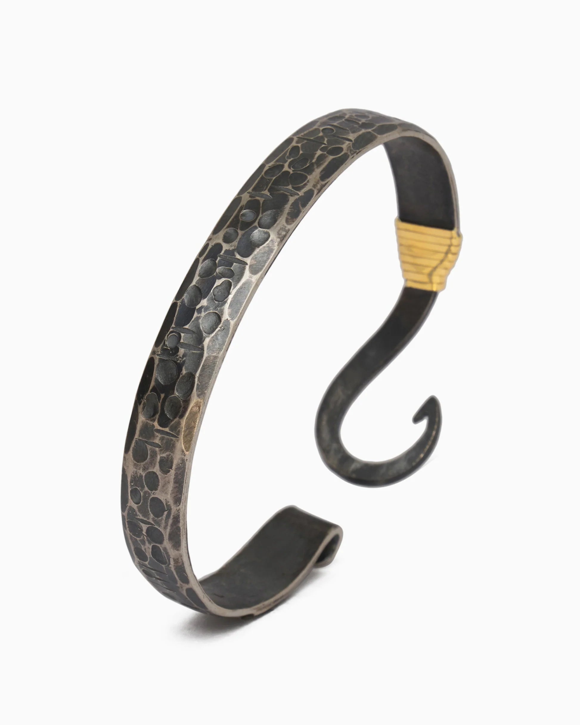 A Vibe signature, the Pirate Texture Fish Hook Bracelet is fashioned in oxidized sterling silver with a fish hook clasp. Our signature pirate texture gives a rugged, weathered look to the piece. Featuring a replica of the St. John petroglyph and seven 14K gold good luck wraps, solo or stacked, it is sure to be a favorite statement piece. Found in many of our designs, Vibe’s seven good luck wraps represent love, laughter, happiness, good fortune, health, unity, and peace. In Caribbean tradition, the fish hook design represents a symbol of love and hope. Fishermen's wives wore hooks facing their hearts, wishing for their husband's safe return from the sea. Wear this piece on its own or stack it with other bracelets for a layered look. With our oxidized finishes, no two are alike. Each original piece is handcrafted by Vibe artisans and markings and shades will vary.
