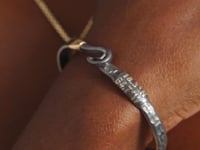 A Vibe signature, the Pirate Texture Fish Hook Bracelet is fashioned in oxidized sterling silver with a fish hook clasp. Our signature pirate texture gives a rugged, weathered look to the piece. Featuring the St. John coordinates and seven 14K gold good luck wraps, solo or stacked, it is sure to be a favorite statement piece. Found in many of our designs, Vibe’s seven good luck wraps represent love, laughter, happiness, good fortune, health, unity, and peace. In Caribbean tradition, the fish hook design represents a symbol of love and hope. Fishermen's wives wore hooks facing their hearts, wishing for their husband's safe return from the sea. Wear this piece on its own or stack it with other bracelets for a layered look. With our oxidized finishes, no two are alike. Each original piece is handcrafted by Vibe artisans and markings and shades will vary.