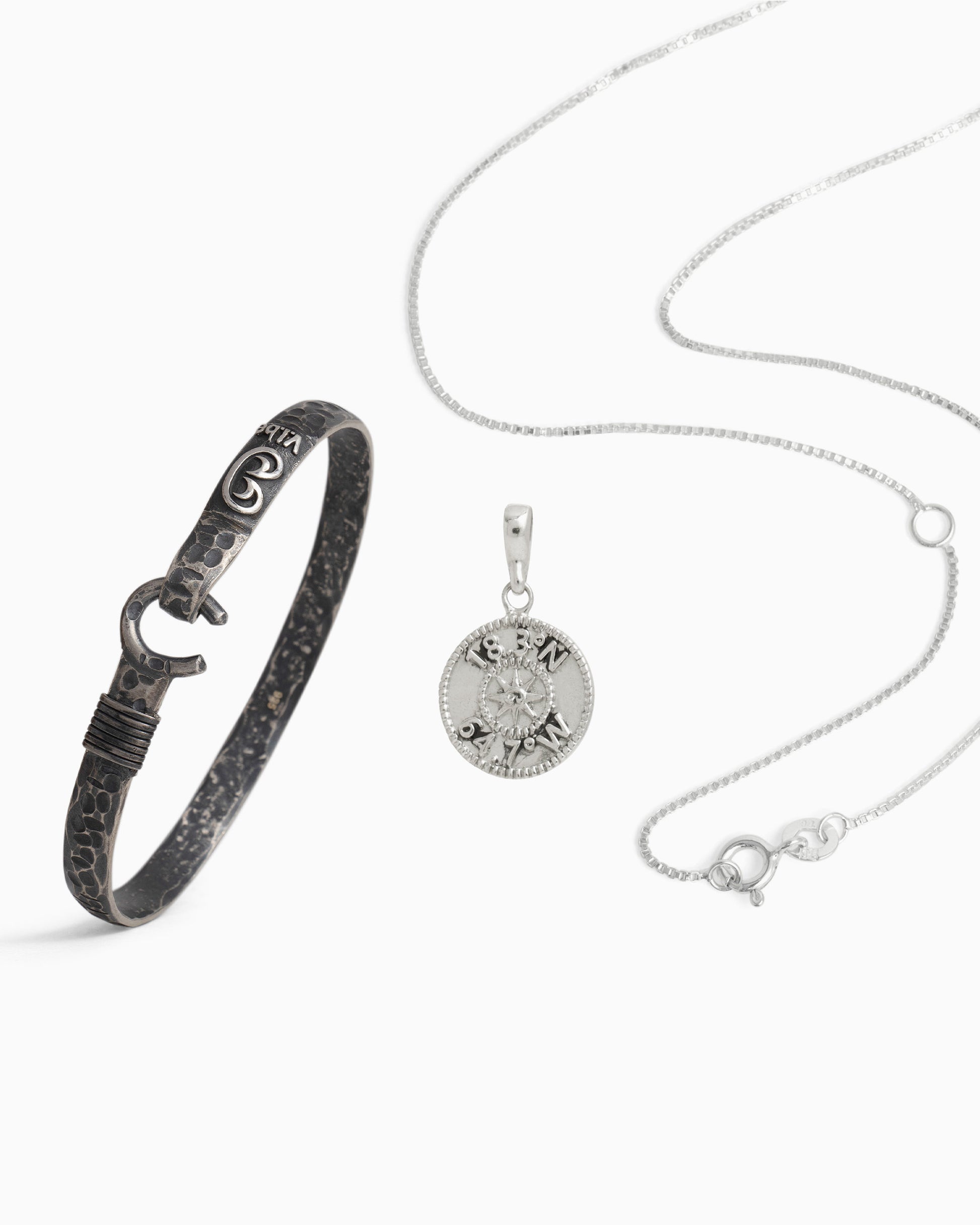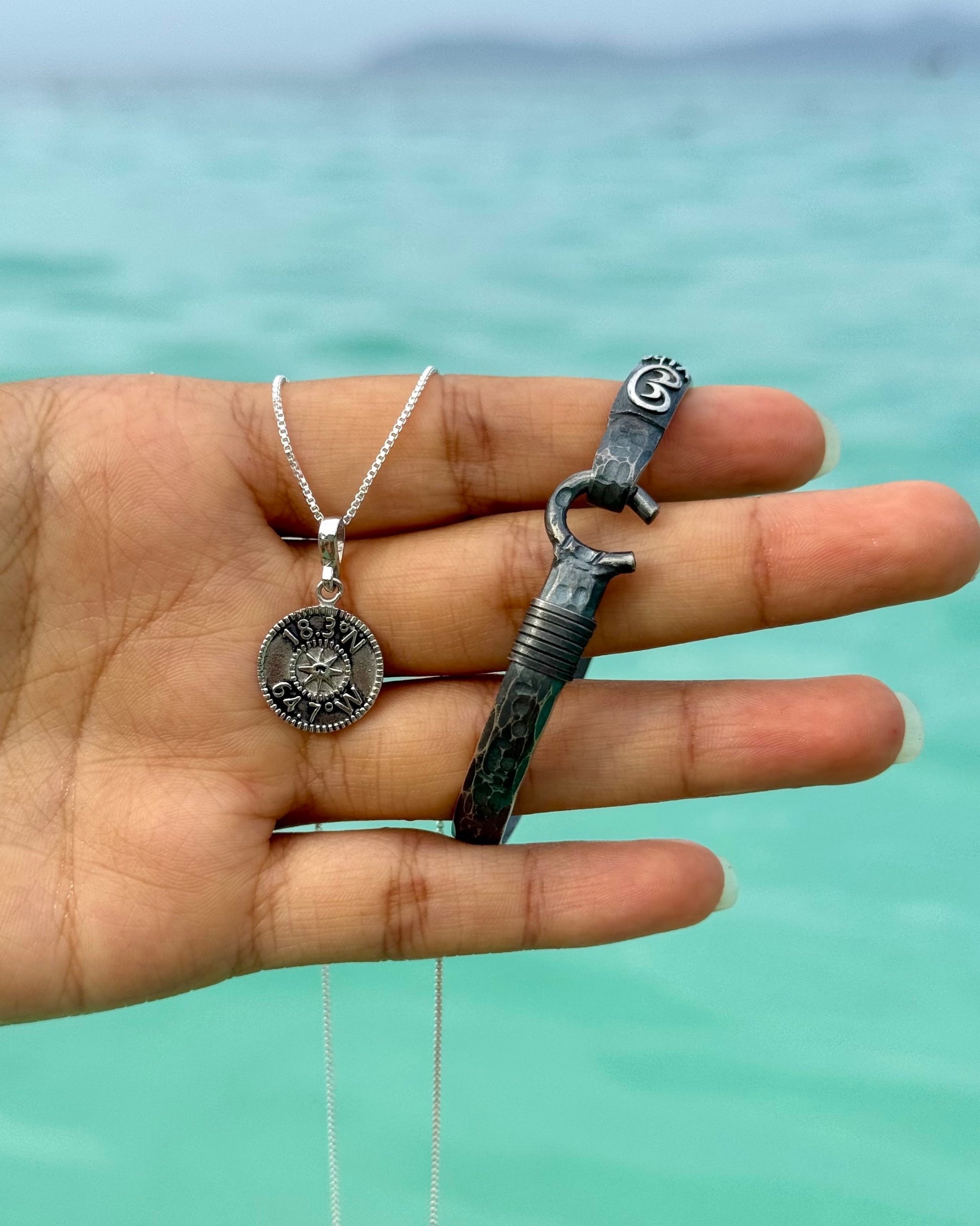 This bundle combines the rugged Pirate Texture Hook Bracelet with the refined look of the sterling silver St. John Coordinates Medallion Pendant, both inspired by the sea and island memories. Includes a free adjustable chain, turning the pendant into a ready-to-wear necklace.