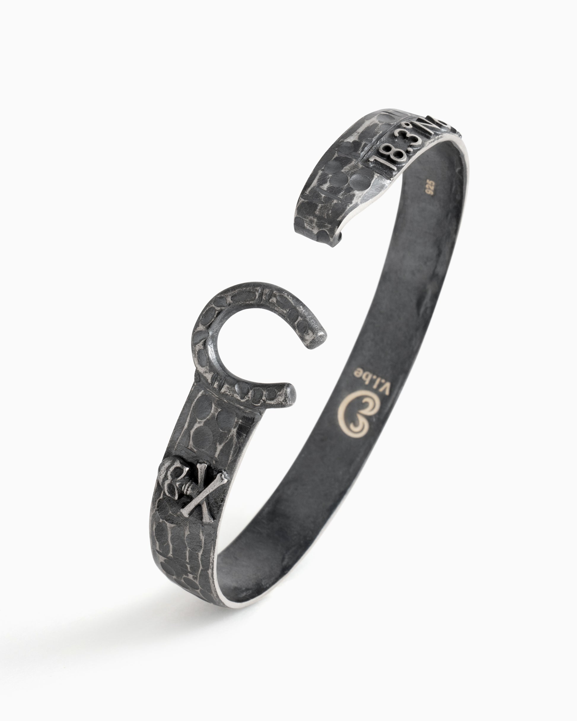 The Pirate Texture Hook Bracelet is fashioned in oxidized sterling silver with a "C" hook clasp and finished with our signature pirate texture for a rugged, weathered look. A skull and crossbones accent and raised St. John coordinates add that extra island touch. With our oxidized finishes, no two are alike. Each original piece is handcrafted by Vibe artisans and markings and shades will vary.