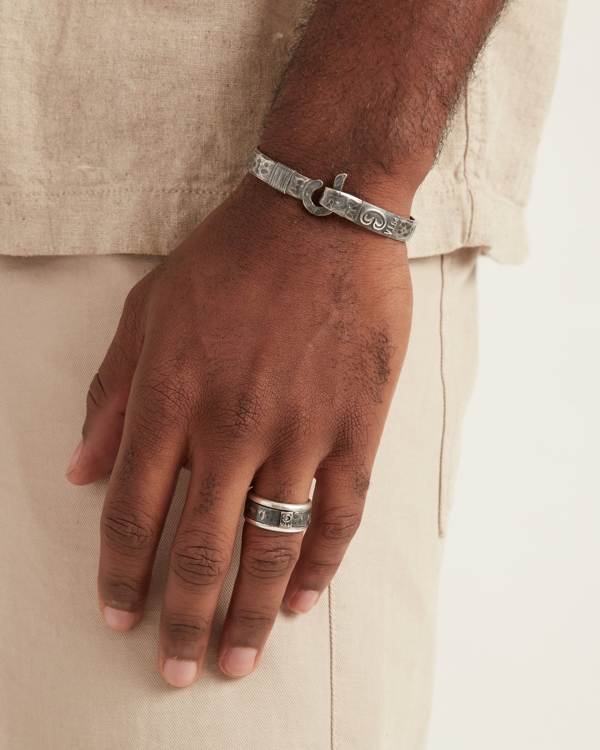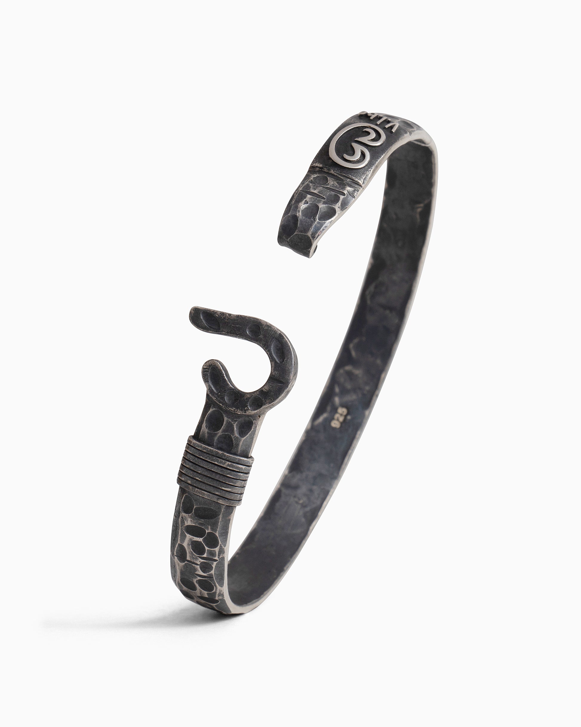A Vibe signature, the Pirate Texture St. John Hook Bracelet is fashioned in oxidized sterling silver with a "J" hook clasp to honor the island of St. John. Our signature pirate texture gives a rugged, weathered look to the piece. Featuring a replica of the St. John petroglyph and seven good luck wraps, solo or stacked, it is sure to be a favorite statement piece. Found in many of our designs, Vibe’s seven good luck wraps represent love, laughter, happiness, good fortune, health, unity, and peace. Wear this piece on its own or stack it with other bracelets for a layered look. With our oxidized finishes, no two are alike. Each original piece is handcrafted by Vibe artisans and markings and shades will vary.