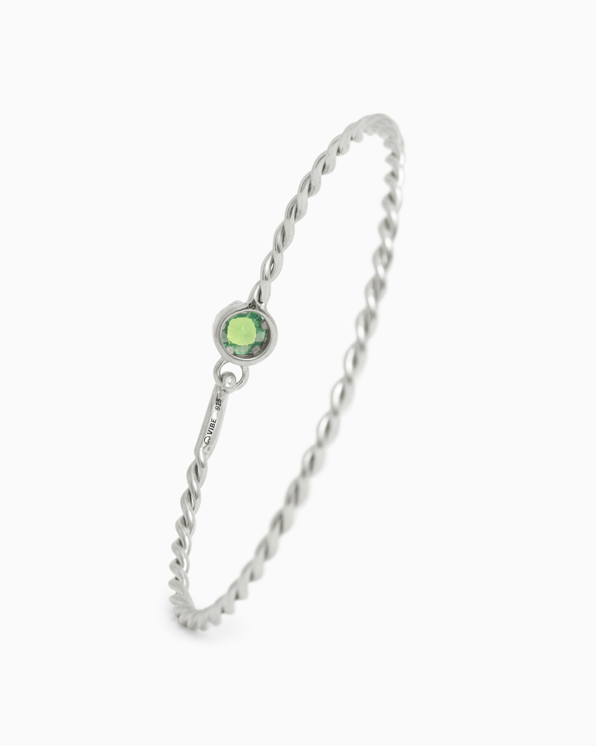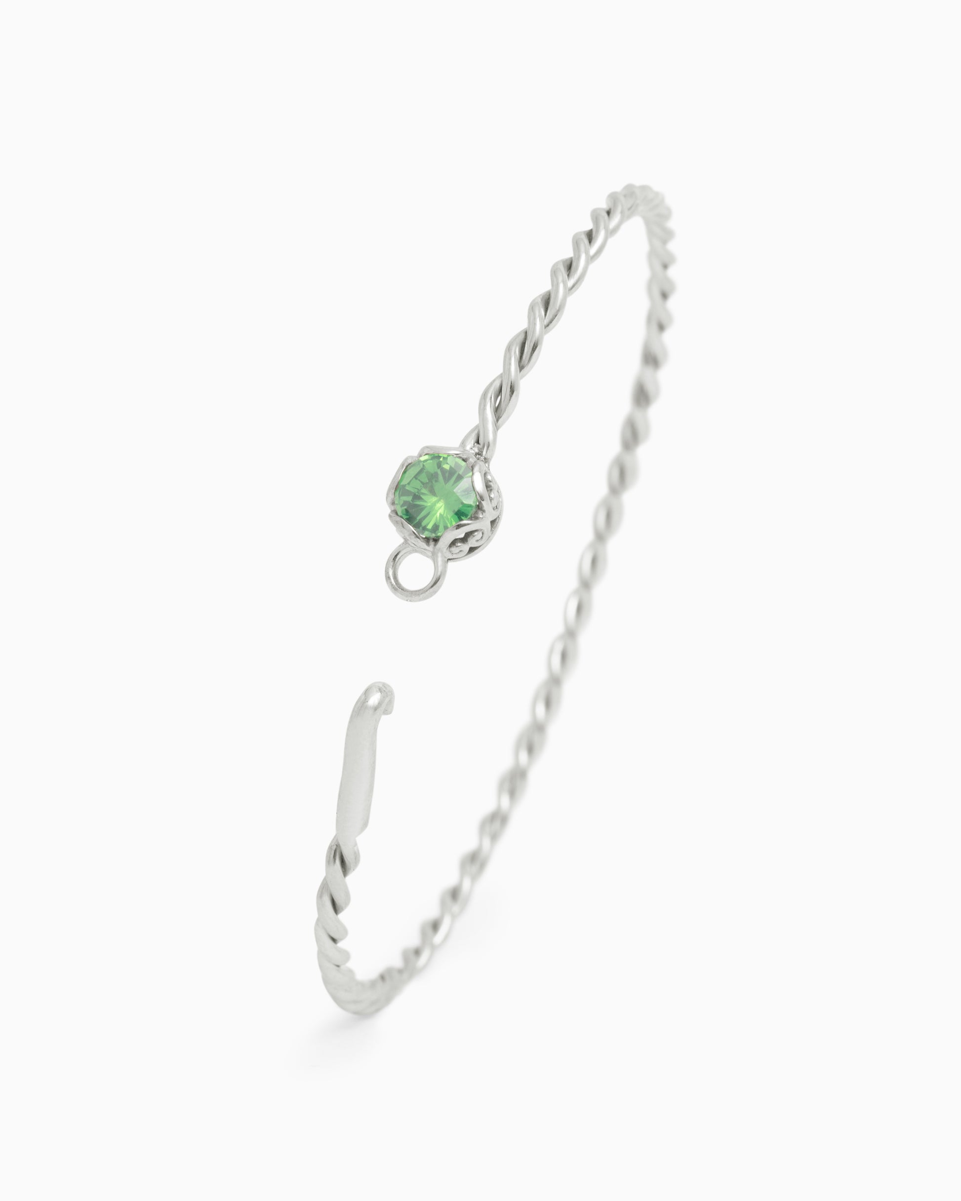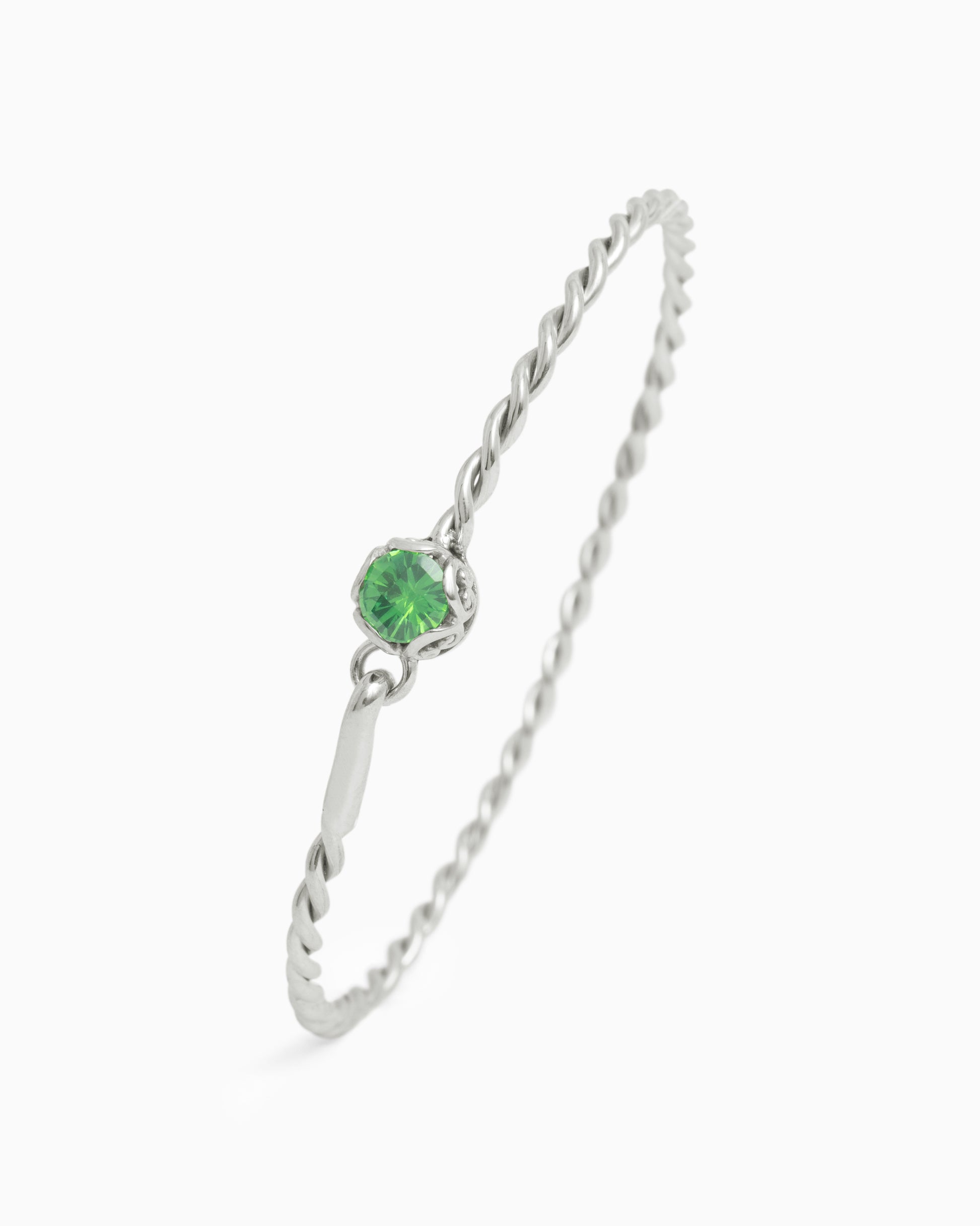The Princess Petroglyph Twisted Bangle is a unique design handcrafted in sterling silver with a dainty twisted band. This bracelet showcases a faceted round green zircon stone with intricate petroglyph detailing around its base. This versatile piece can be worn with casual everyday outfits or your night-out ensemble.
