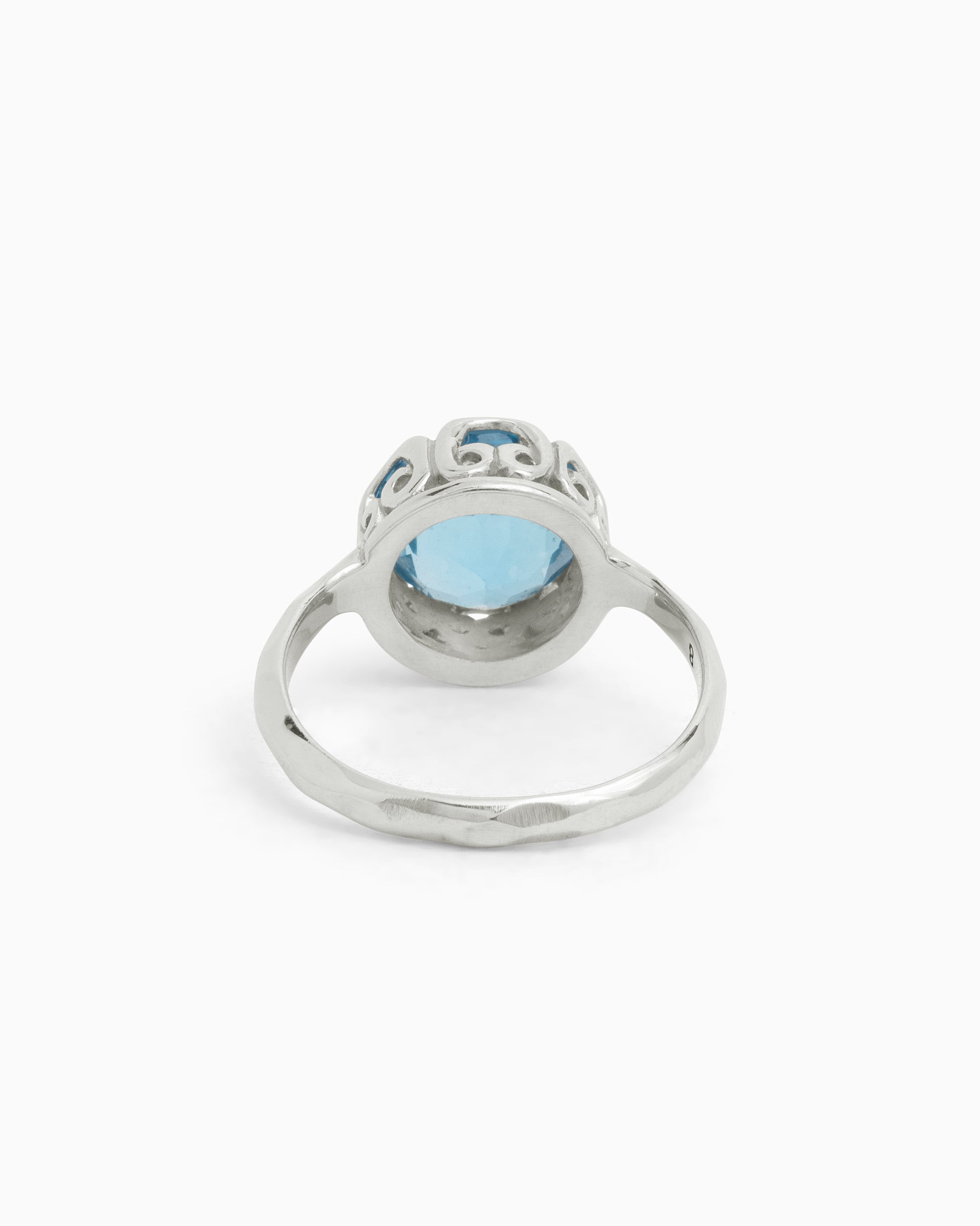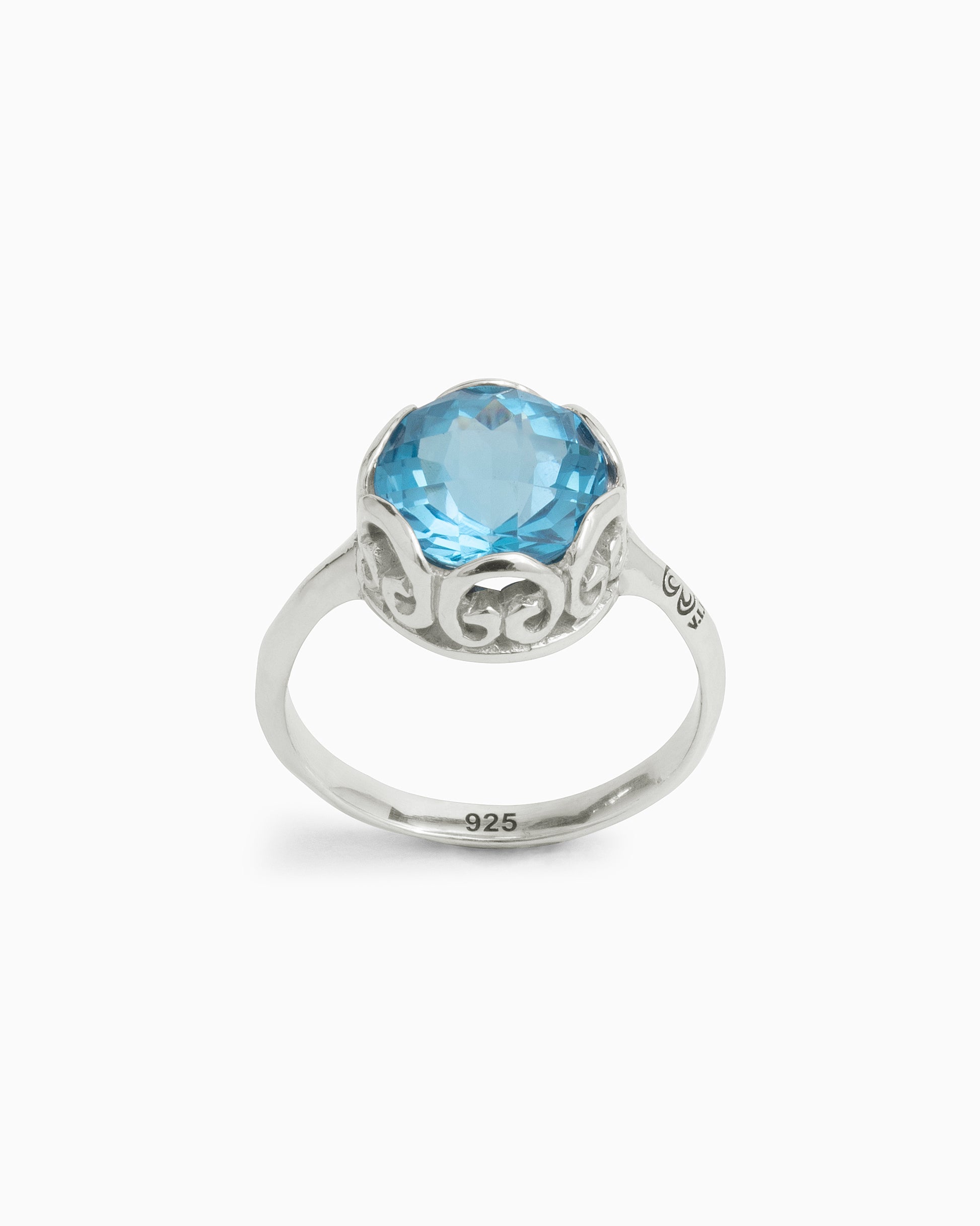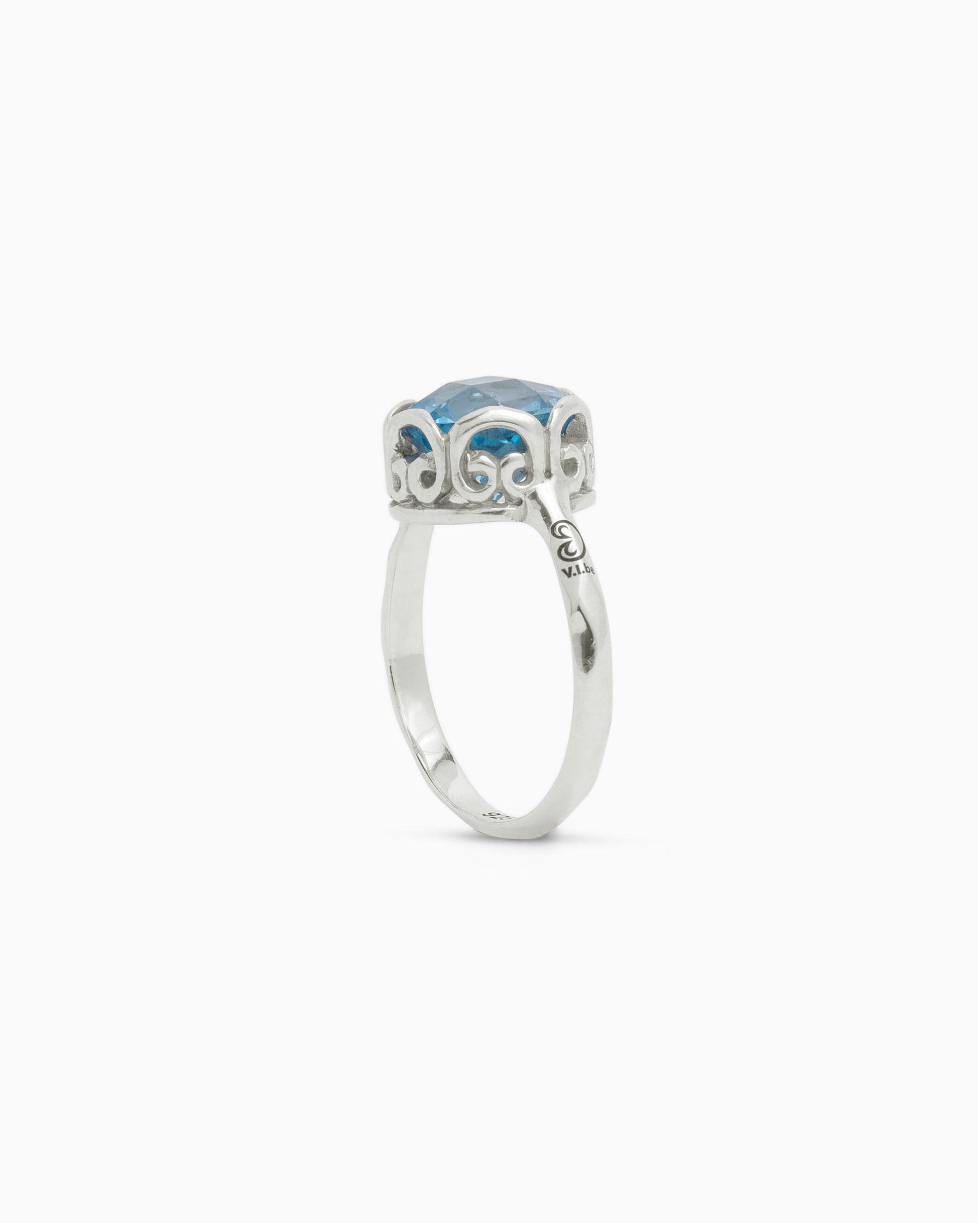 The Princess Petroglyph Stone Ring is a great addition to your jewelry collection. Handcrafted from sterling silver, this ring showcases a faceted round Hampton blue topaz stone with intricate petroglyph detailing around its base. Its versatile design allows you to effortlessly pair it with casual everyday outfits or use it as the perfect finishing touch for your night-out ensemble. Pair with the Princess Petroglyph Stone Studs and Pendant to complete the look.