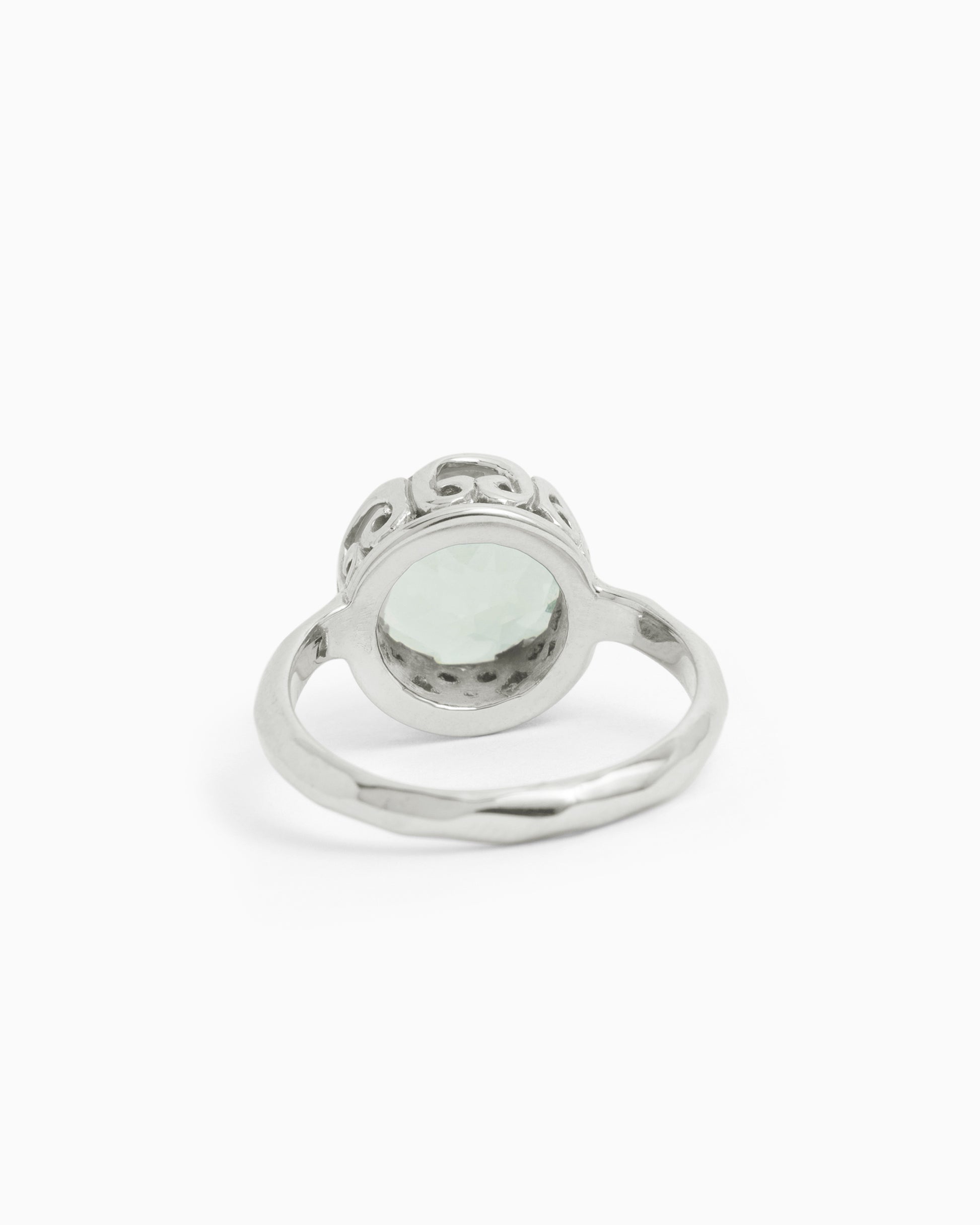 The Princess Petroglyph Stone Ring is a great addition to your jewelry collection. Handcrafted from sterling silver, this ring showcases a faceted round prasiolite stone with intricate petroglyph detailing around its base. Its versatile design allows you to effortlessly pair it with casual everyday outfits or use it as the perfect finishing touch for your night-out ensemble. Pair with the Princess Petroglyph Stone Studs and Pendant to complete the look.