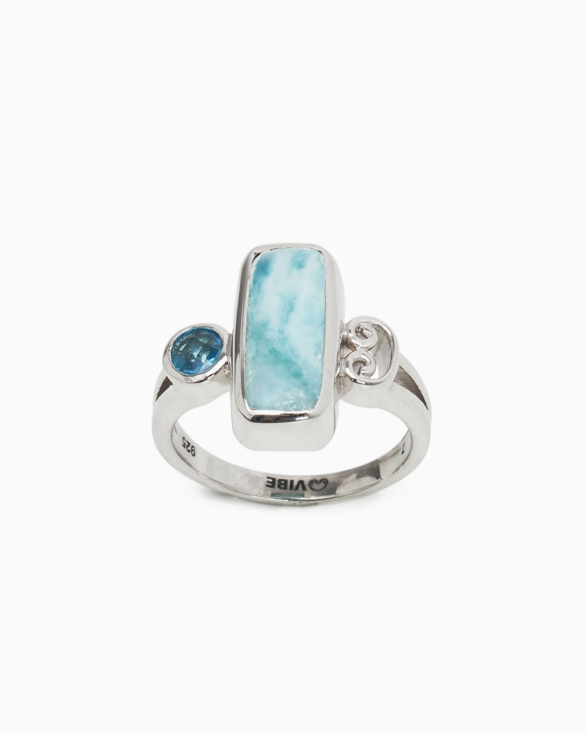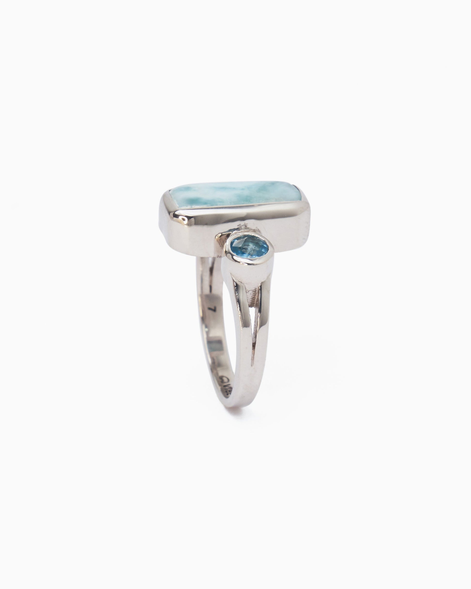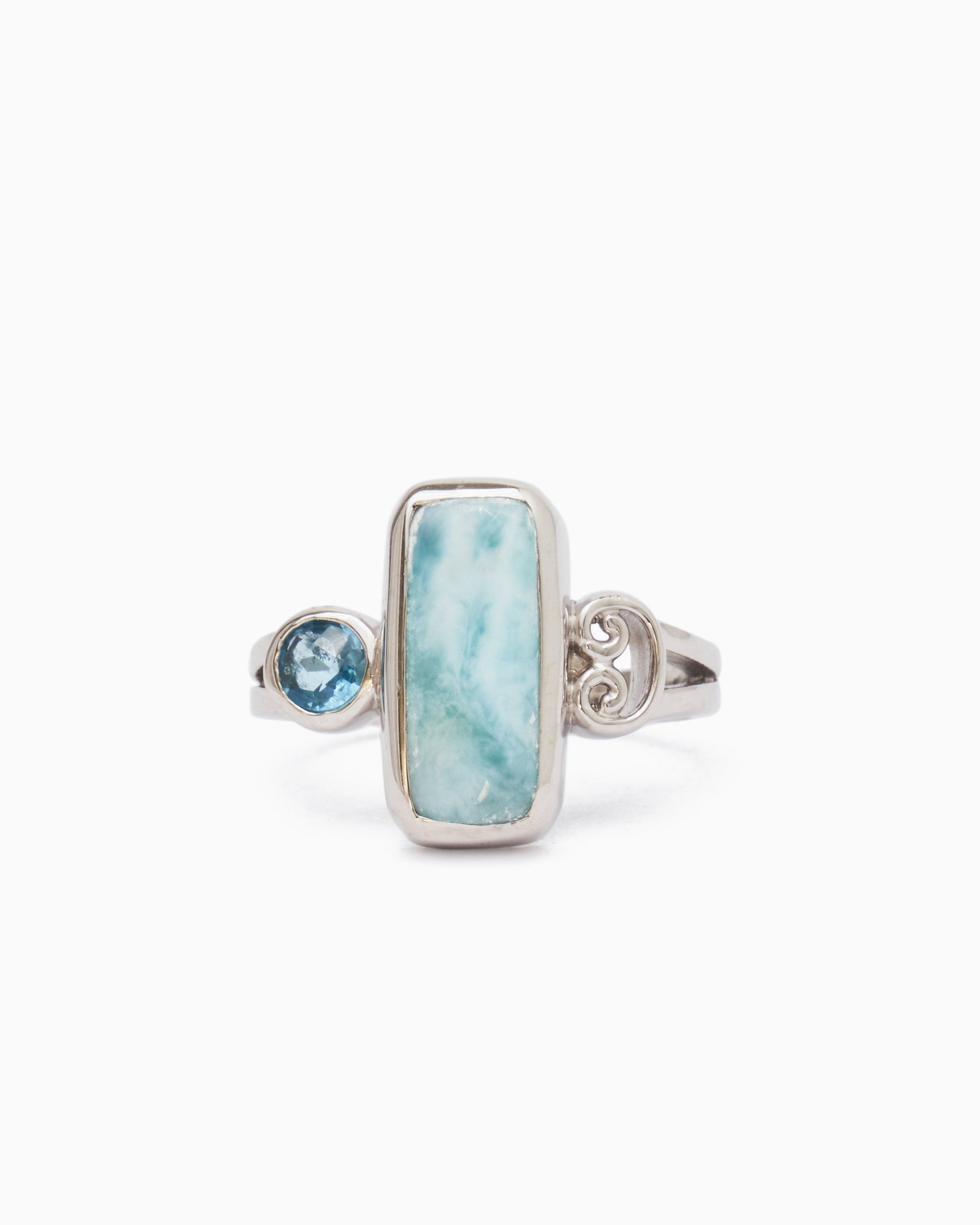 The Rectangular Stone Ring is a statement piece handcrafted in sterling silver. Featuring a round faceted Hampton blue topaz stone, a rectangular larimar cabochon, and a distinctive petroglyph, this ring is the perfect addition to your collection.