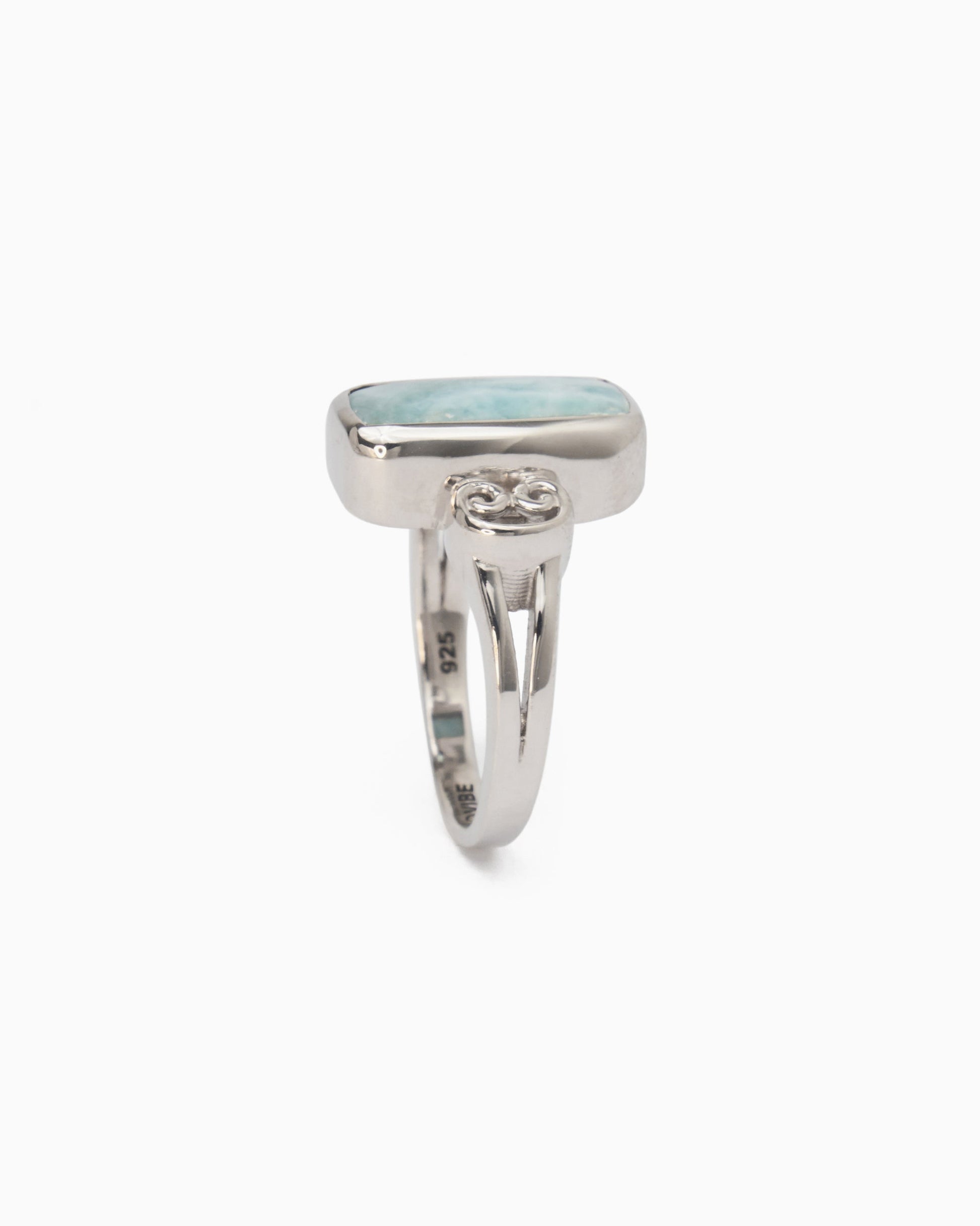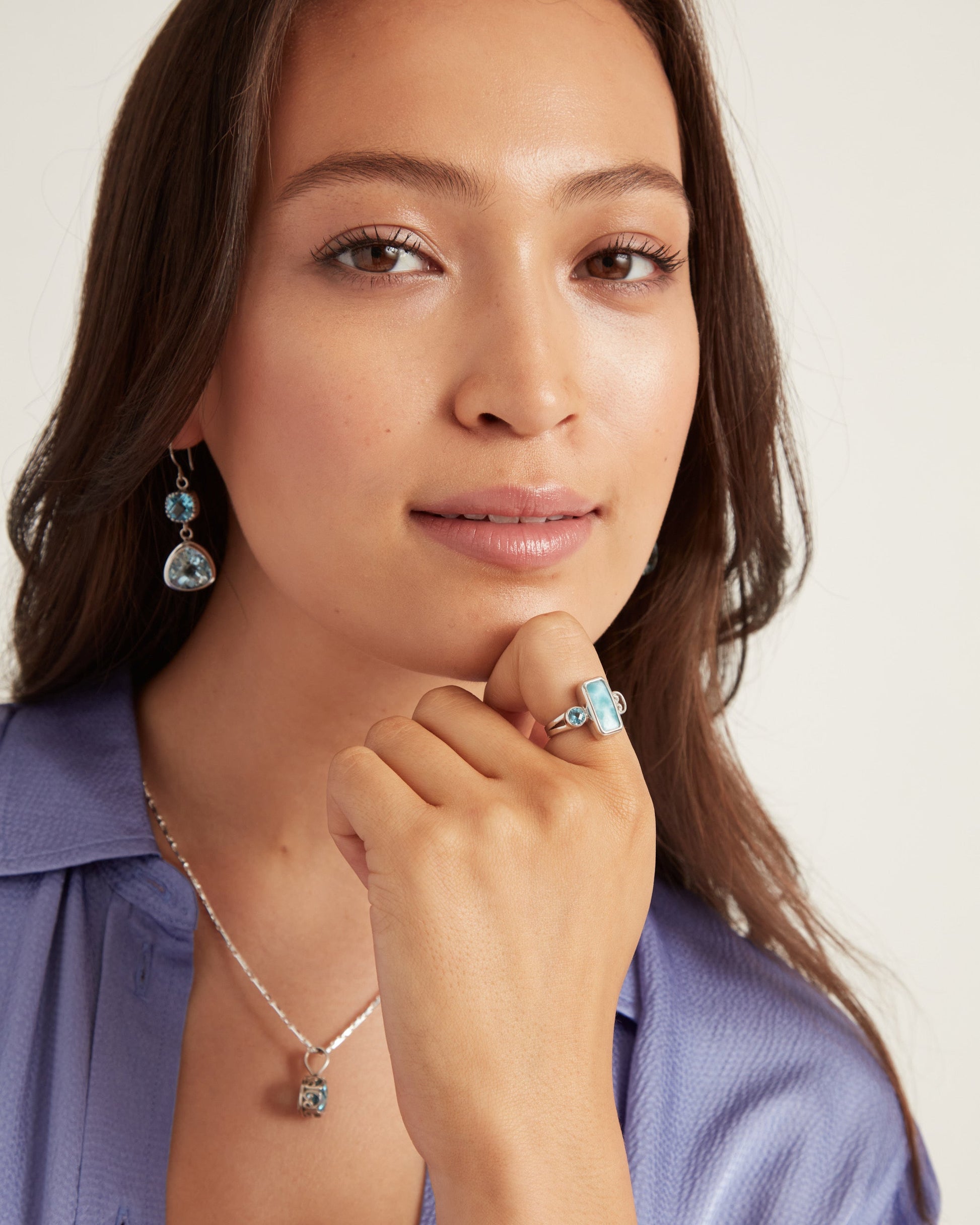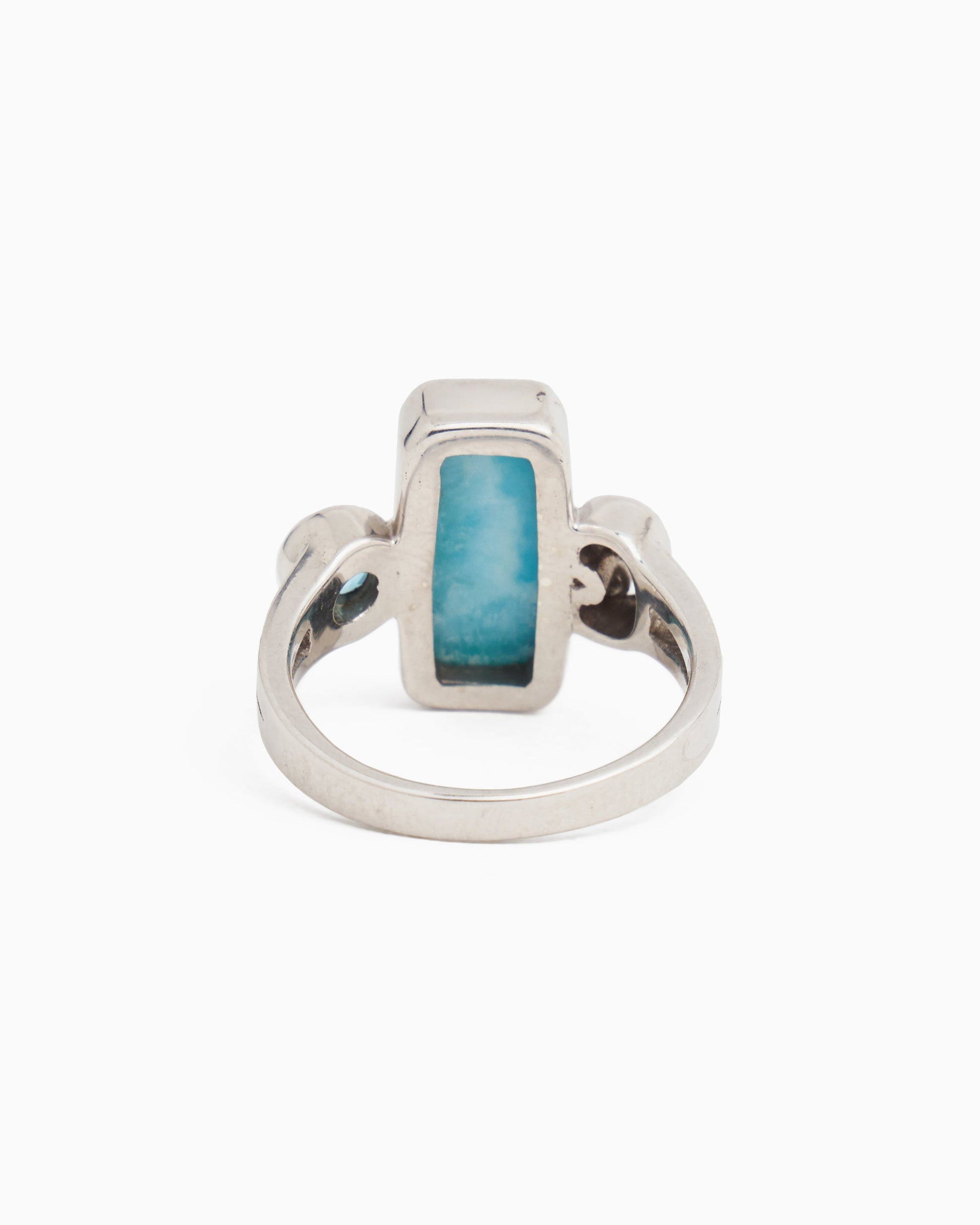 The Rectangular Stone Ring is a statement piece handcrafted in sterling silver. Featuring a round faceted Hampton blue topaz stone, a rectangular larimar cabochon, and a distinctive petroglyph, this ring is the perfect addition to your collection.