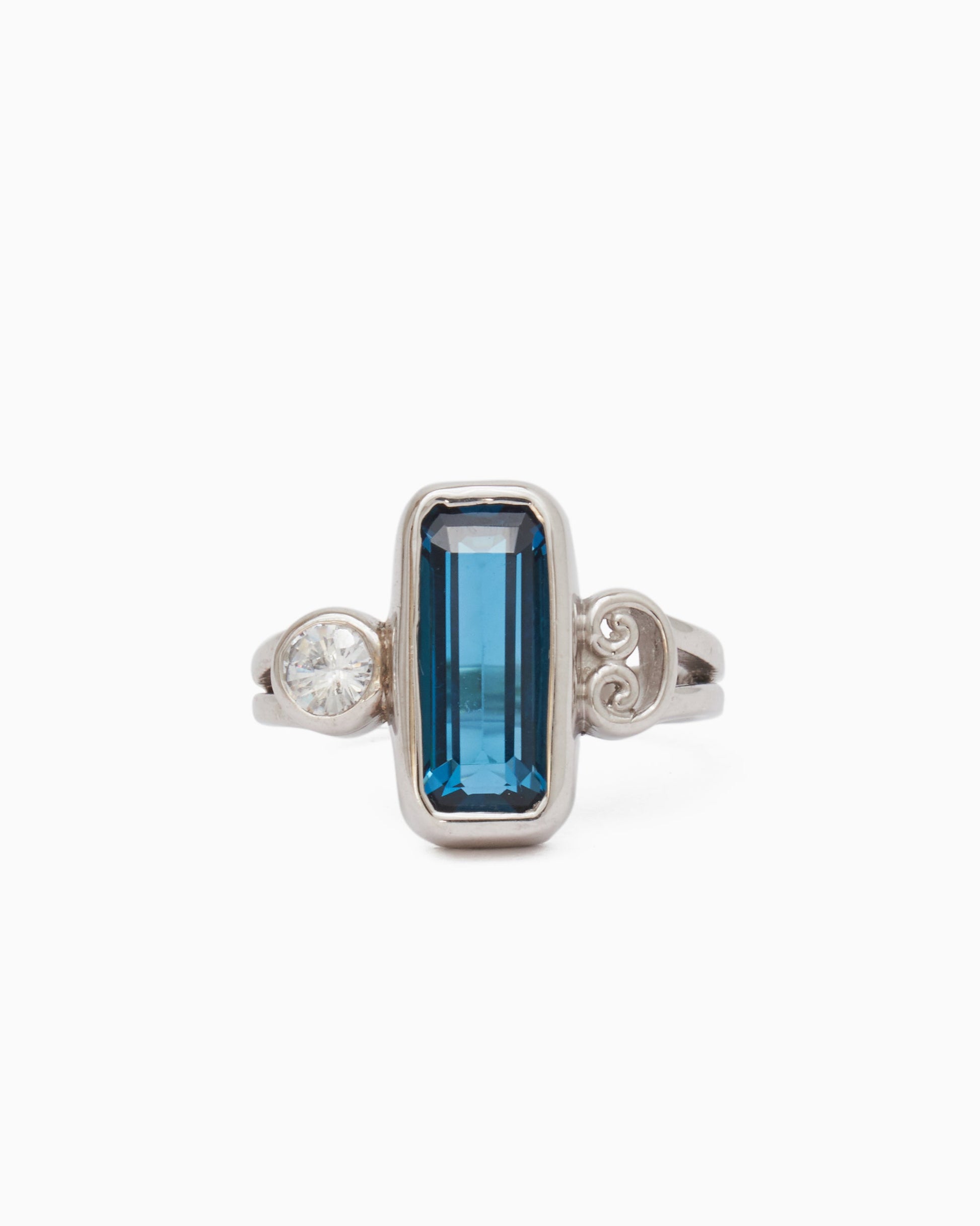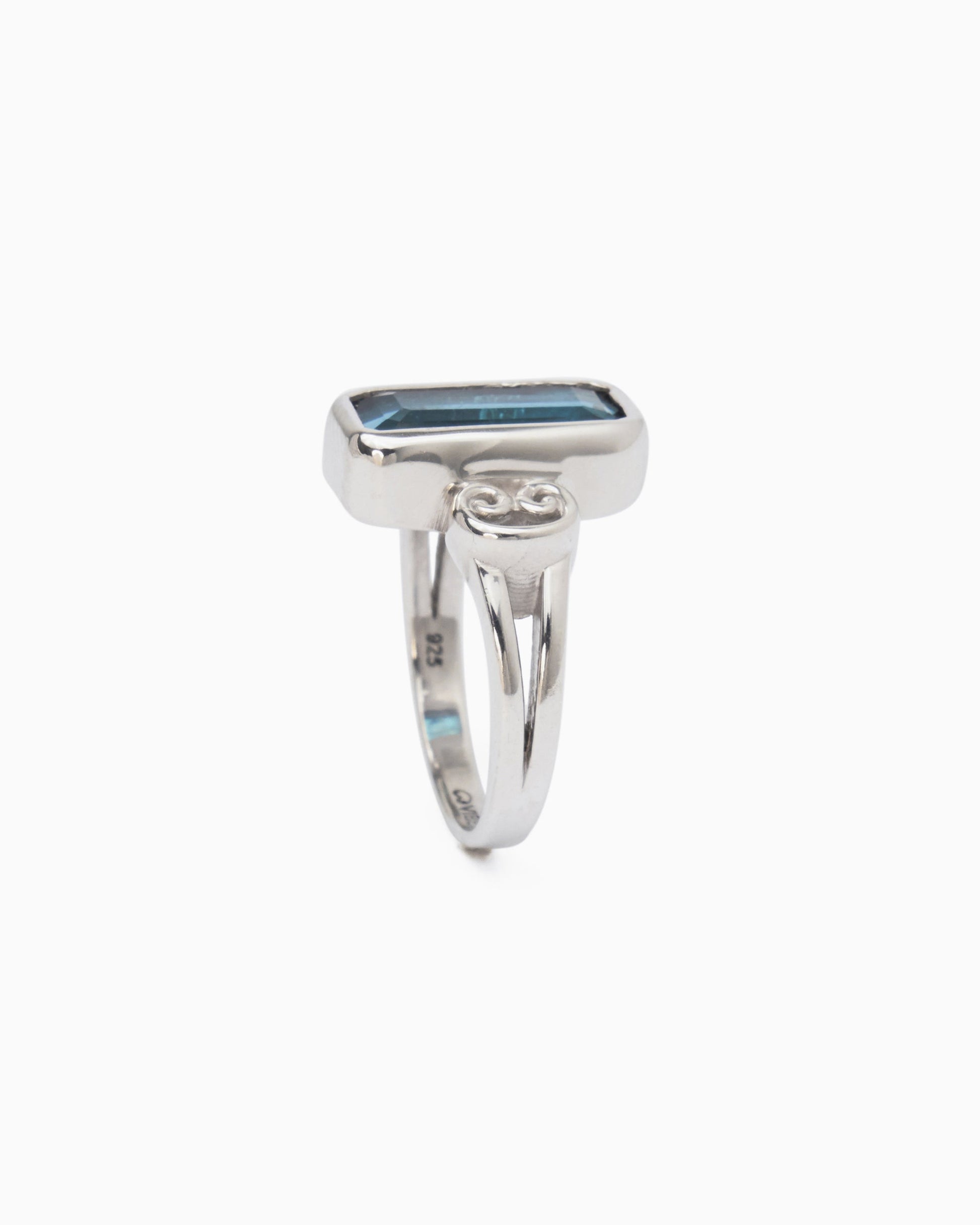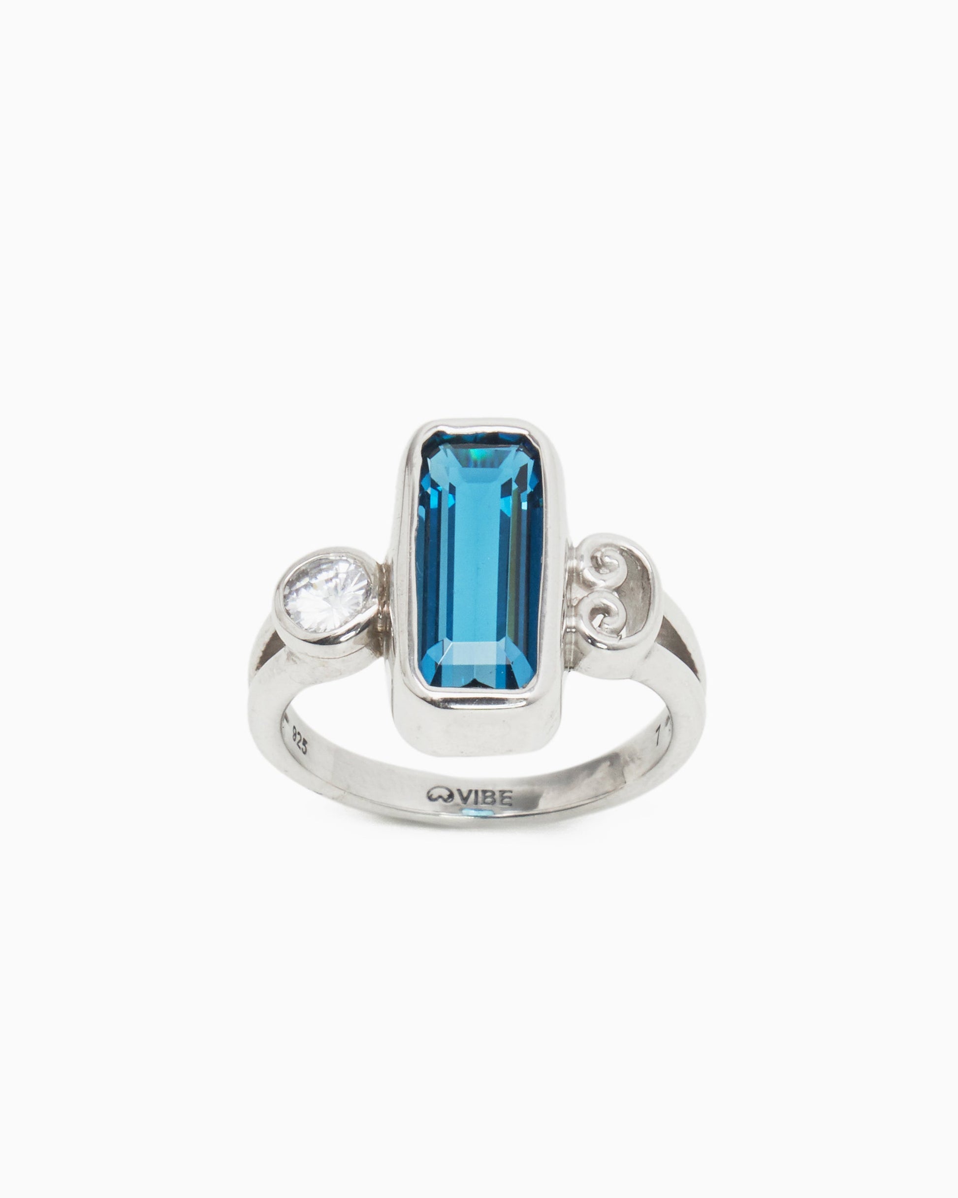 The Rectangular Stone Ring is a statement piece handcrafted in sterling silver. Featuring a round faceted white zircon, a rectangular faceted London blue topaz, and a distinctive petroglyph, this ring is the perfect addition to your collection.