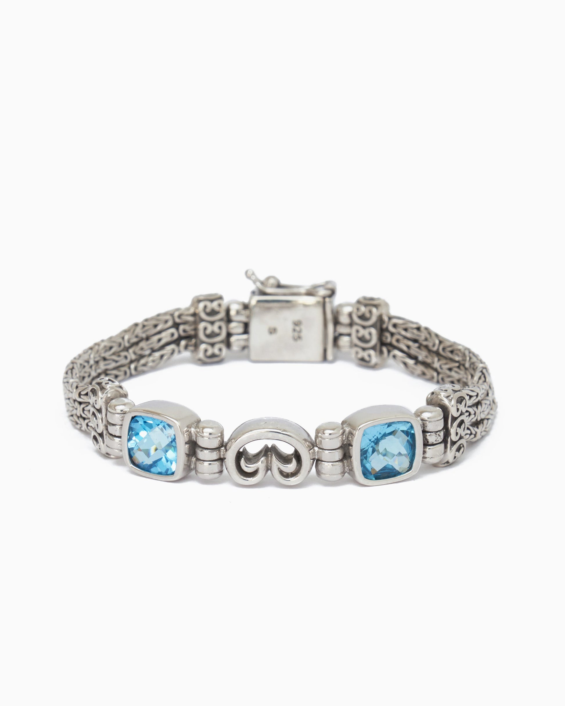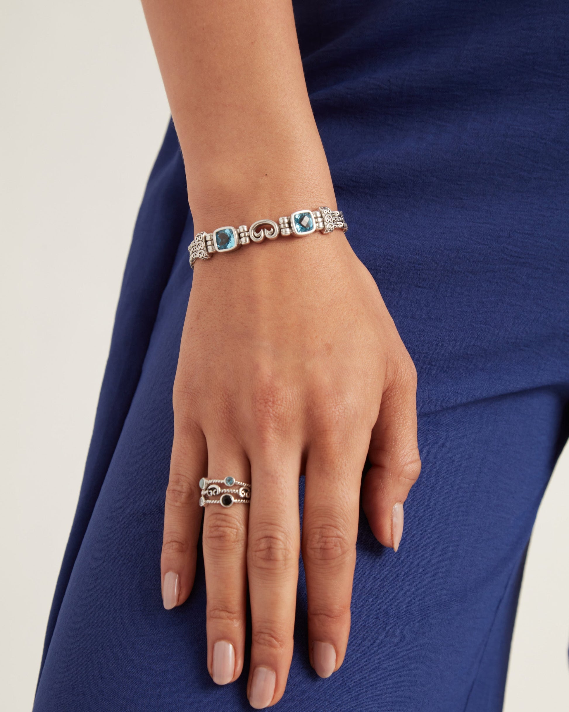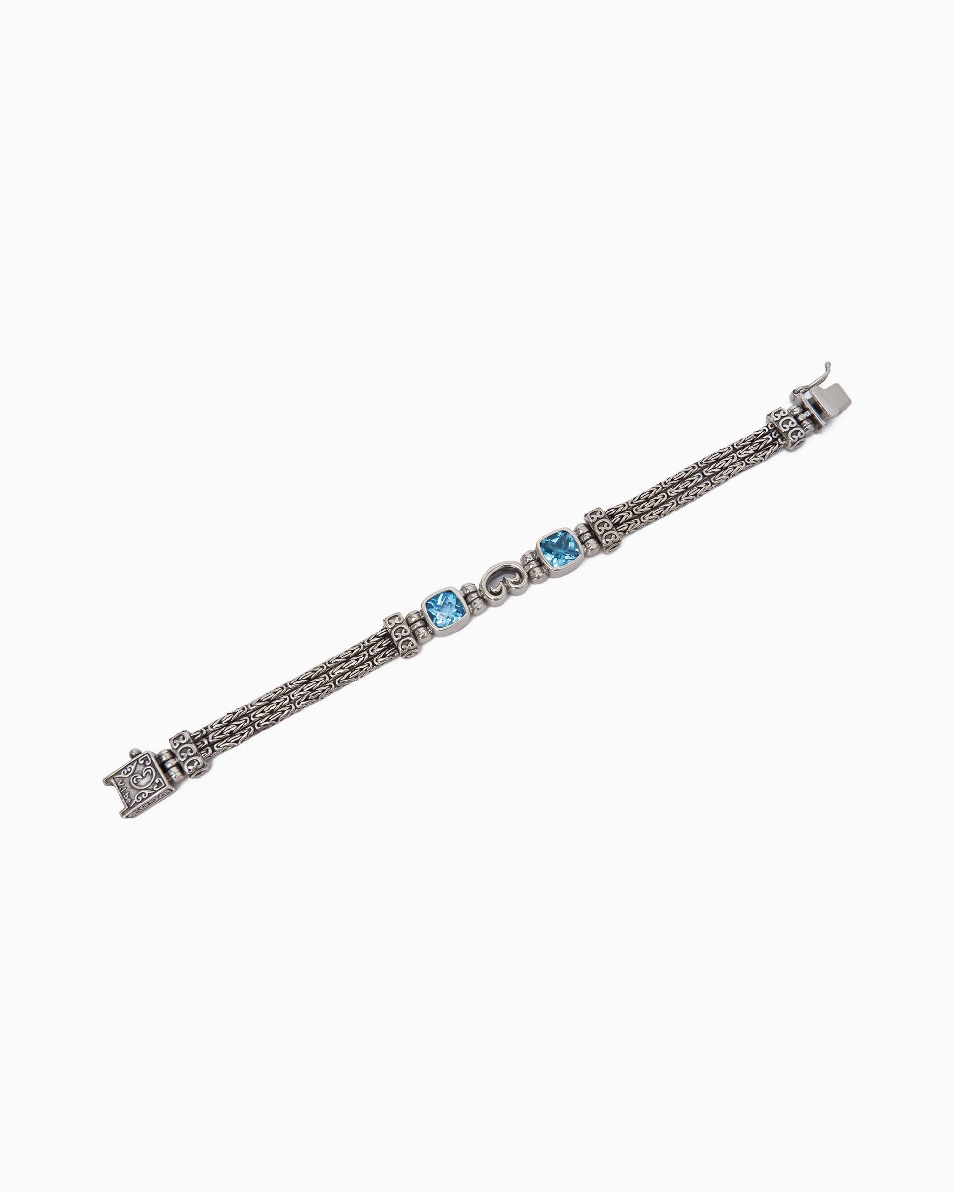 The Reef Bay Link Bracelet is a three strand chain bracelet that features a center petroglyph surrounded by two faceted stones. This sterling silver bracelet features mini petroglyphs worked into the chain link band. Pair with any hook bracelet for extra flair.