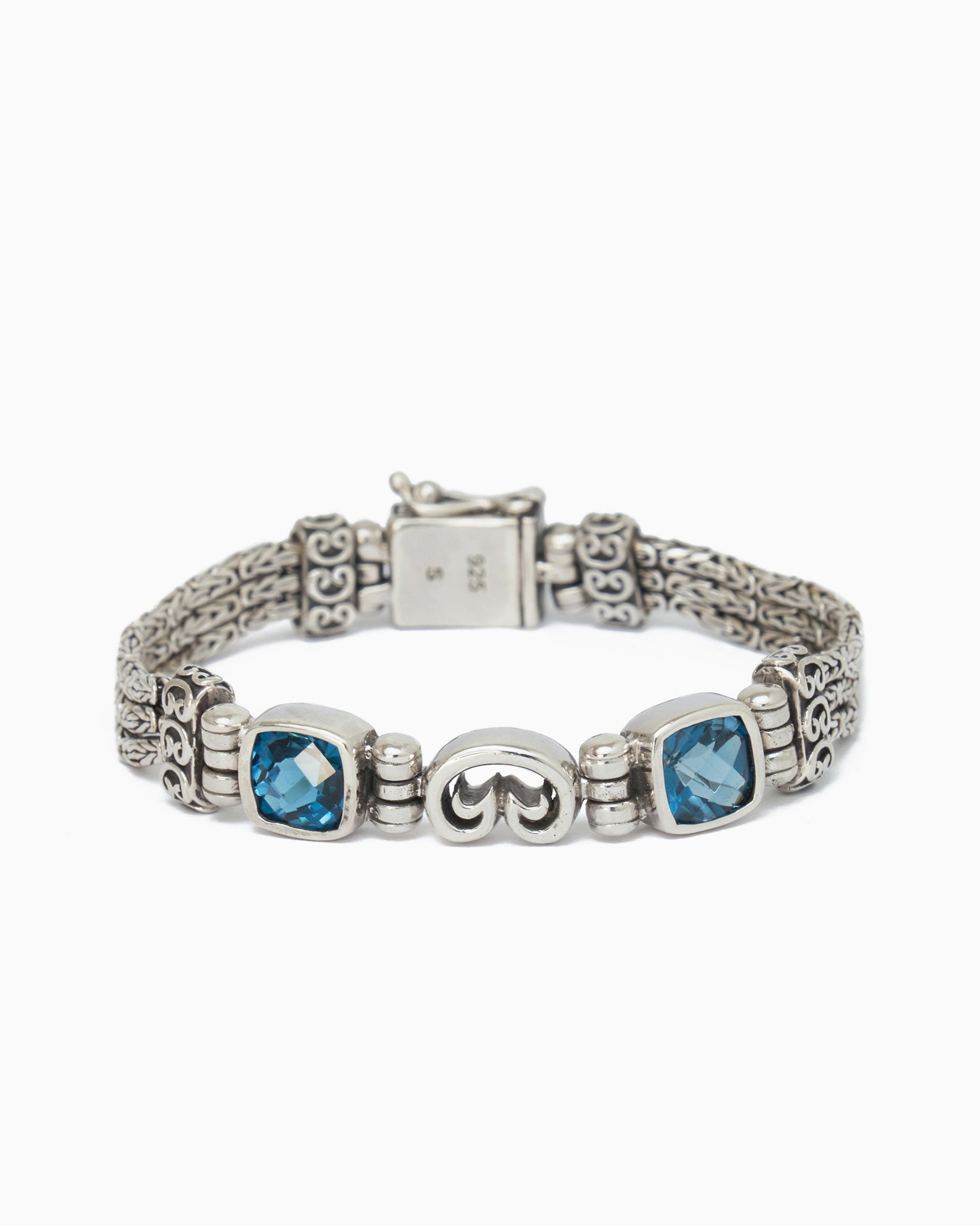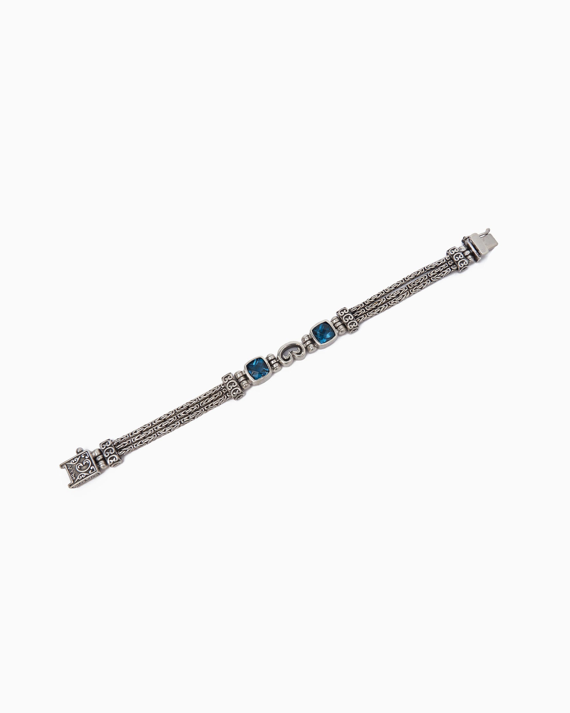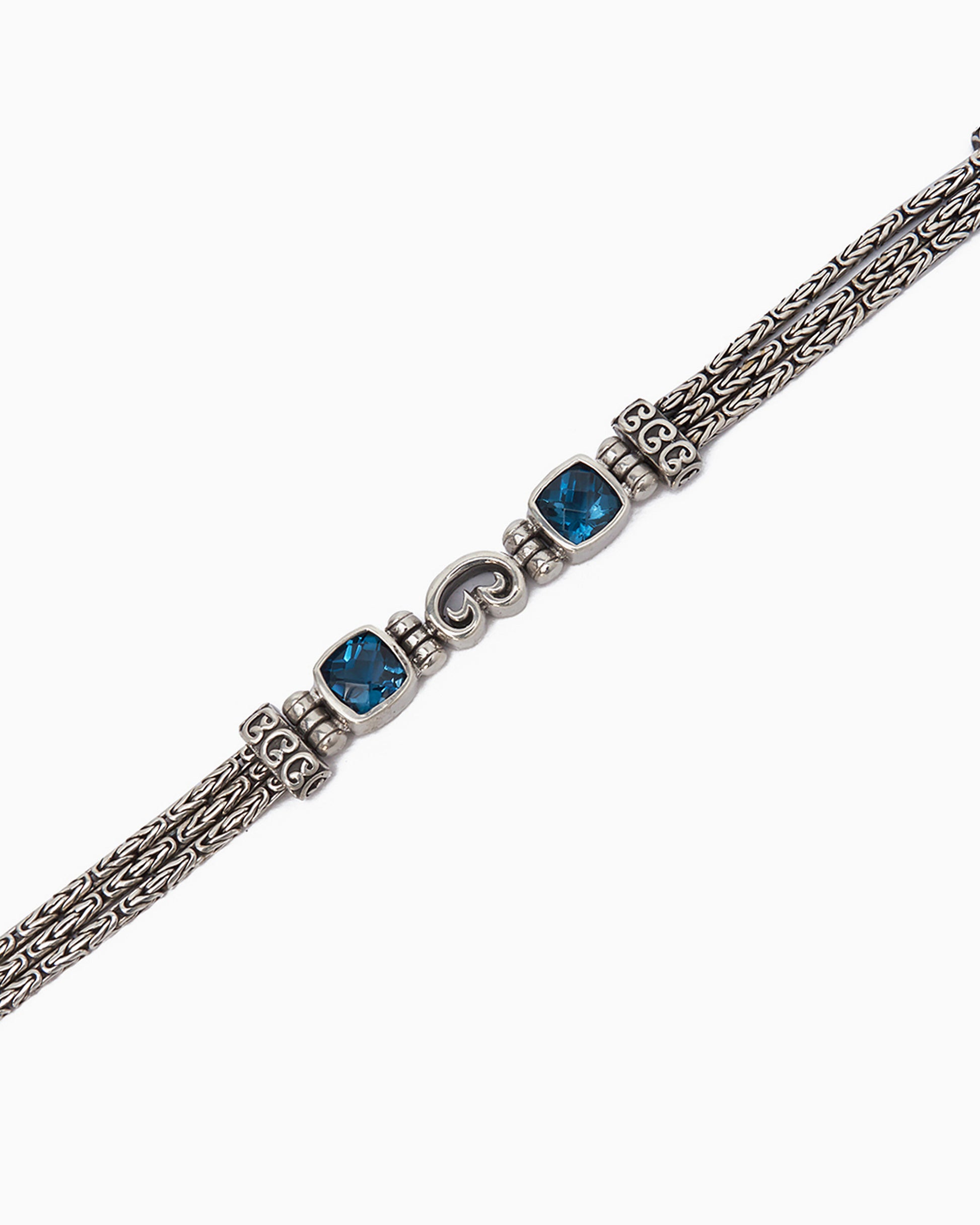 The Reef Bay Link Bracelet is a three strand chain bracelet that features a center petroglyph surrounded by two faceted stones. This sterling silver bracelet features mini petroglyphs worked into the chain link band. Pair with any hook bracelet for extra flair.