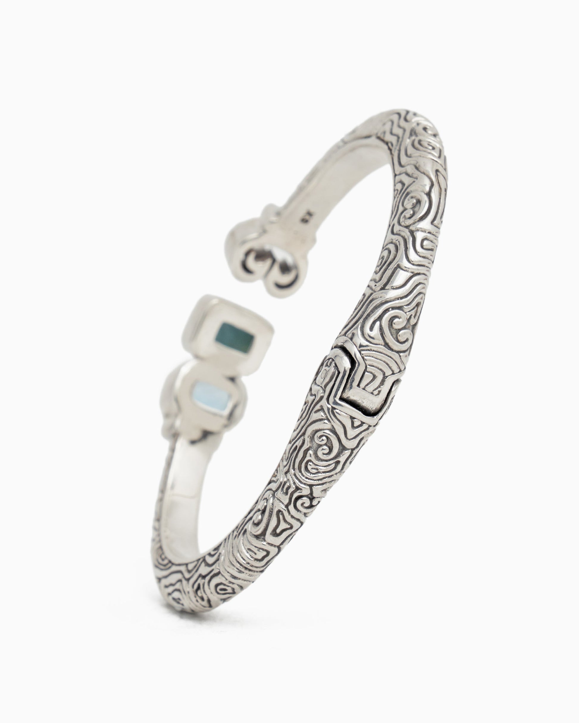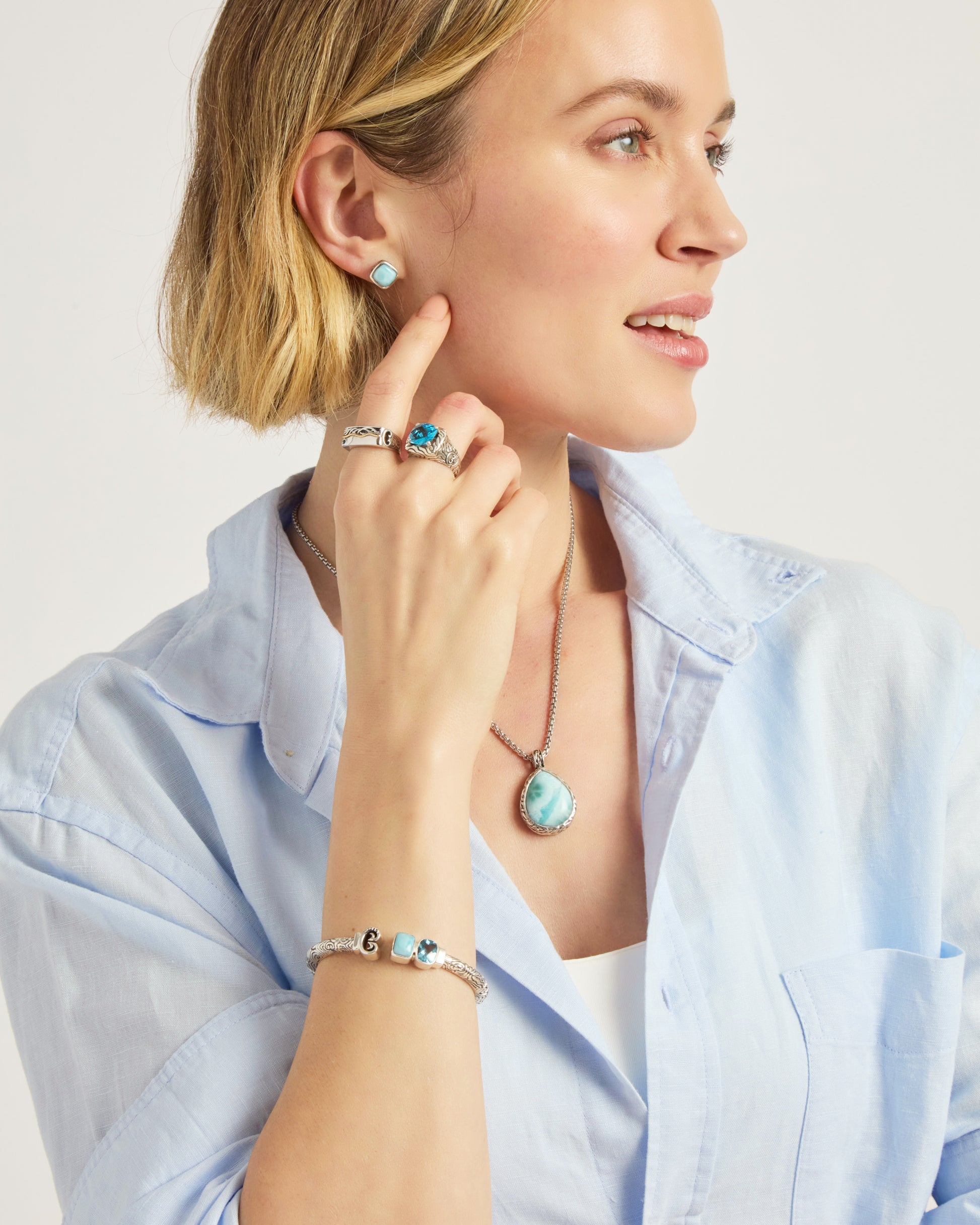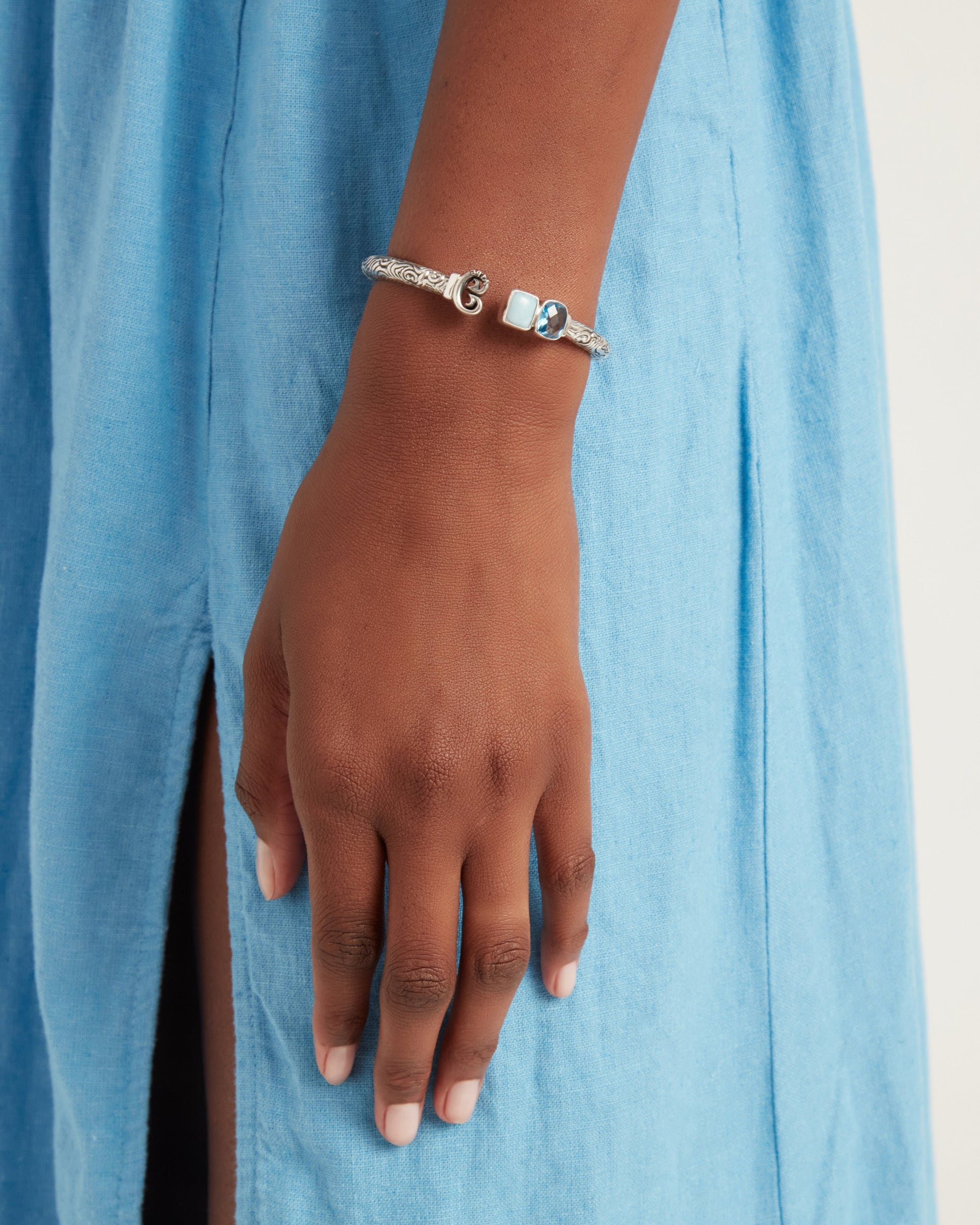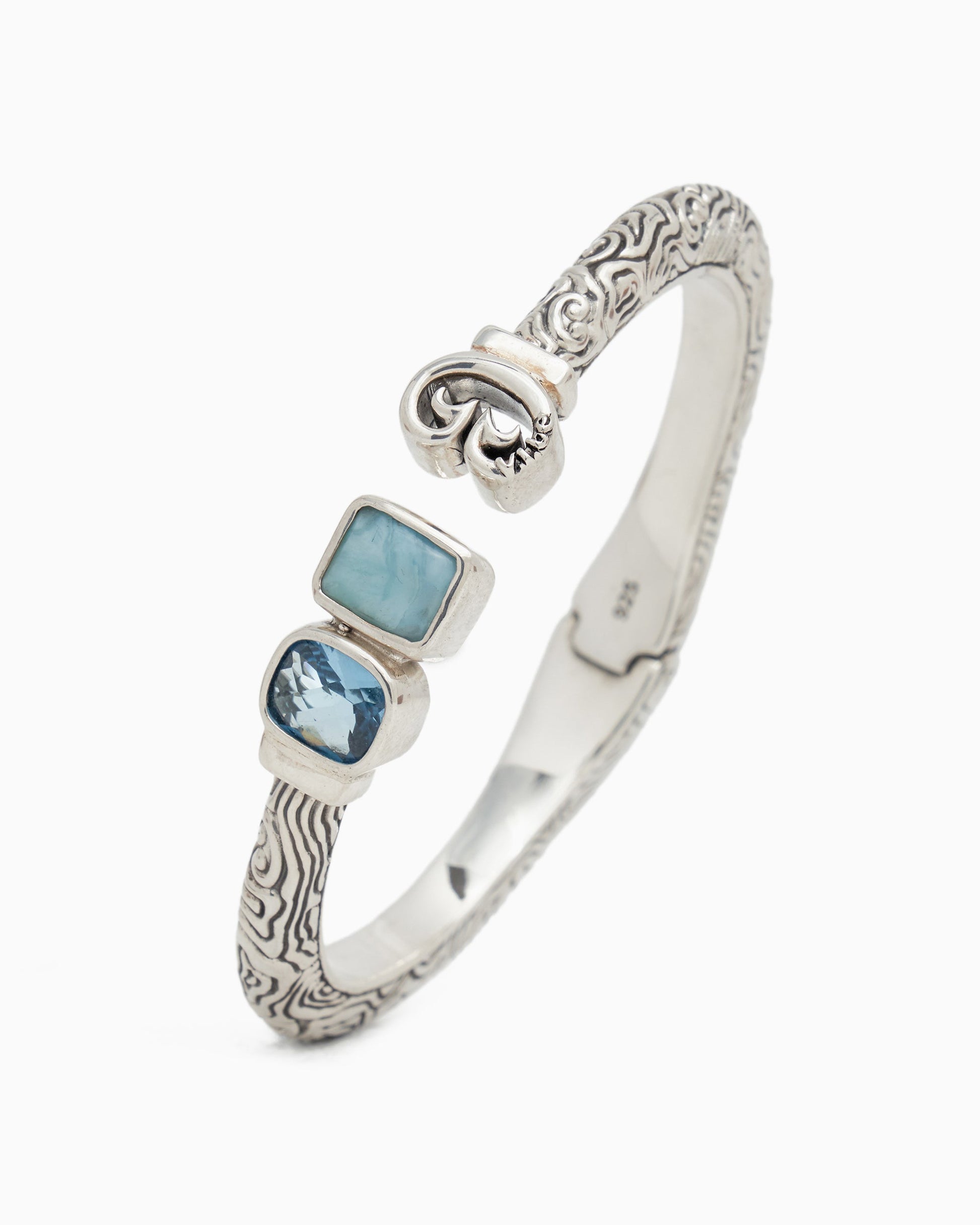 The Reef Texture Hinge Bracelet features an all over reef-inspired texture with a signature petroglyph and two stones - one larimar cabochon and one faceted Hampton blue topaz. Wear this piece on its own or stack it with other bracelets for a layered look.