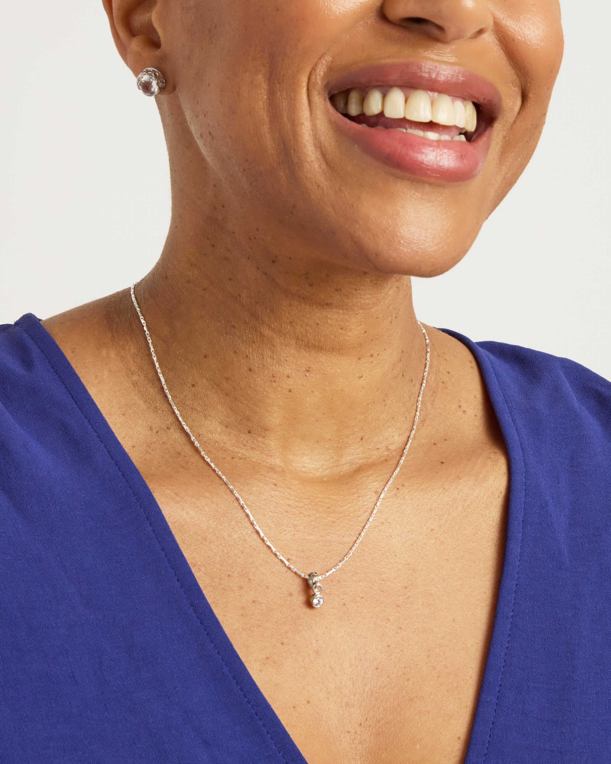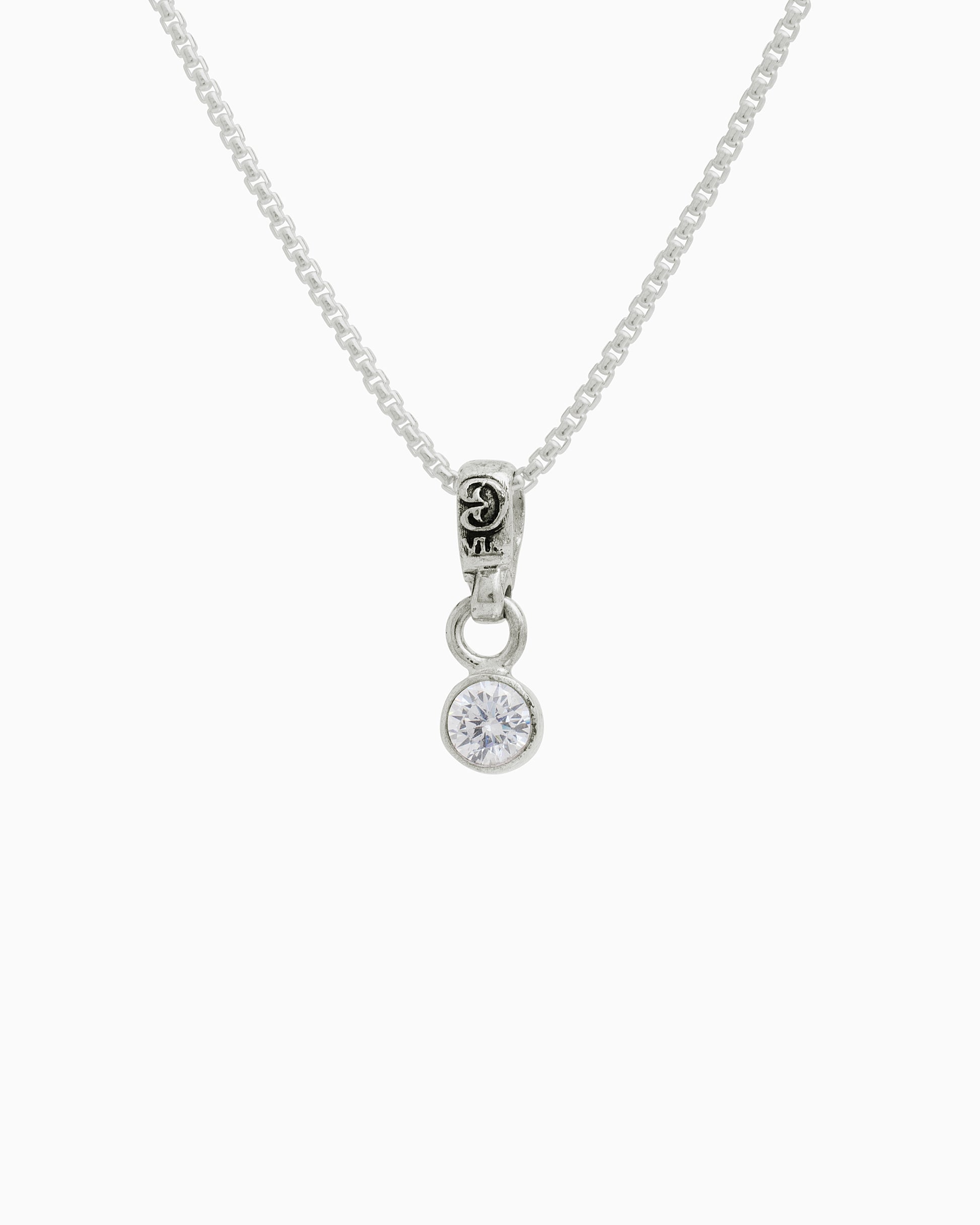 Our dainty sterling silver Round Stone Charm features a faceted white zircon stone with a petroglyph accented loop. Pair with your favorite hook bracelet or dainty chain, sold separately.