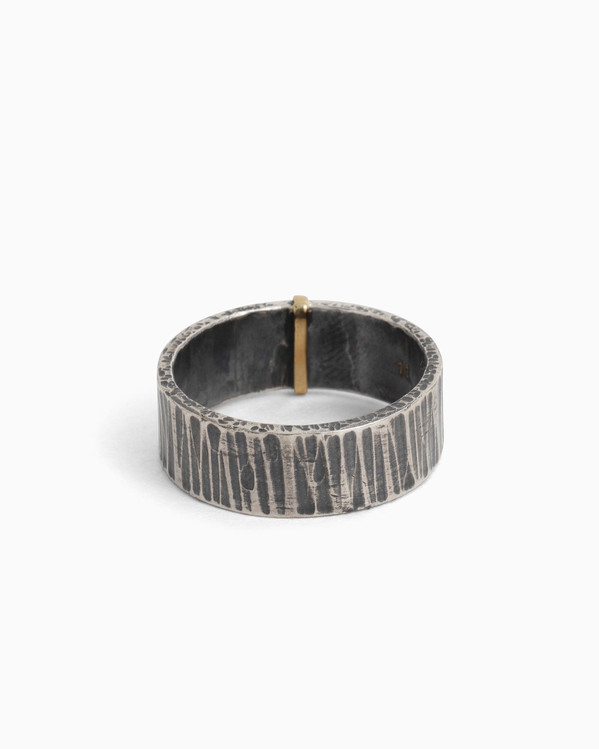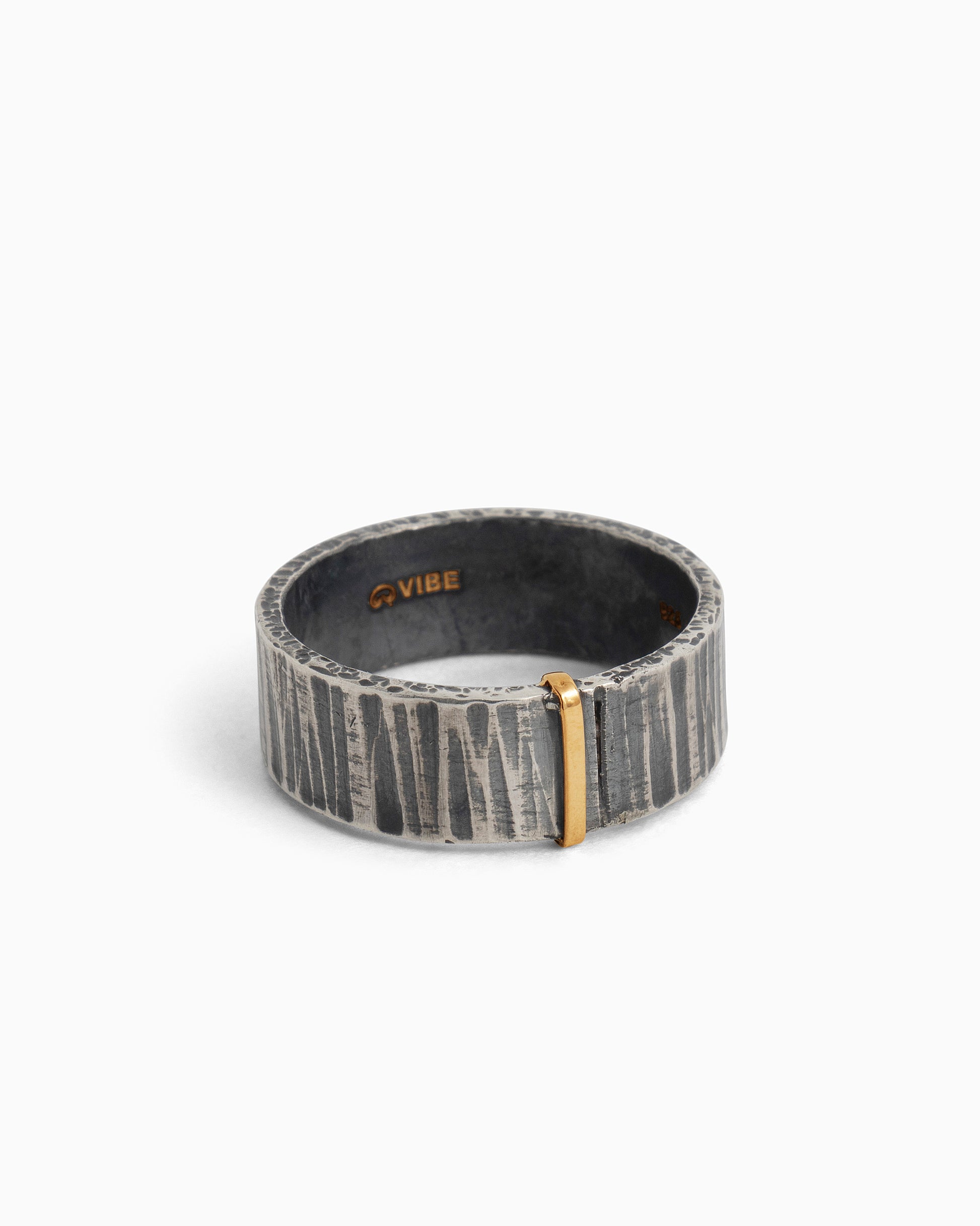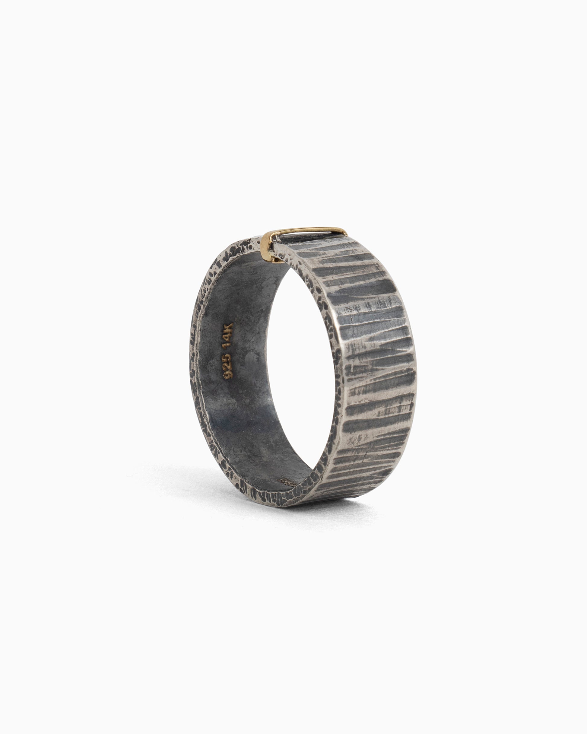 The Water Texture Band Ring is handcrafted in oxidized sterling silver with a 14K solid gold wrap down the center. The band is detailed with our signature salty water texture giving this style a nautical touch.