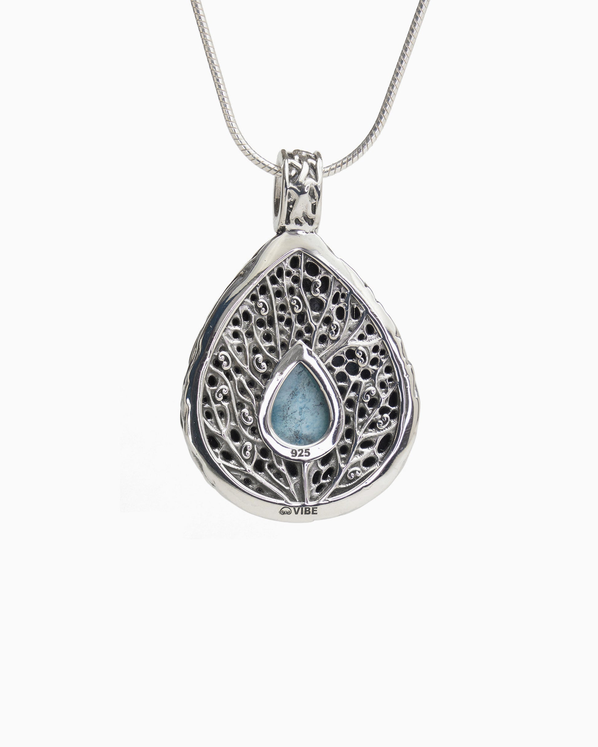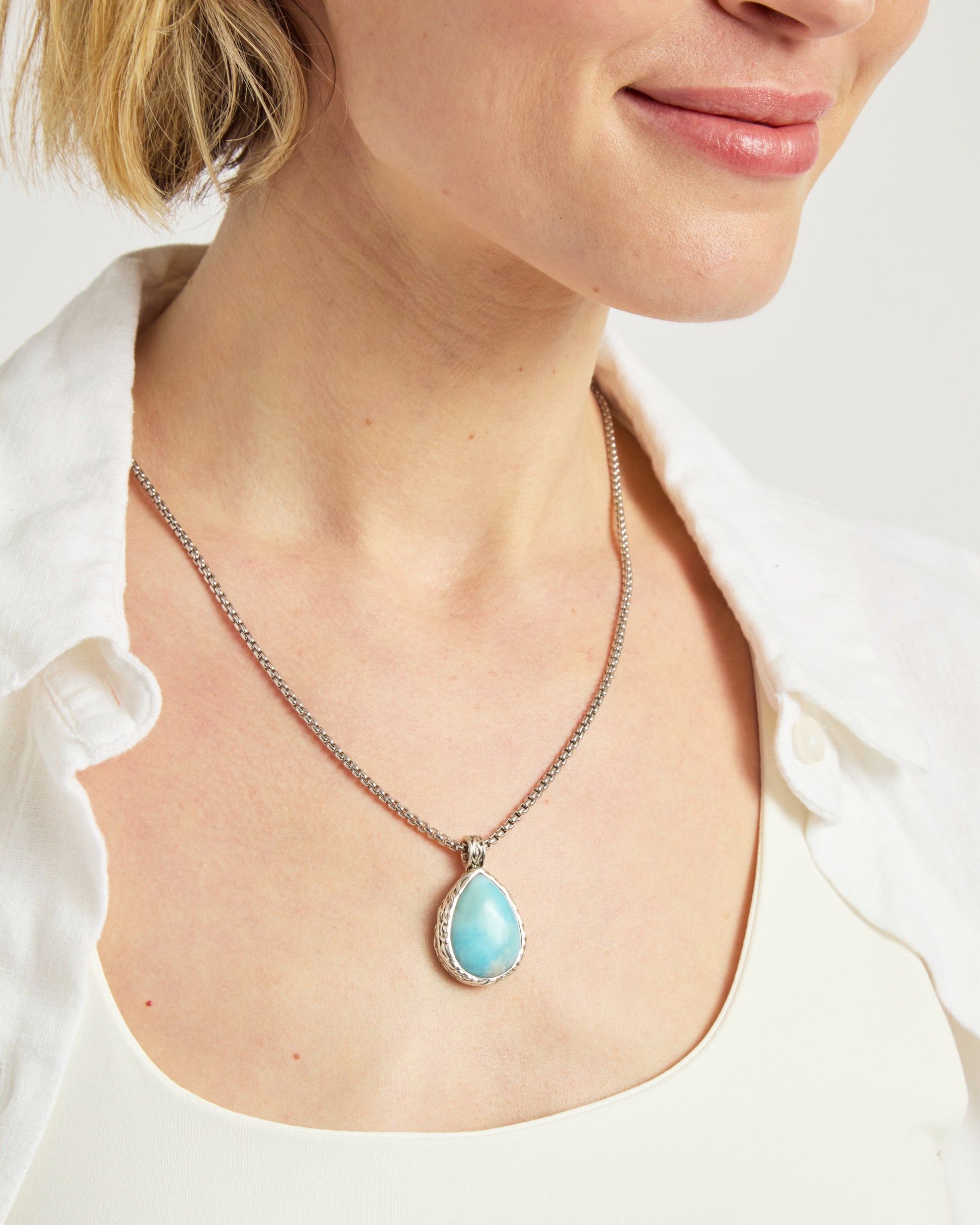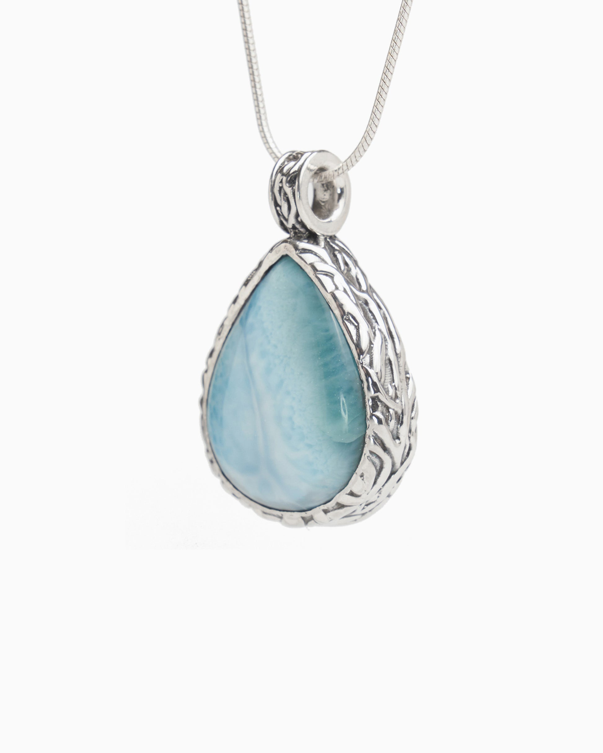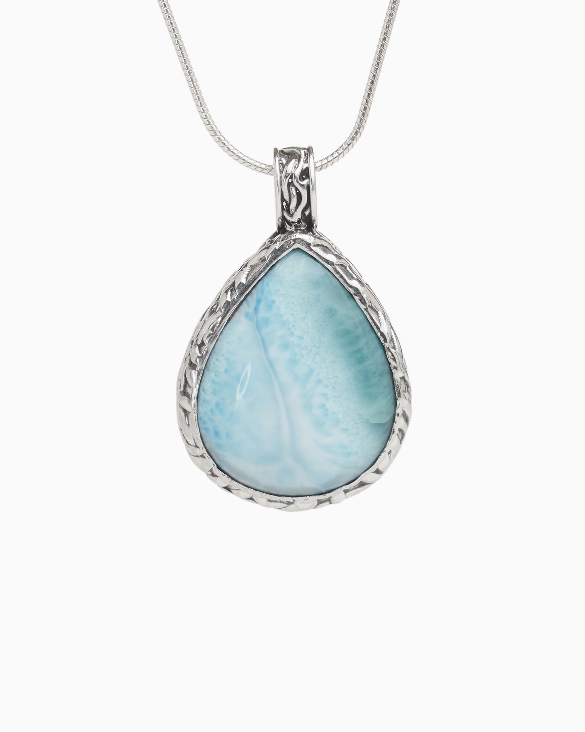 The Sea Foam Larimar Pendant is handcrafted with sterling silver and showcases a captivating pear-shaped larimar cabochon. Inspired by the tranquility of the island, this pendant boasts a coral reef texture encircling the stone and adorning the bail. This statement piece is sure to become a favorite in your collection. Pair with your favorite chain, sold separately.