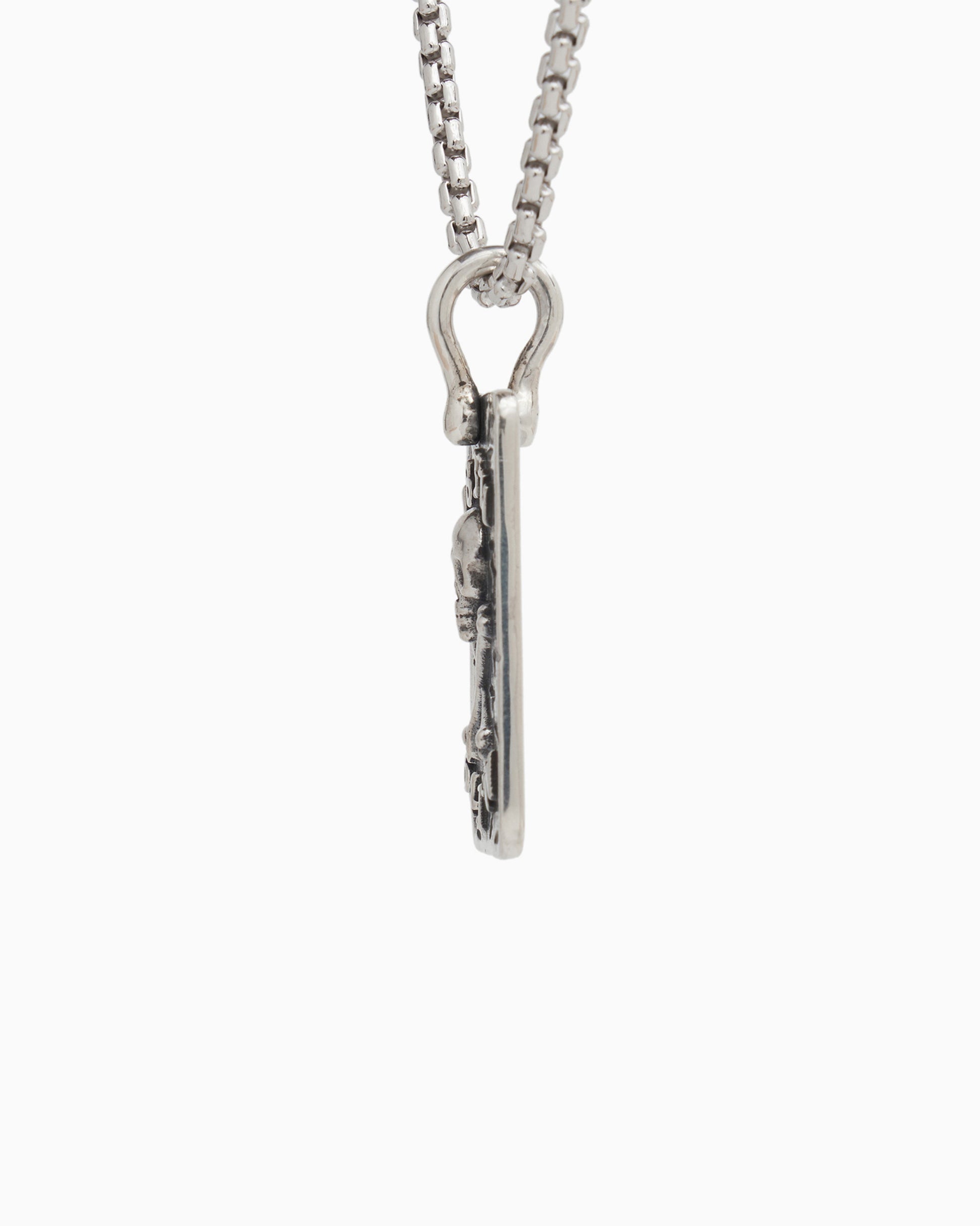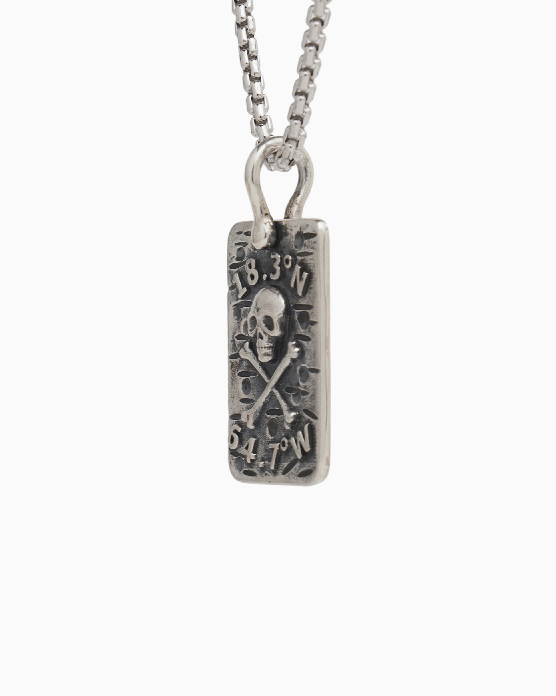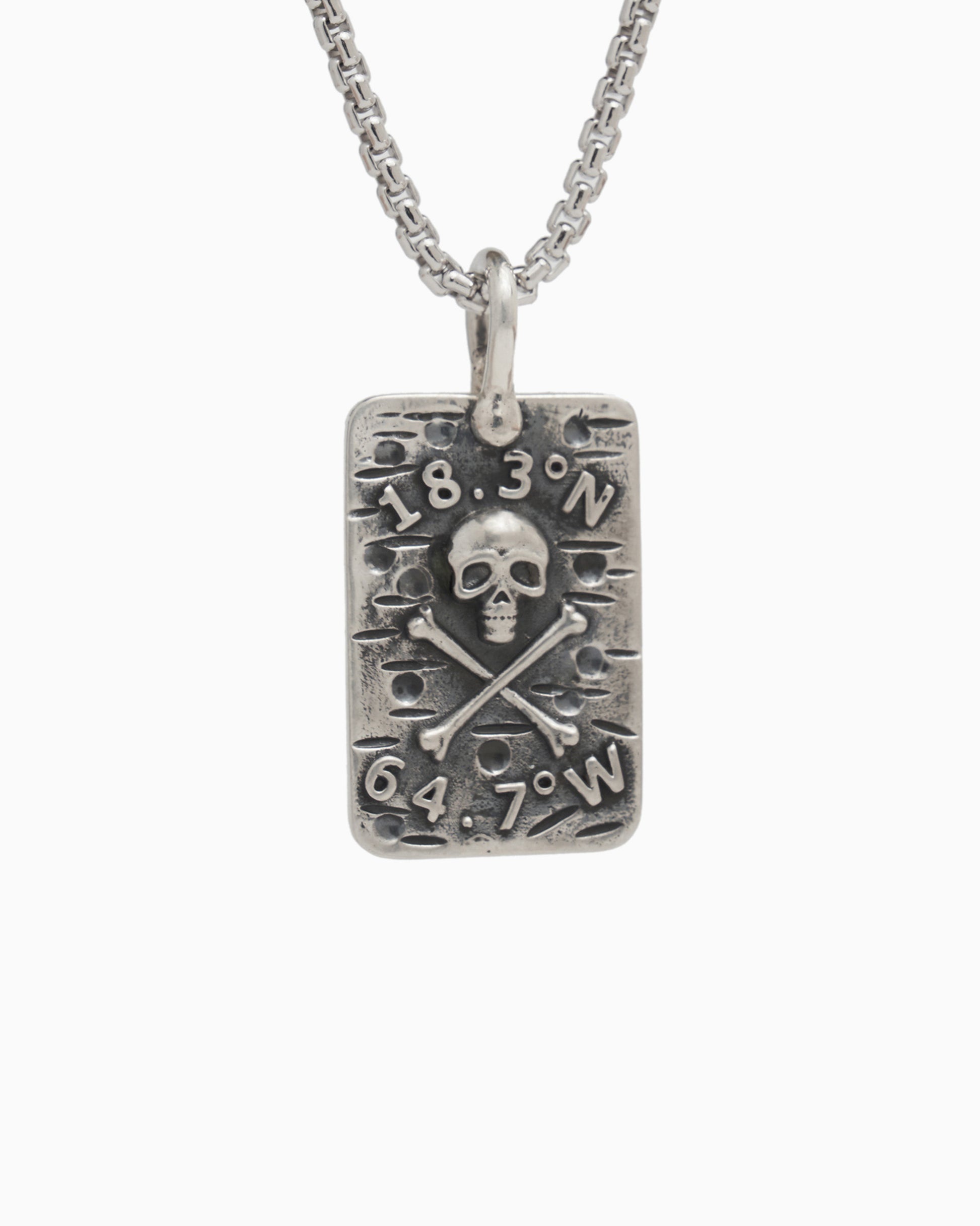 The Skull & St. John Coordinates Pendant is a unique piece perfect for those who hold St. John close to their heart. Handcrafted in oxidized sterling silver, this piece features our signature pirate texture which gives a rugged, weathered look. With a skull in the center and the St. John coordinates, this pendant is a statement piece. With our oxidized finishes, no two are alike. Each original piece is handcrafted by Vibe artisans and markings and shades will vary. Pair with your favorite chain, sold separately.