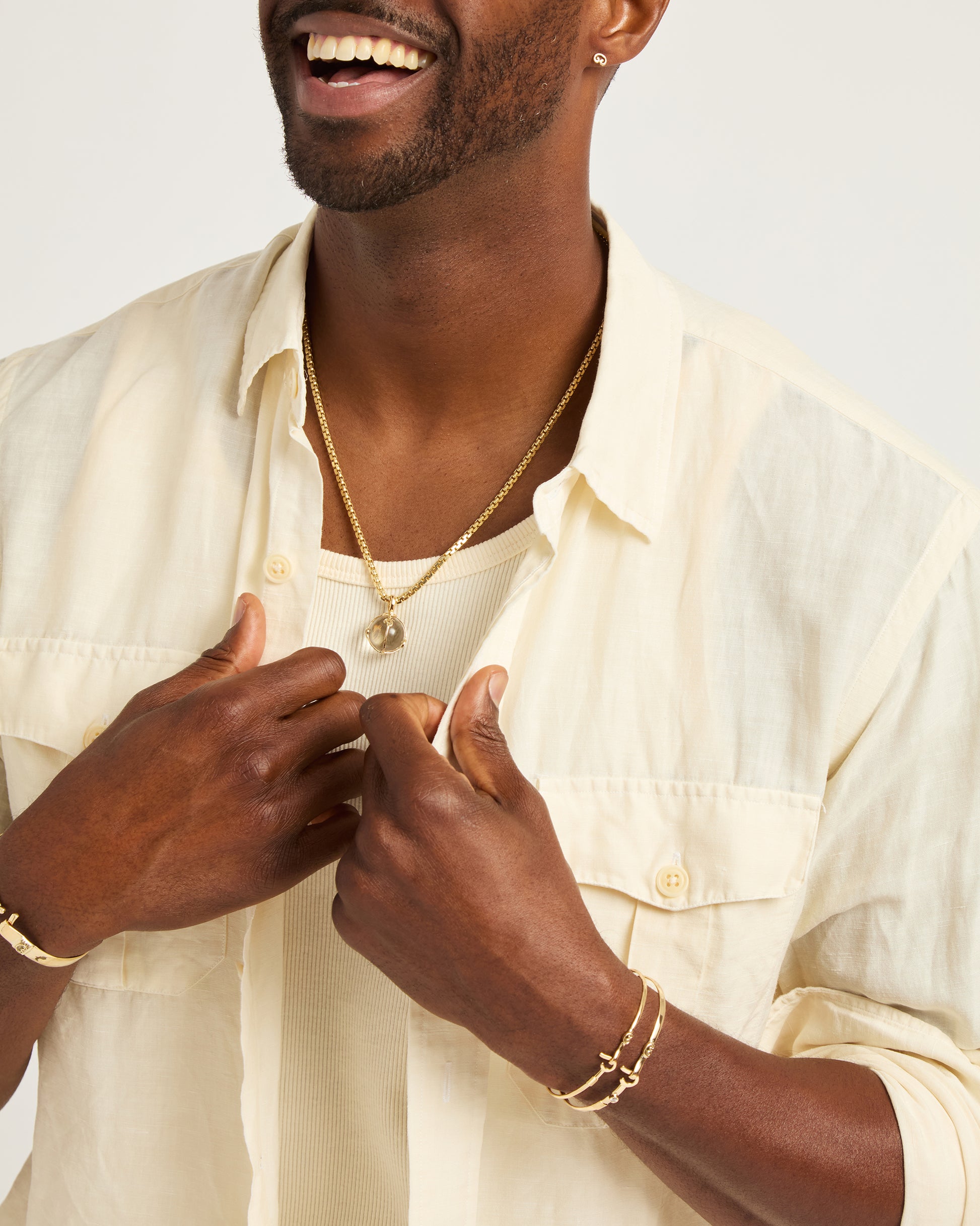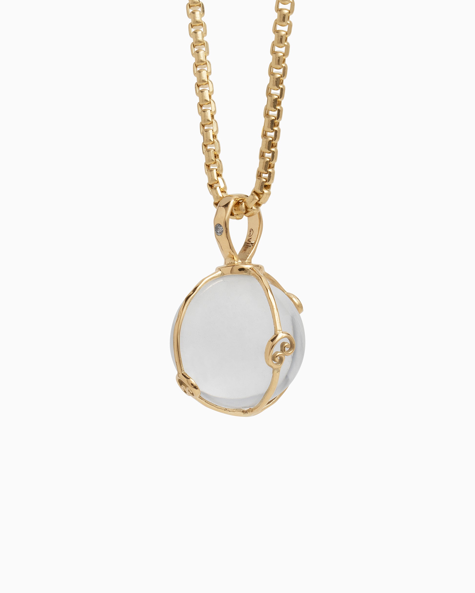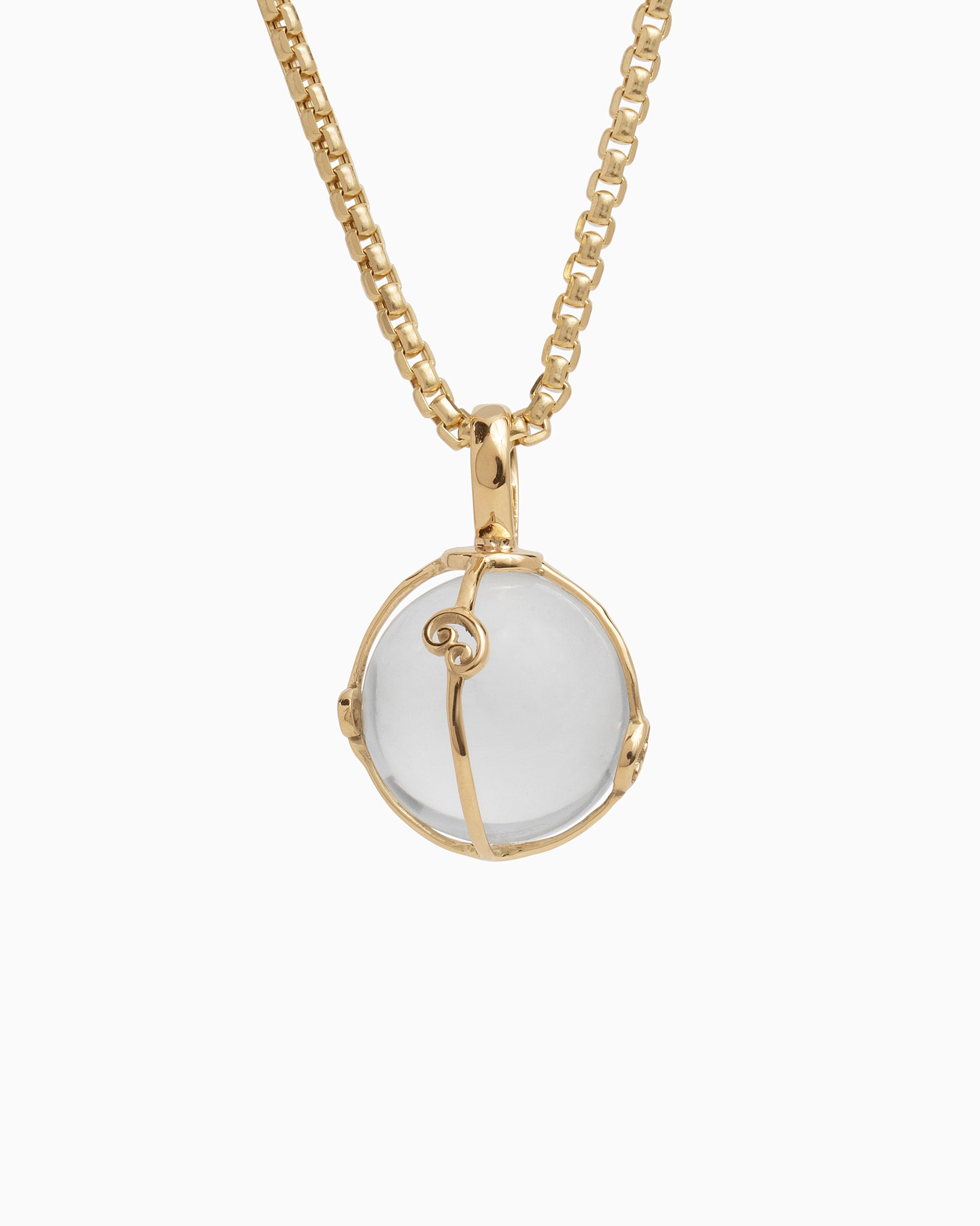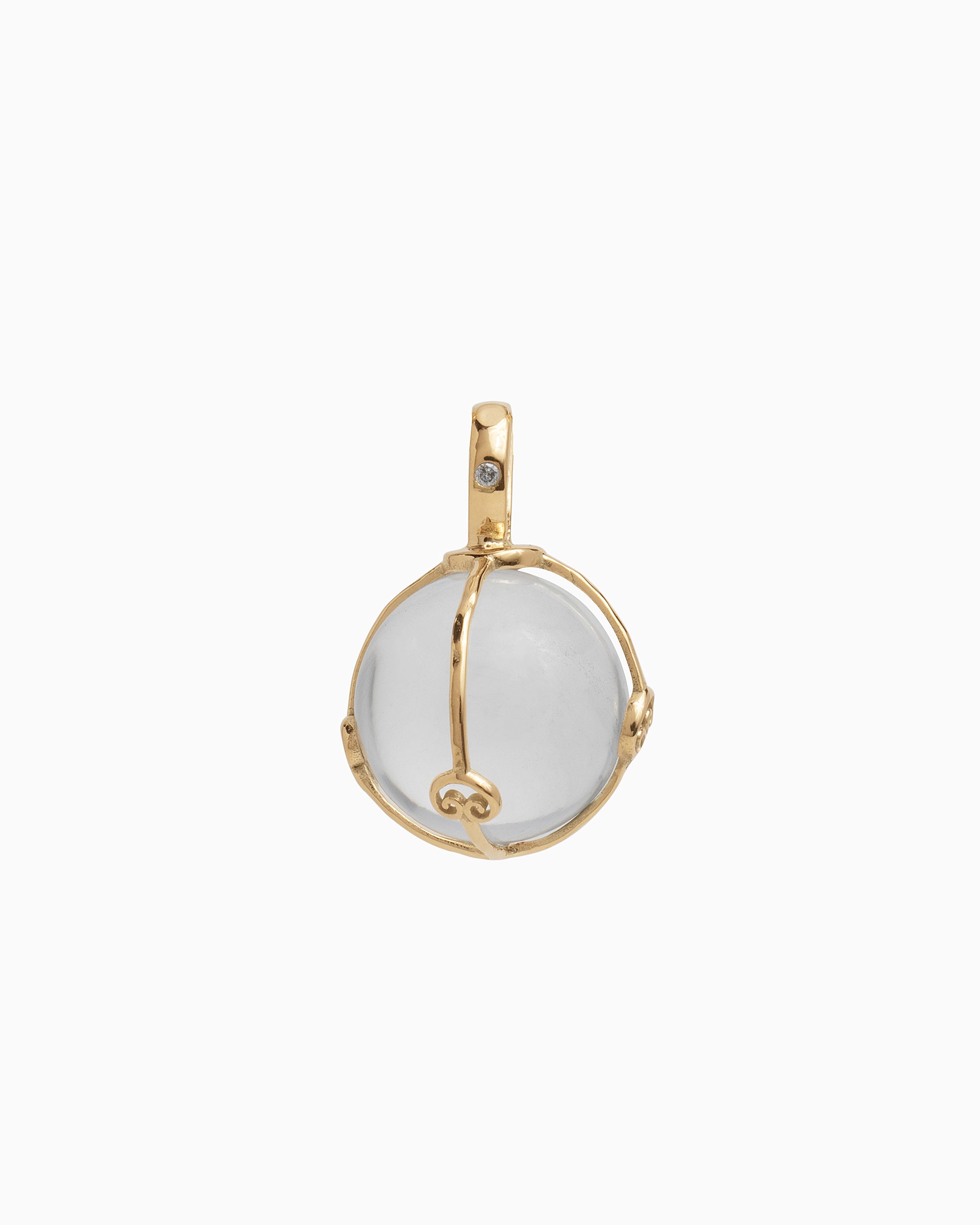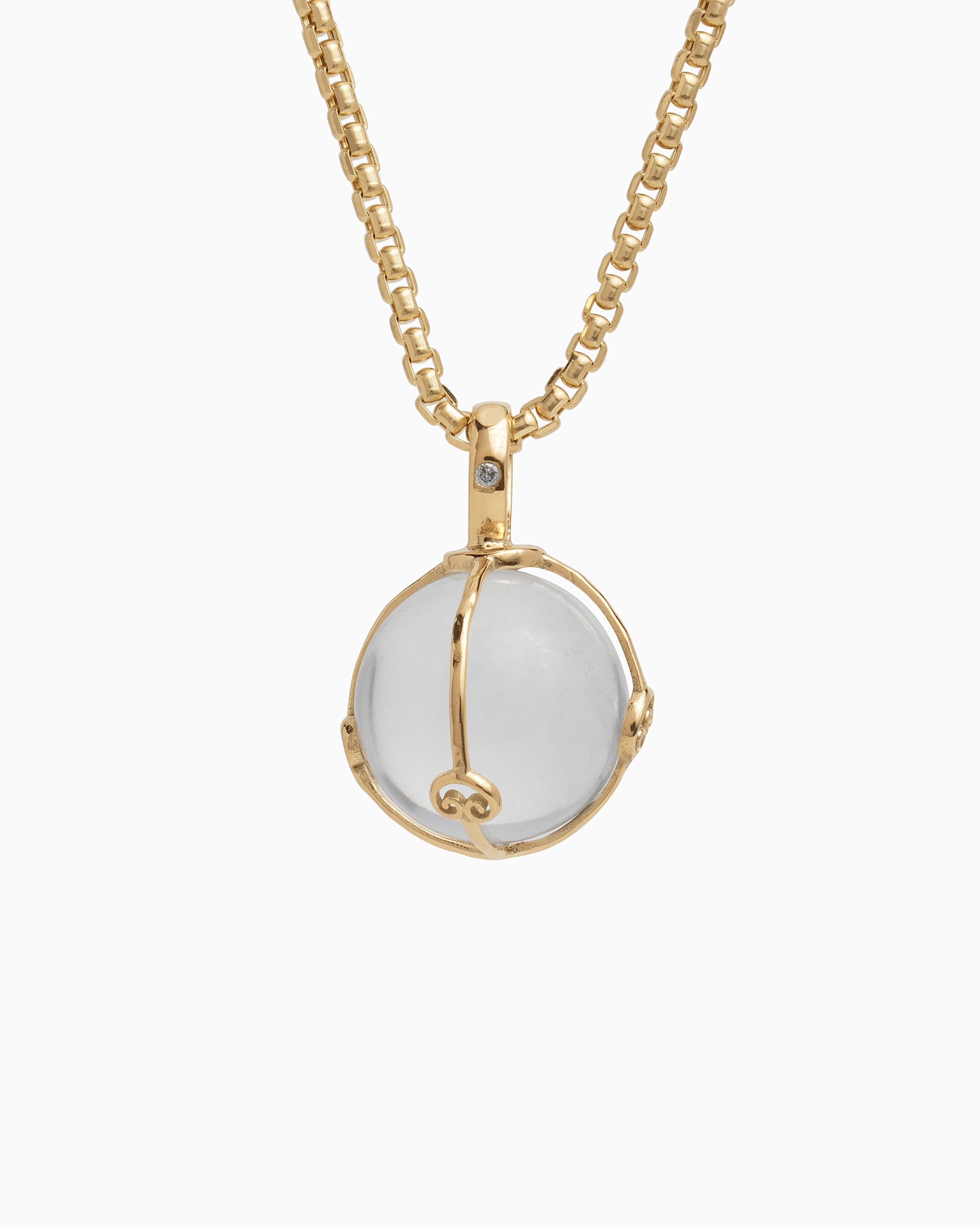 The Spinning Globe Stone Pendant showcases a rotating faceted clear quartz globe, encased in a 14K solid gold housing featuring a diamond and open petroglyph accents.