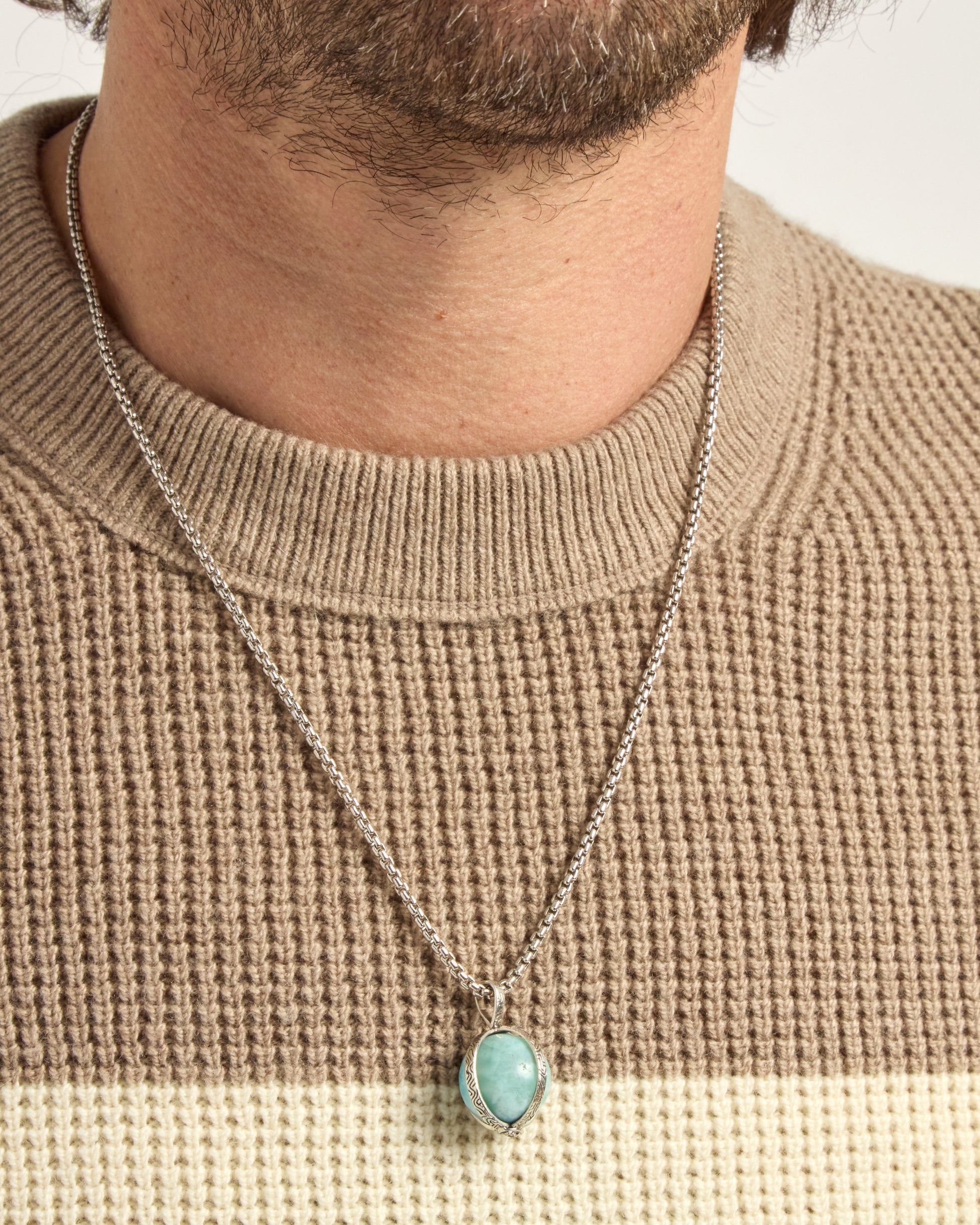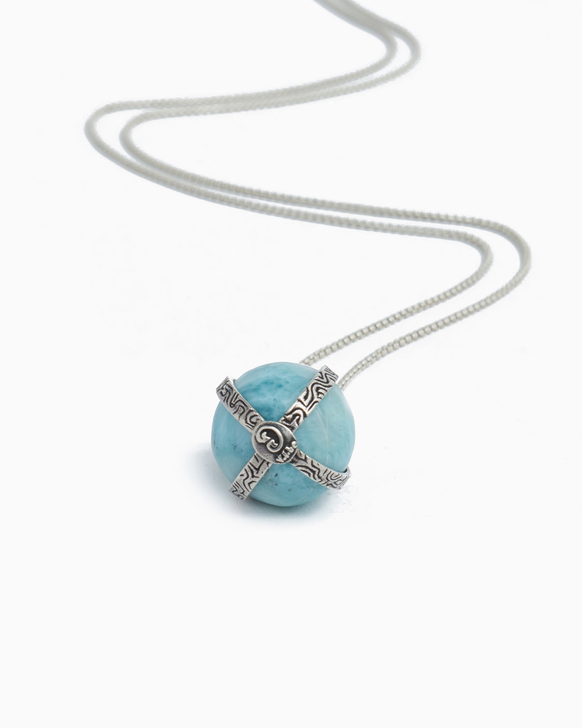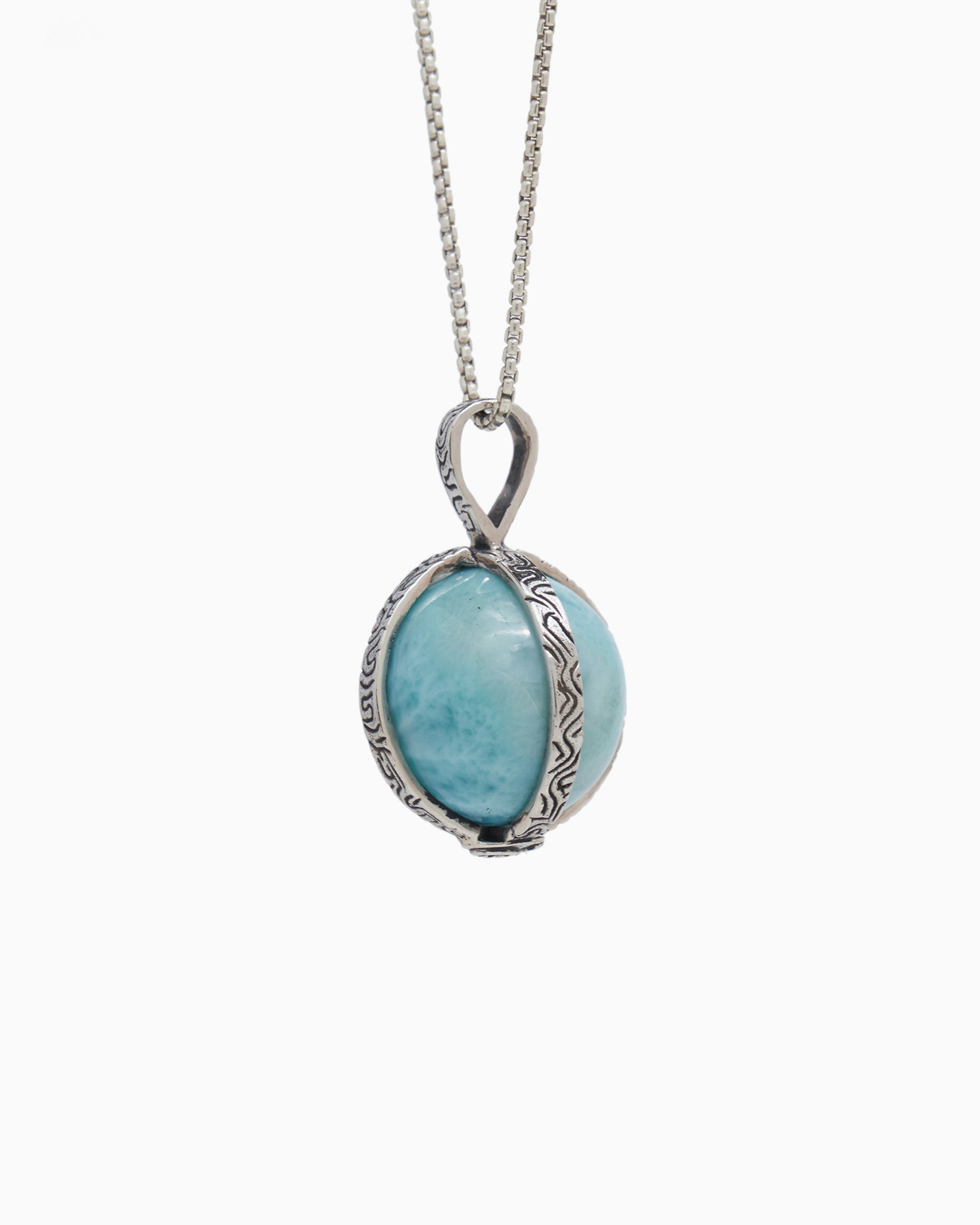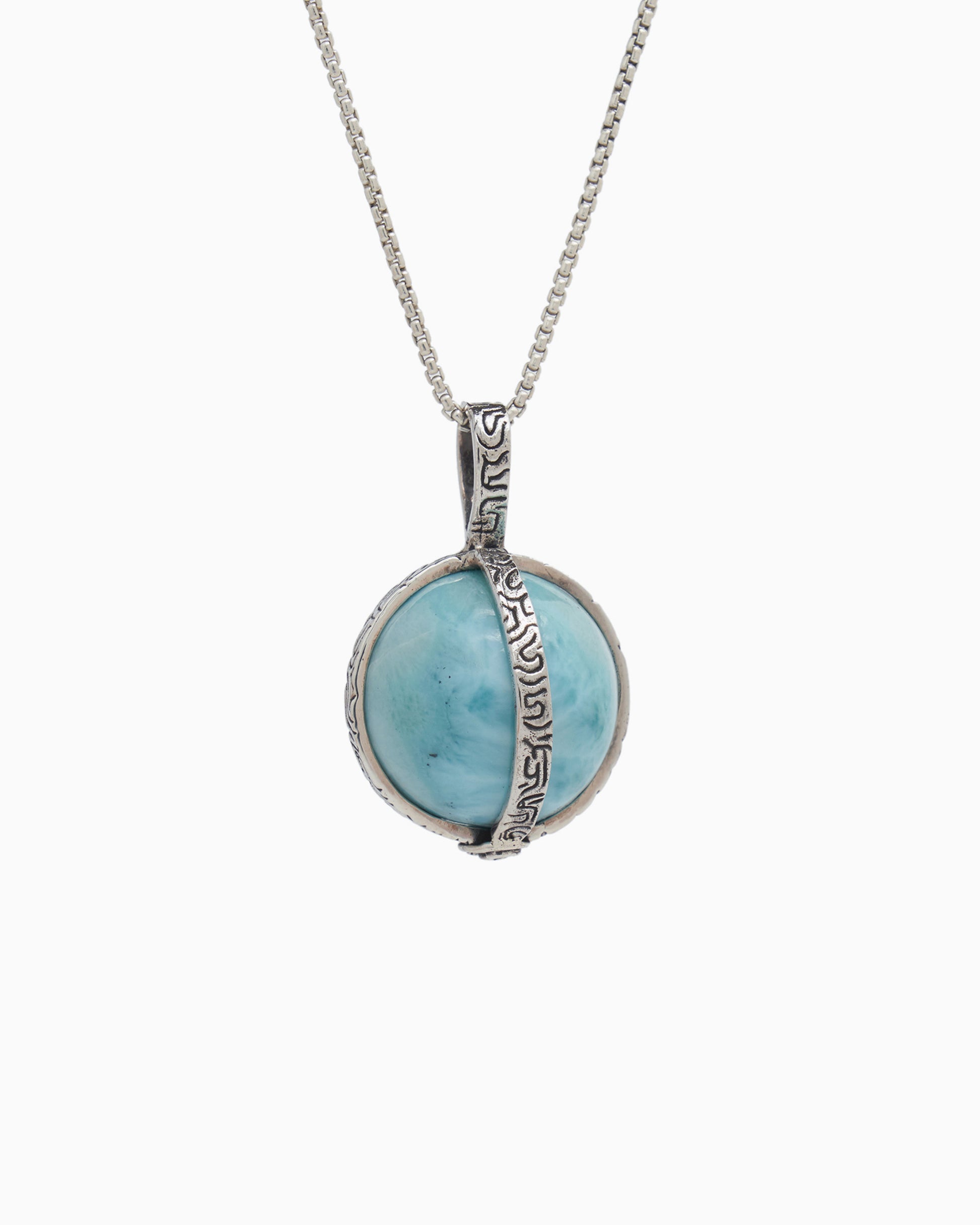 The Spinning Globe Stone Pendant showcases a rotating larimar stone globe, encased in a sterling silver housing with our signature reef texture. This ocean-inspired texture replicates the intricate patterns found in a reef.