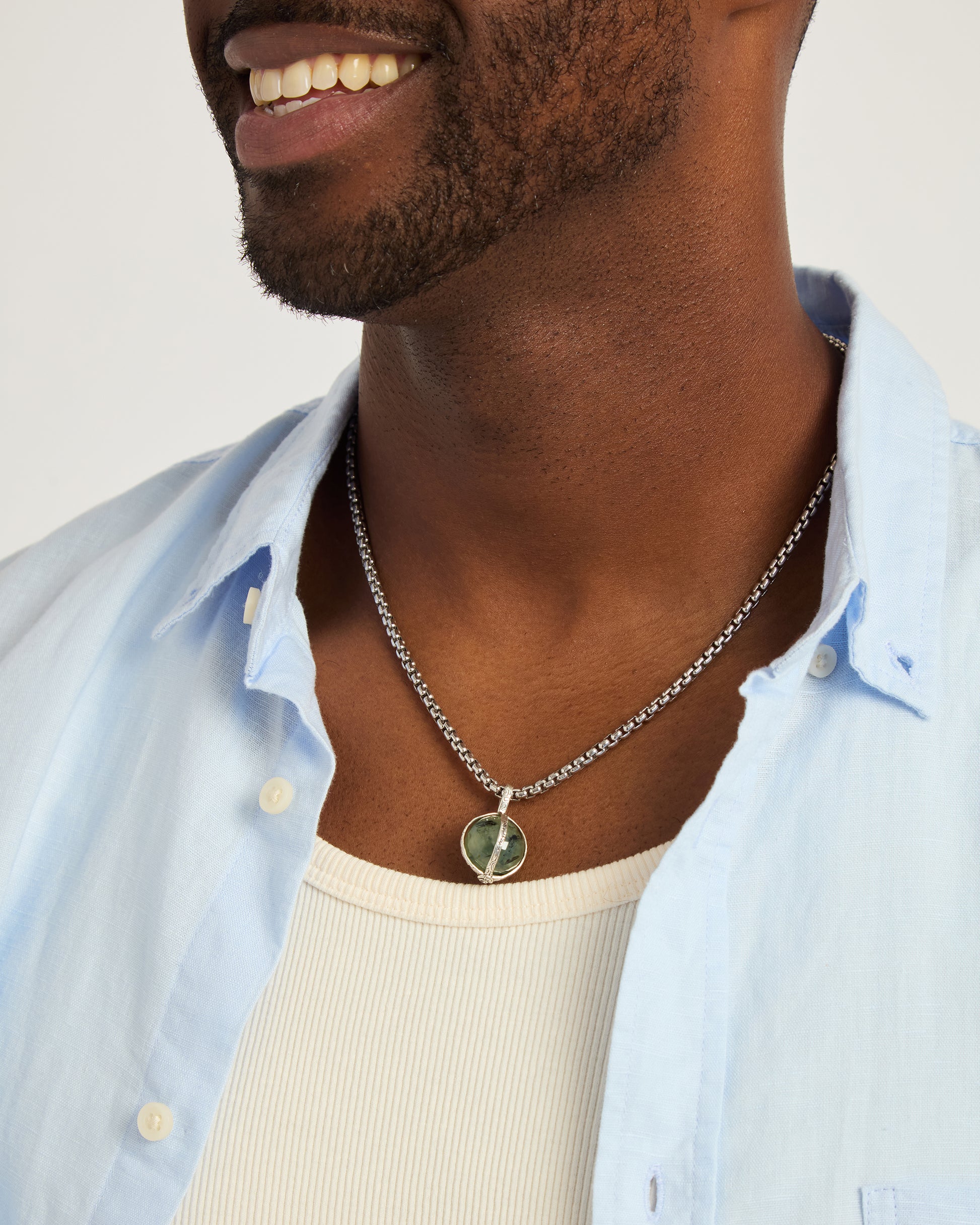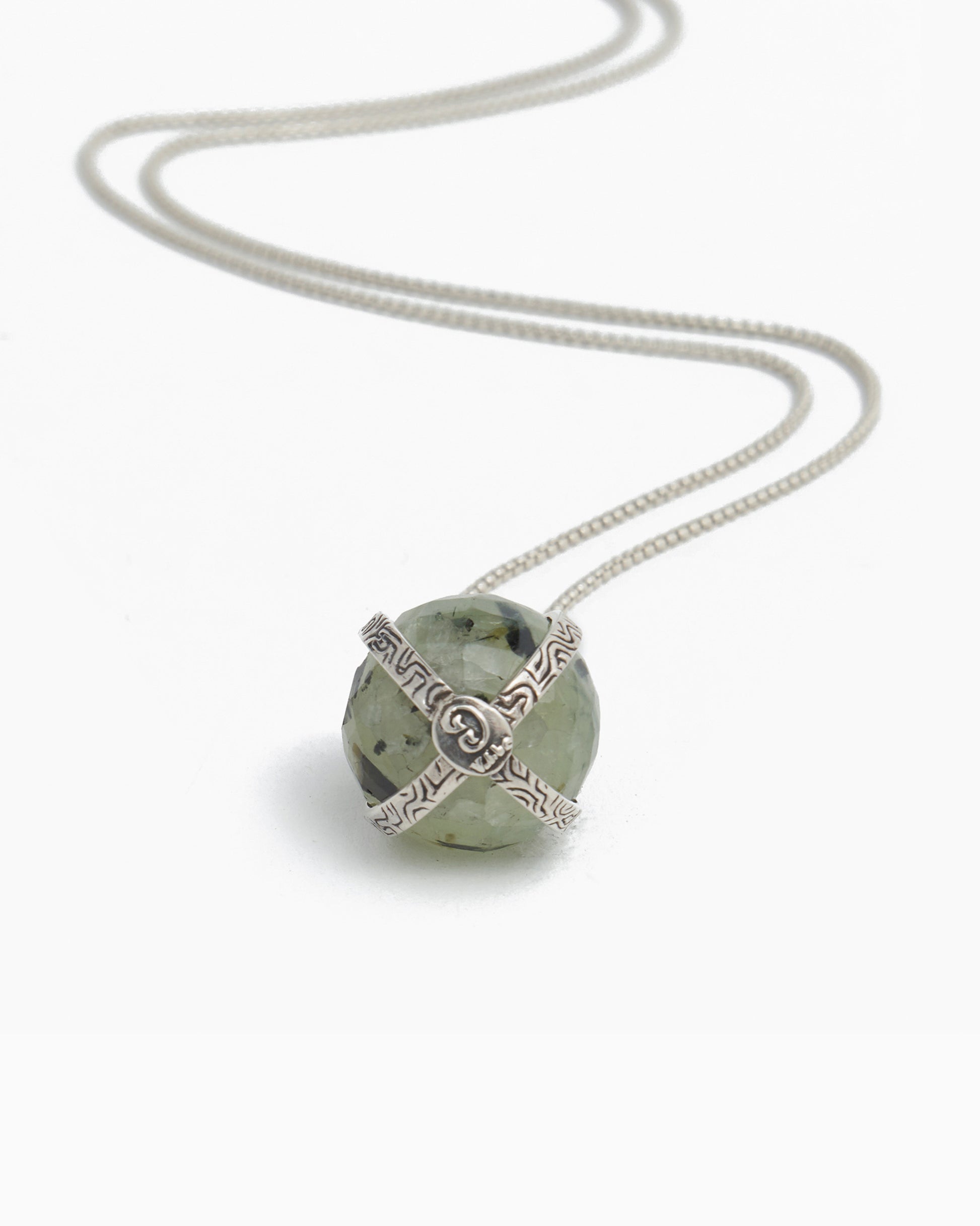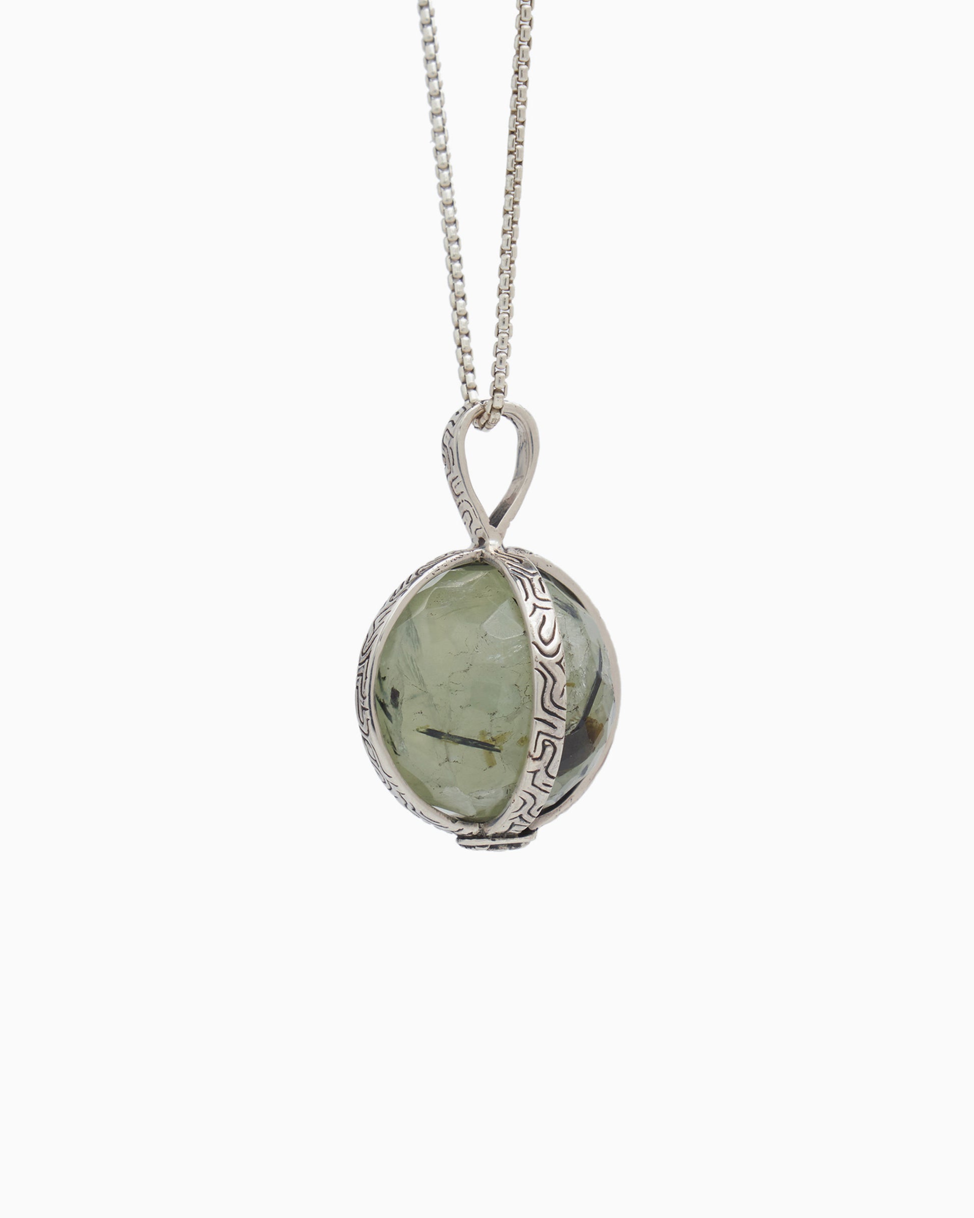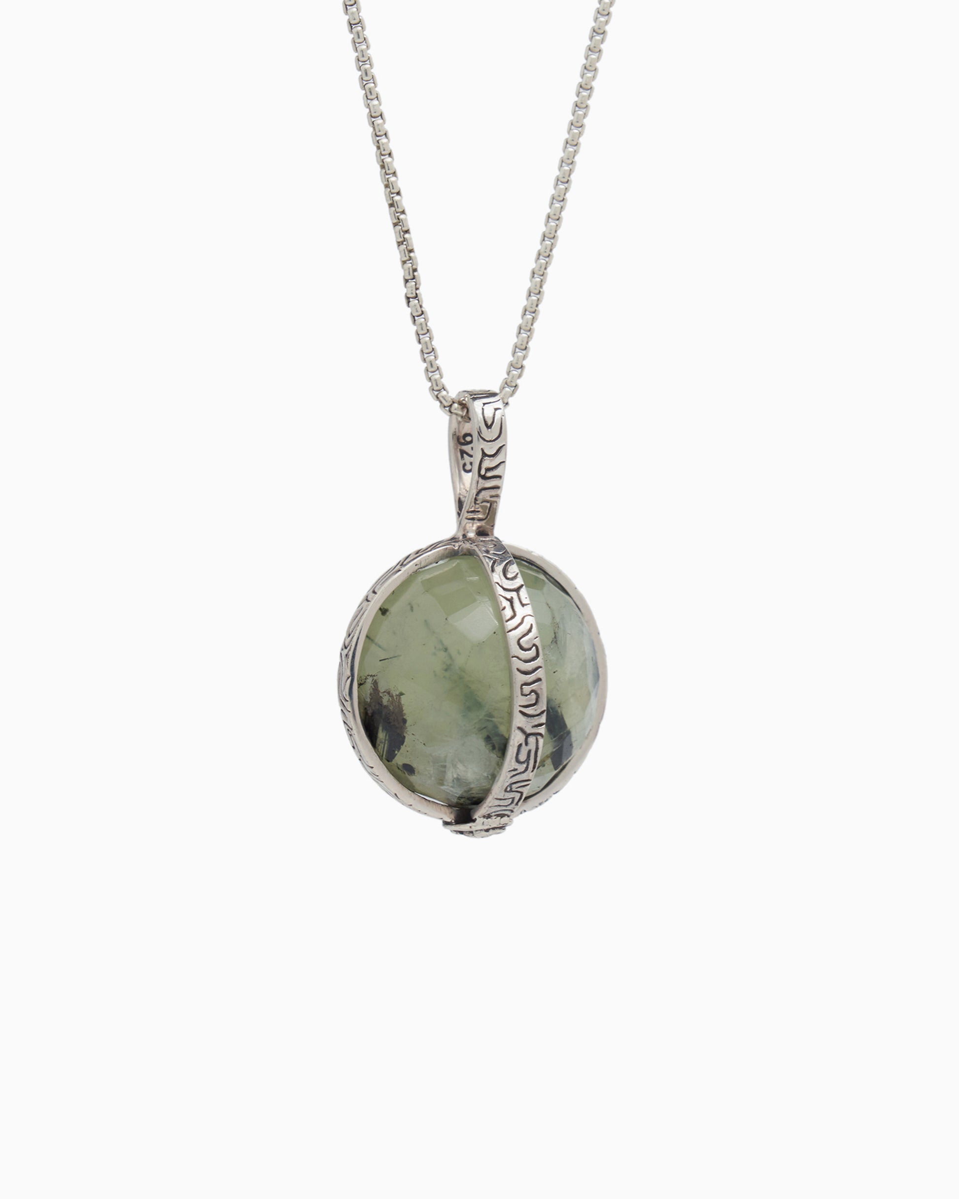 The Spinning Globe Stone Pendant showcases a rotating faceted prehnite stone globe, encased in a sterling silver housing with our signature reef texture. This ocean-inspired texture replicates the intricate patterns found in a reef.