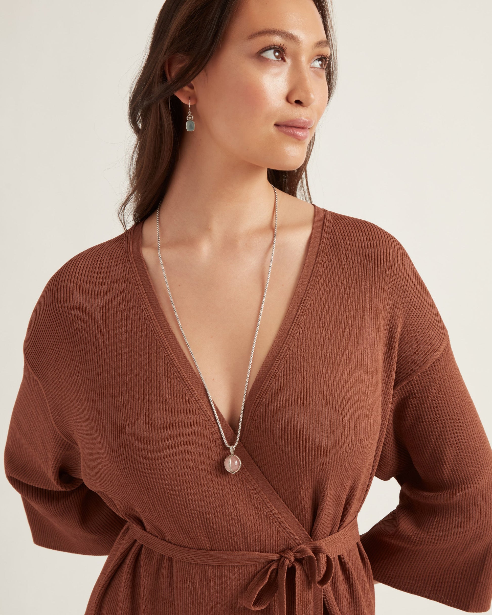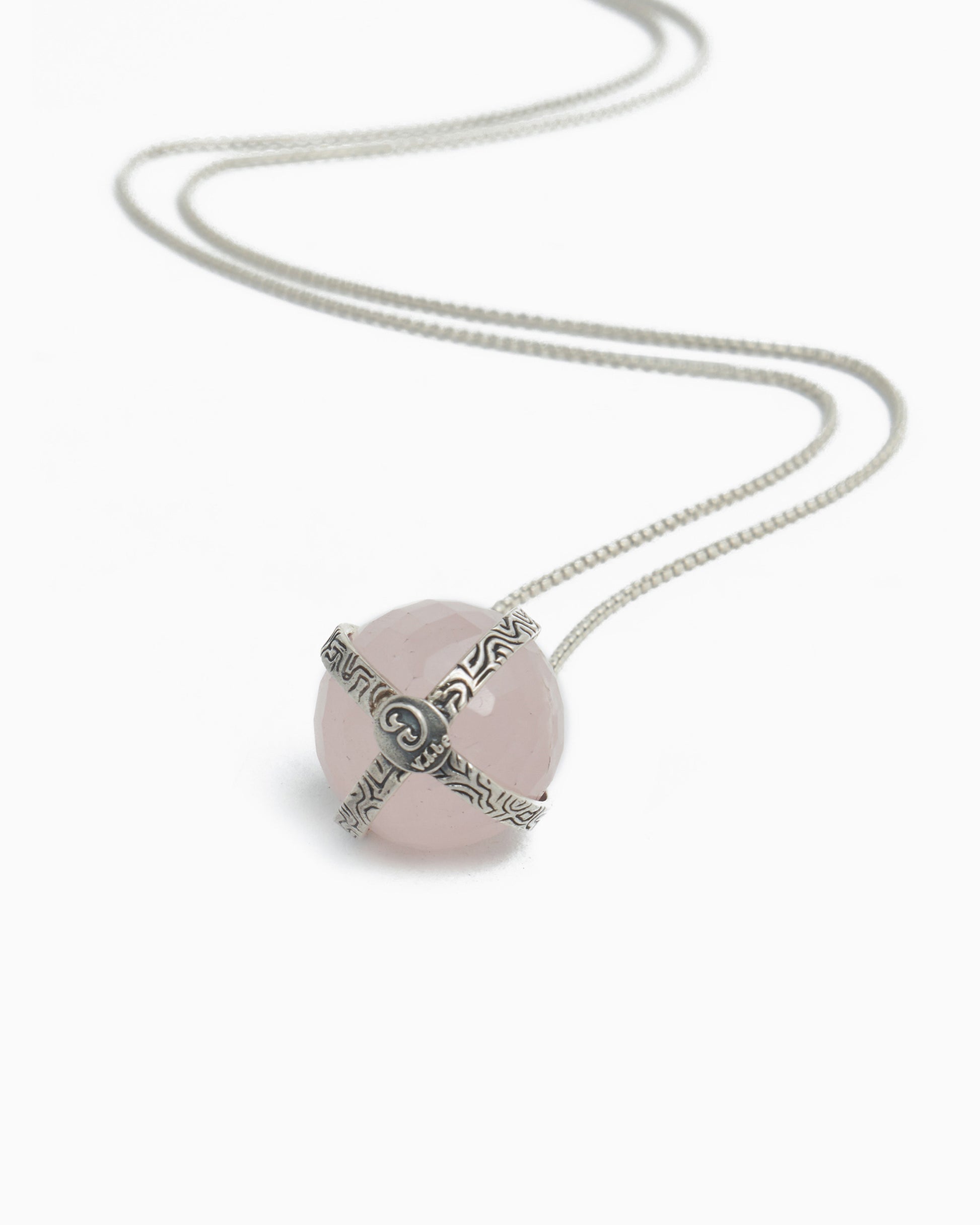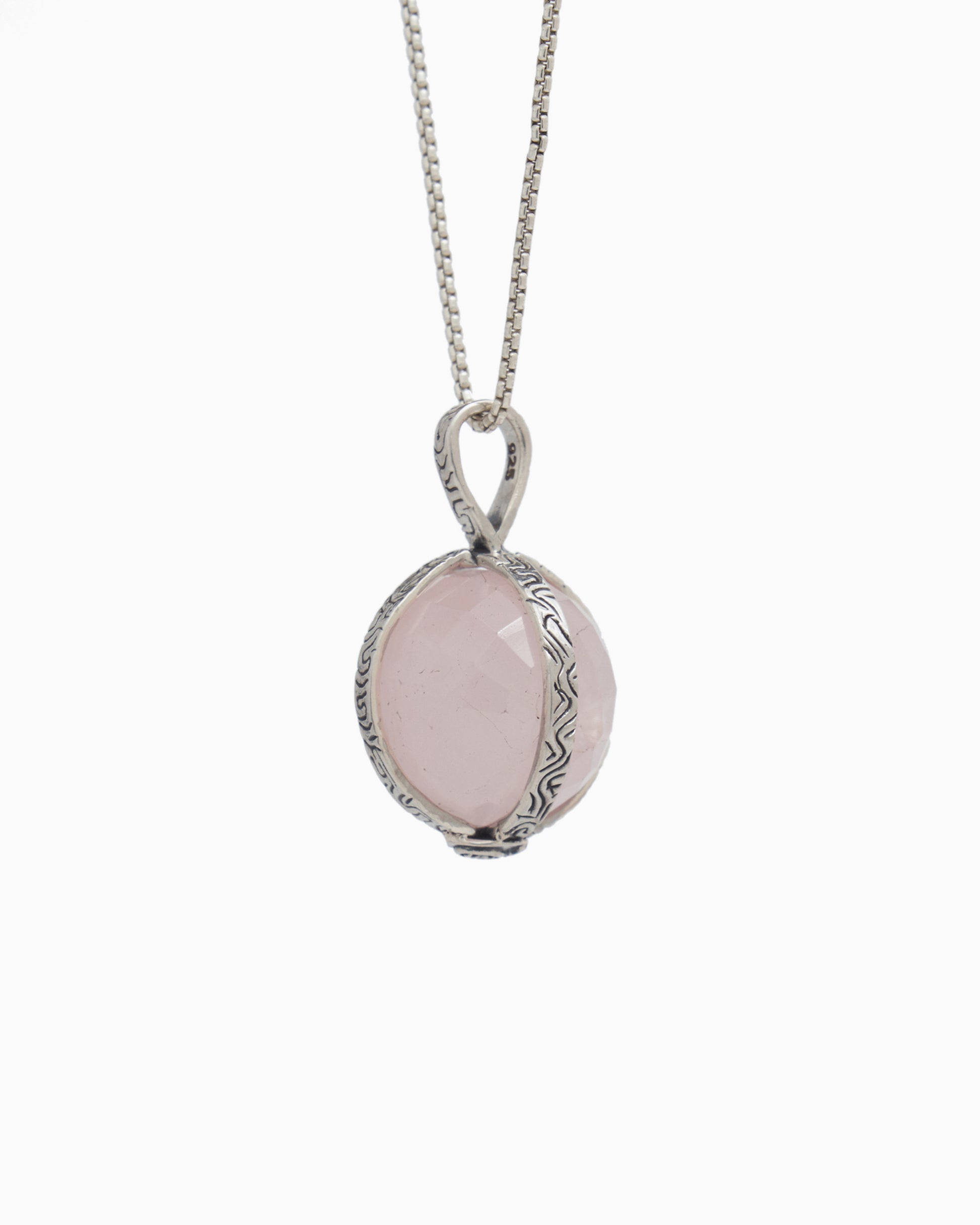 The Spinning Globe Stone Pendant showcases a rotating faceted rose quartz stone globe, encased in a sterling silver housing with our signature reef texture. This ocean-inspired texture replicates the intricate patterns found in a reef.
