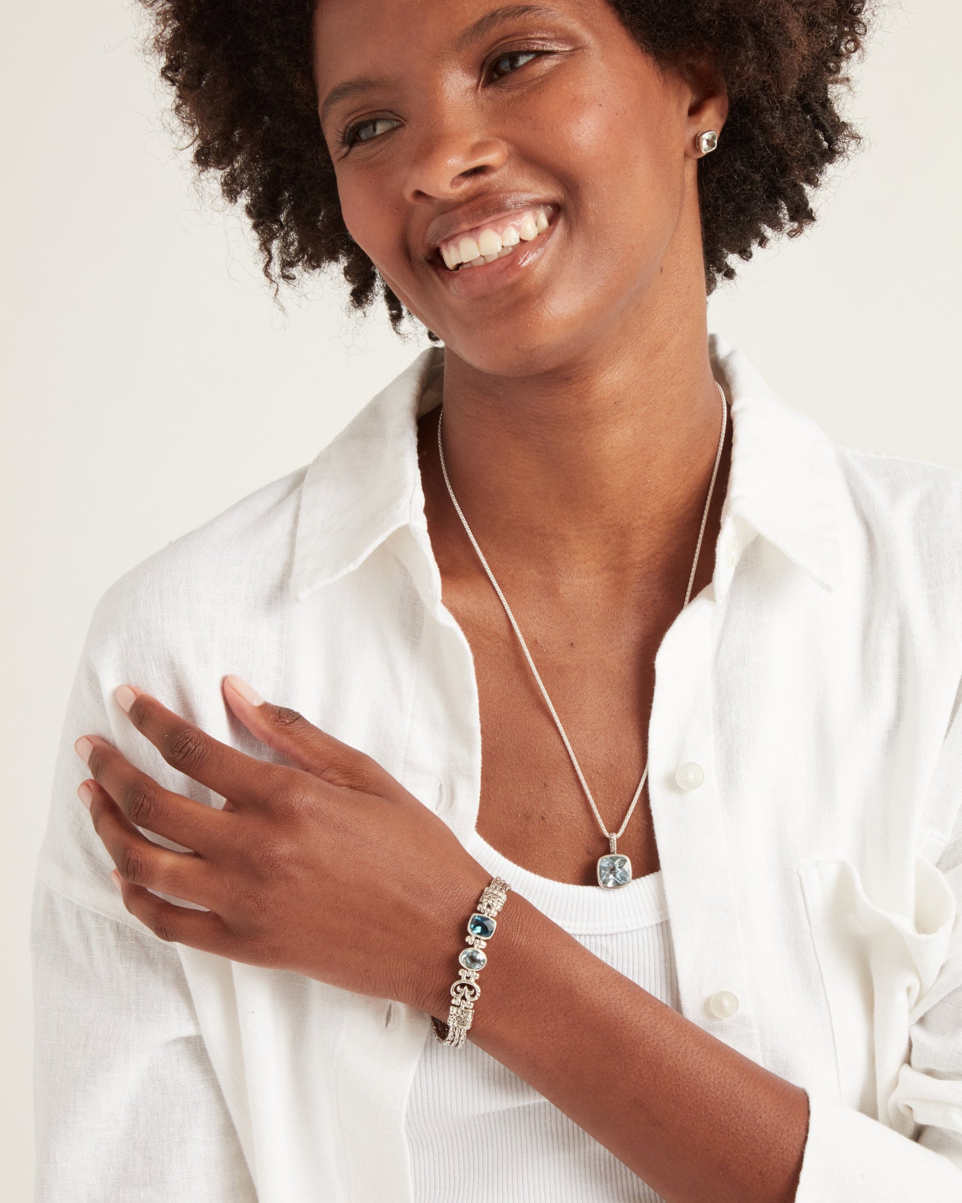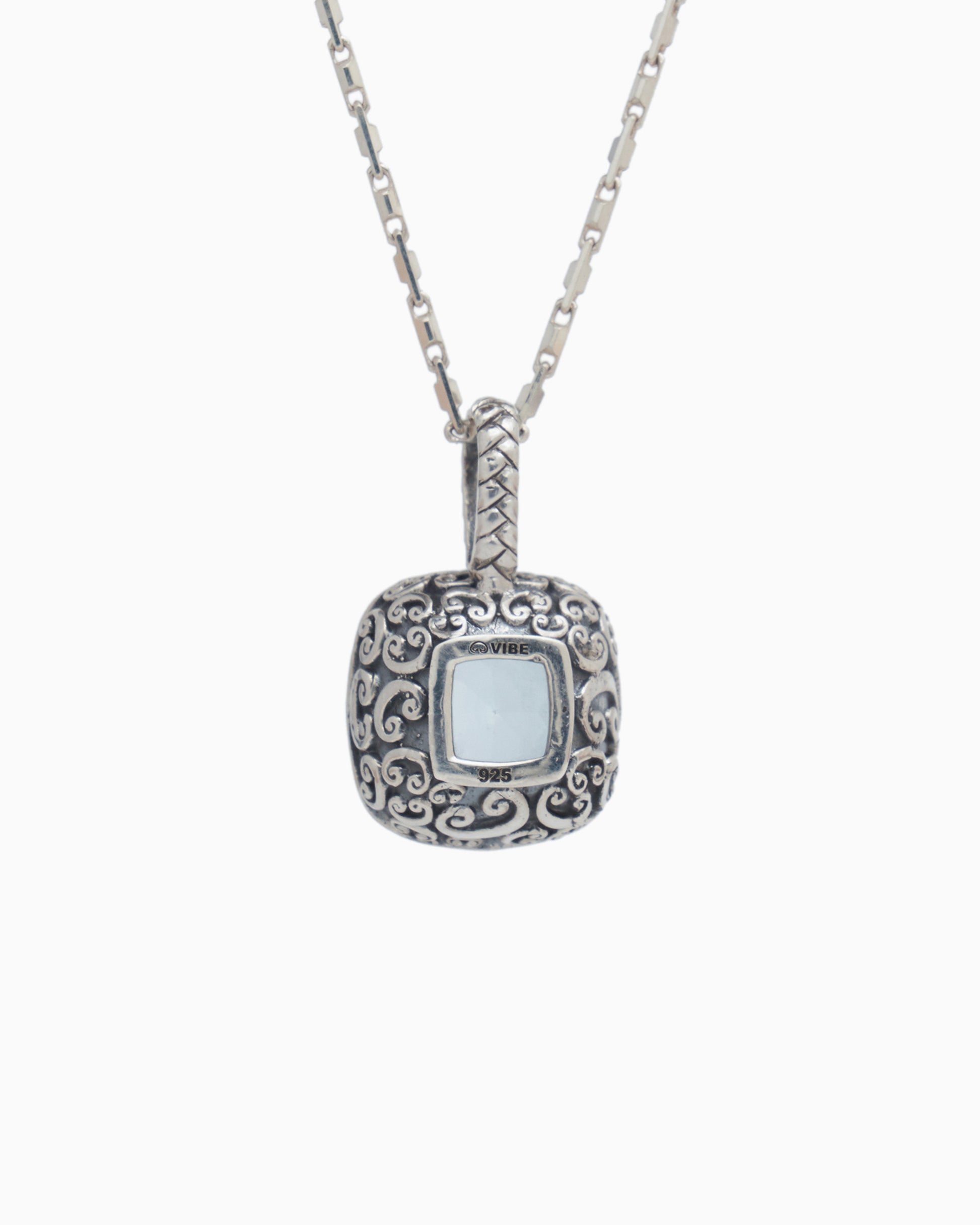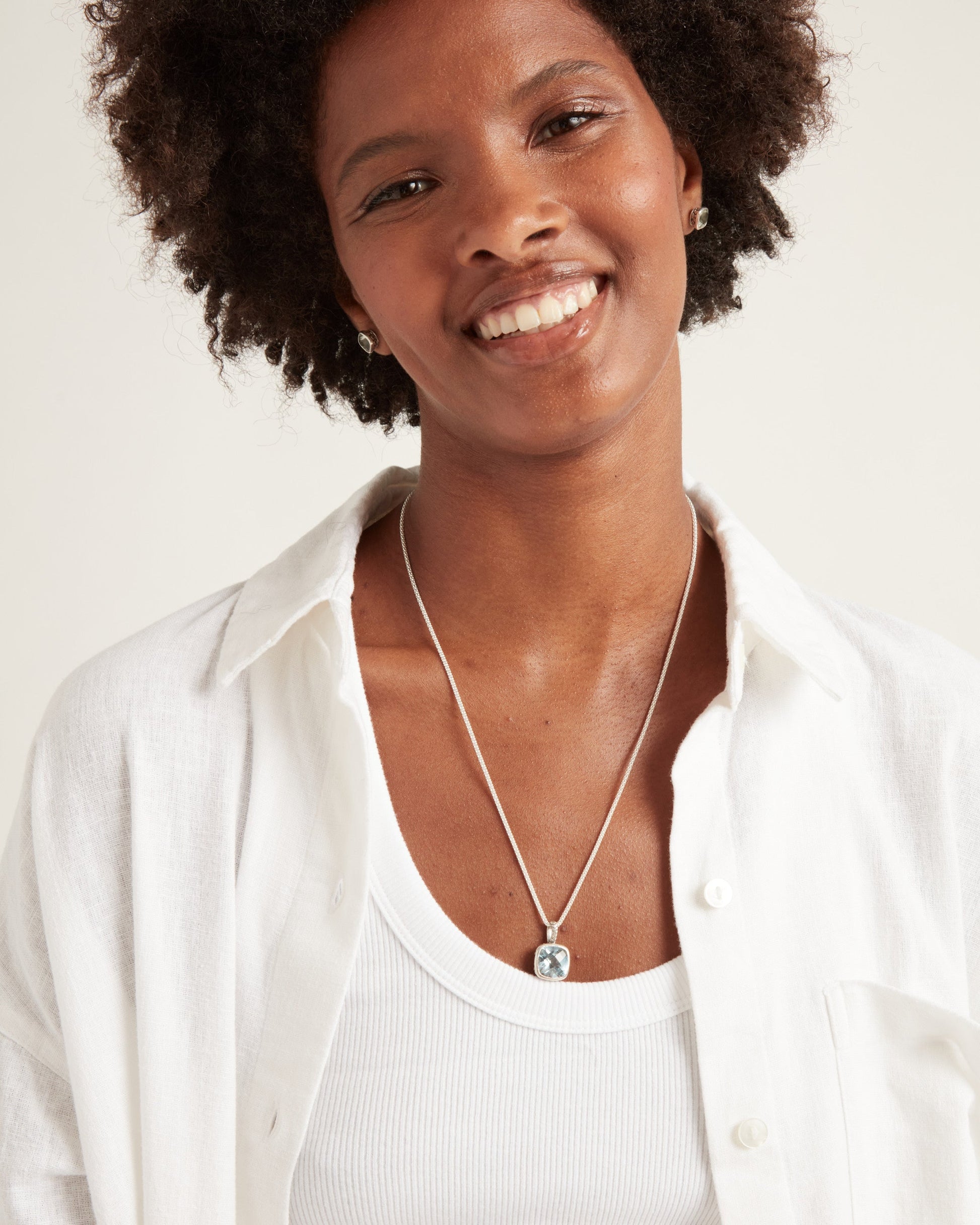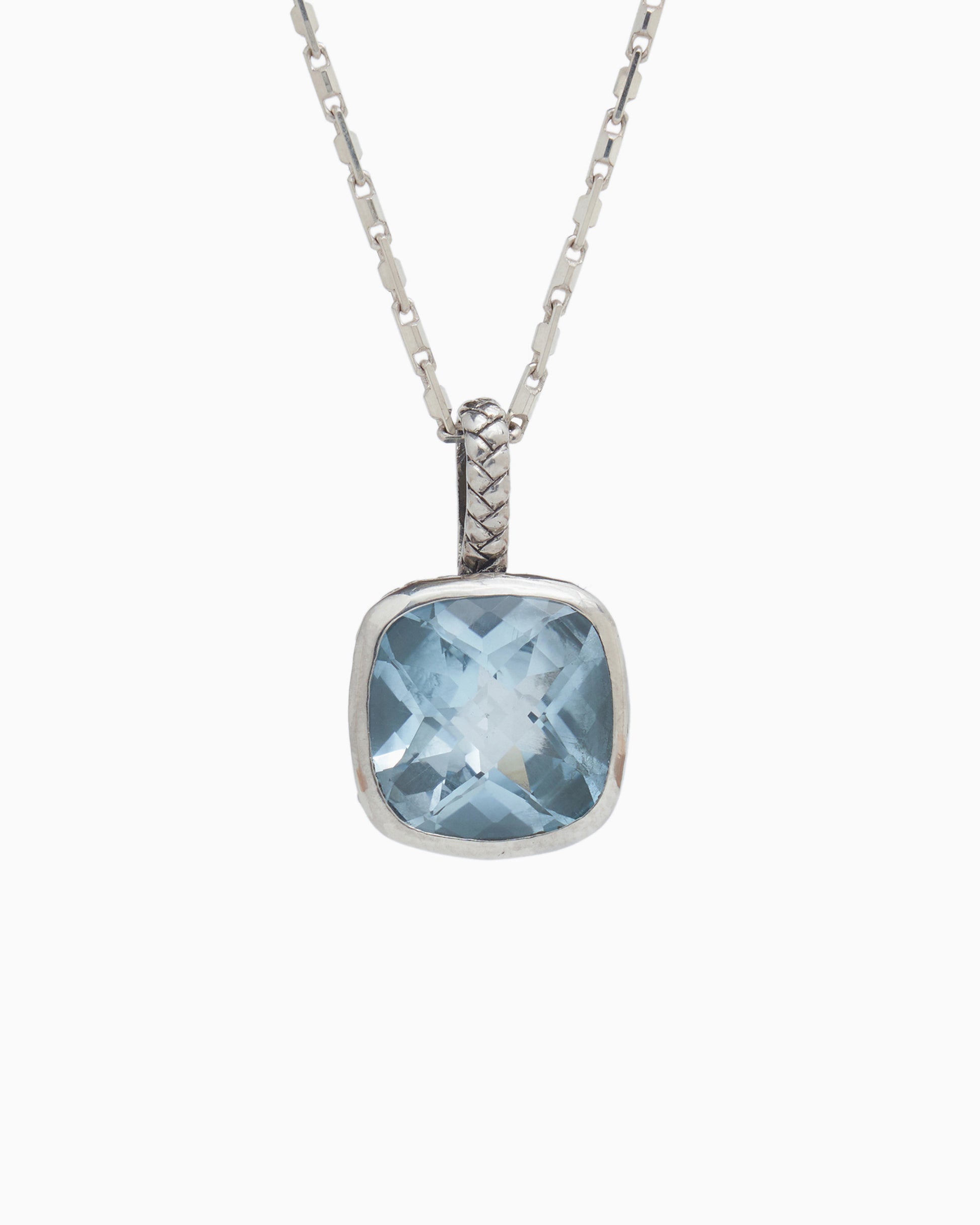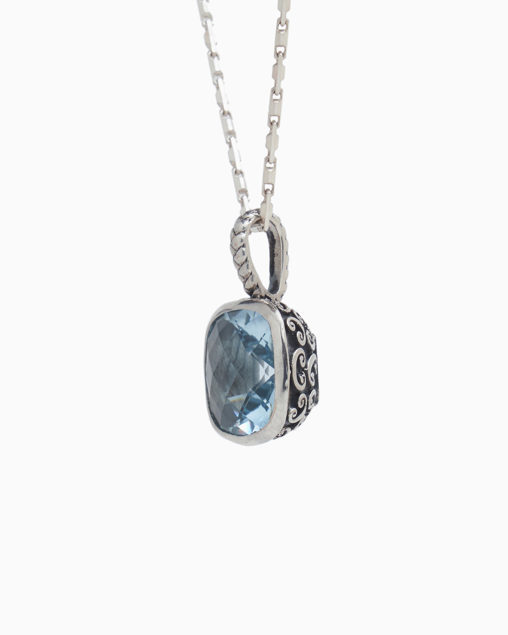 The Square Stone Pendant features a faceted sky blue topaz stone set in sterling silver with a unique petroglyph texture. Take notice of the twisted detailing on the bail which adds a playful touch. Pair with your favorite chain, sold separately.