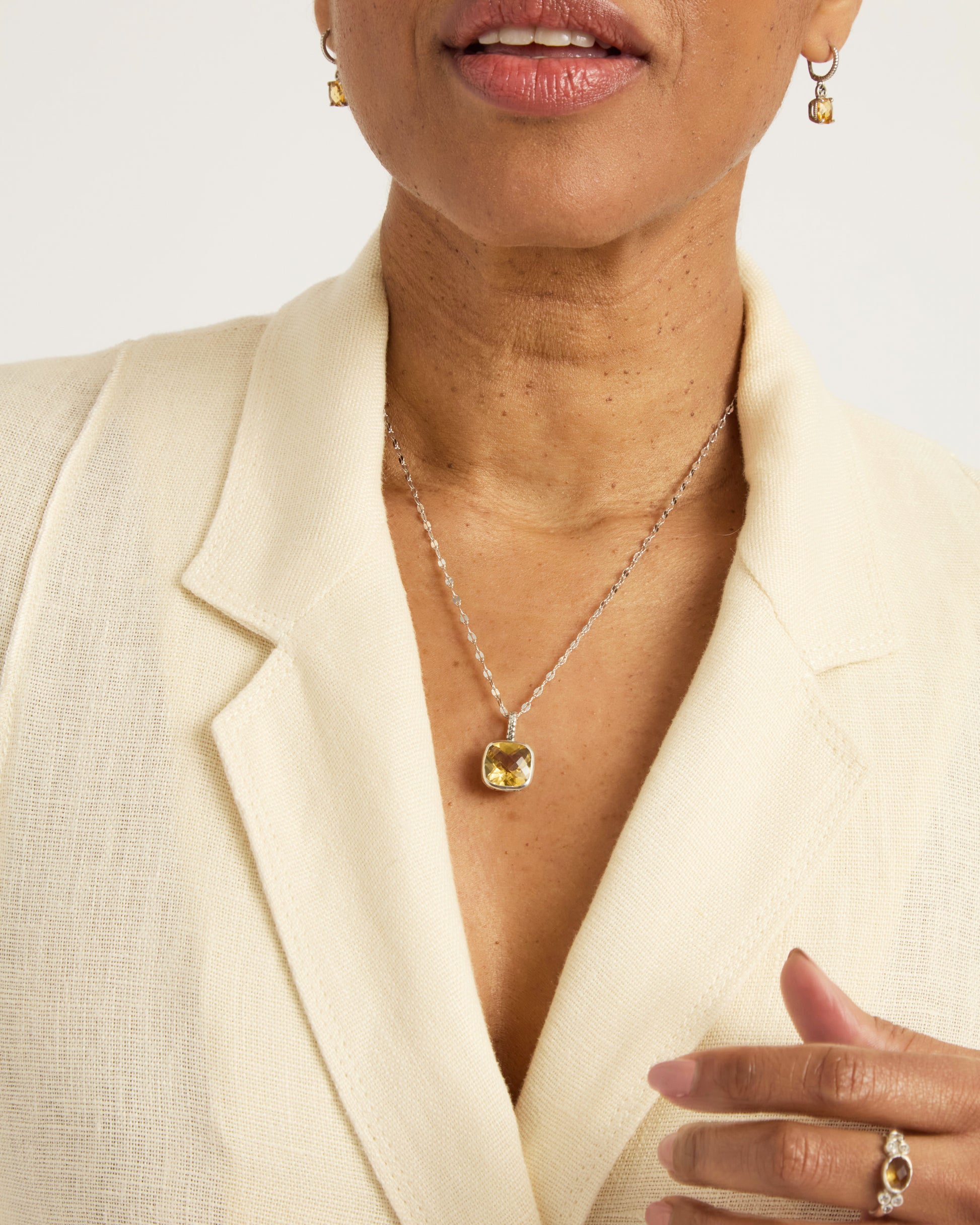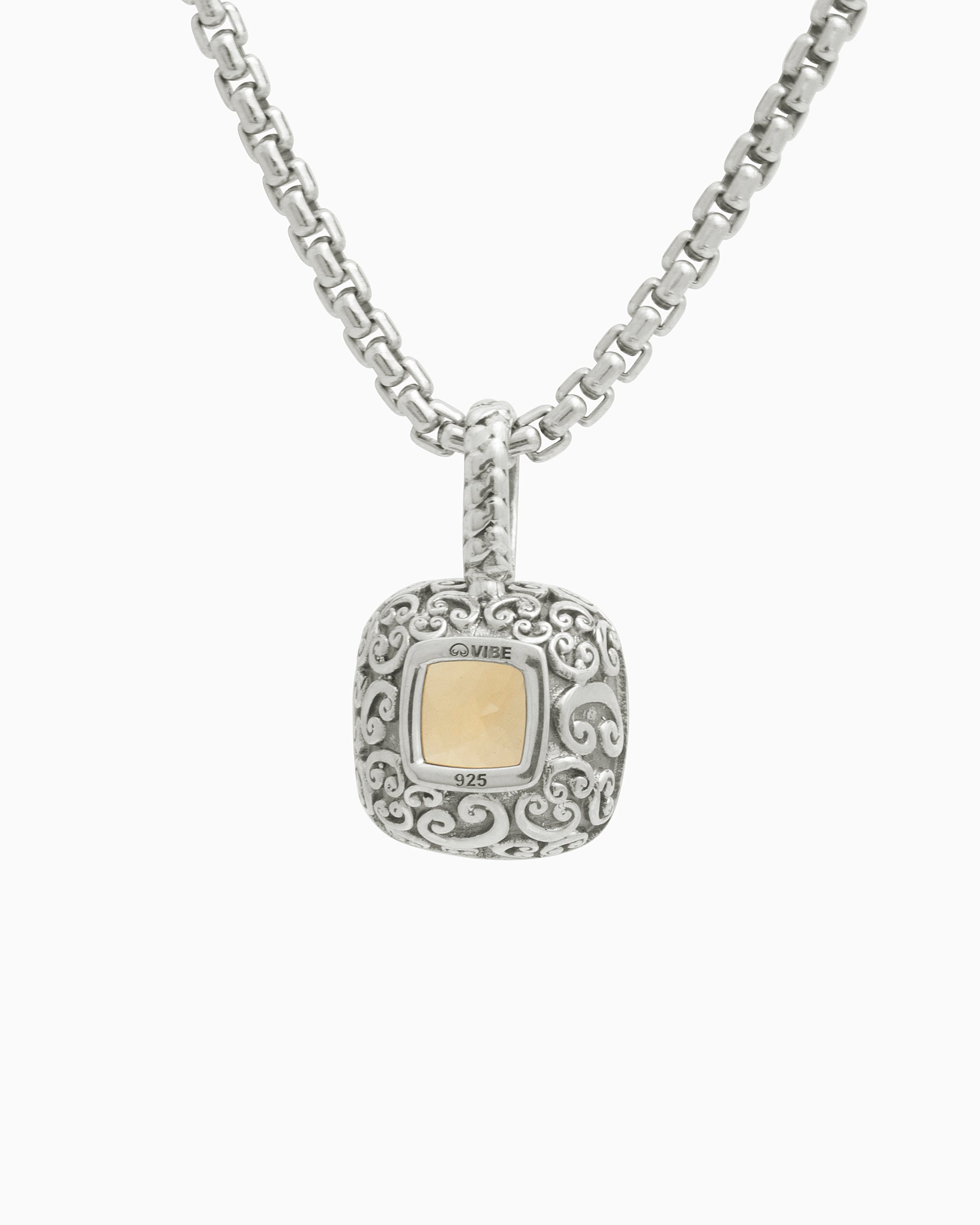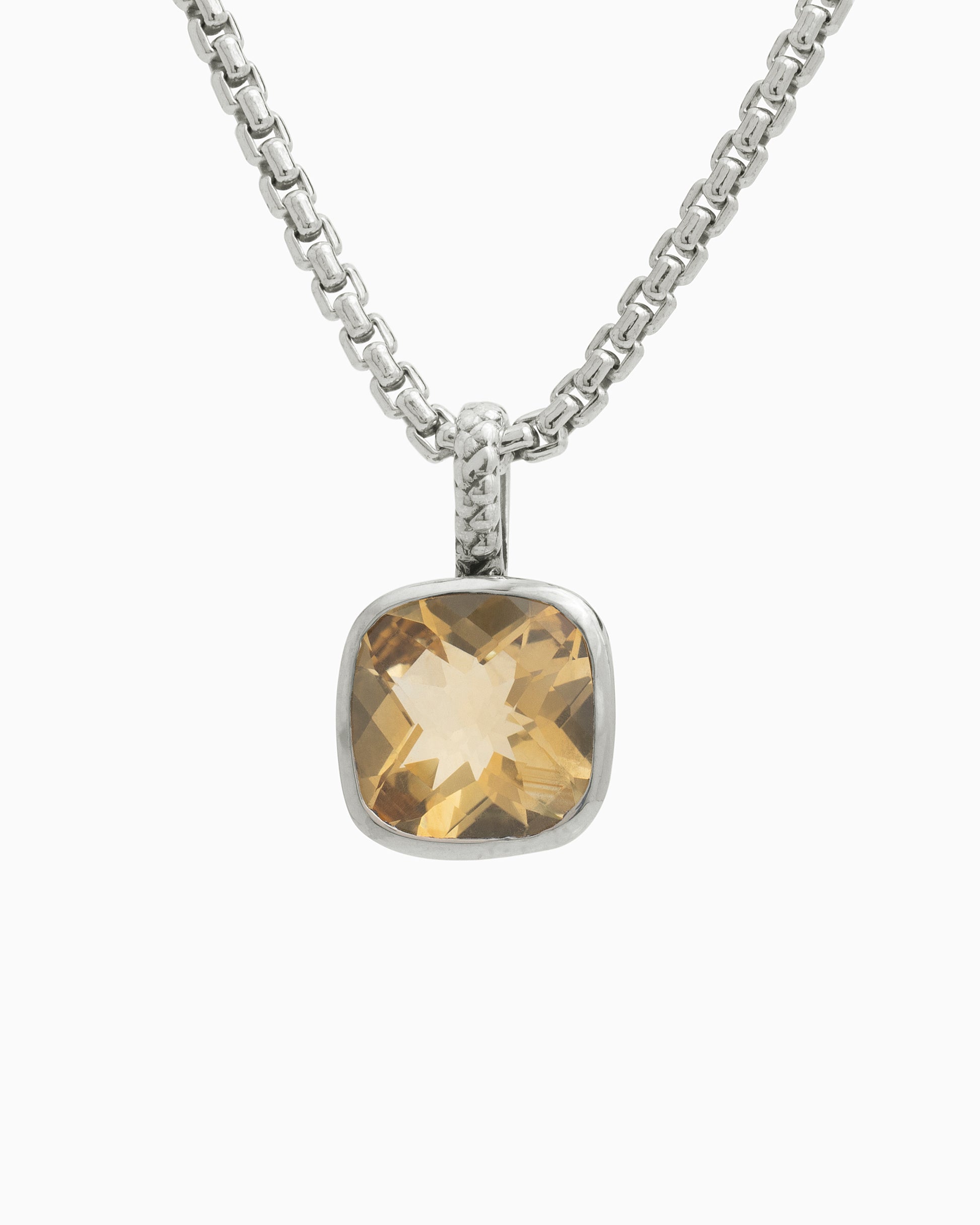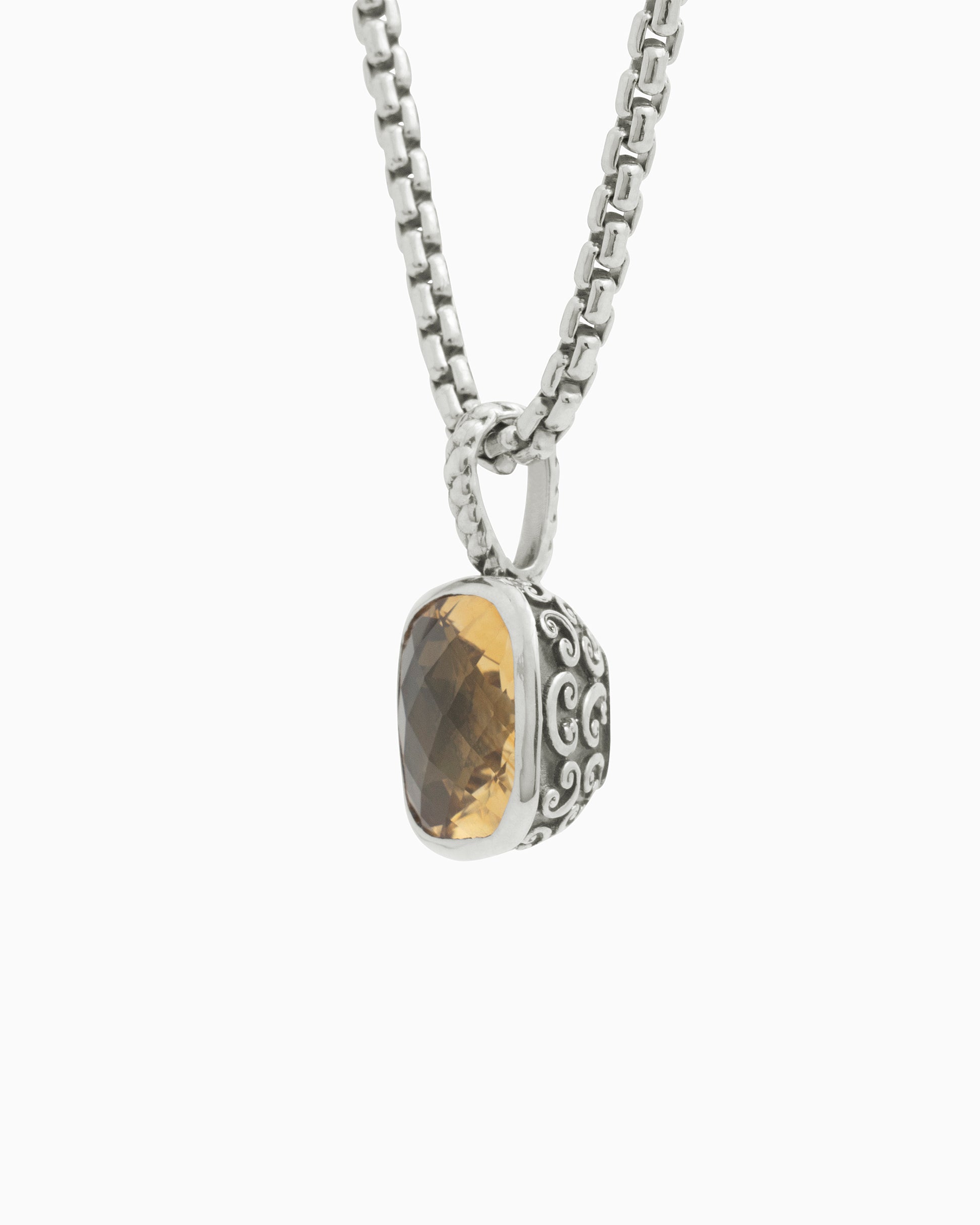 The Square Stone Pendant features a faceted citrine stone set in sterling silver with a unique petroglyph texture. Take notice of the twisted detailing on the bail which adds a playful touch. Pair with your favorite chain, sold separately.