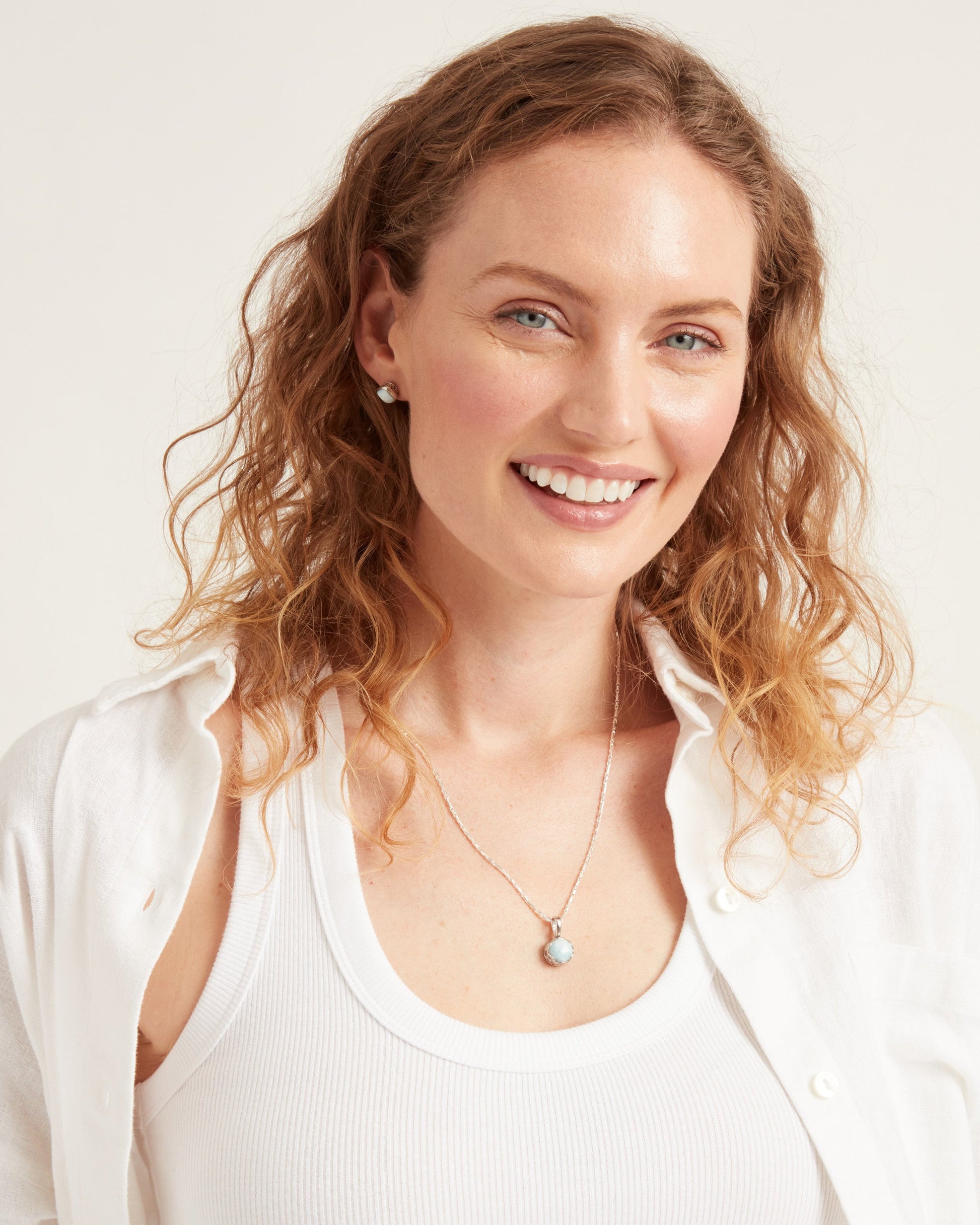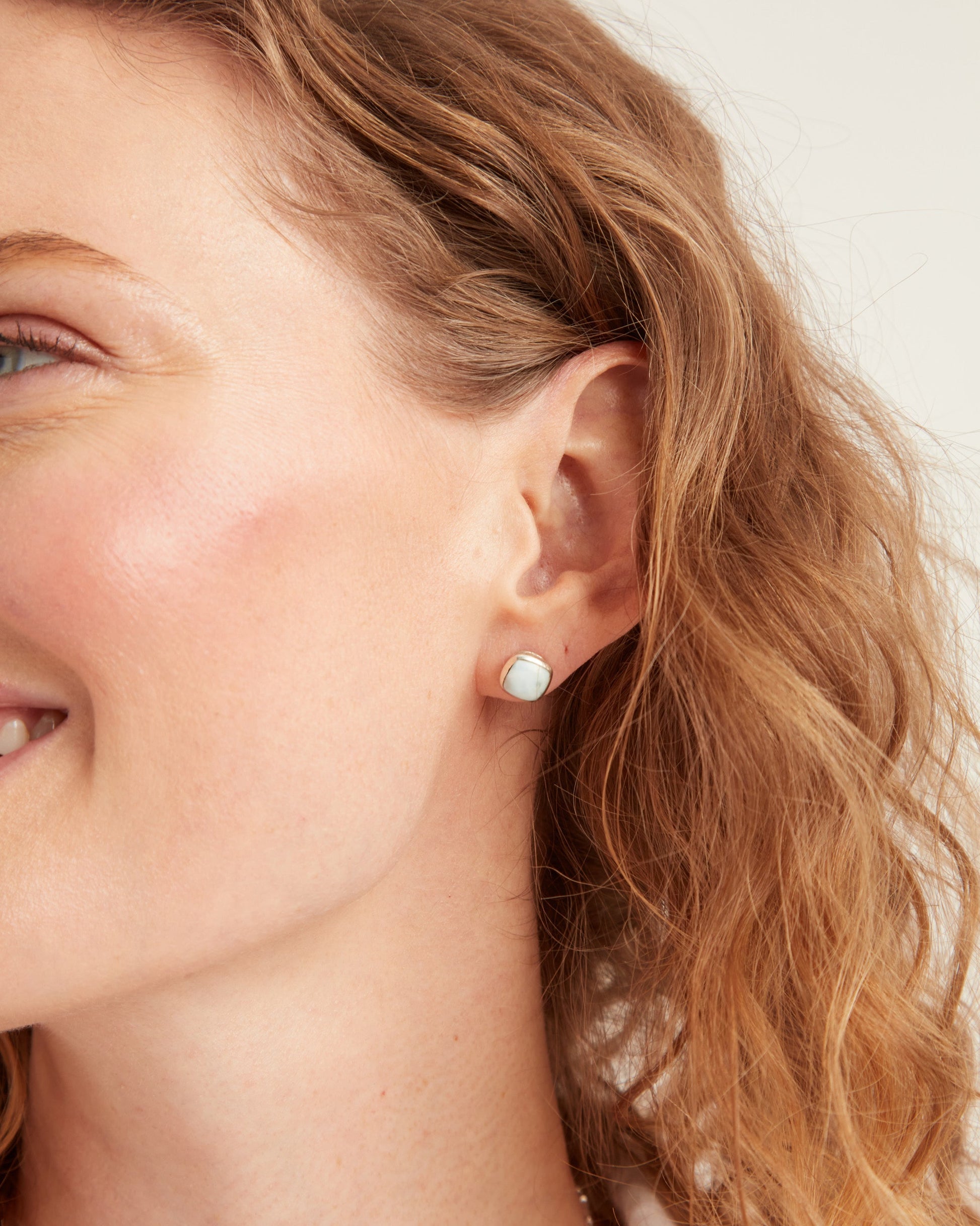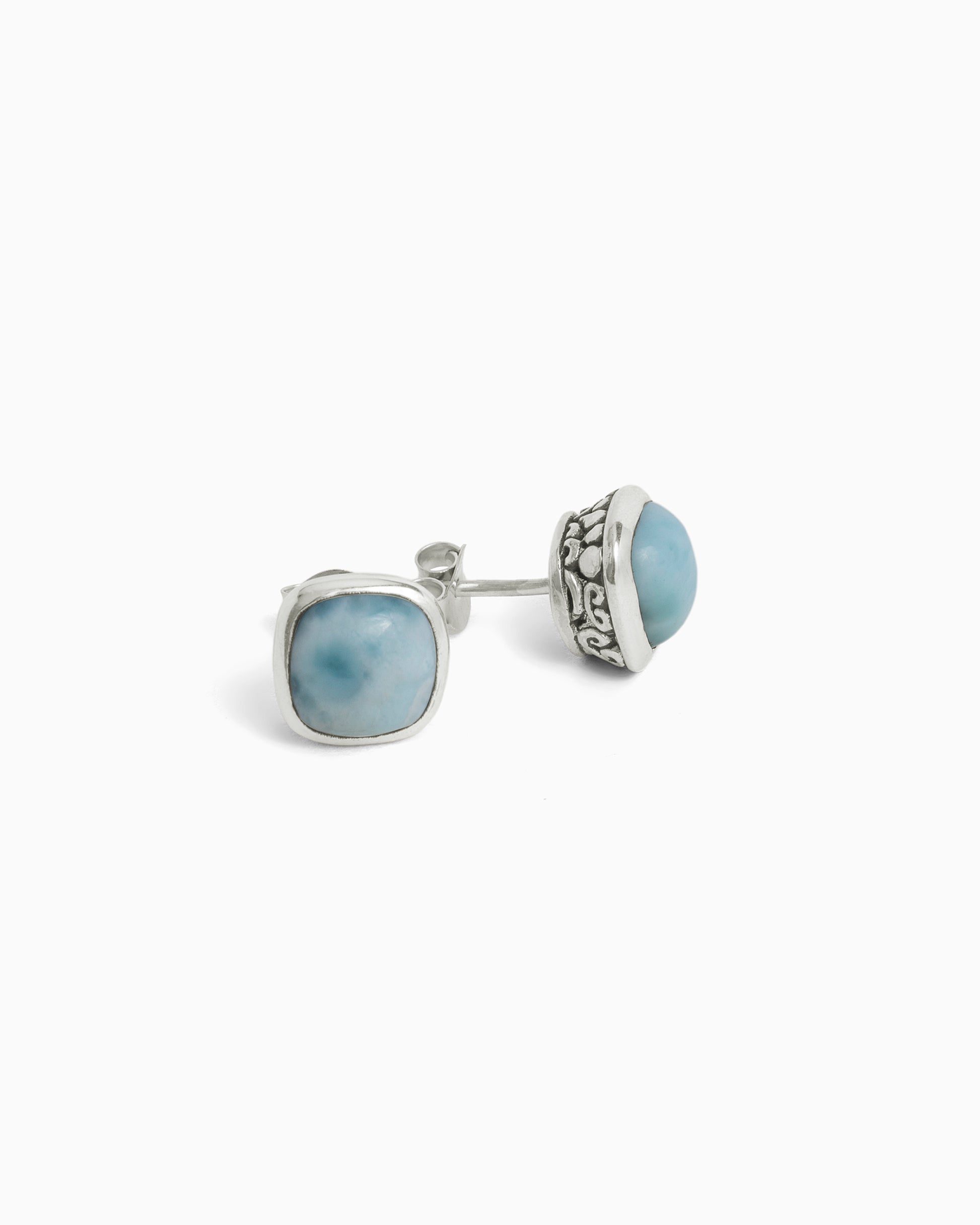 The Square Stone Studs are the perfect everyday earring beautifully handcrafted in sterling silver. These earrings feature a larimar cabochon set in our signature petroglyph turtle texture.