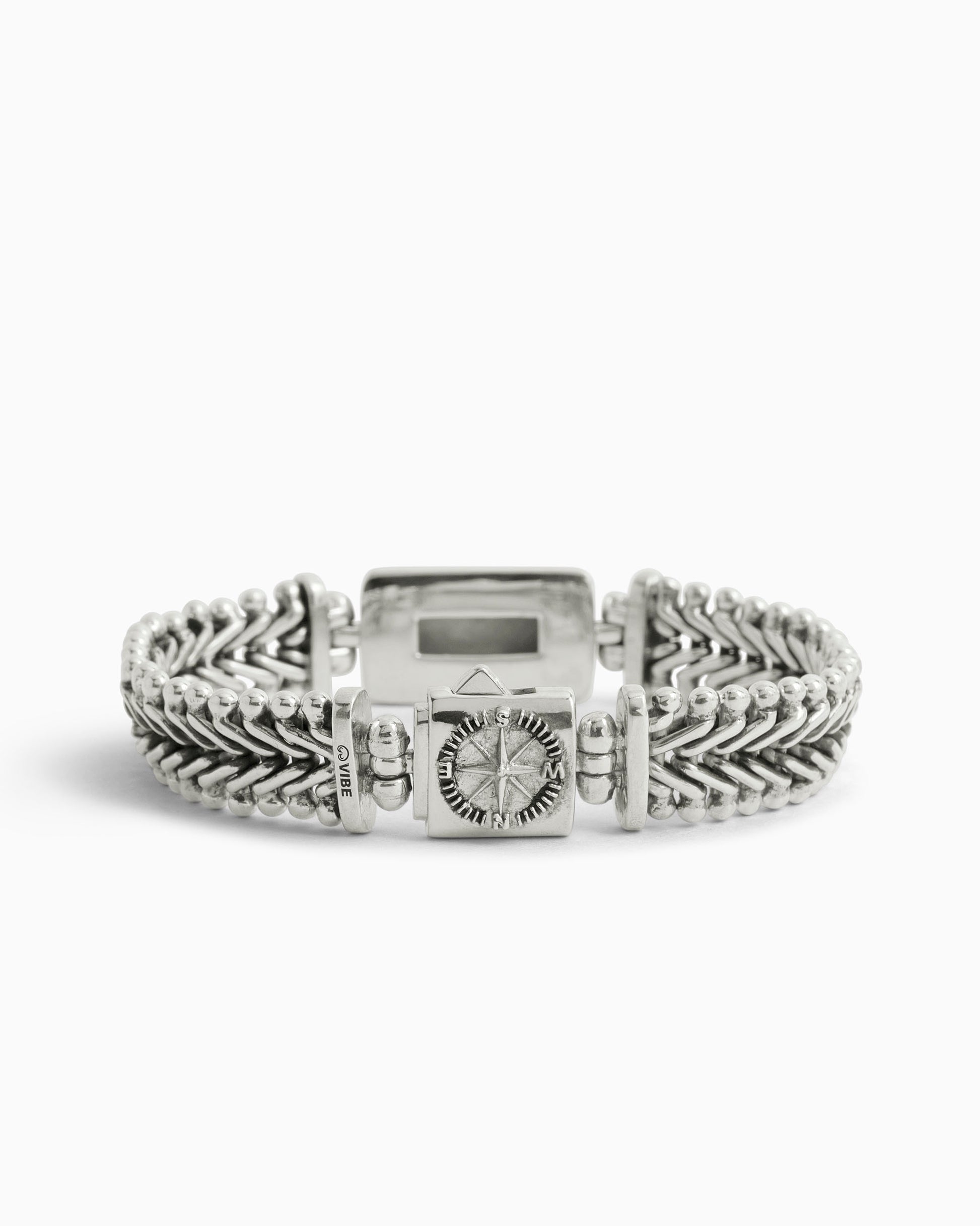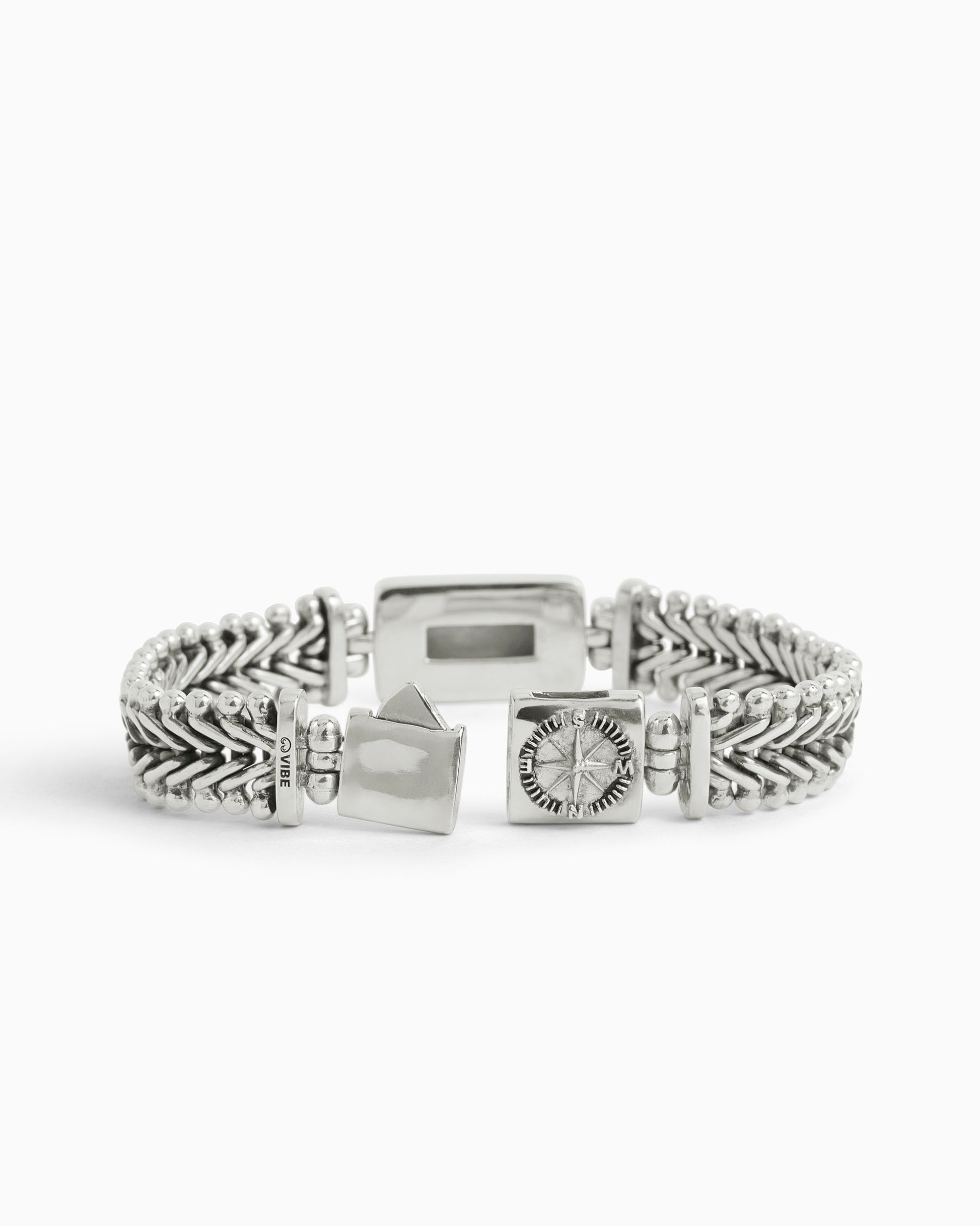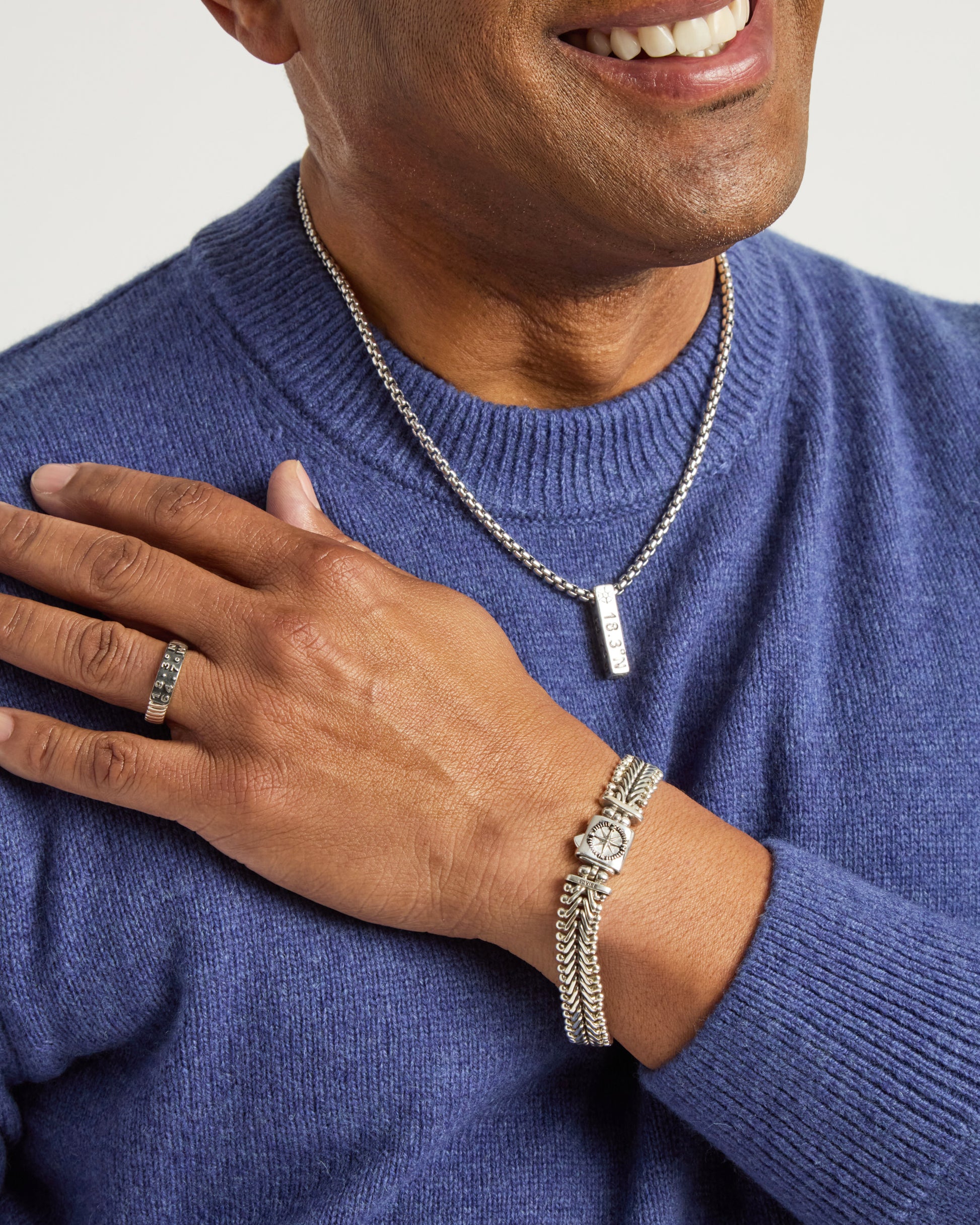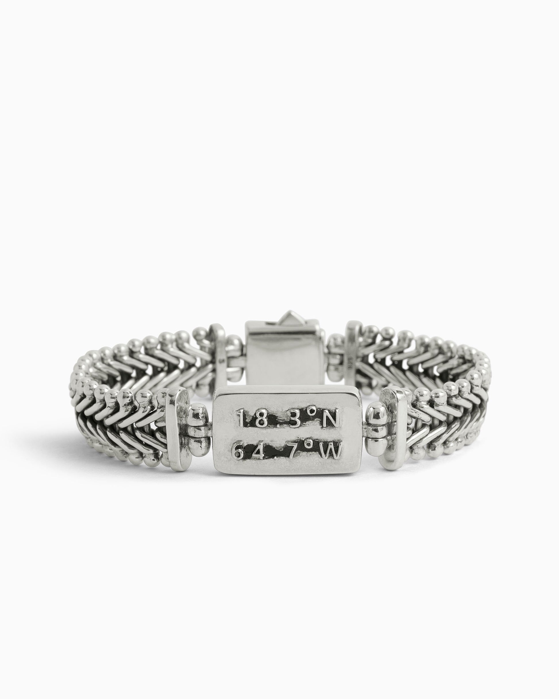 The St. John Coordinates Link Bracelet is a statement piece that is designed to keep St. John close. Featuring a thick link band handcrafted in sterling silver with a rectangle solid piece in the center showcasing the island's coordinates. Note the oxidized details around the numbers giving this piece a subtle rugged look.