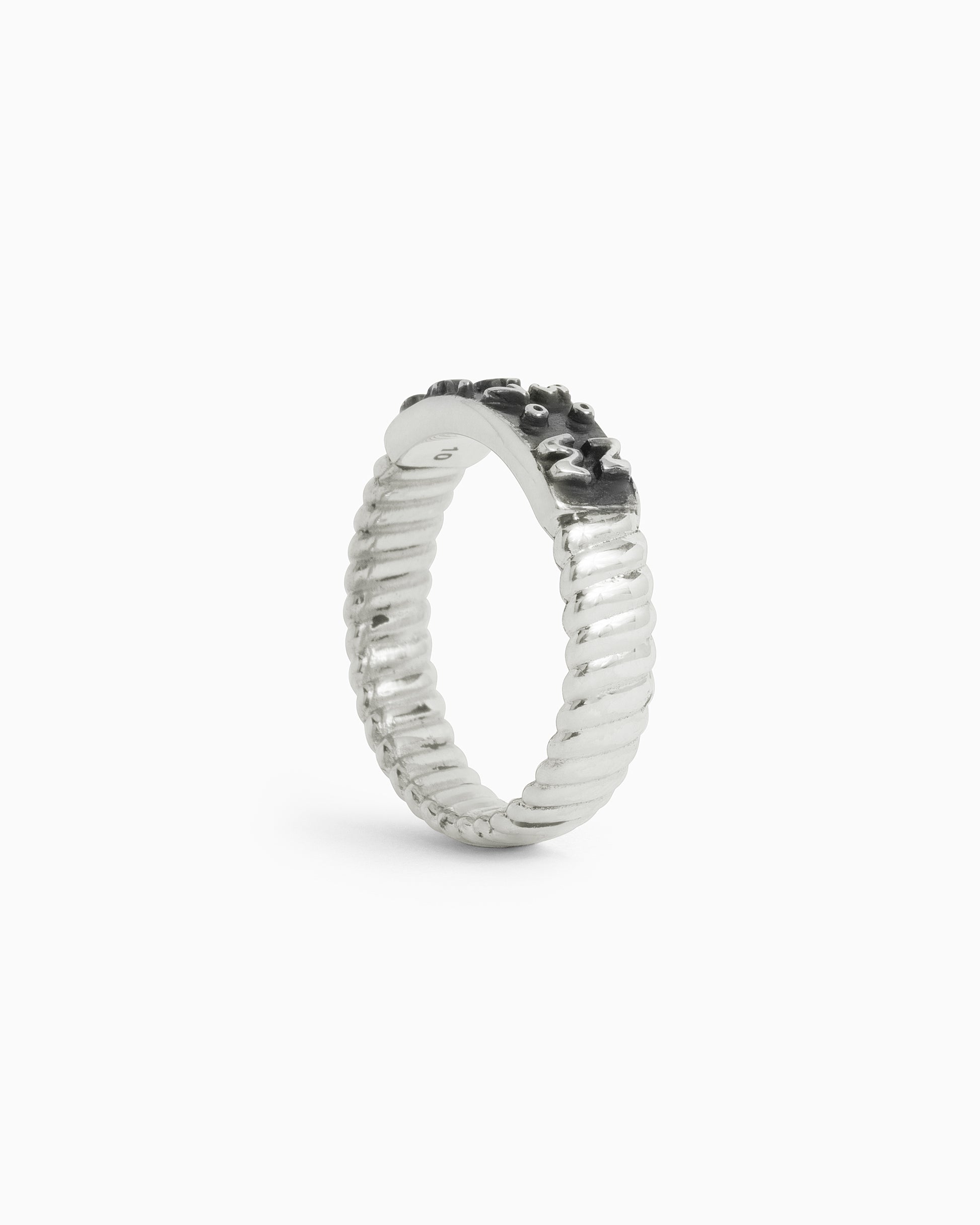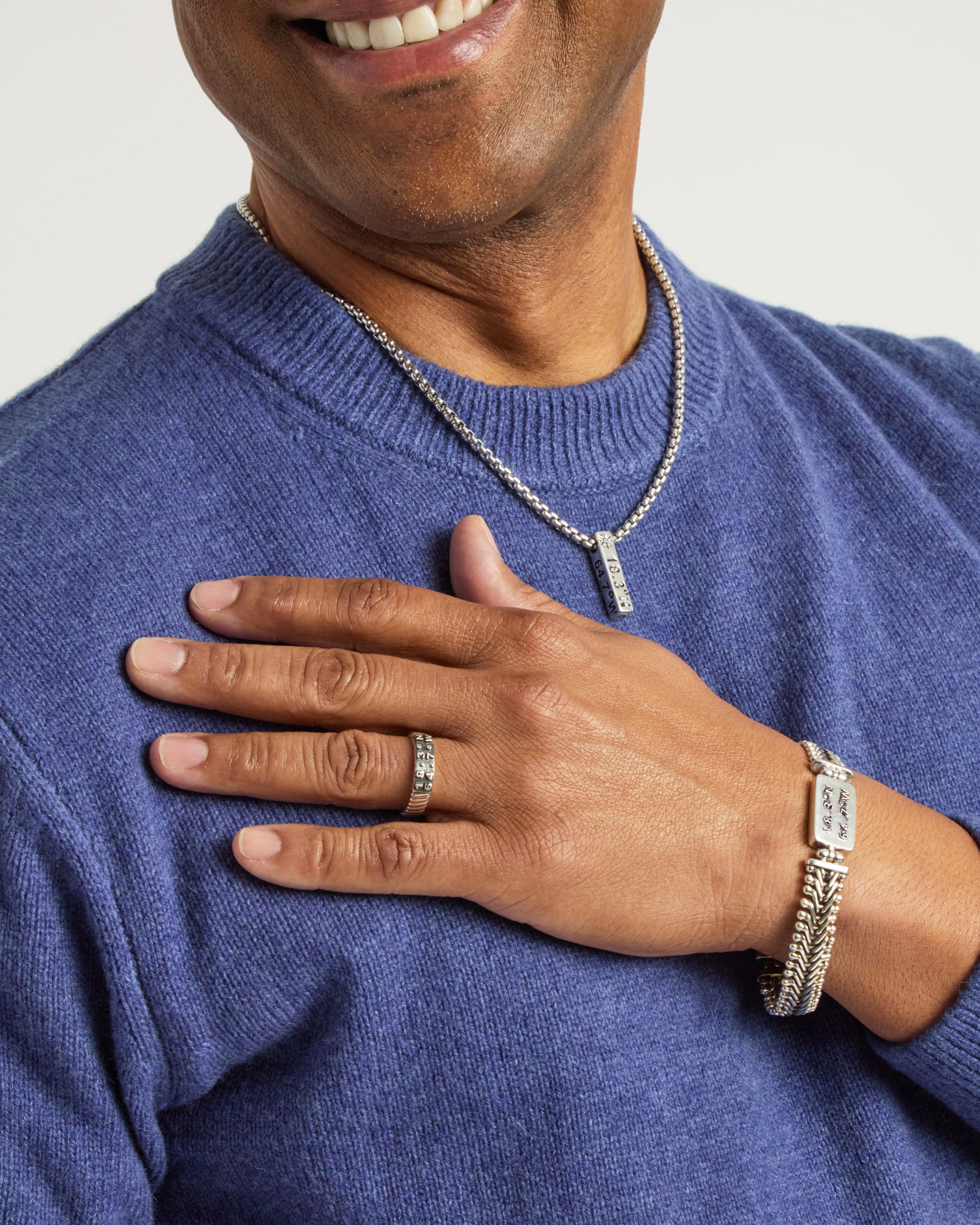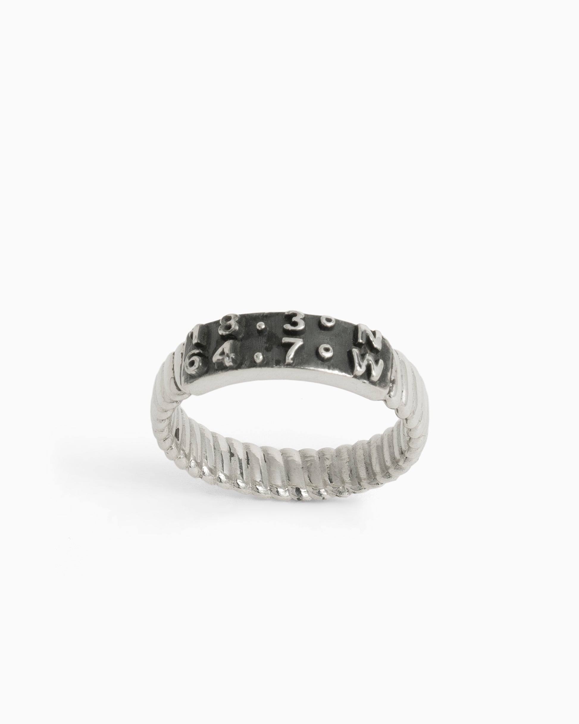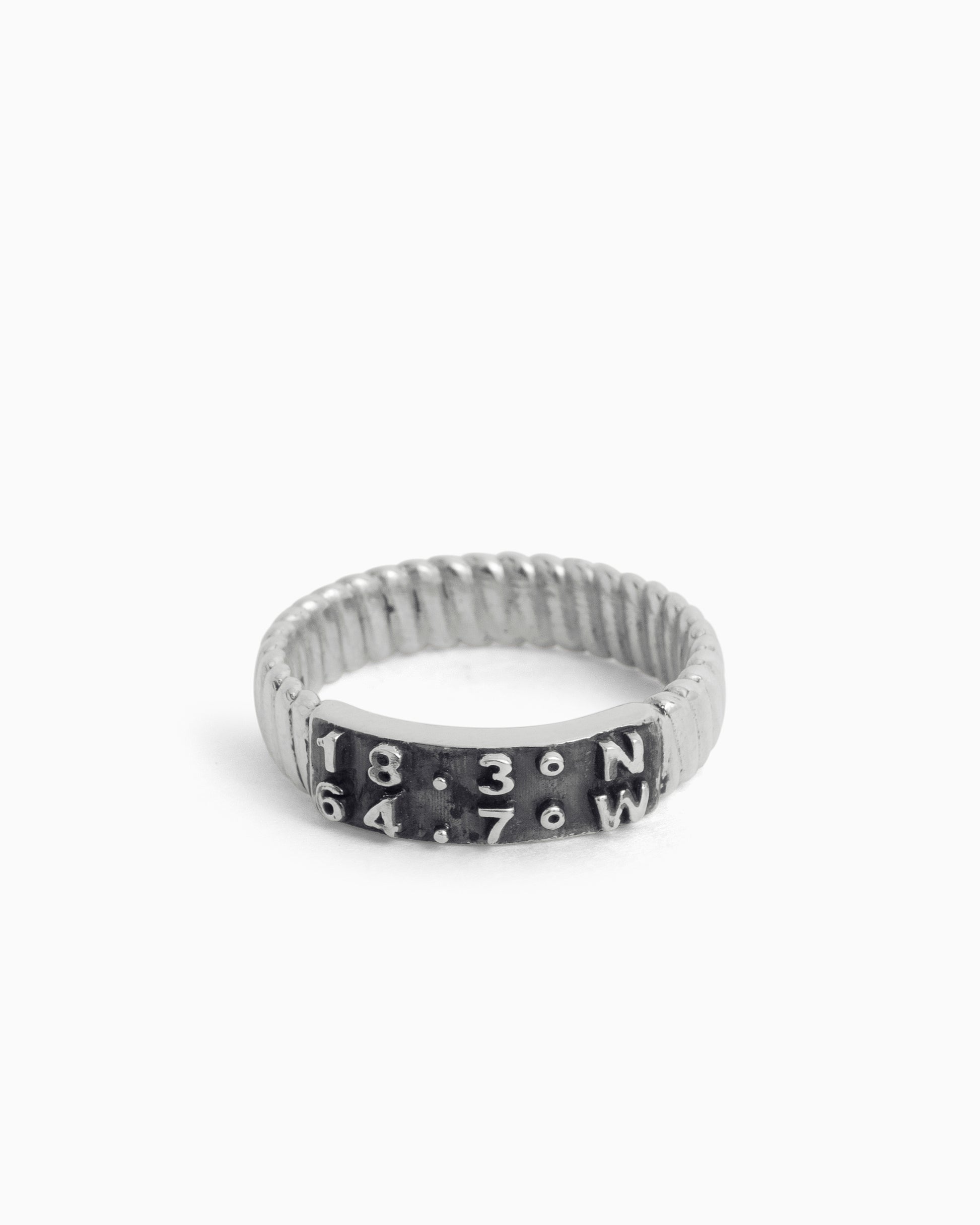 The St. John Coordinates Ring is simple yet rugged with a cable-detailed band handcrafted in sterling silver. The coordinates are placed in the center of an oxidized sterling silver block giving a unique touch to this everyday style.
