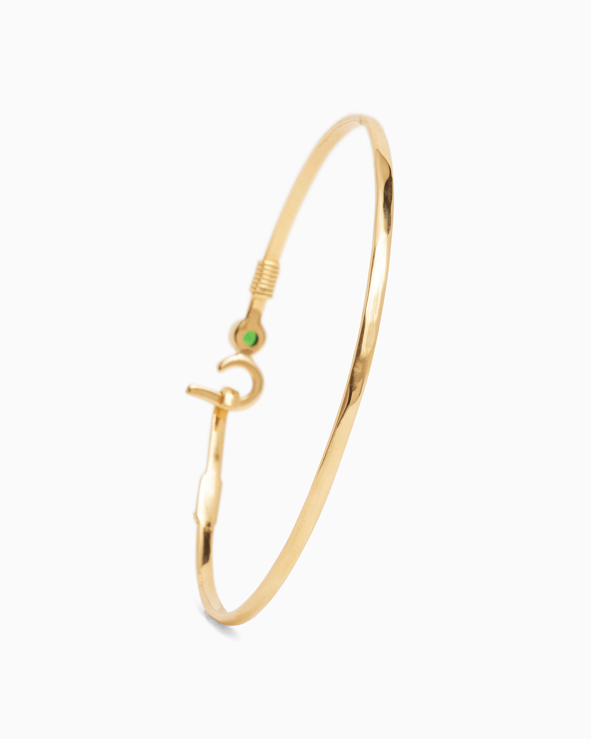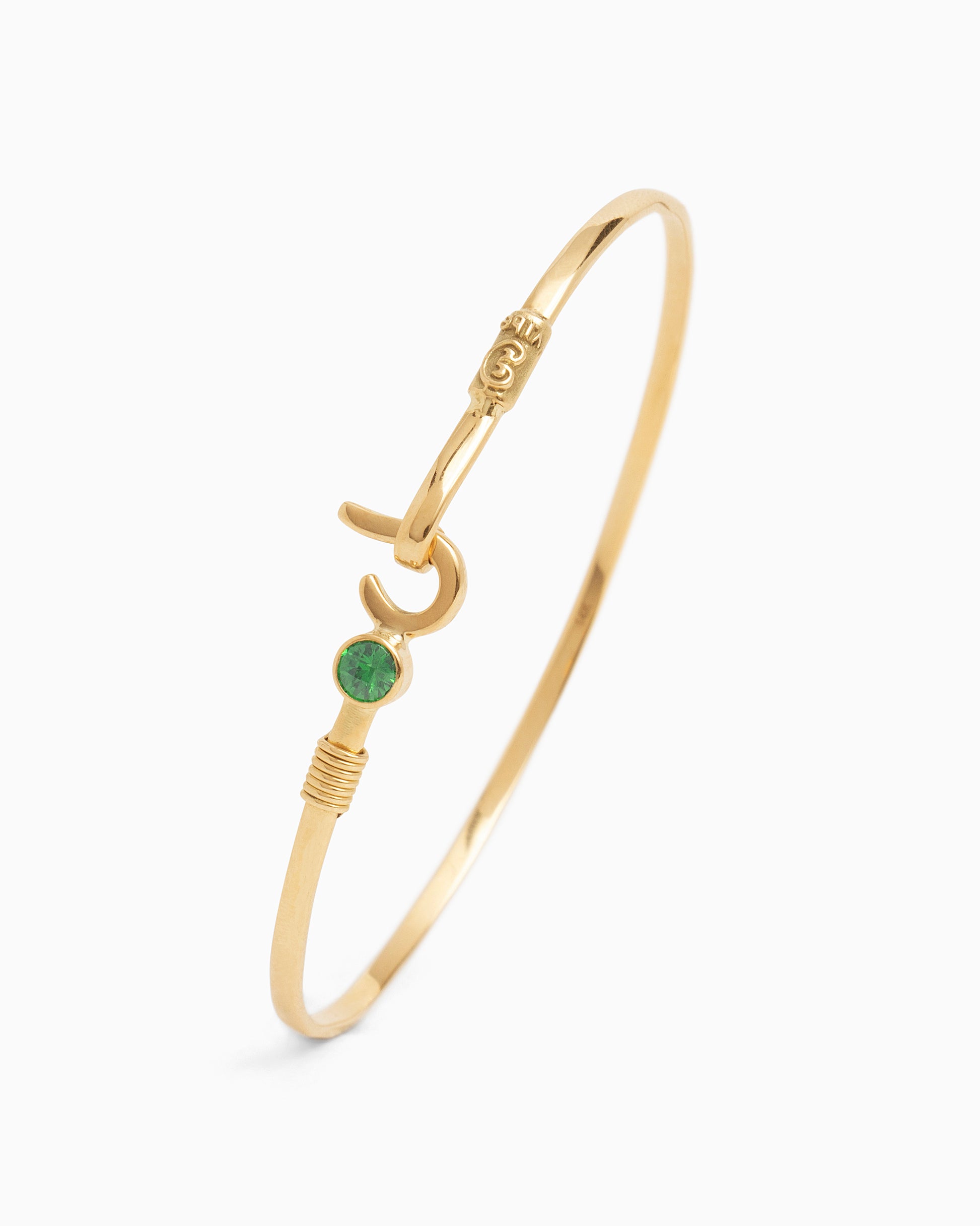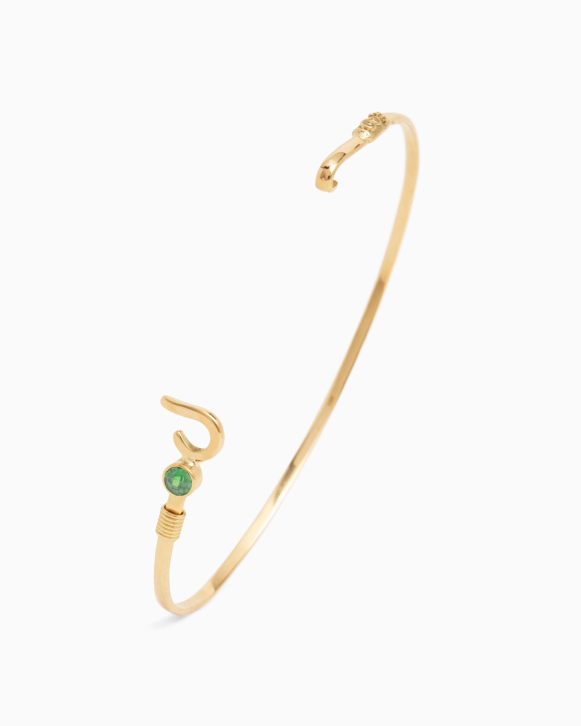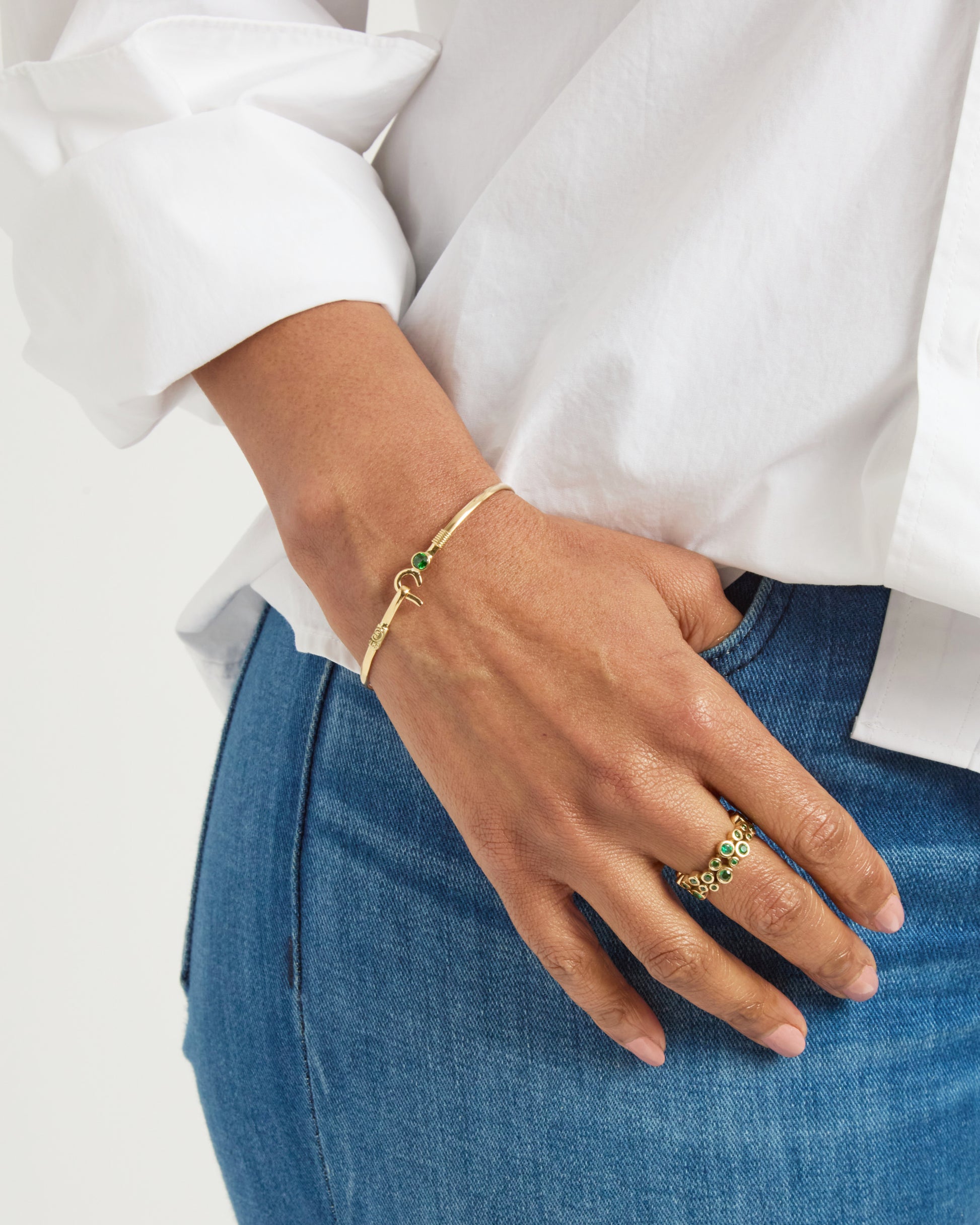 A Vibe signature, the St. John Hook Bracelet with Stone is fashioned in gently hammered 14K solid gold with a faceted green zircon stone and "J" hook clasp. Featuring a replica of the St. John petroglyph and seven good luck wraps, solo or stacked, it is sure to be a favorite piece. Found in many of our designs, Vibe’s seven good luck wraps represent love, laughter, happiness, good fortune, health, unity, and peace. In the Caribbean tradition, wear your hook facing in to keep love close to your heart, and facing out if you are open to a new love in your life. Wear this piece on its own or stack it with other bracelets for a layered look.