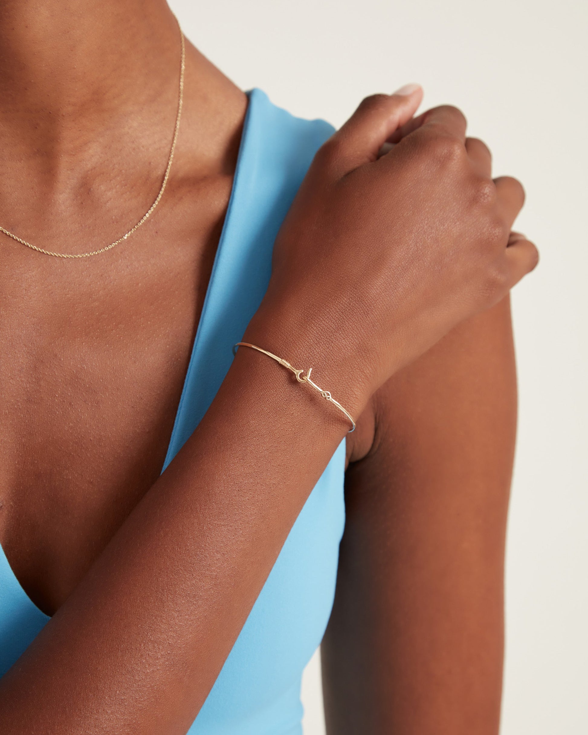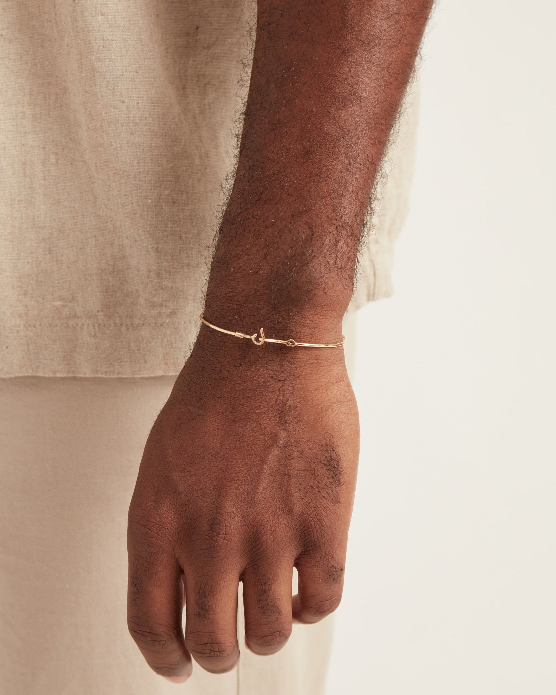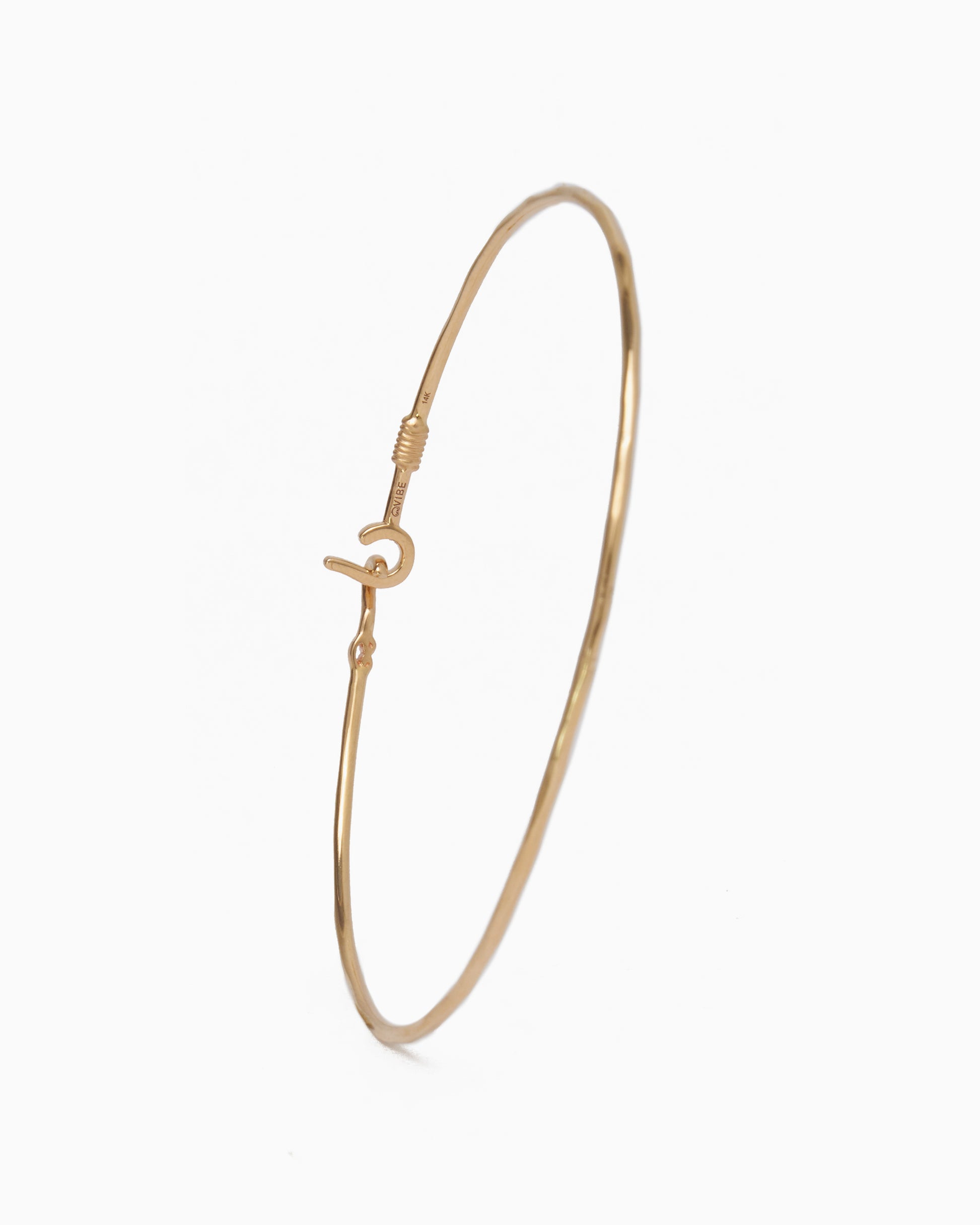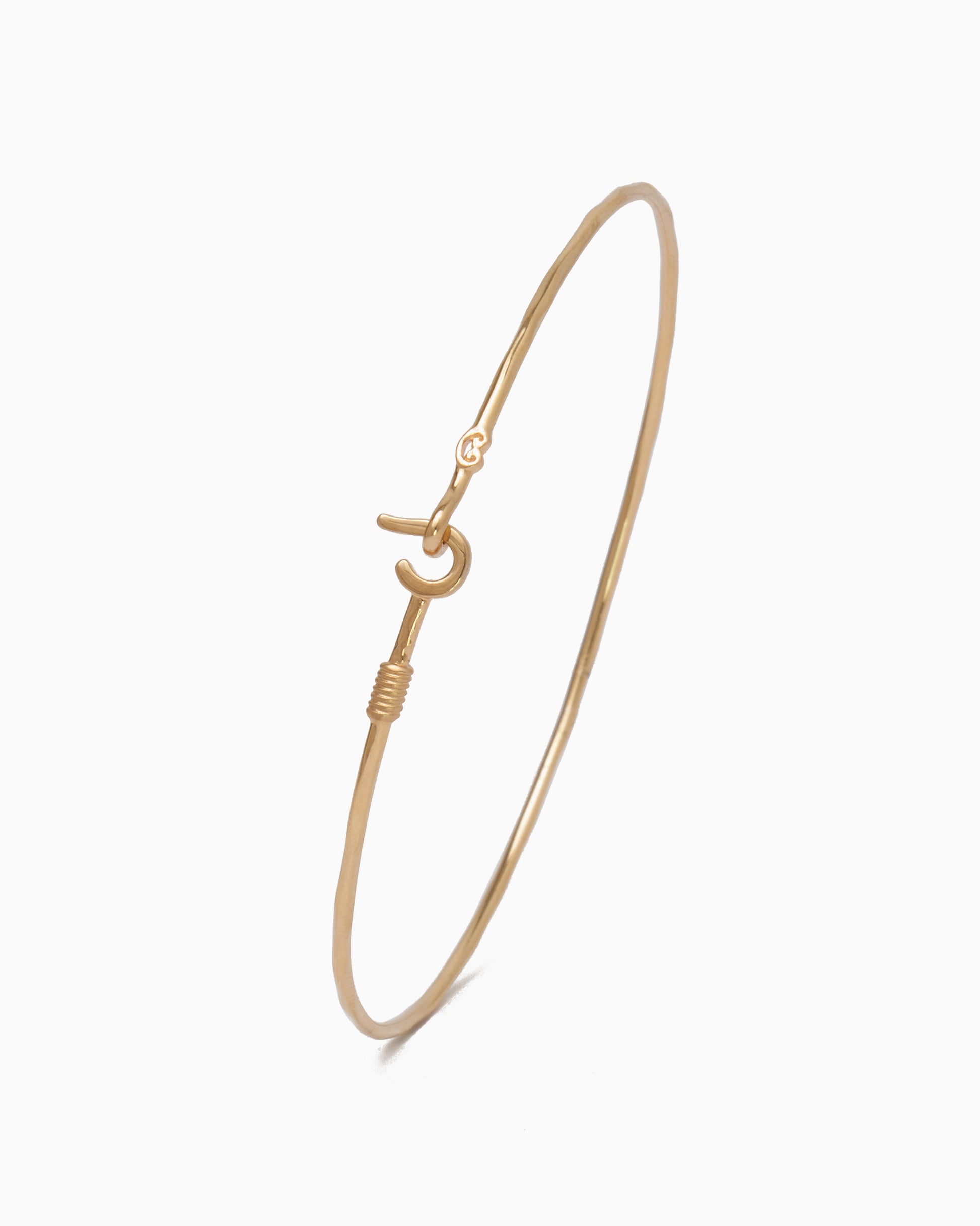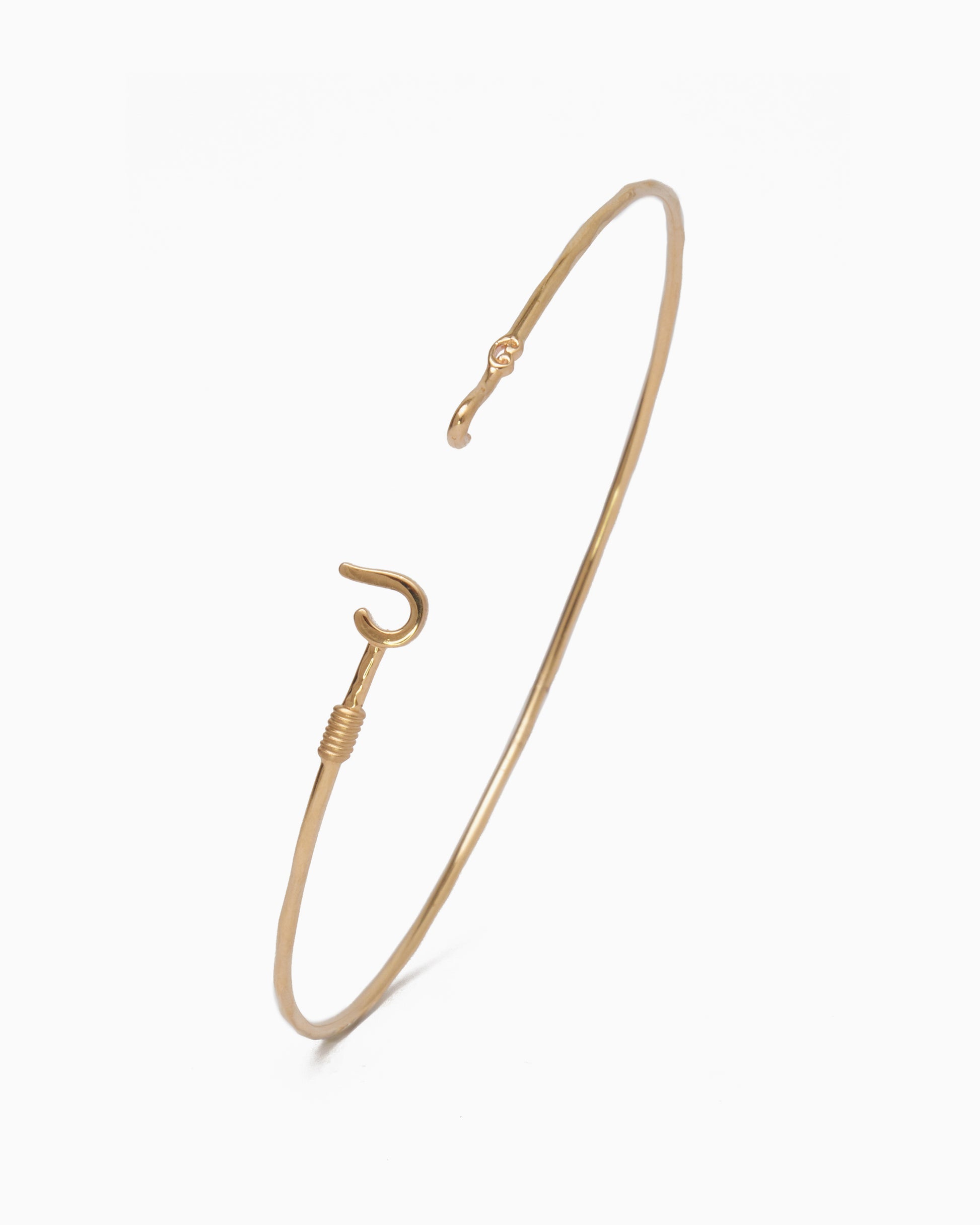 A Vibe signature, this slimmest version of the St. John Hook Bracelet is fashioned in gently hammered 14K solid gold adorned with a open petroglyph and a "J" hook clasp to honor the island of St. John. Featuring a tiny replica of the St. John petroglyph and seven good luck wraps, solo or stacked, it is sure to be a favorite piece. Found in many of our designs, Vibe’s seven good luck wraps represent love, laughter, happiness, good fortune, health, unity, and peace. In the Caribbean tradition, wear your hook facing in to keep love close to your heart, and facing out if you are open to a new love in your life. Wear this piece on its own or stack it with other bracelets for a layered look.